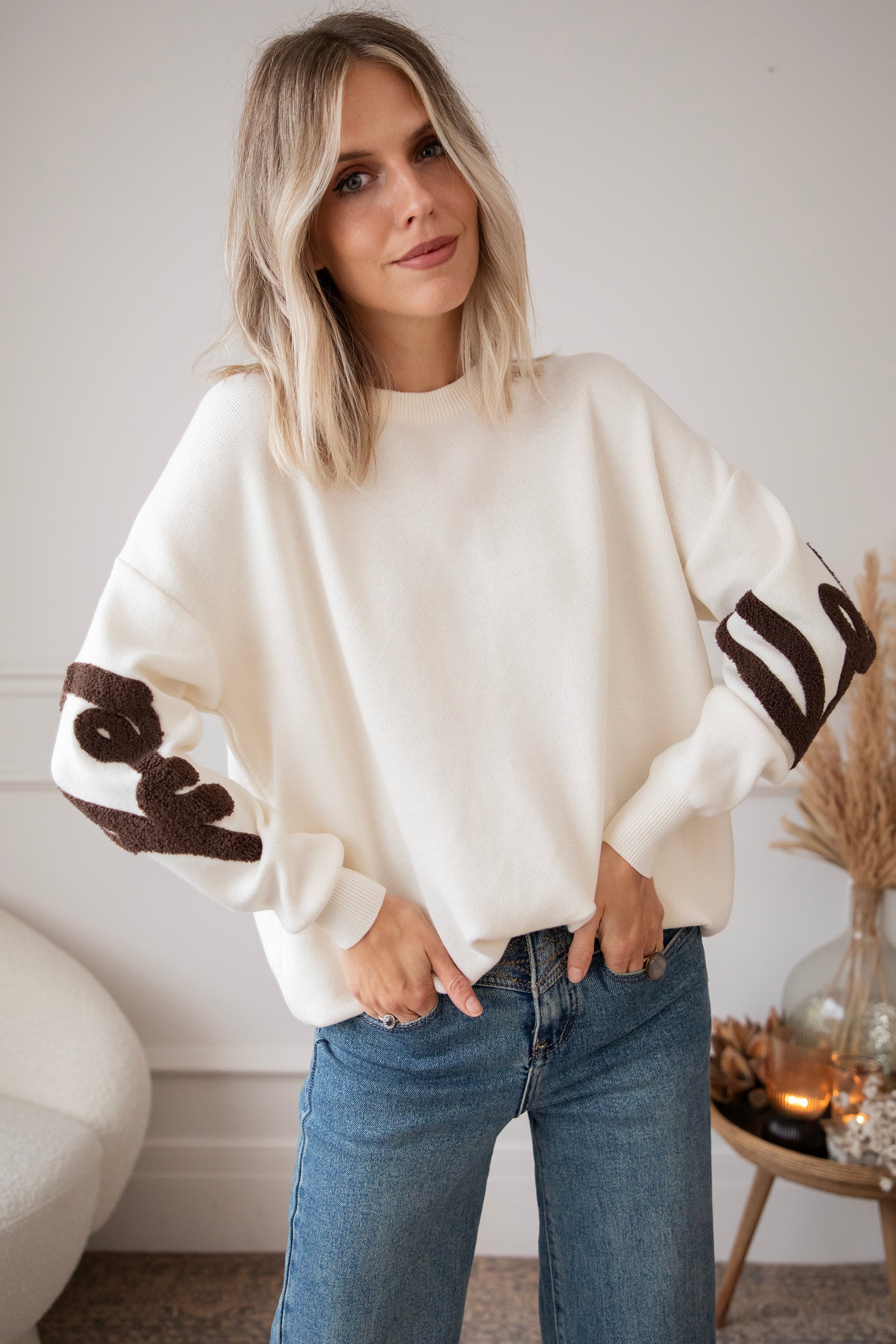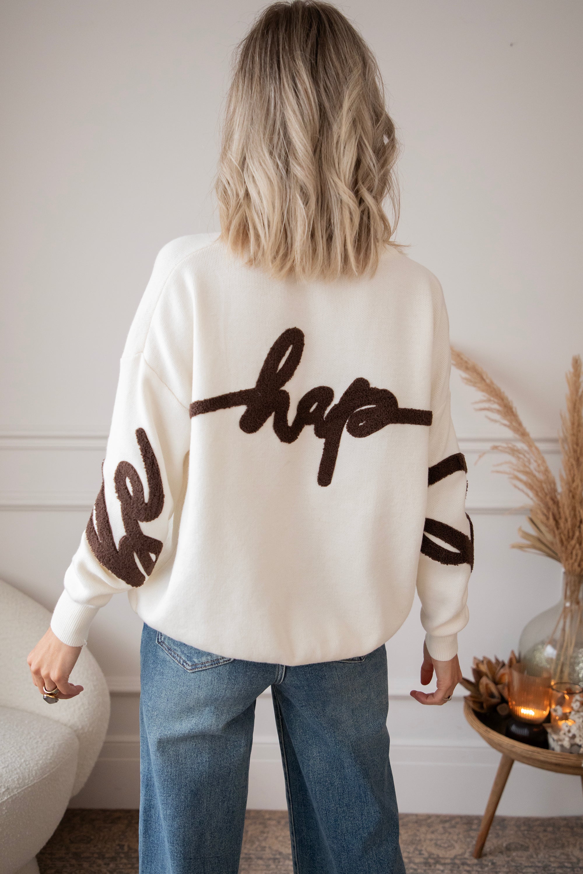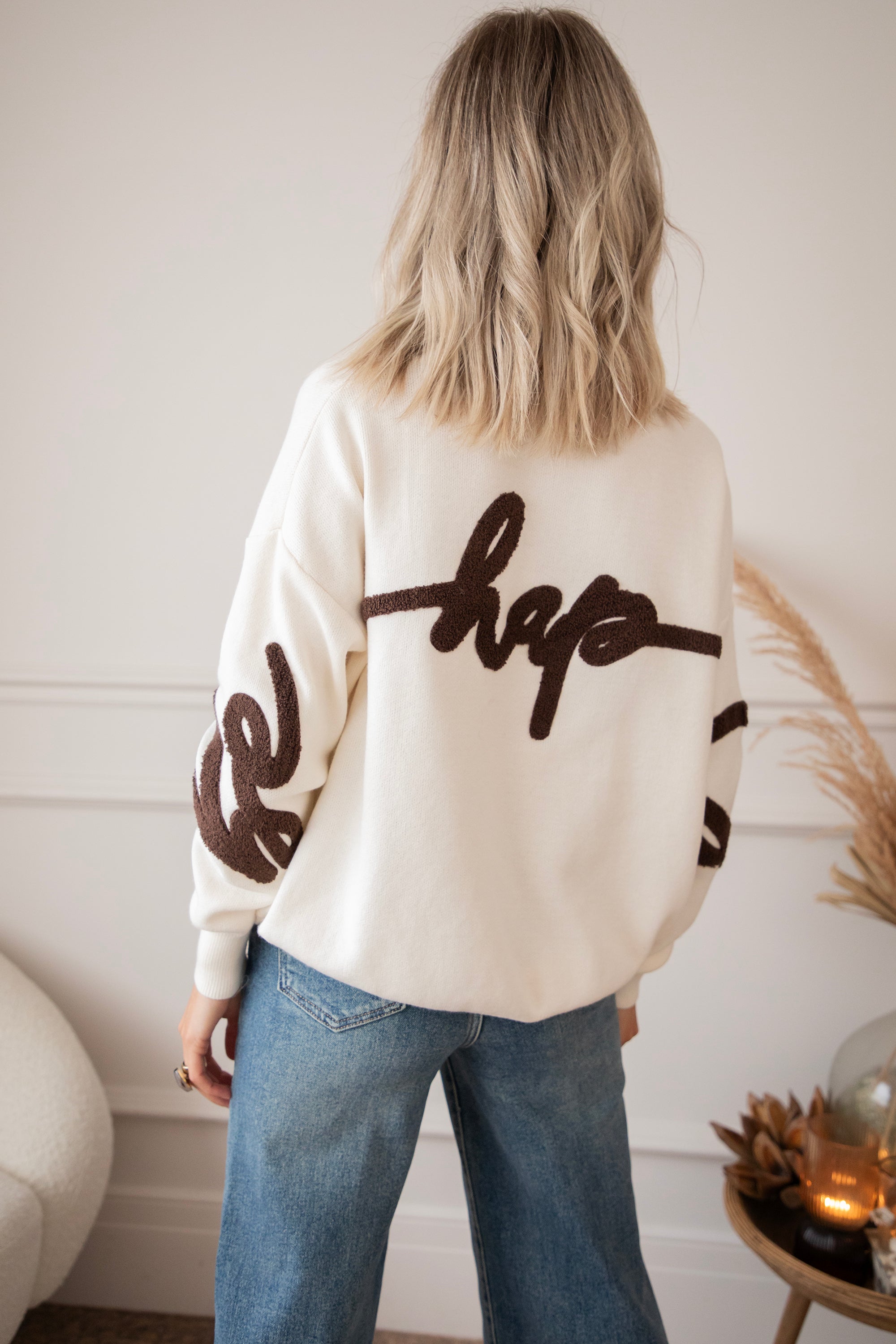Girls, deze trui maakt je dag zóveel leuker! 🤎 Op de rug én de mouwen staat de boodschap ‘be happy’ in een mooi bruin lettertype in een zacht gebreid stofje… en eerlijk, wie wordt daar nu niet instant vrolijk van? 🥹 Het leukste vind ik dat de quote opgesplitst is, zo cool en nét dat tikkeltje specialer.