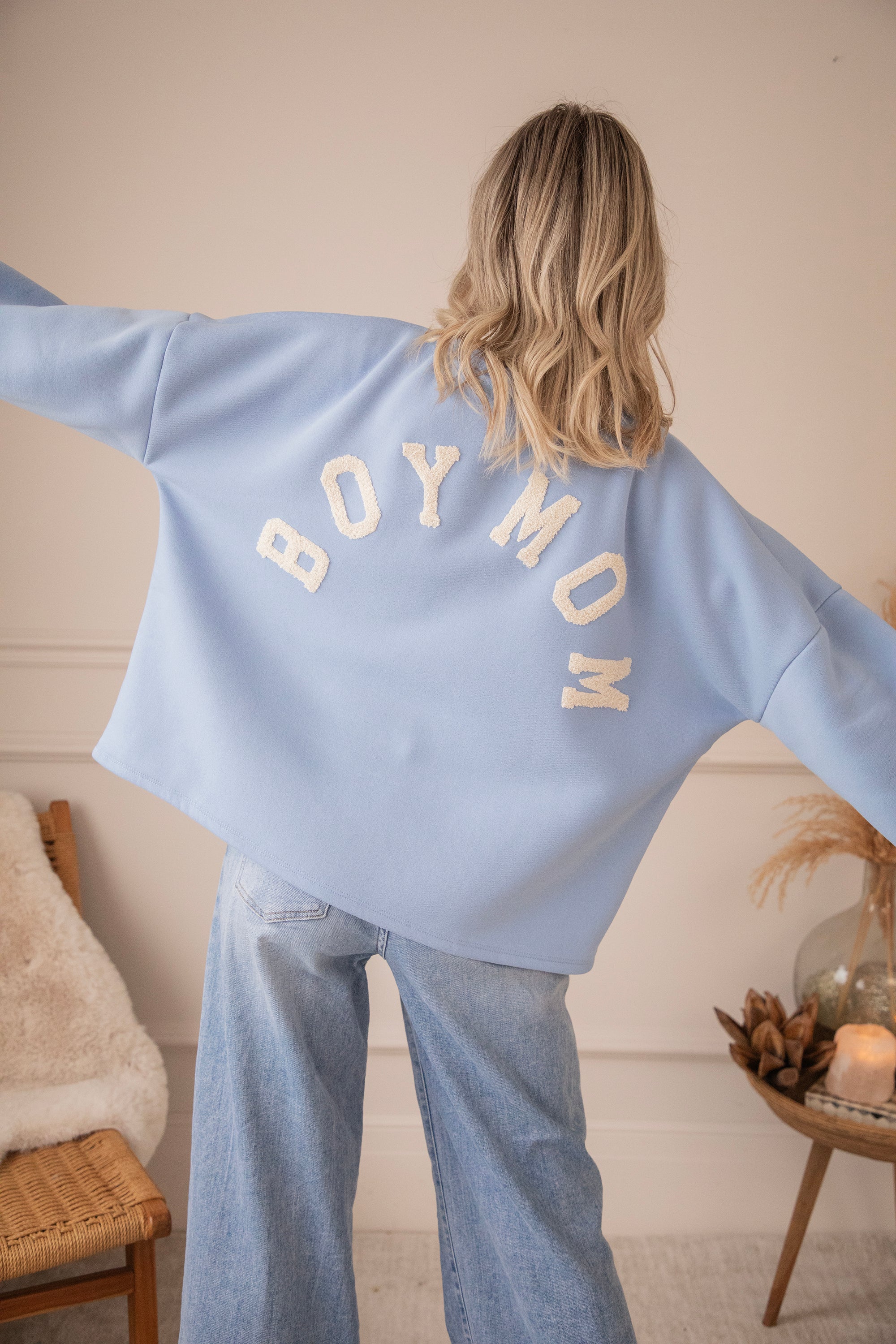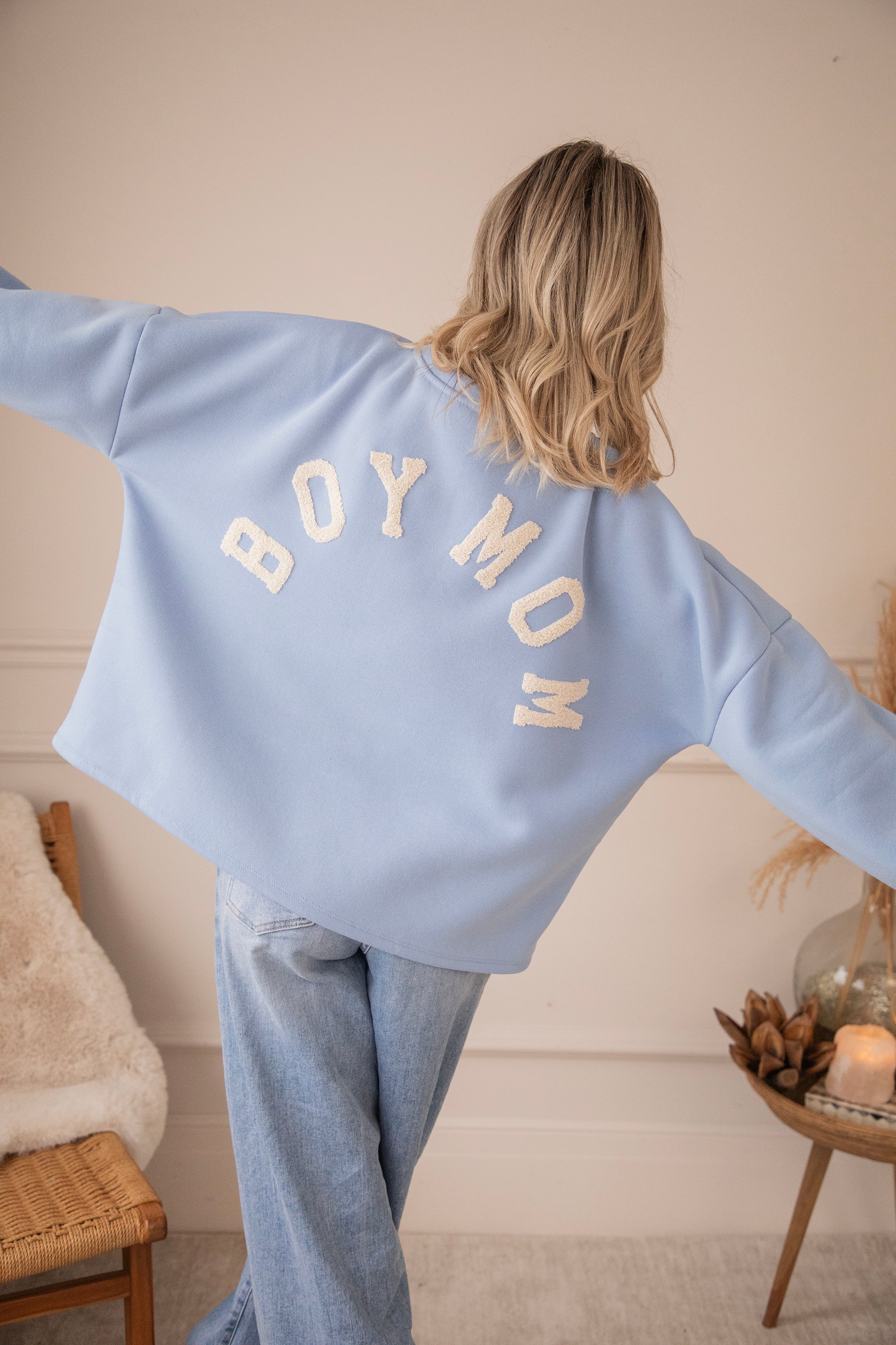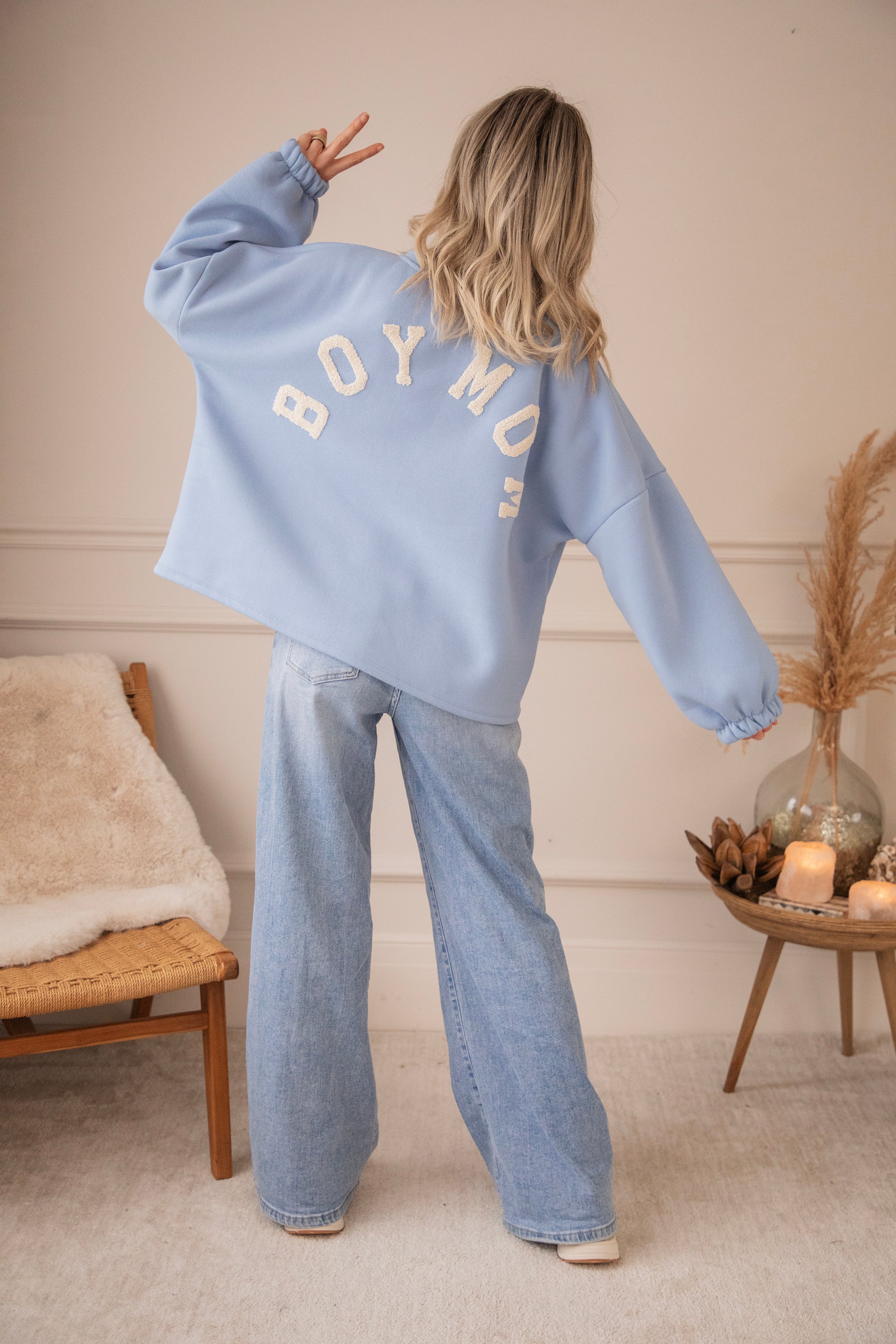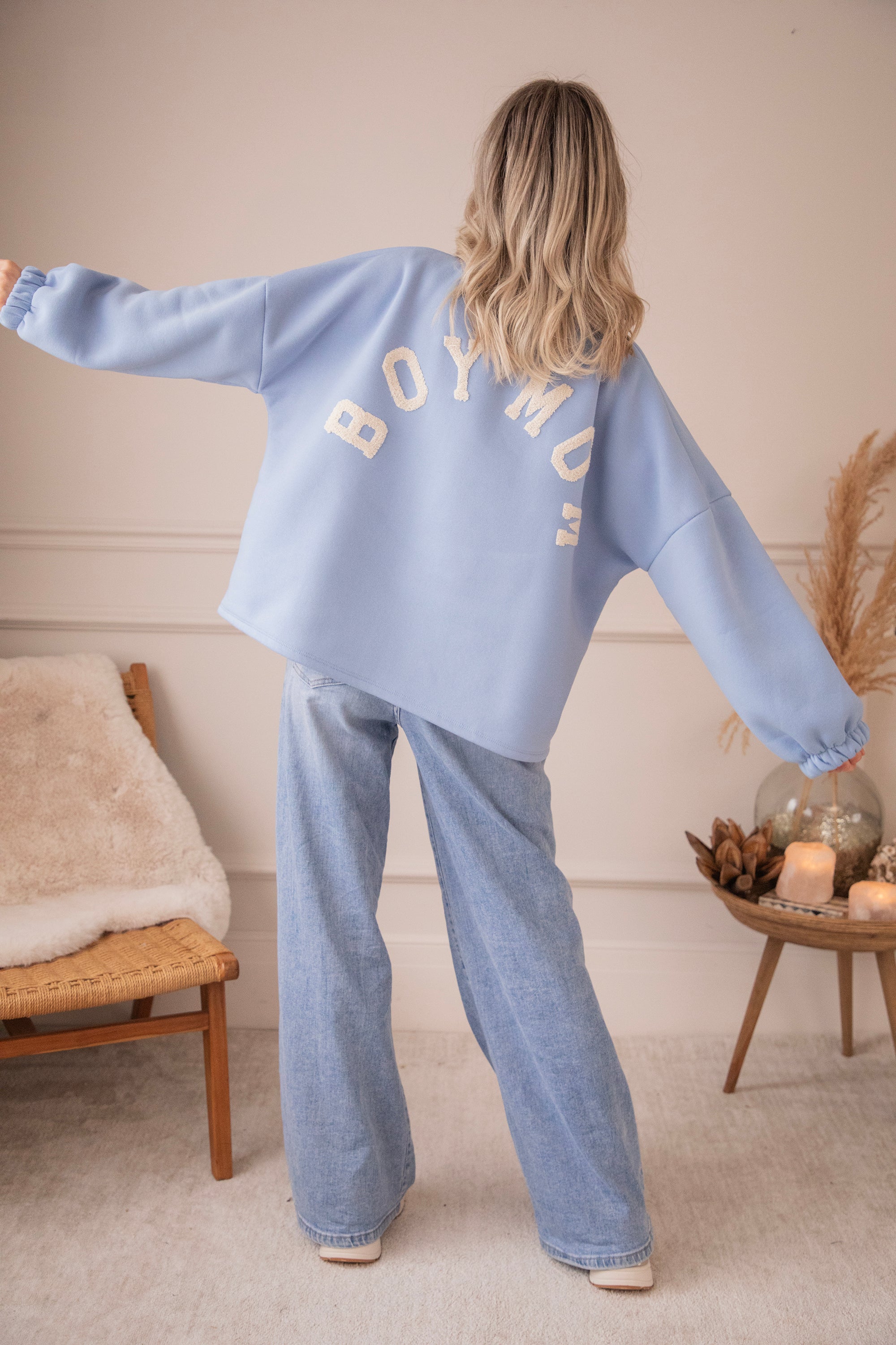Onze Lily sweater nu met BOY MOM groot op de rug in fris blauw met beige teddy letters. Een frisse en zachte combinatie 🌿