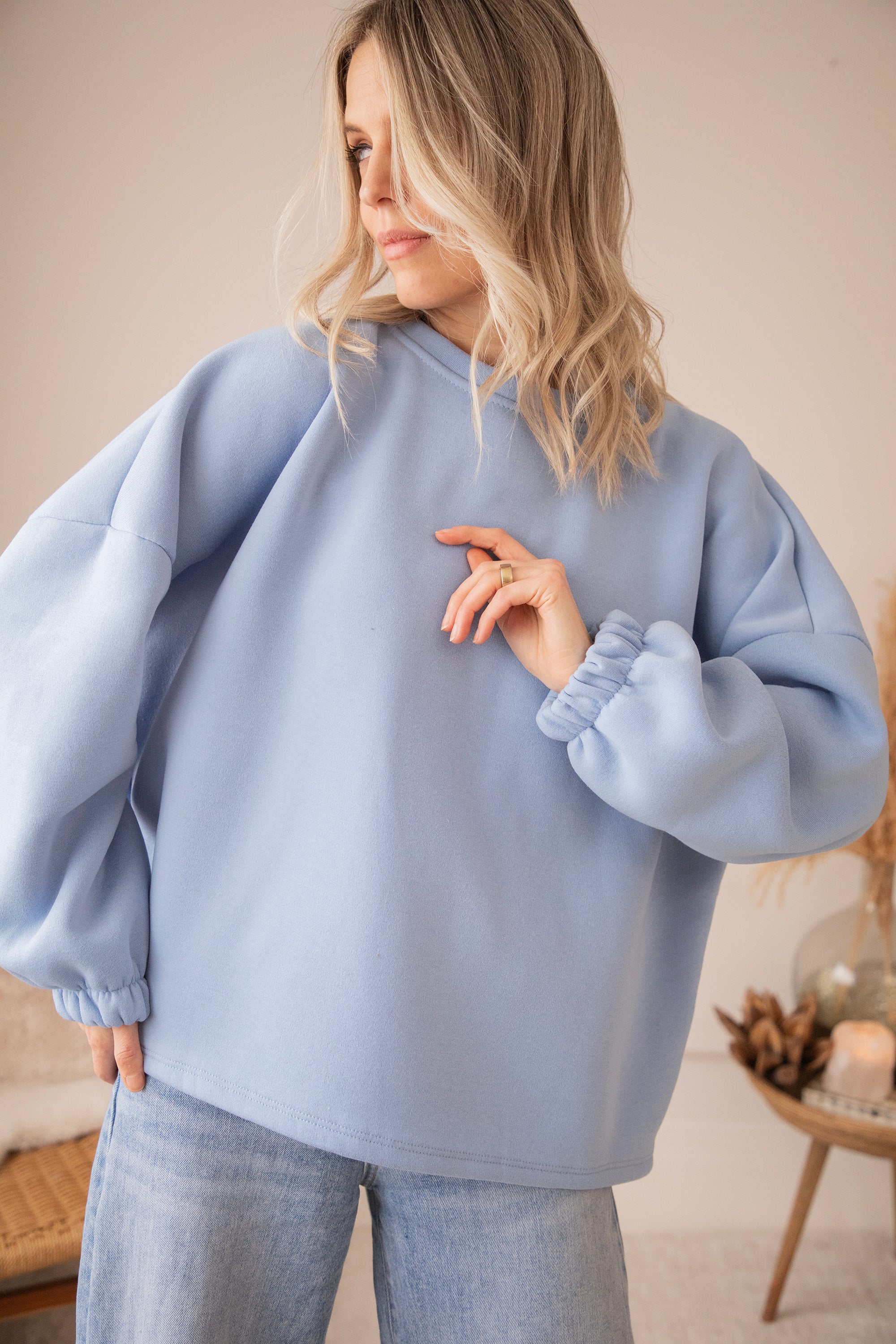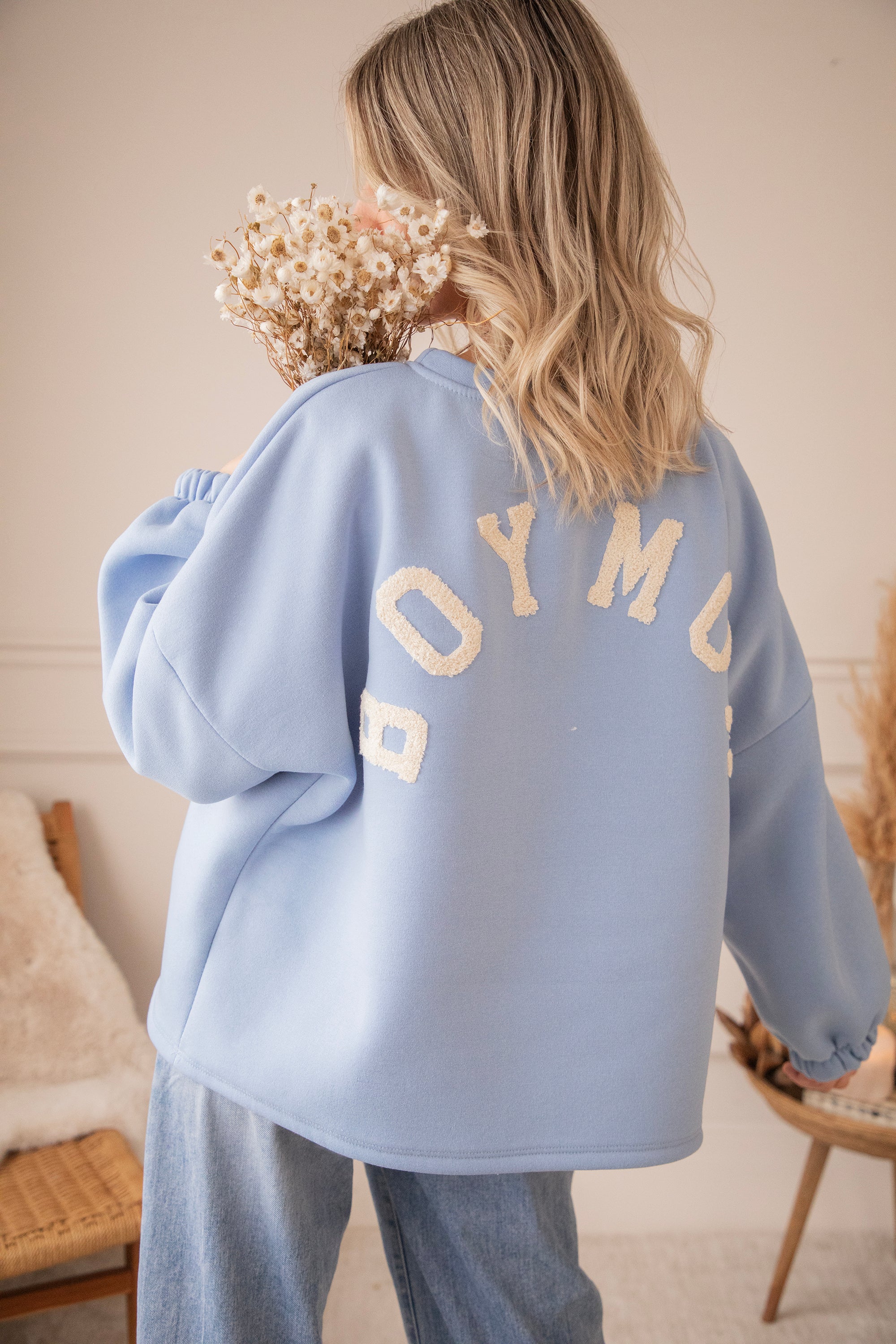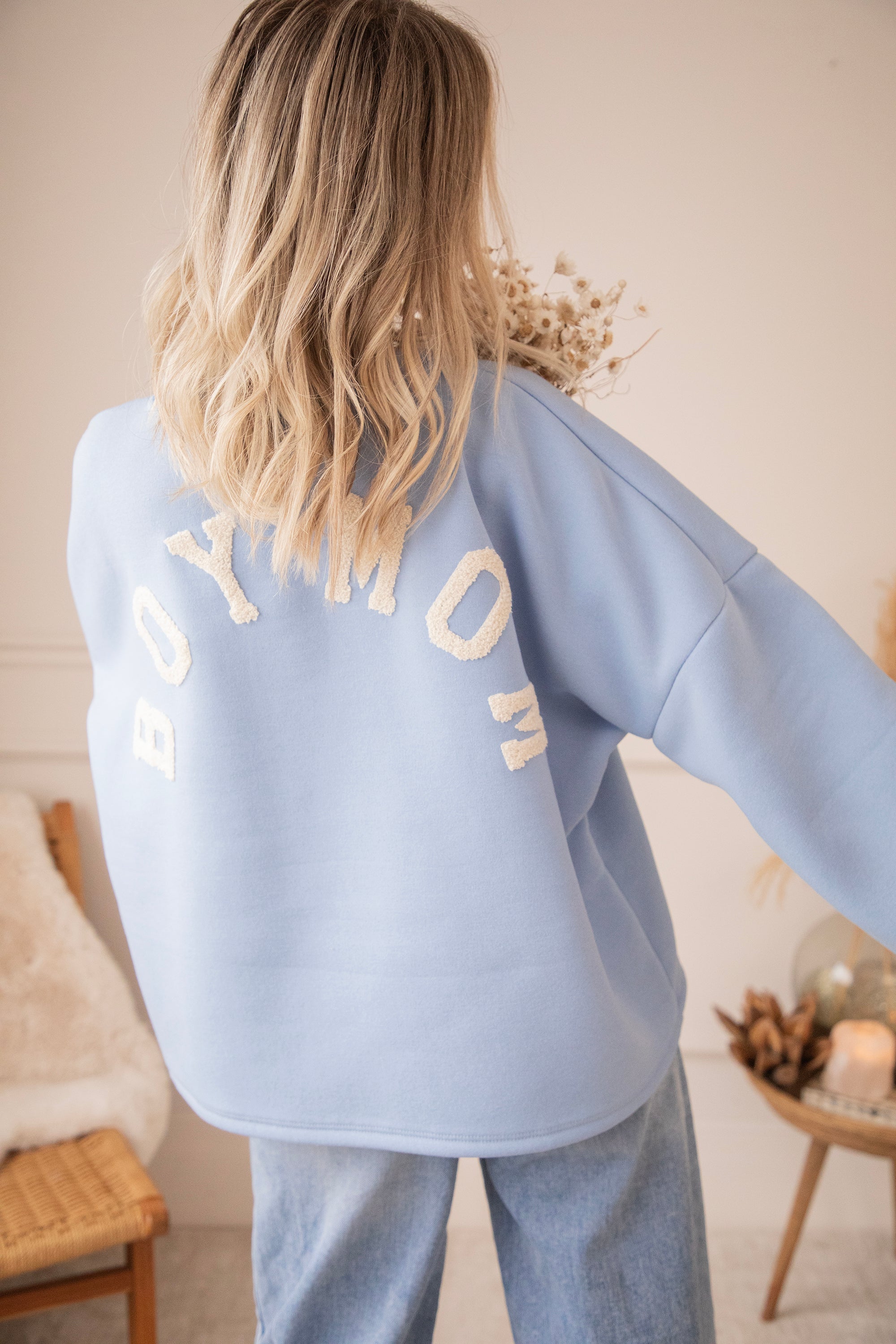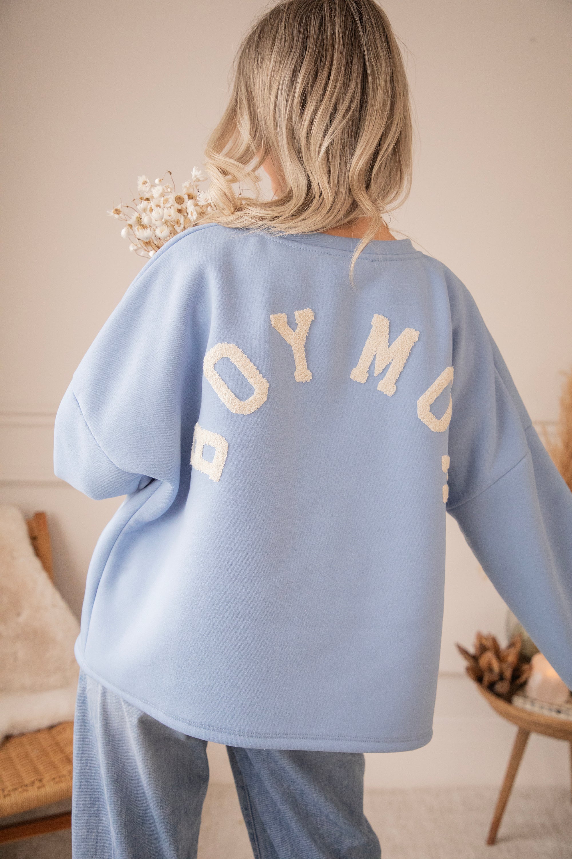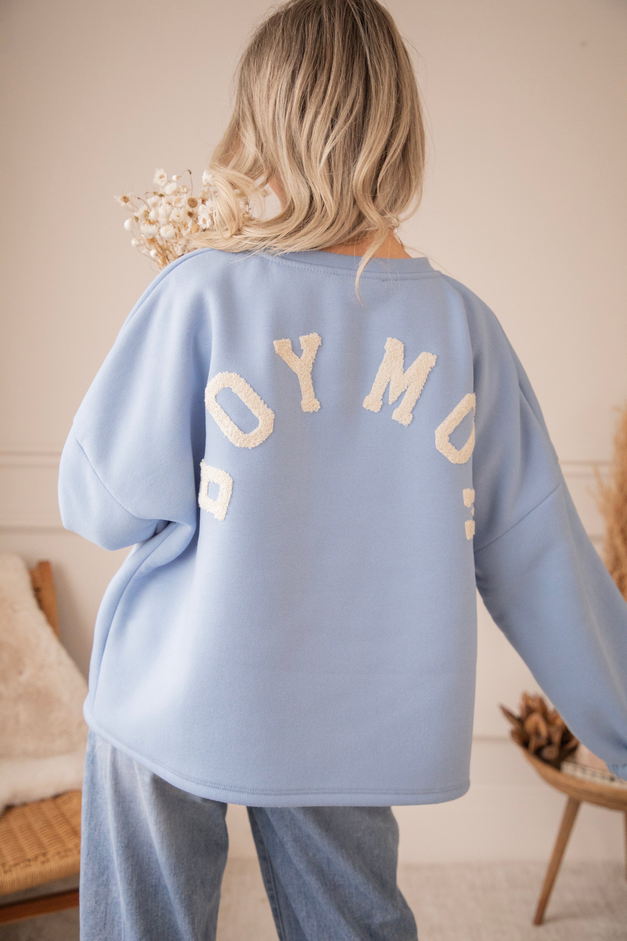 Onze Lily sweater nu met BOY MOM groot op de rug in fris blauw met beige teddy letters. Een frisse en zachte combinatie 🌿