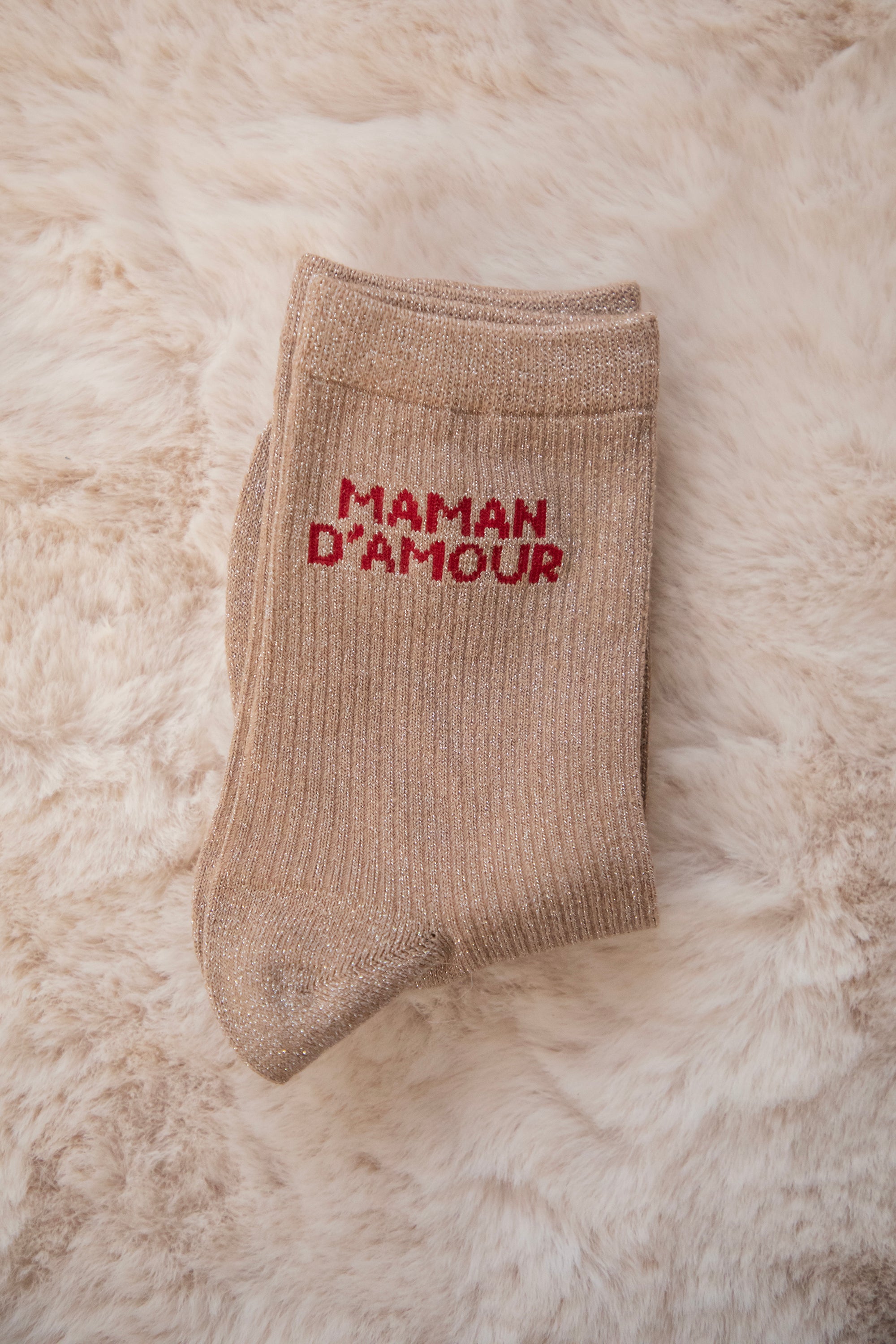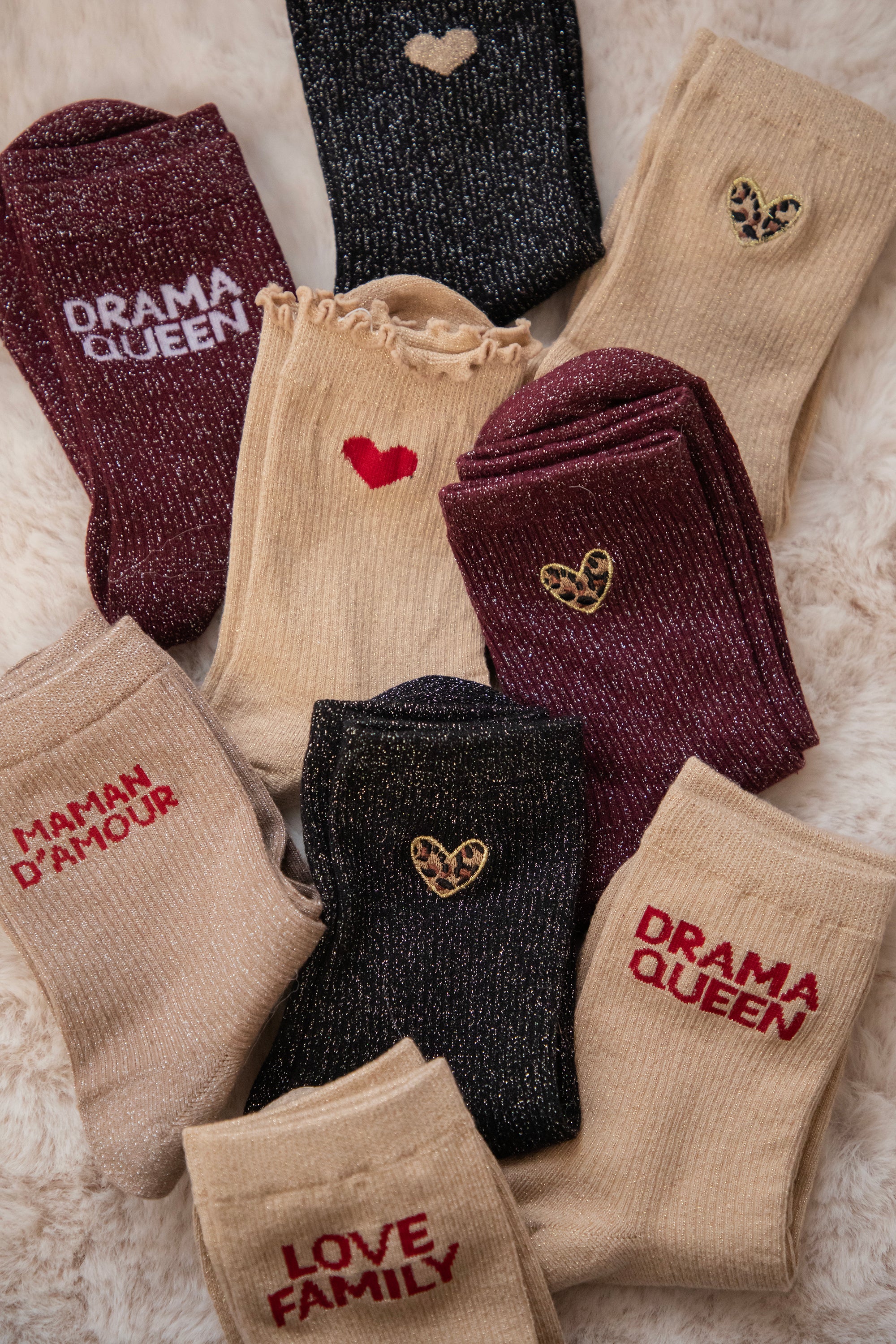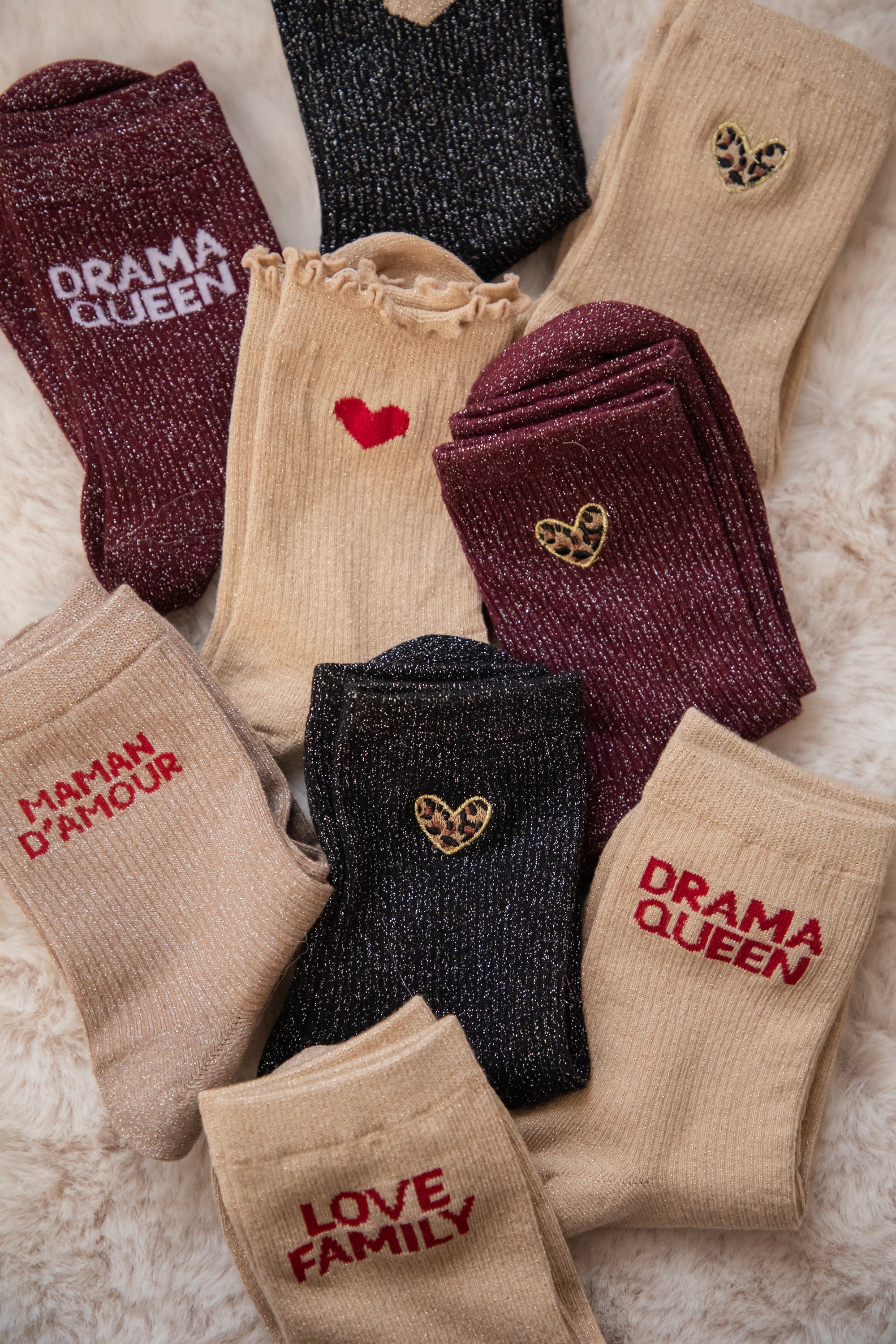 Onze Maman d’Amour sokken zijn zo’n schattig, warm accessoire dat meteen een vleugje liefde toevoegt aan je outfit. De combinatie van beige met bordeaux letters en een subtiel glittertje geeft ze een zachte, cozy uitstraling, ...
