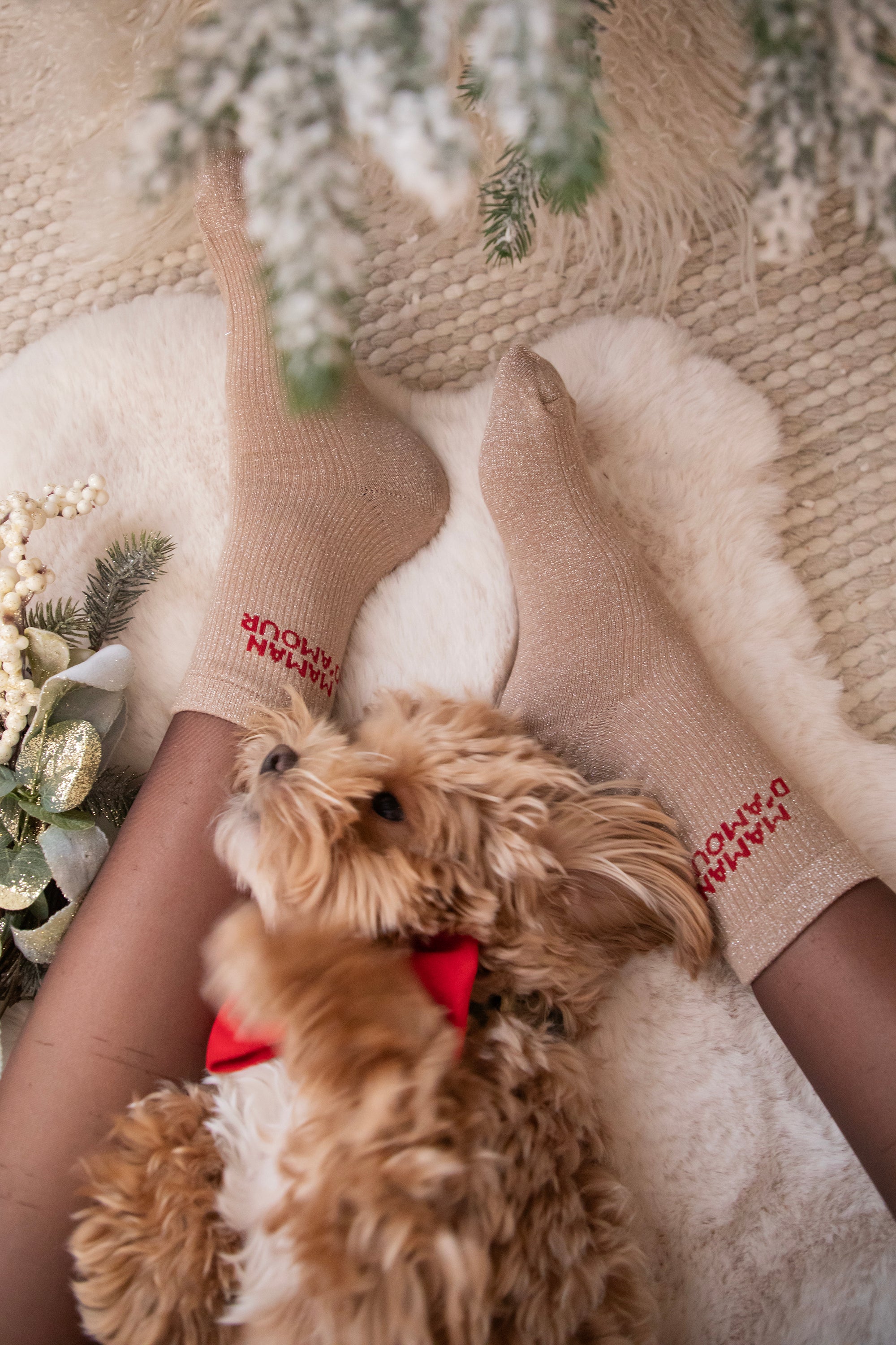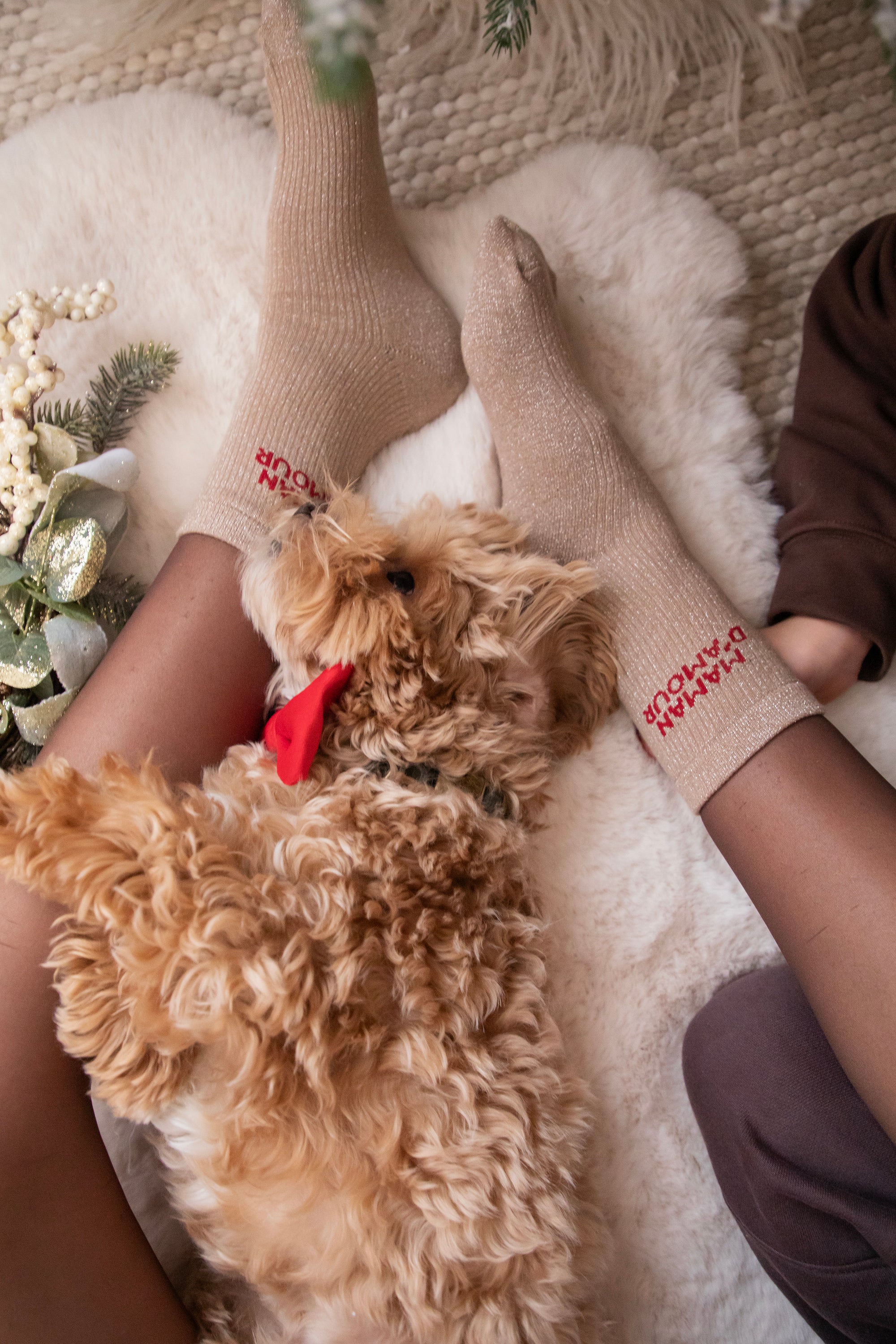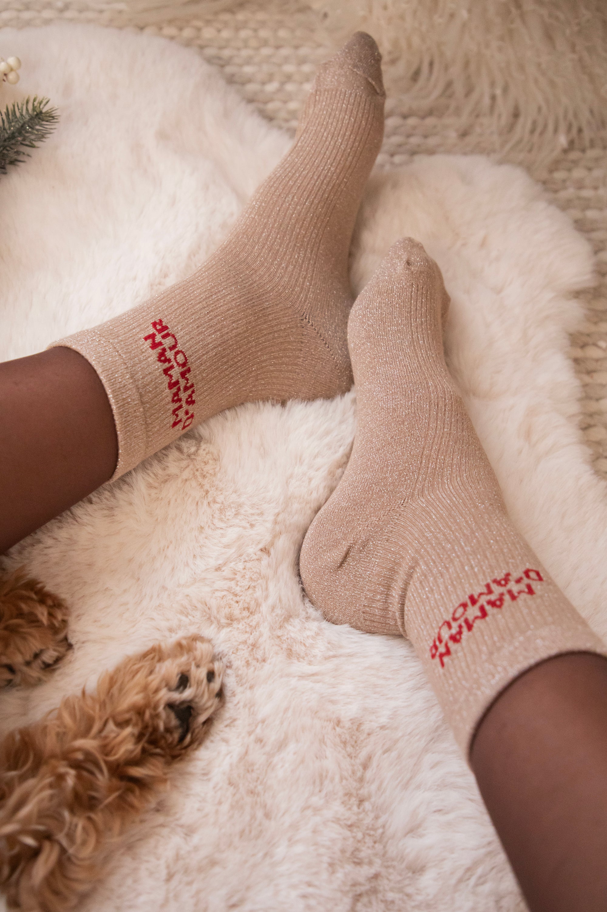 Onze Maman d’Amour sokken zijn zo’n schattig, warm accessoire dat meteen een vleugje liefde toevoegt aan je outfit. De combinatie van beige met bordeaux letters en een subtiel glittertje geeft ze een zachte, cozy uitstraling, ...