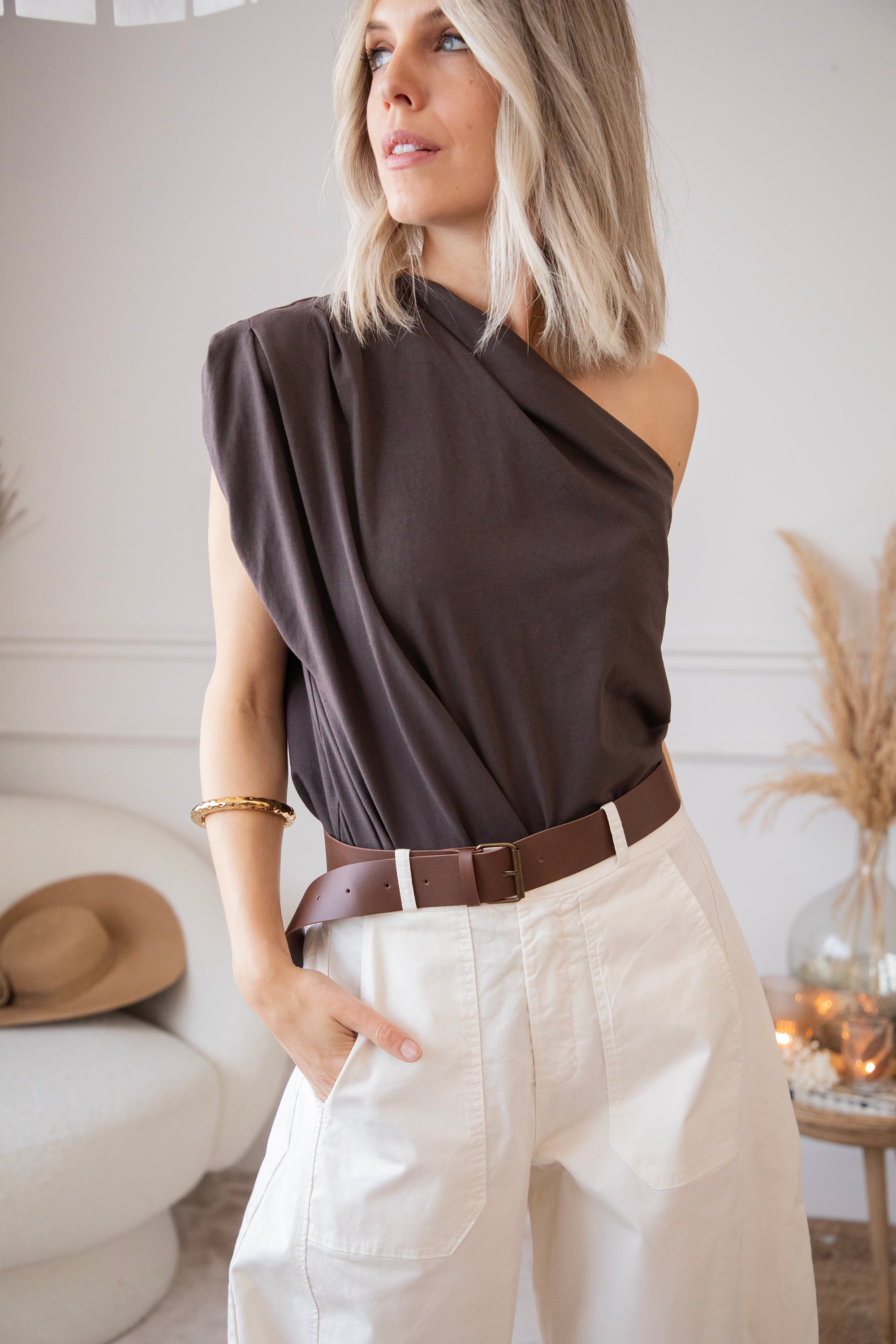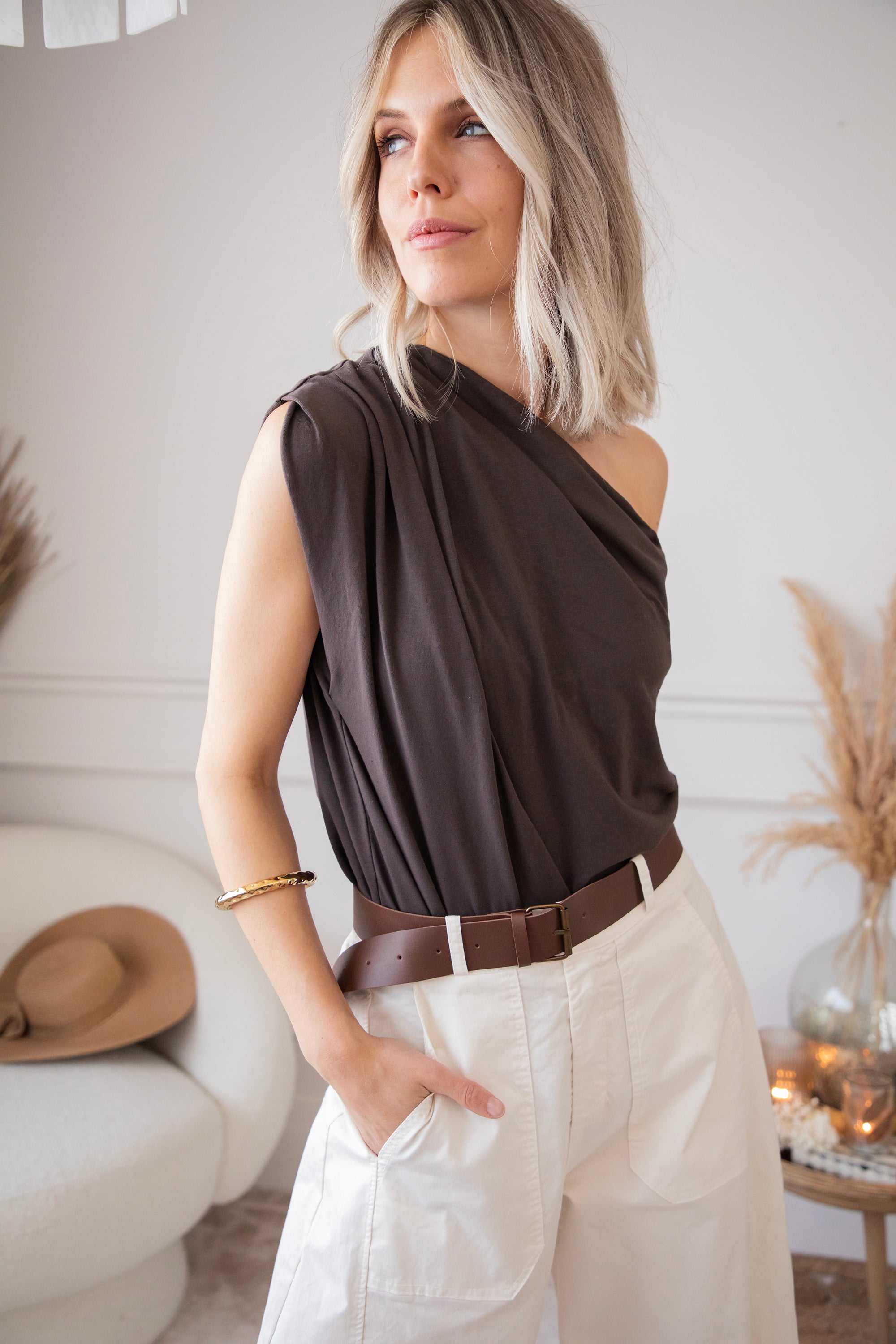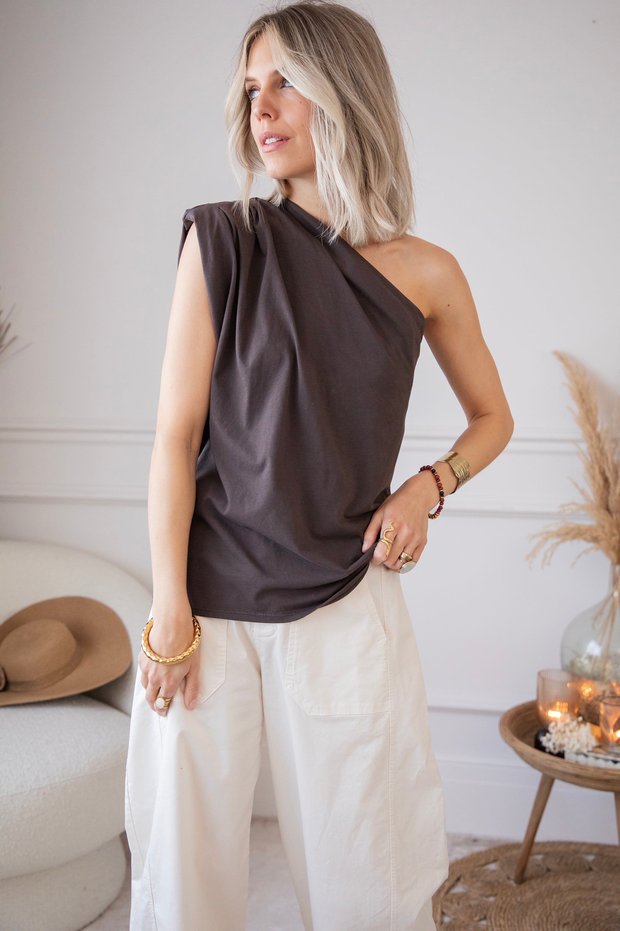 Zo’n top waar je altijd op kan terugvallen als je even niet weet wat aan te trekken, maar wél stylish en comfy wil zijn! De stof voelt aan als een T-shirt, superzacht en luchtig, en het modelletje drapeert echt prachtig over je schouder. Zo elegant! En wat ik zelf heel belangrijk vind bij een one shoulder top: hij zit gewoon héél fijn. Gewoon een top die mooi blijft zitten en waarin je je goed voelt!