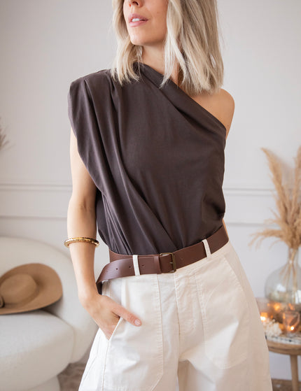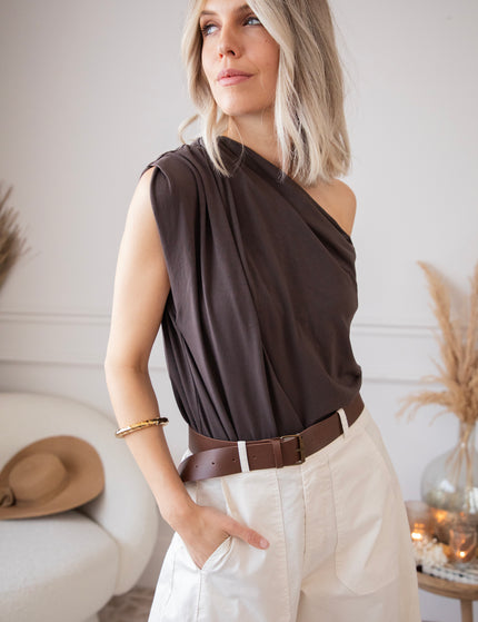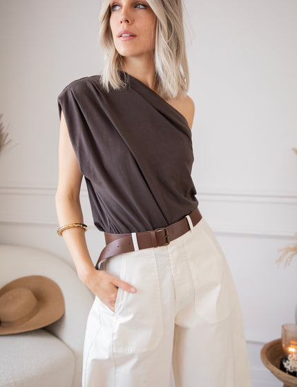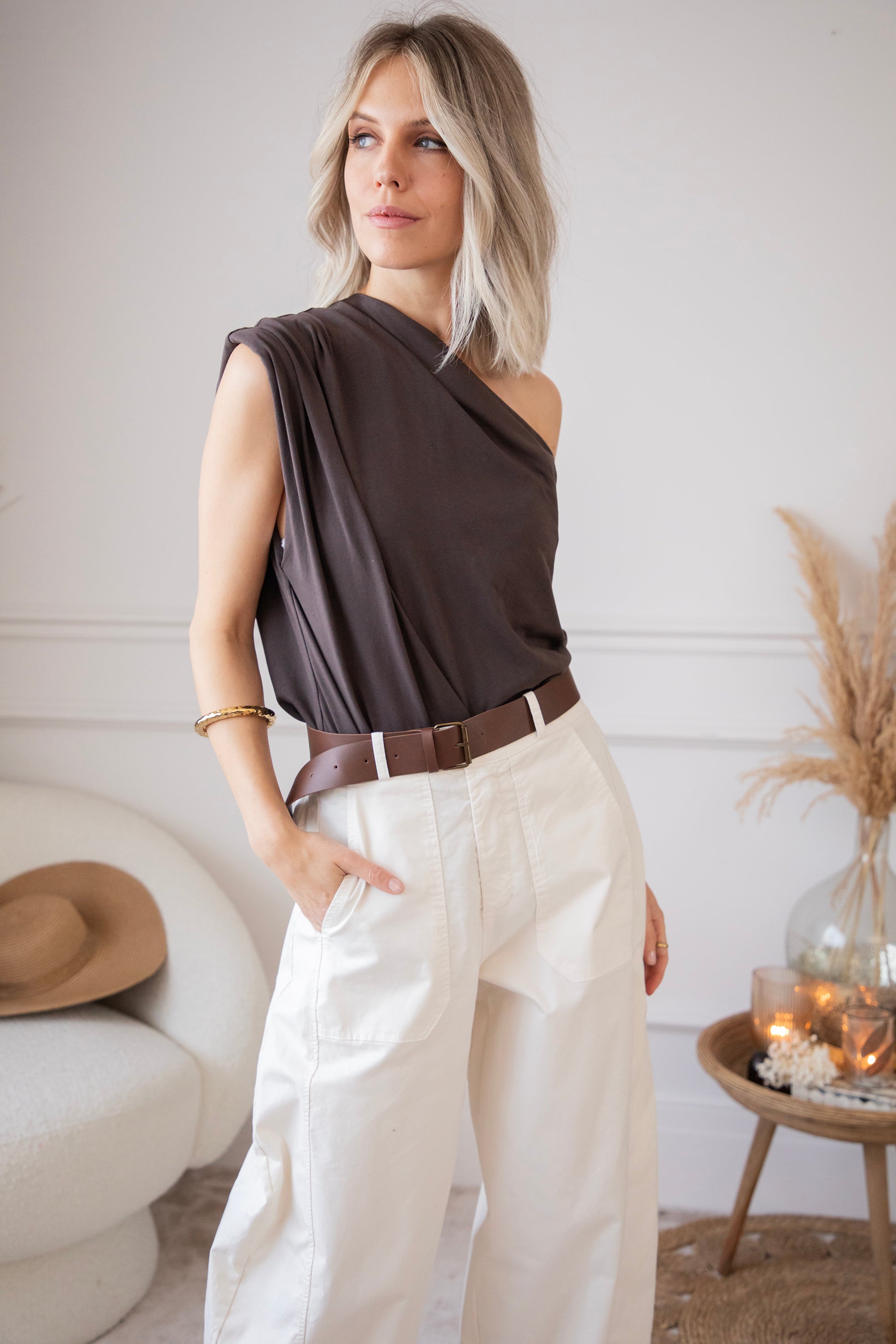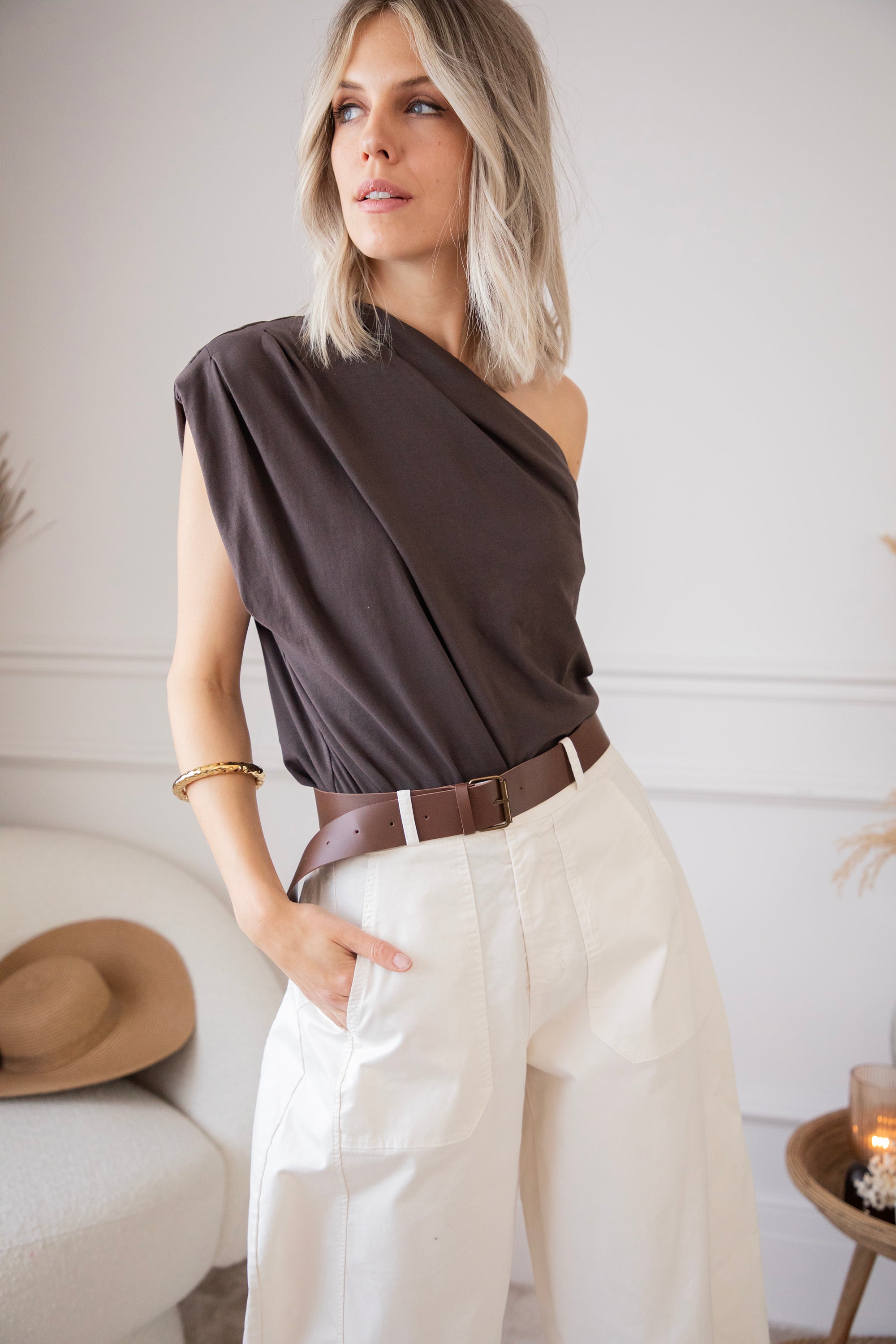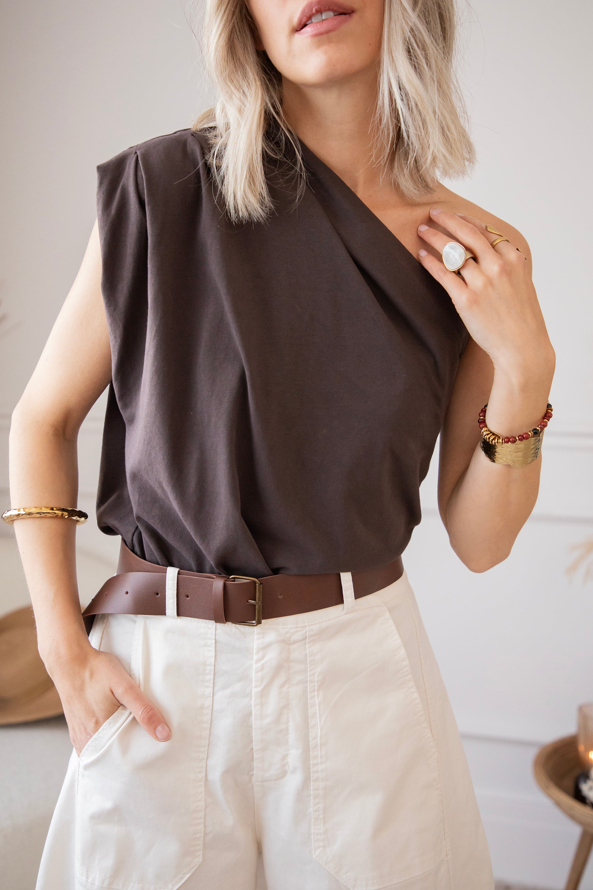 Zo’n top waar je altijd op kan terugvallen als je even niet weet wat aan te trekken, maar wél stylish en comfy wil zijn! De stof voelt aan als een T-shirt, superzacht en luchtig, en het modelletje drapeert echt prachtig over je schouder. Zo elegant! En wat ik zelf heel belangrijk vind bij een one shoulder top: hij zit gewoon héél fijn. Gewoon een top die mooi blijft zitten en waarin je je goed voelt!