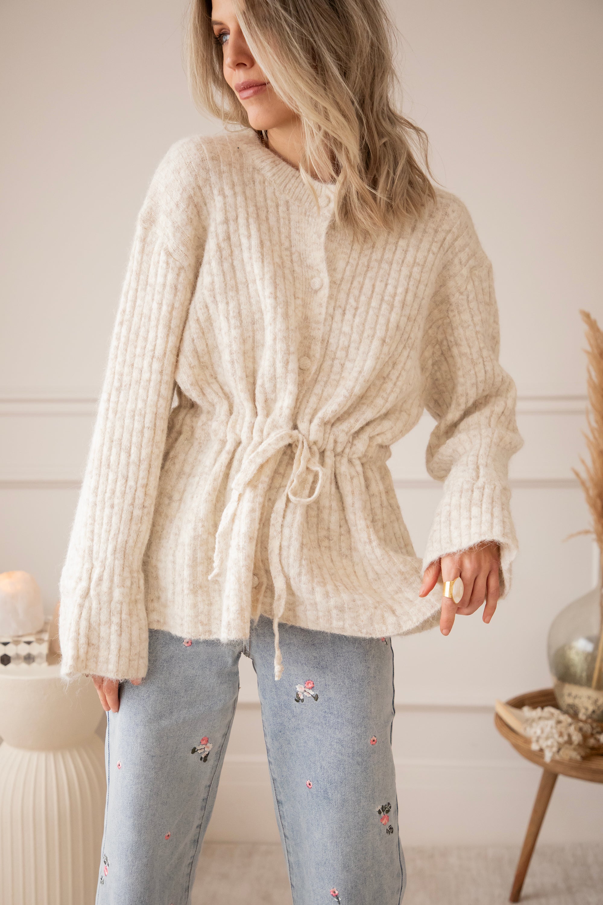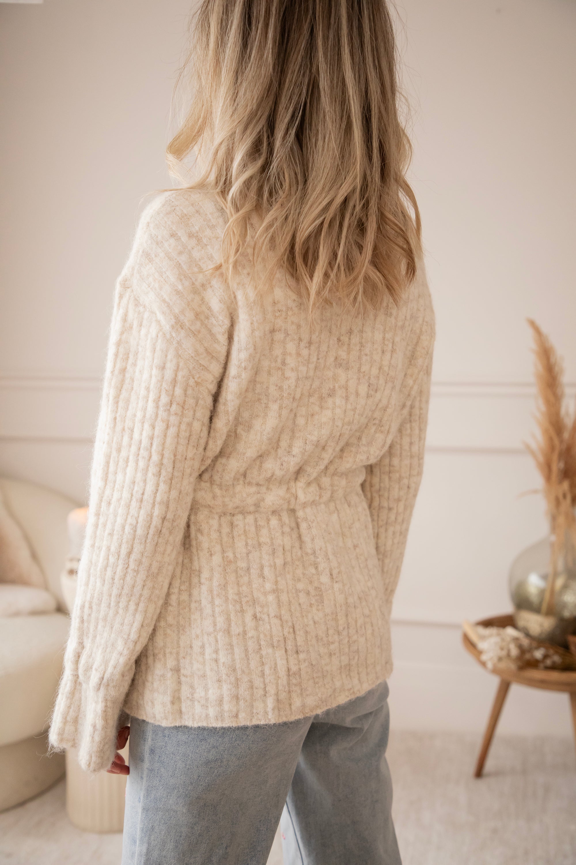 Oeh jaaa dit vest kan je lekker aantrekken voor nog meer cozy cuddle feelings! 🧸 En je brengt meteen model in het vestje 😍 Het is een loose fit met zo'n zalige zachte stof met ribgebreid motiefje. Ze valt heel soepel en de koordjes brengen net wat extra speelsheid en coziness.