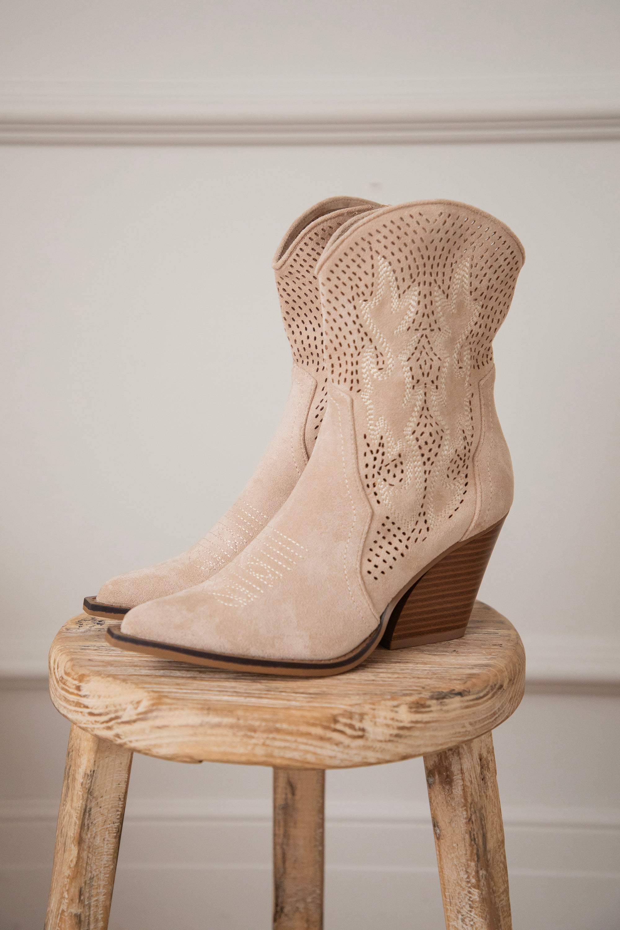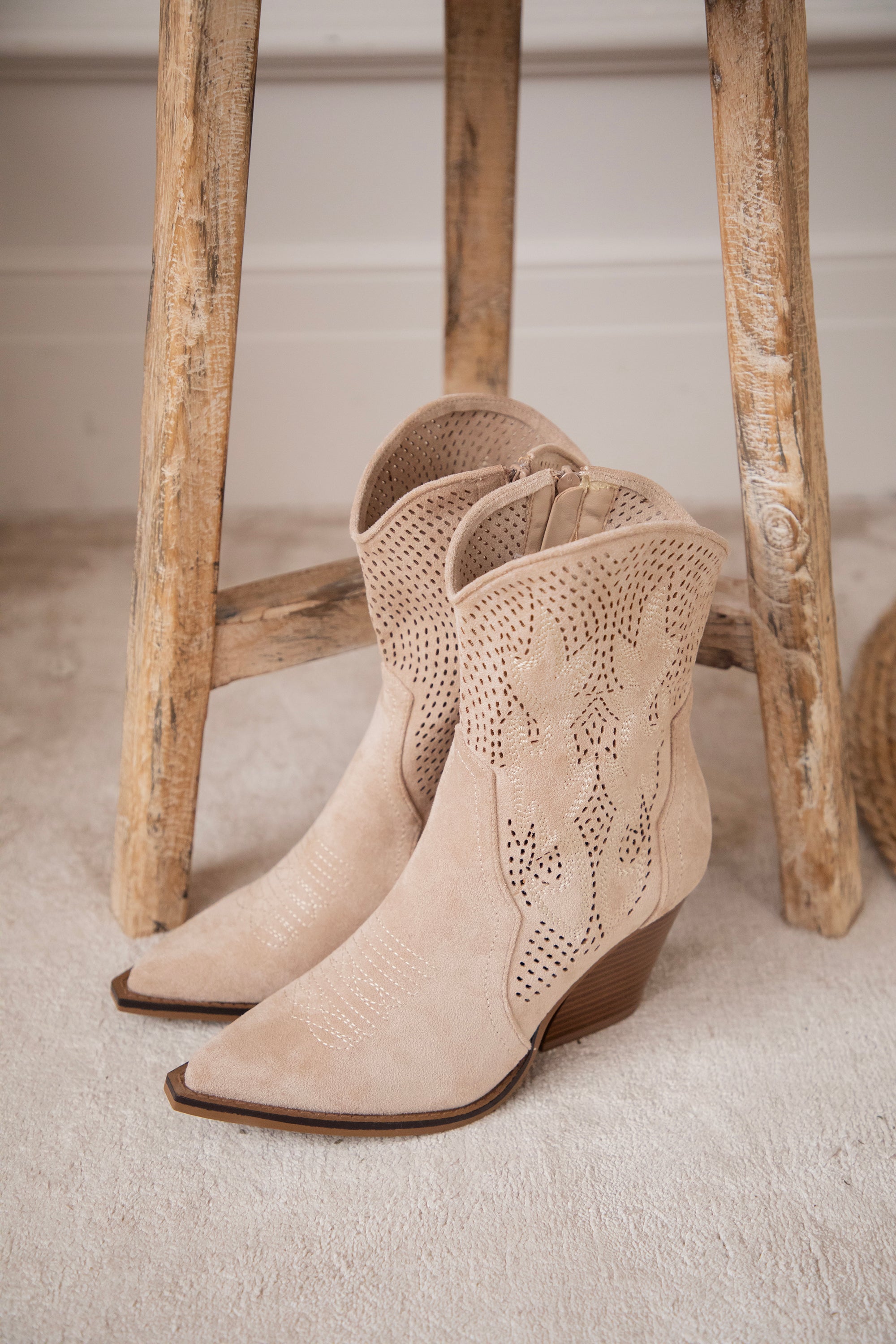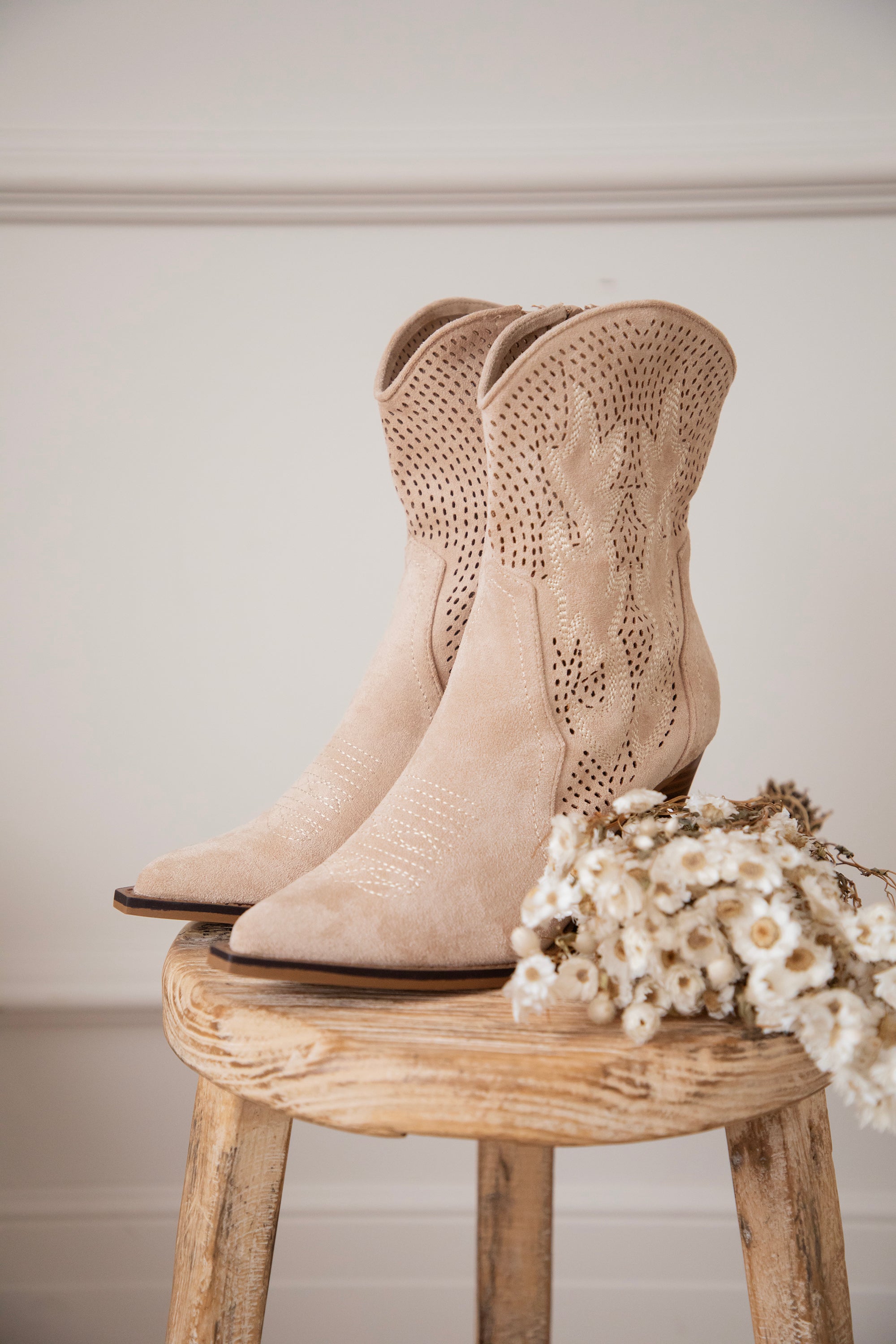 Zoals jullie weten: western boots zijn écht onmisbaar in de ellemilla collectie! En deze Rodeo Girl boots zijn weer zo’n toppertje. Beige suède, een midi hoge schacht, schuine bruine hak, puntige teen… alles wat ik zoek in een western boot zit hierin 👢 En check die coole grid look met subtiele flaming details 🔥 Dat maakt ze nét dat tikkeltje specialer!