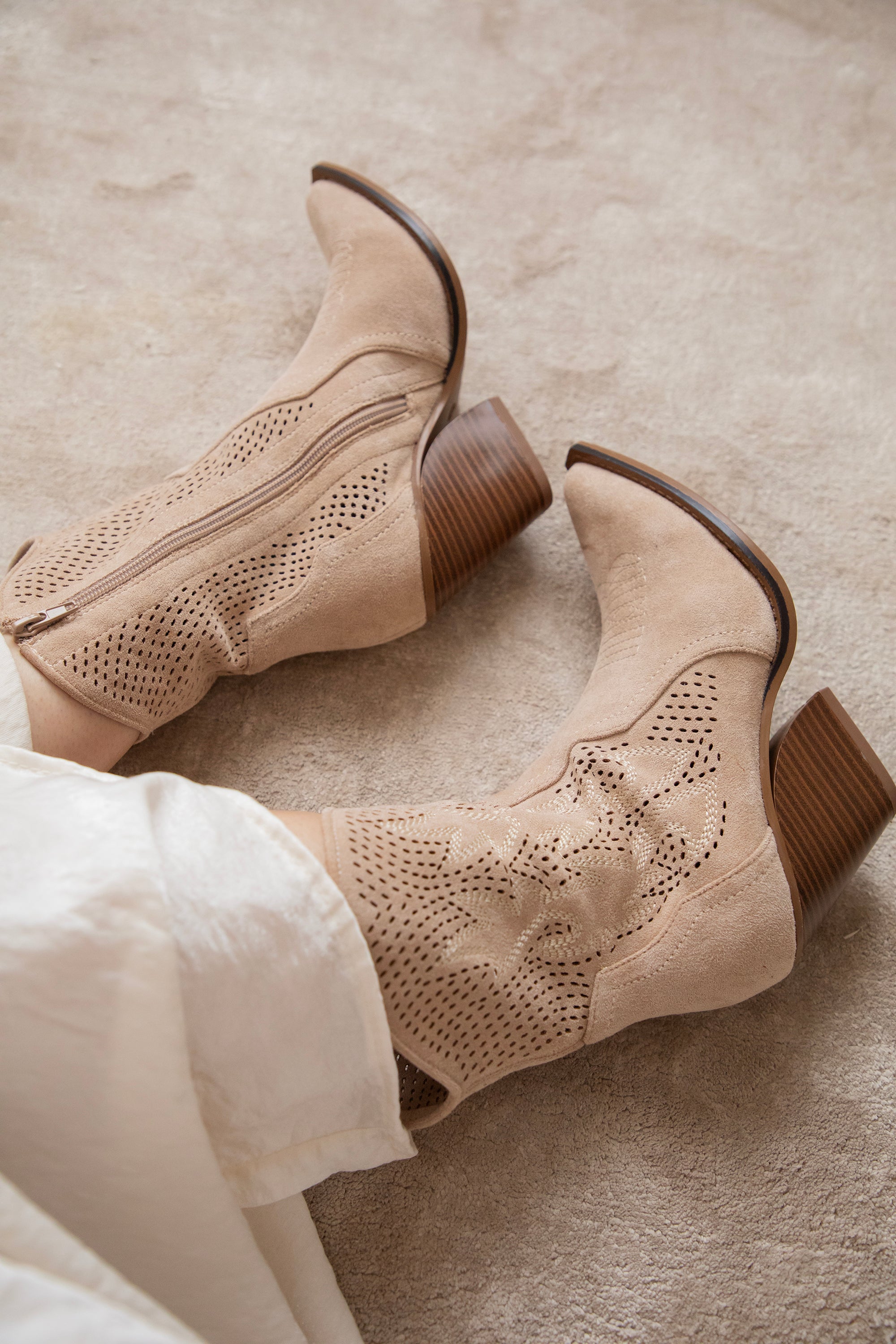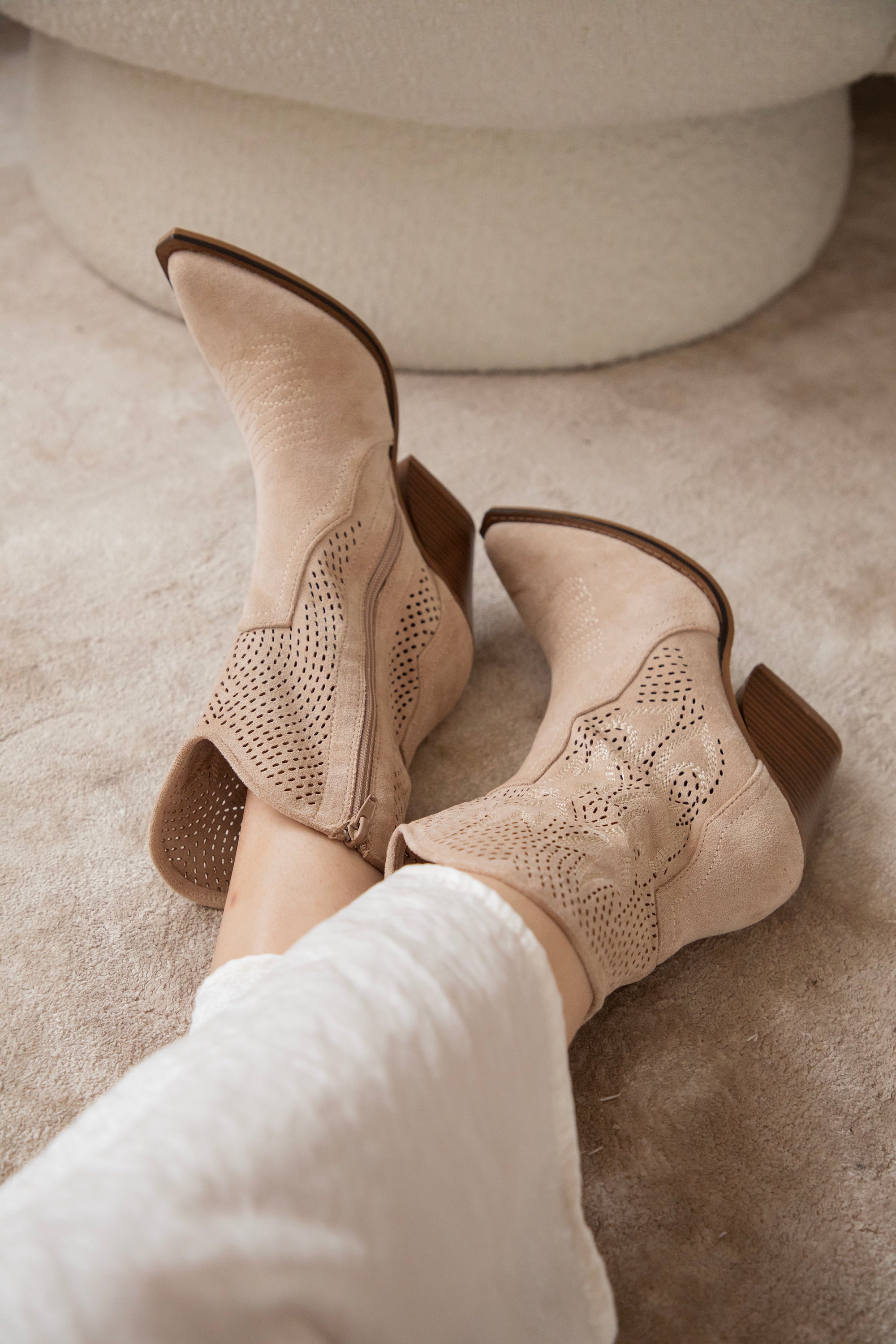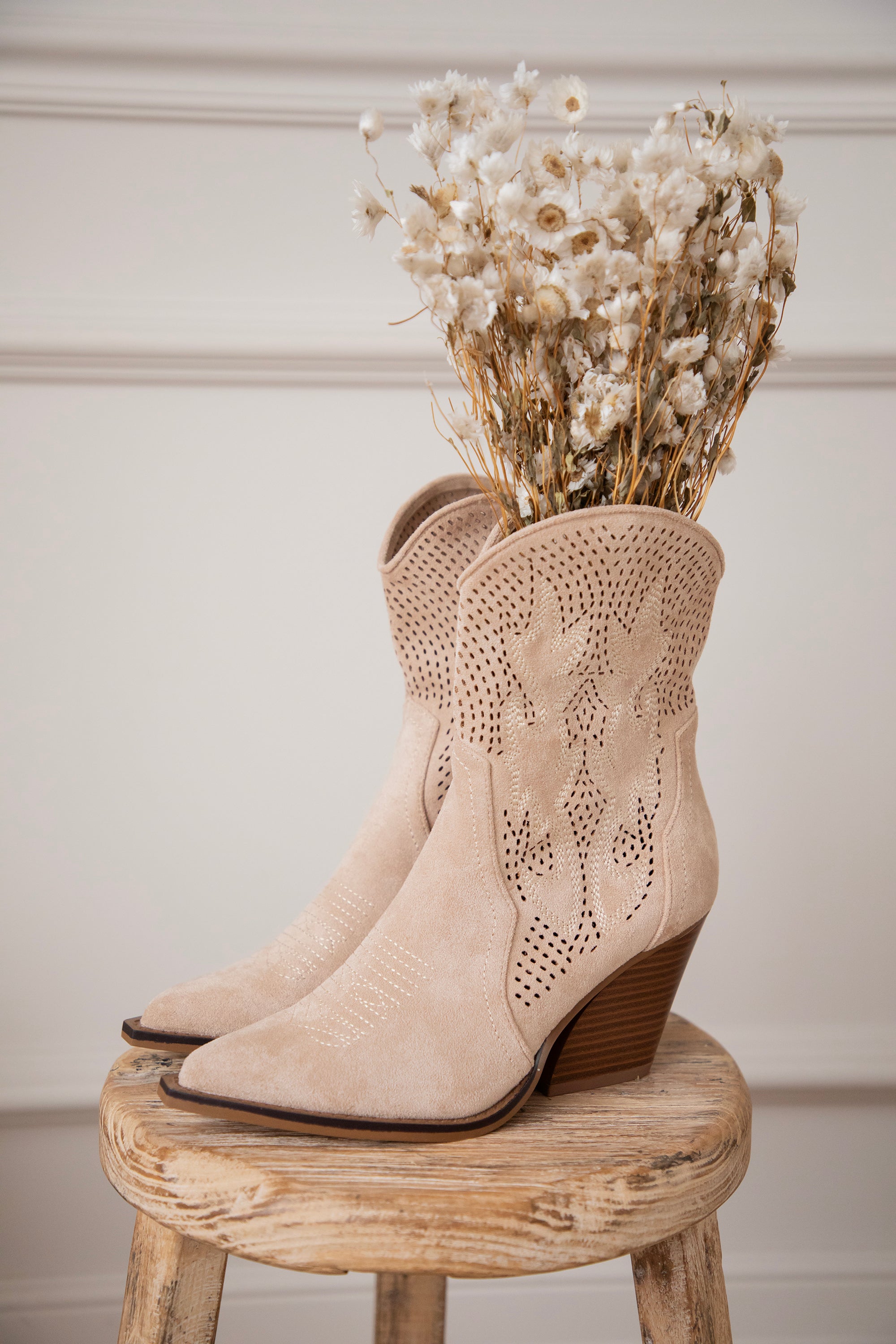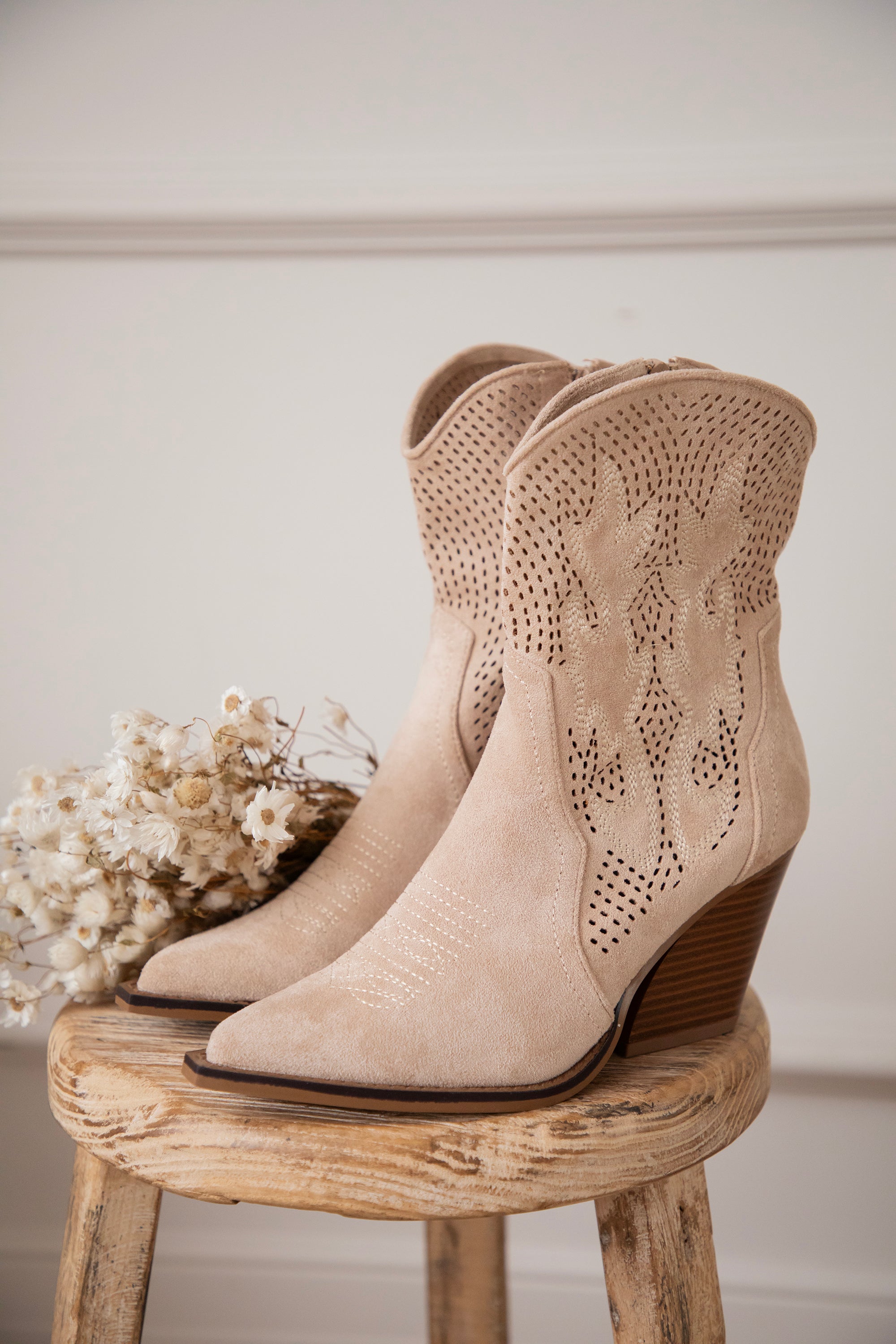 Zoals jullie weten: western boots zijn écht onmisbaar in de ellemilla collectie! En deze Rodeo Girl boots zijn weer zo’n toppertje. Beige suède, een midi hoge schacht, schuine bruine hak, puntige teen… alles wat ik zoek in een western boot zit hierin 👢 En check die coole grid look met subtiele flaming details 🔥 Dat maakt ze nét dat tikkeltje specialer!