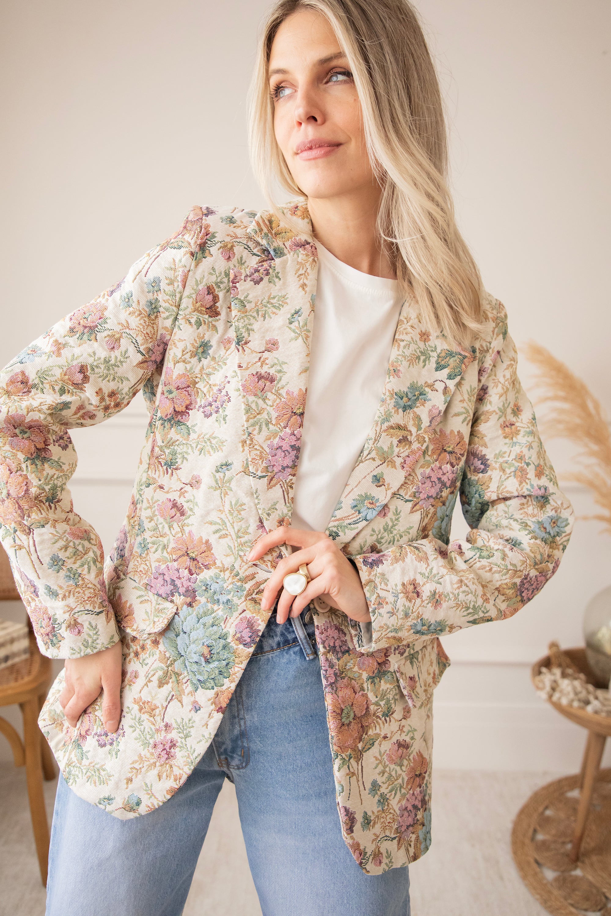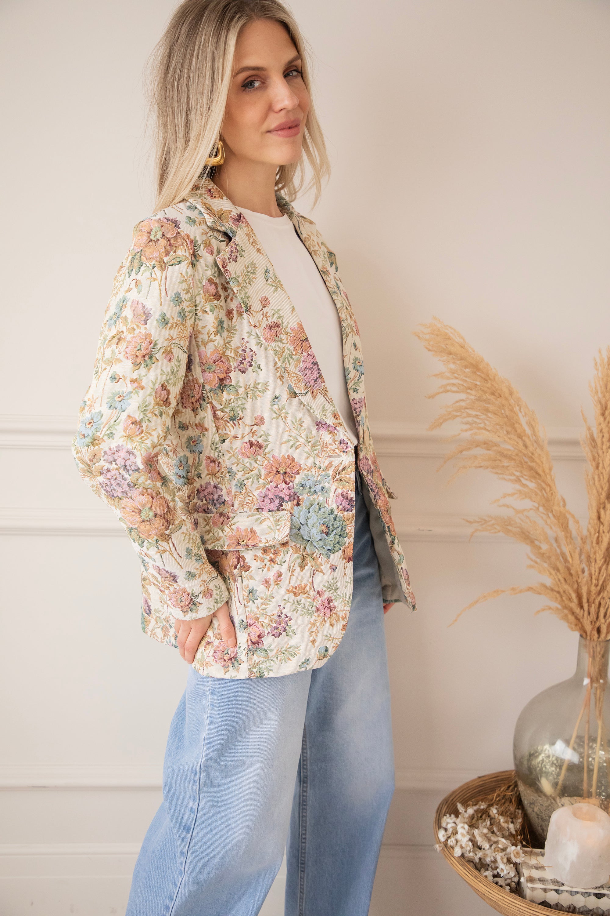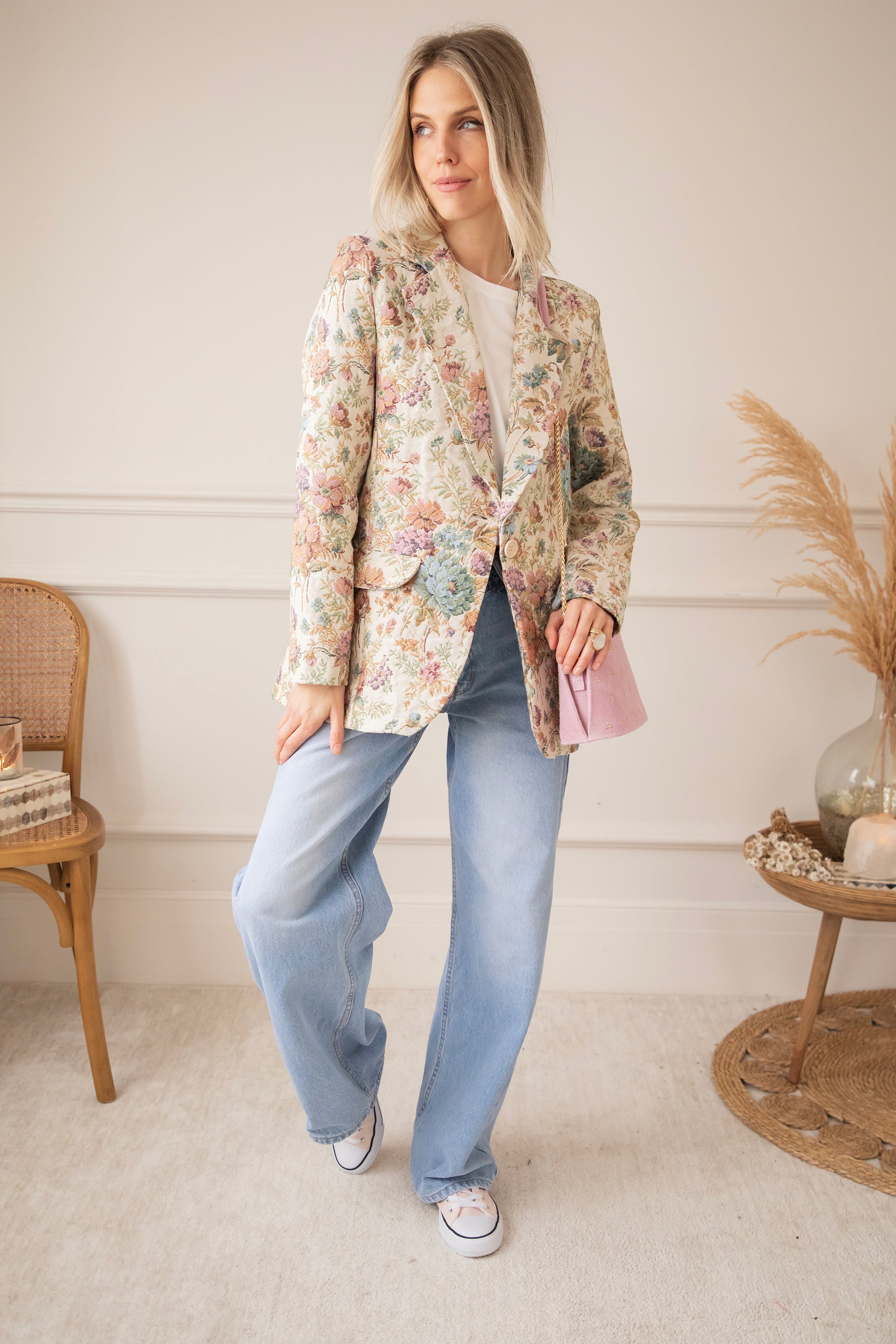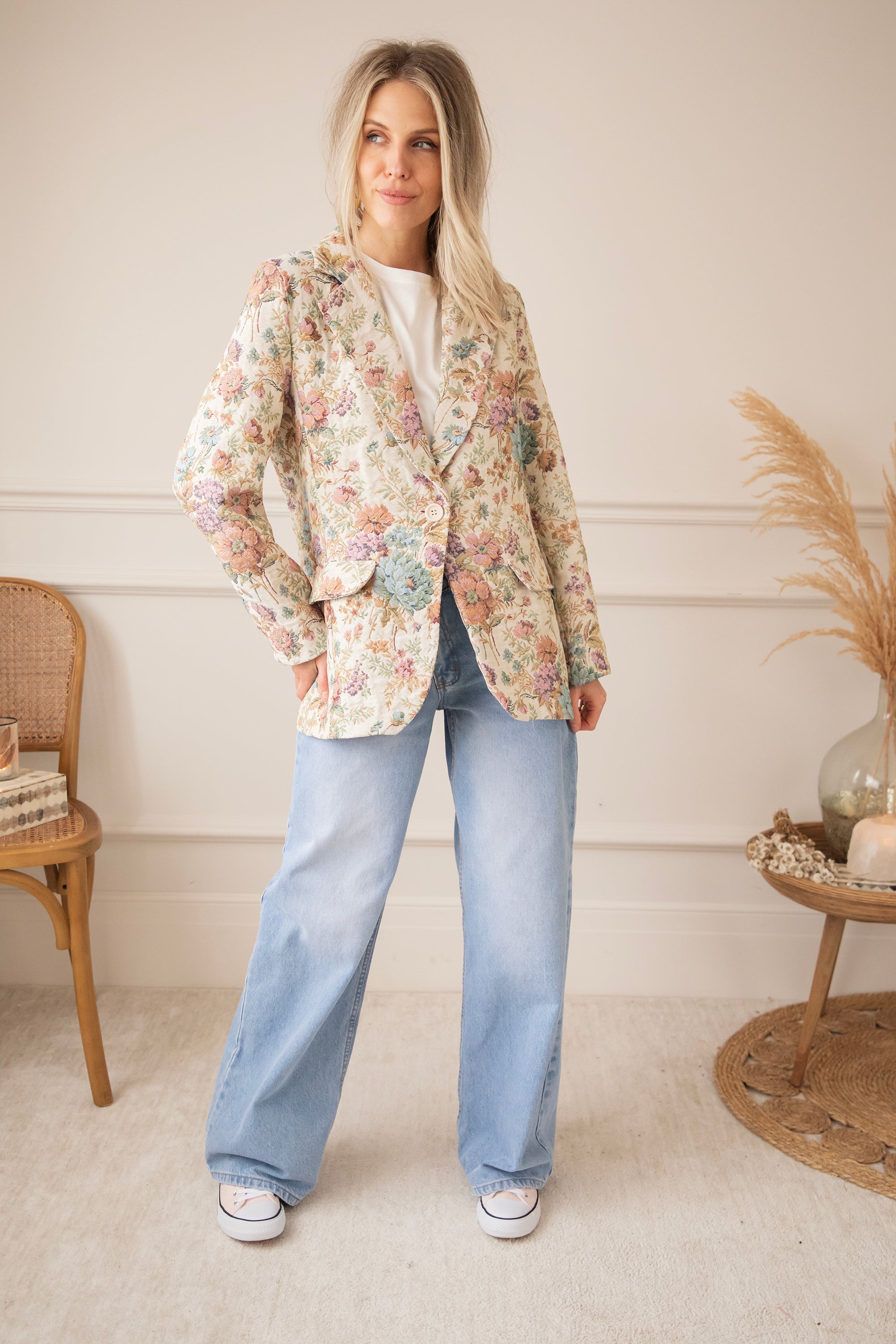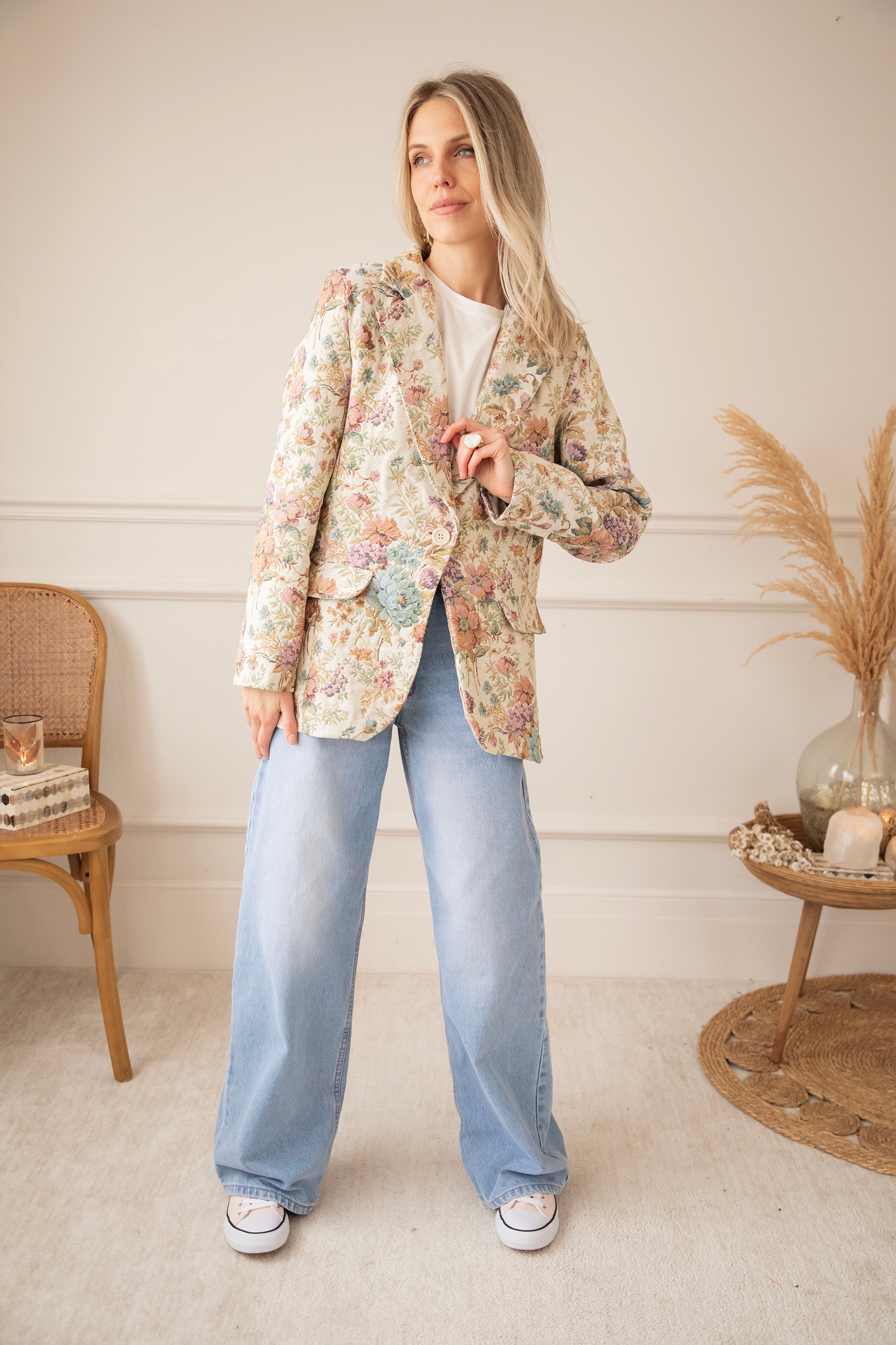 Deze blazer heeft een dromerig, weelderig bloemenpatroon in roze, blauw, een tikje rusty en groen 🌸 Het voelt een beetje als een schilderijtje… zo’n weelderige print waar je naar kan blijven kijken! De kleuren samen geven haar iets zacht, romantisch en toch een tikkeltje boho. Echt zo’n blazer die meteen karakter geeft aan je outfit.