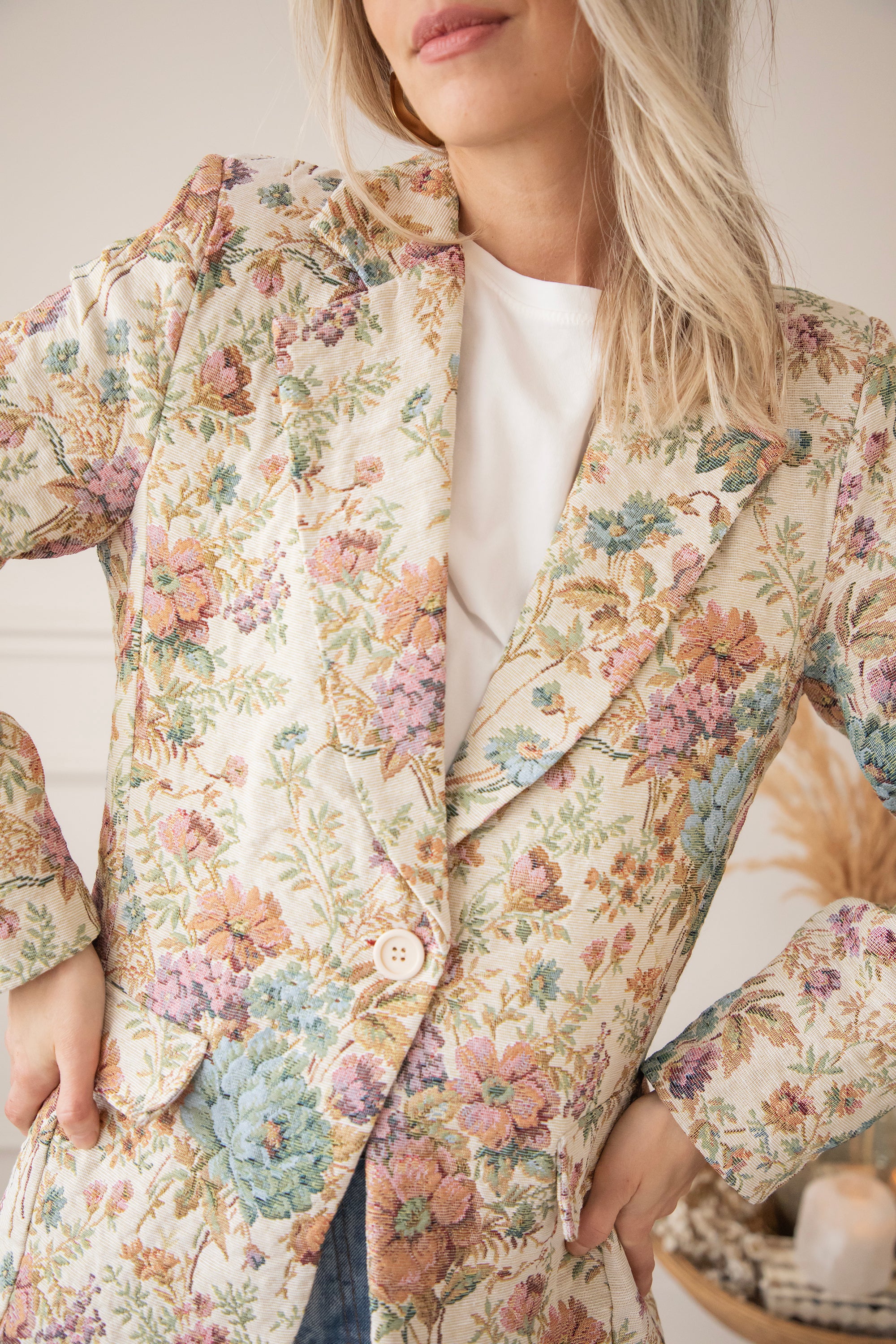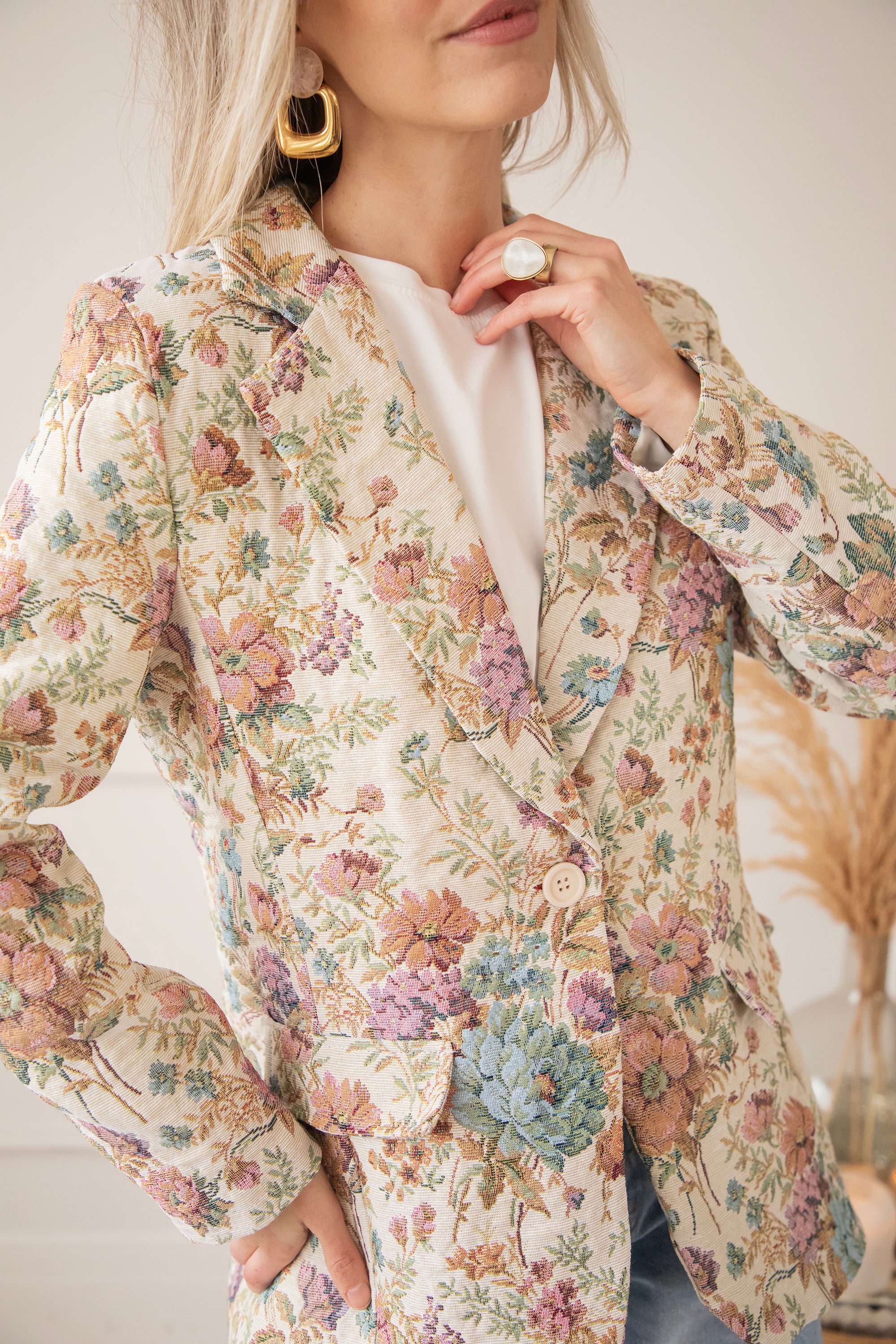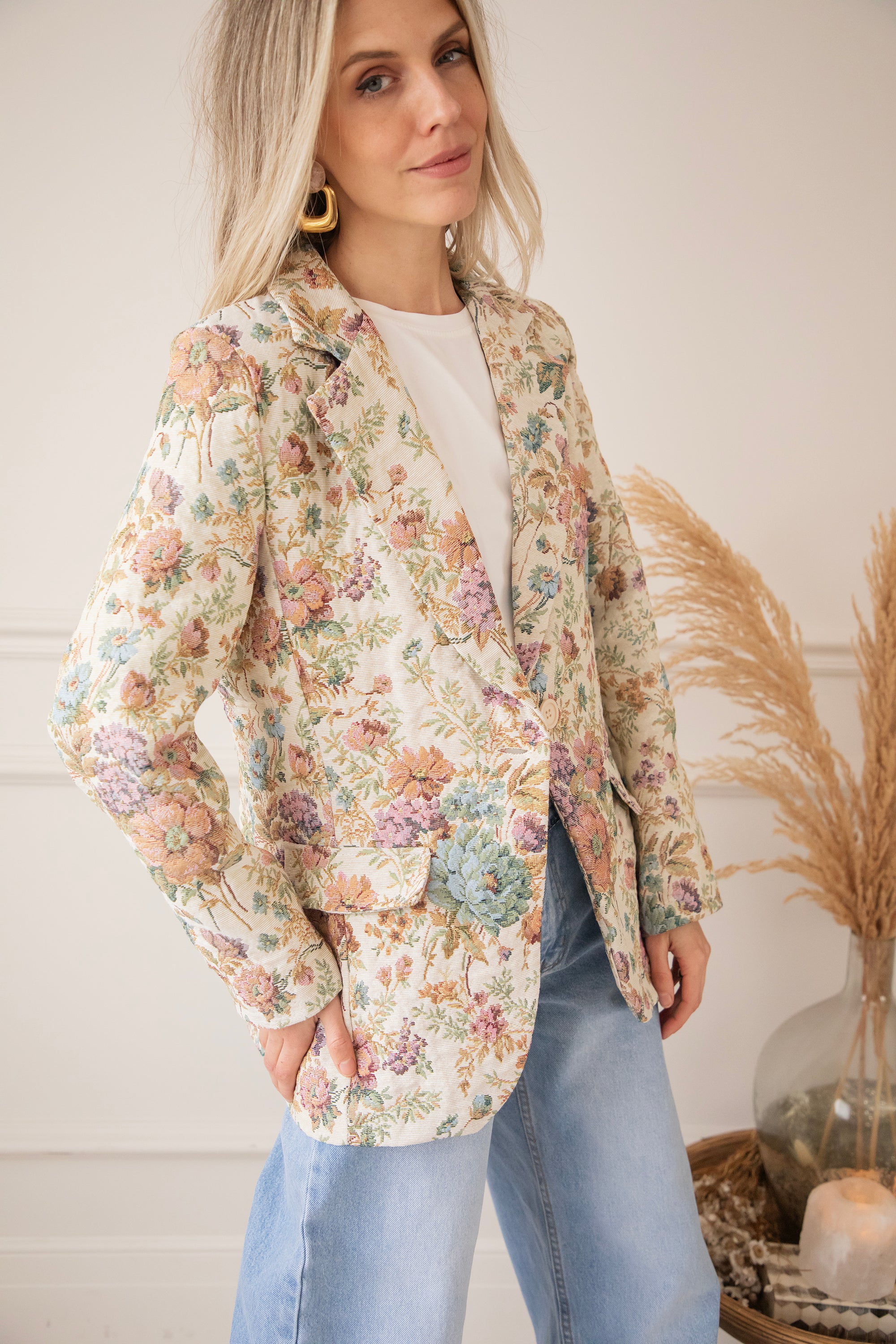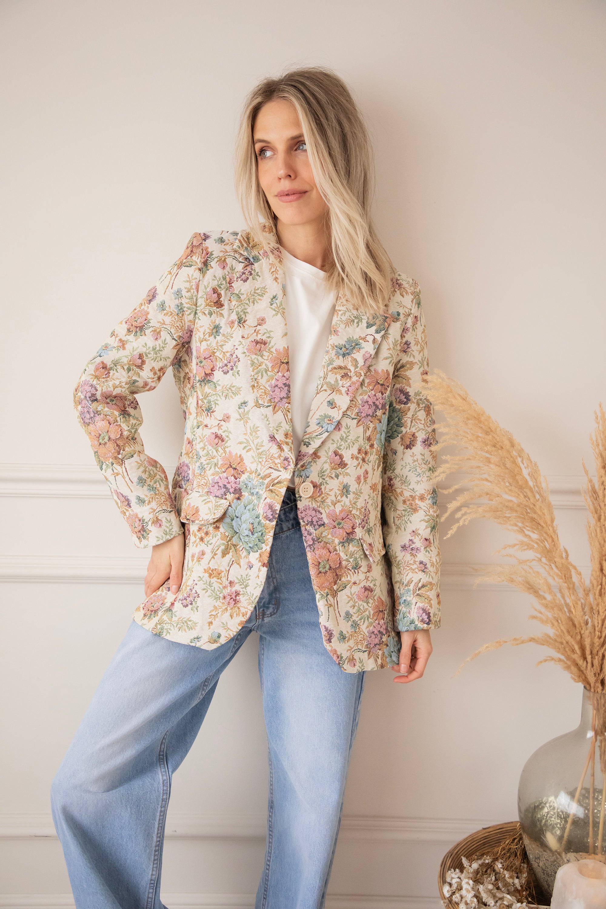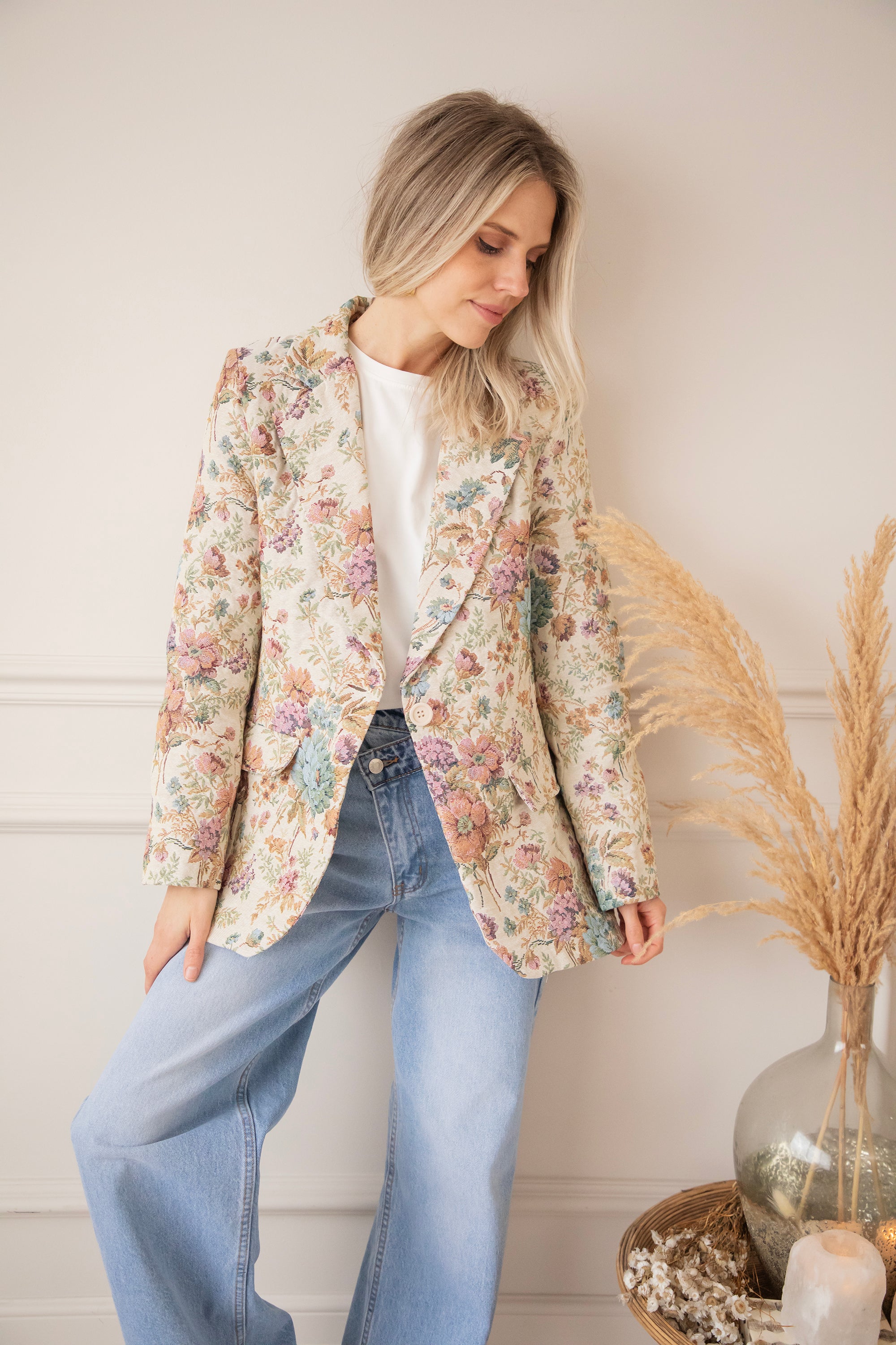 Deze blazer heeft een dromerig, weelderig bloemenpatroon in roze, blauw, een tikje rusty en groen 🌸 Het voelt een beetje als een schilderijtje… zo’n weelderige print waar je naar kan blijven kijken! De kleuren samen geven haar iets zacht, romantisch en toch een tikkeltje boho. Echt zo’n blazer die meteen karakter geeft aan je outfit.