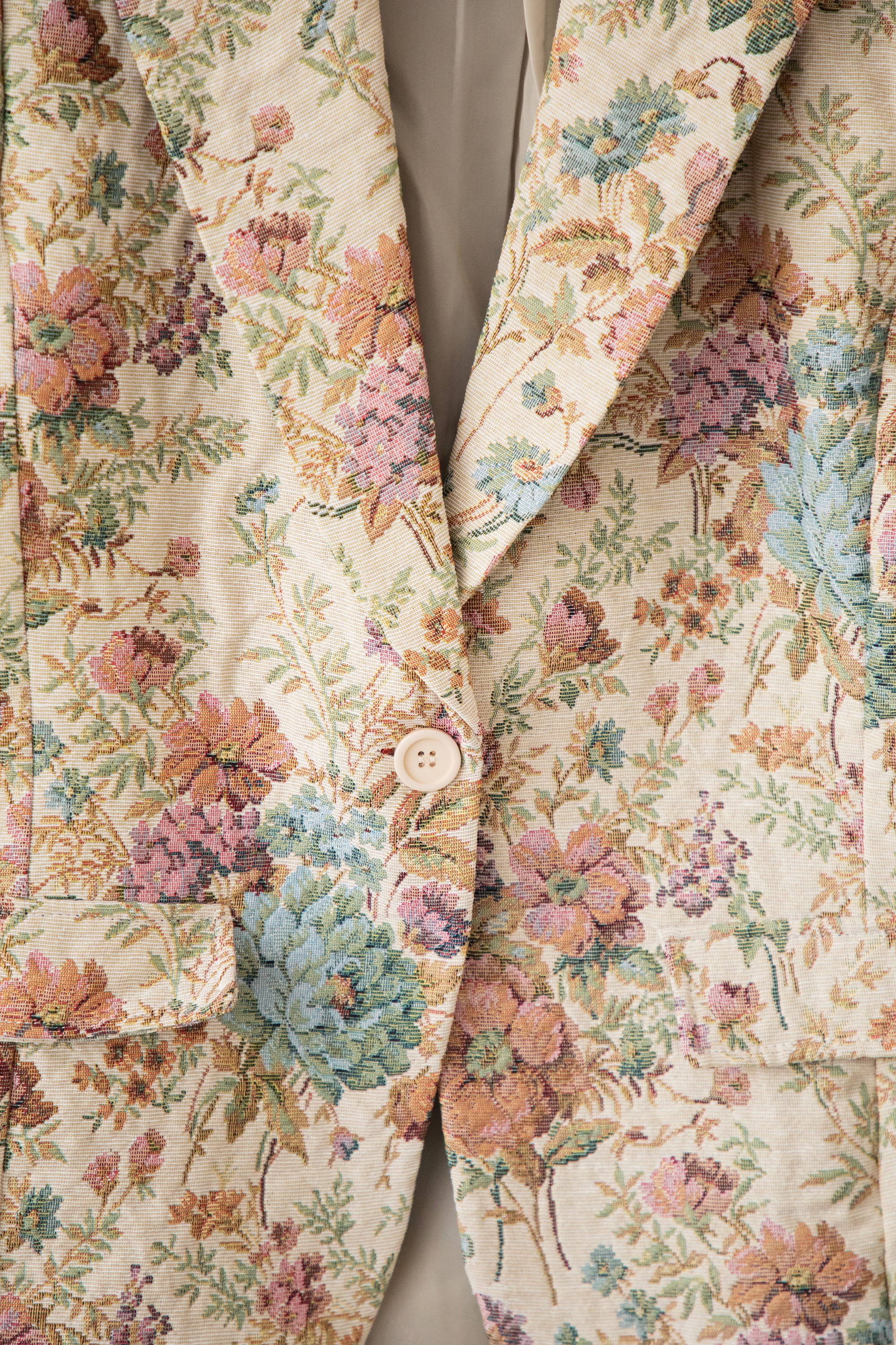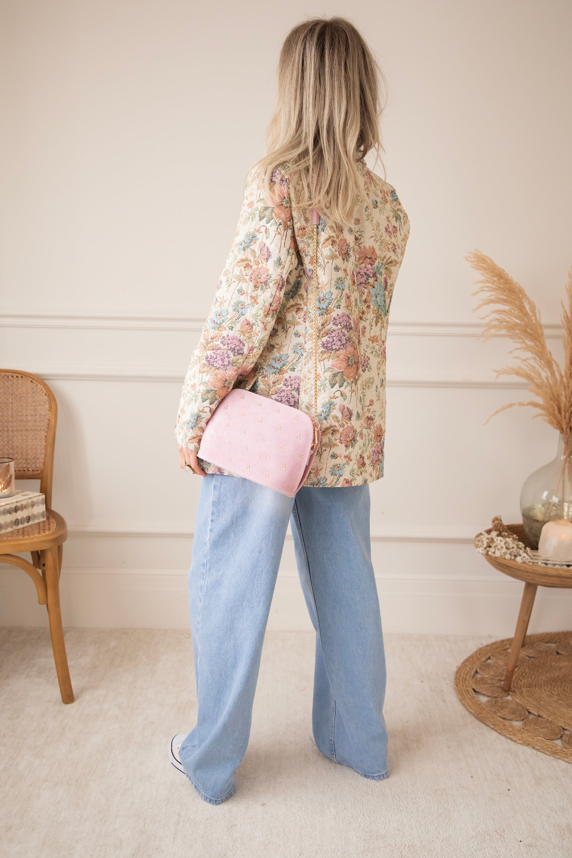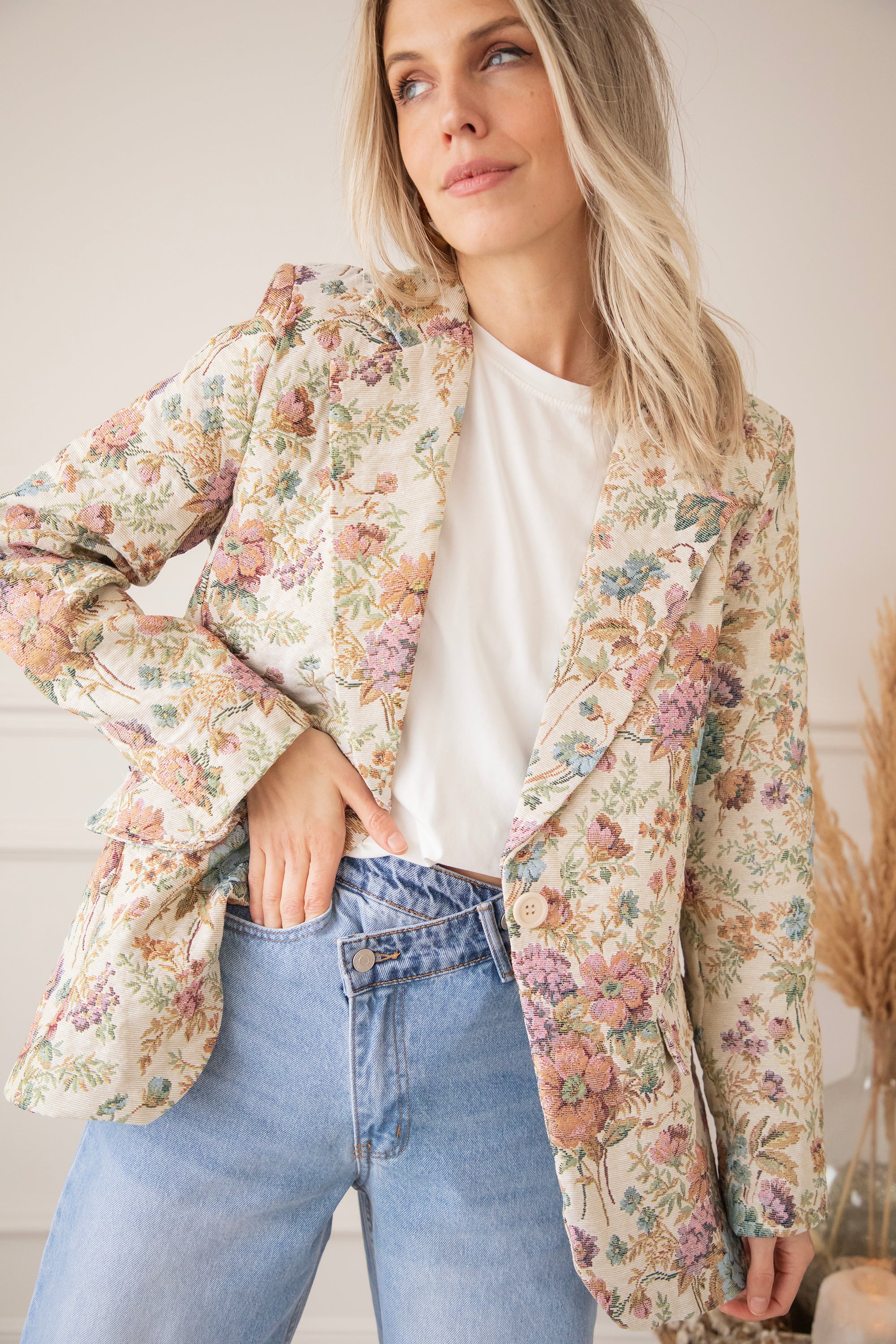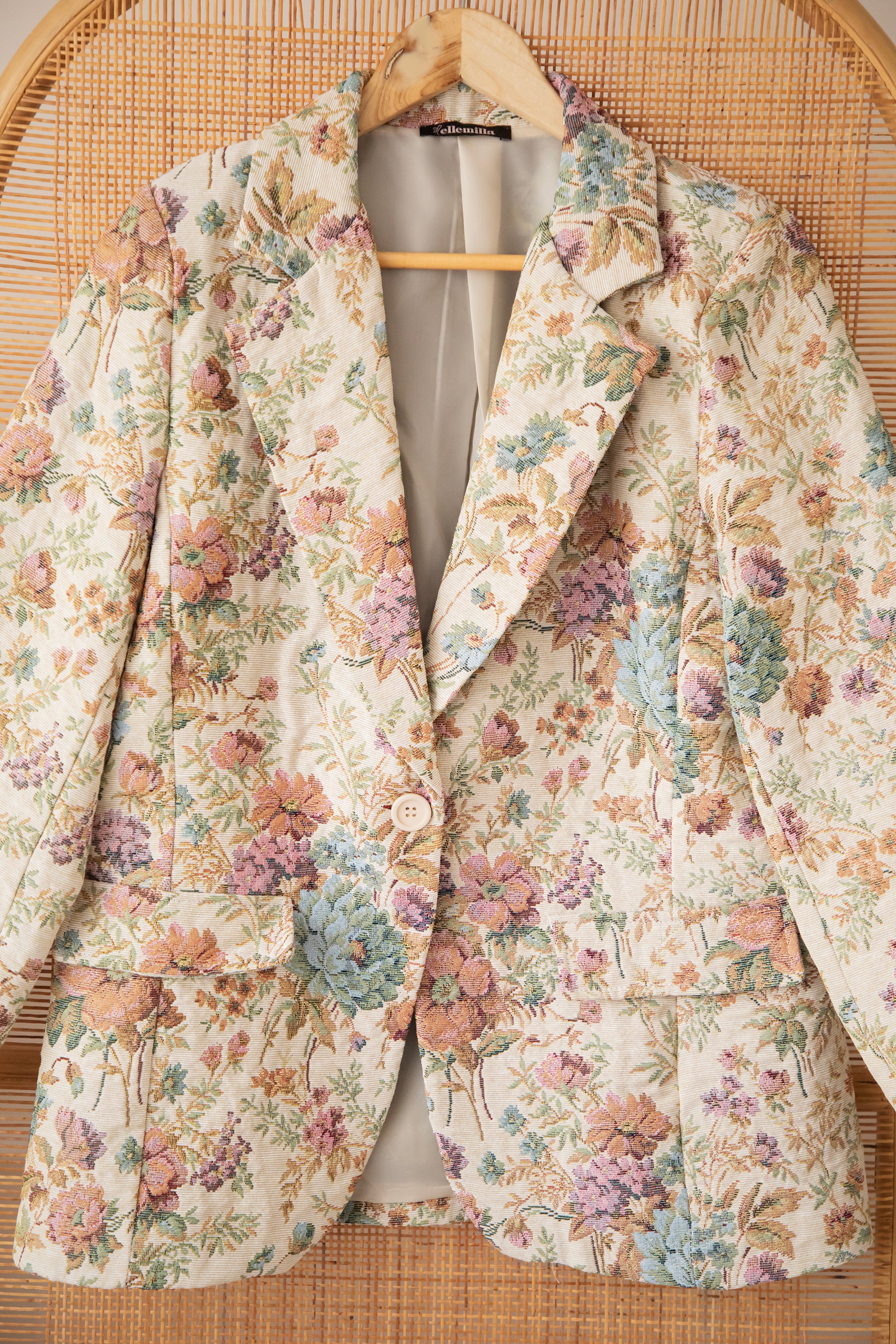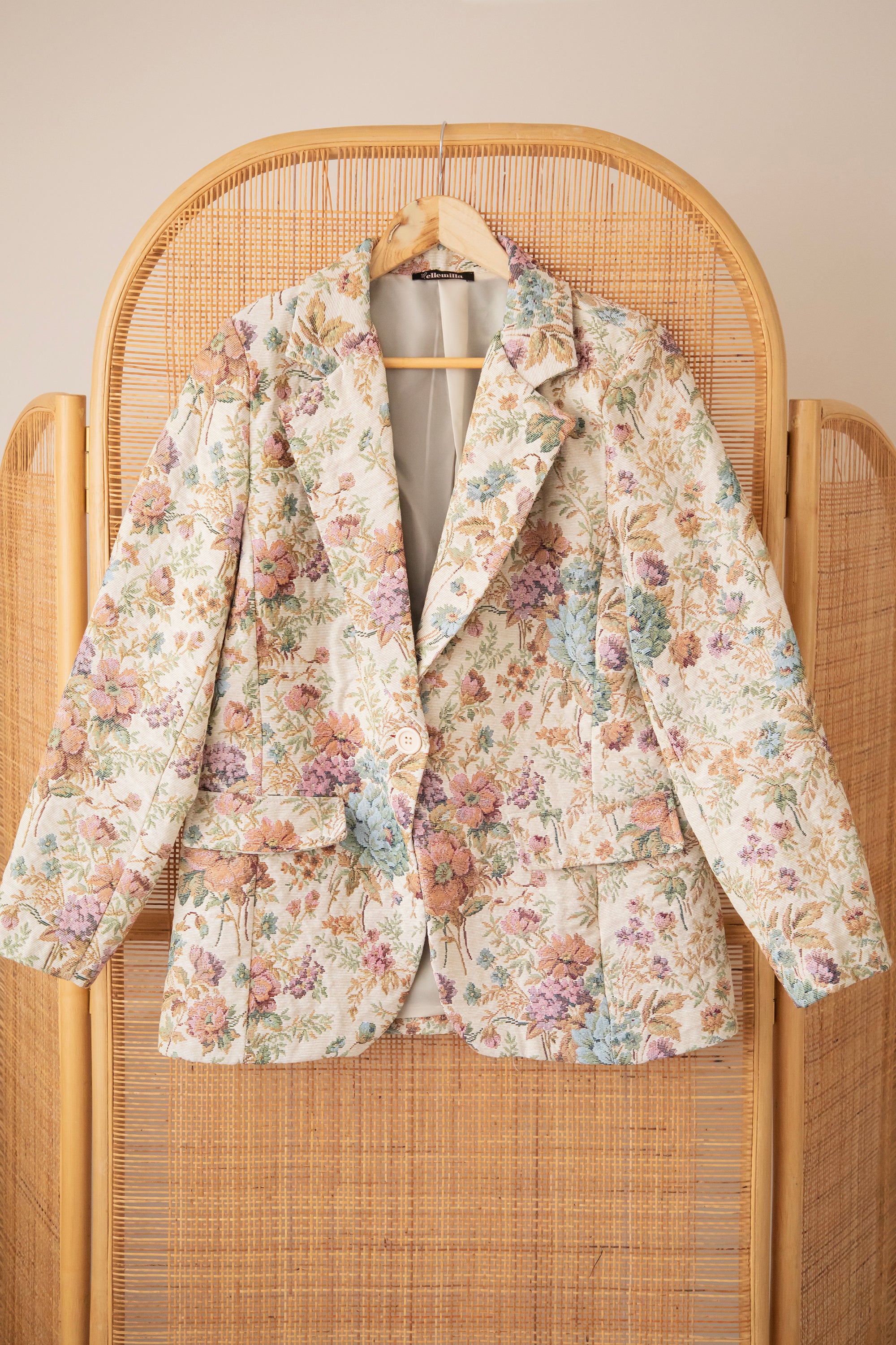Deze blazer heeft een dromerig, weelderig bloemenpatroon in roze, blauw, een tikje rusty en groen 🌸 Het voelt een beetje als een schilderijtje… zo’n weelderige print waar je naar kan blijven kijken! De kleuren samen geven haar iets zacht, romantisch en toch een tikkeltje boho. Echt zo’n blazer die meteen karakter geeft aan je outfit.