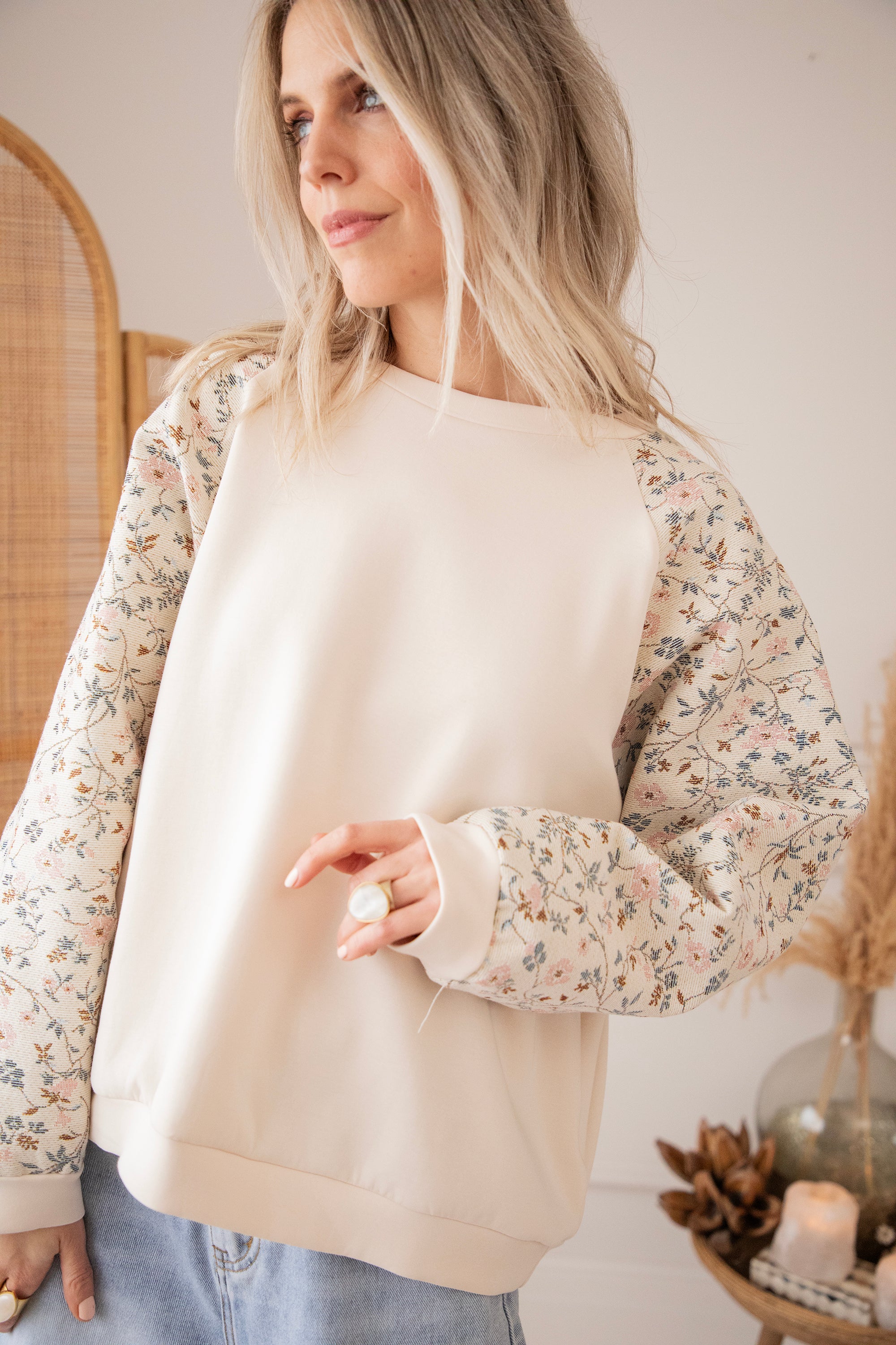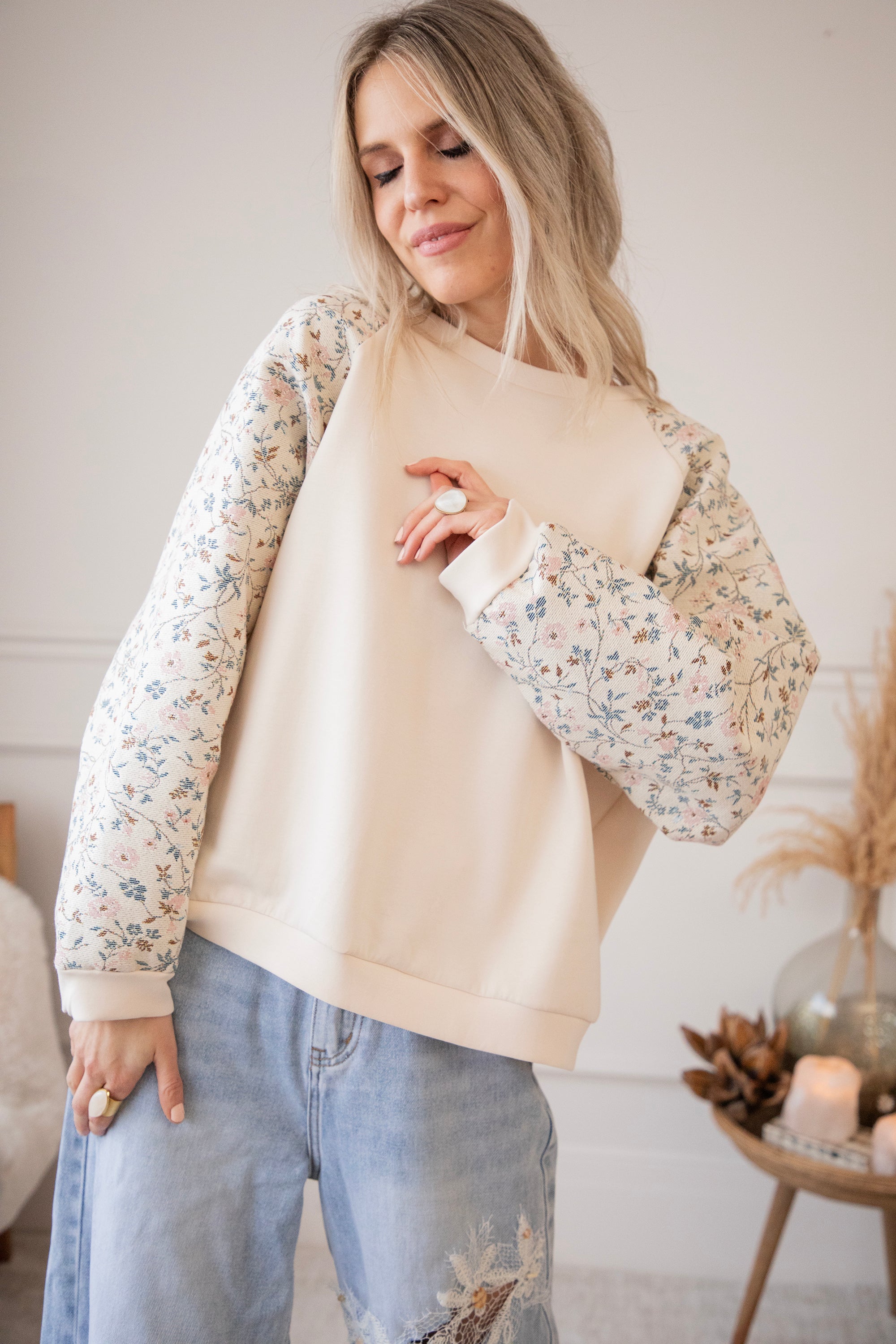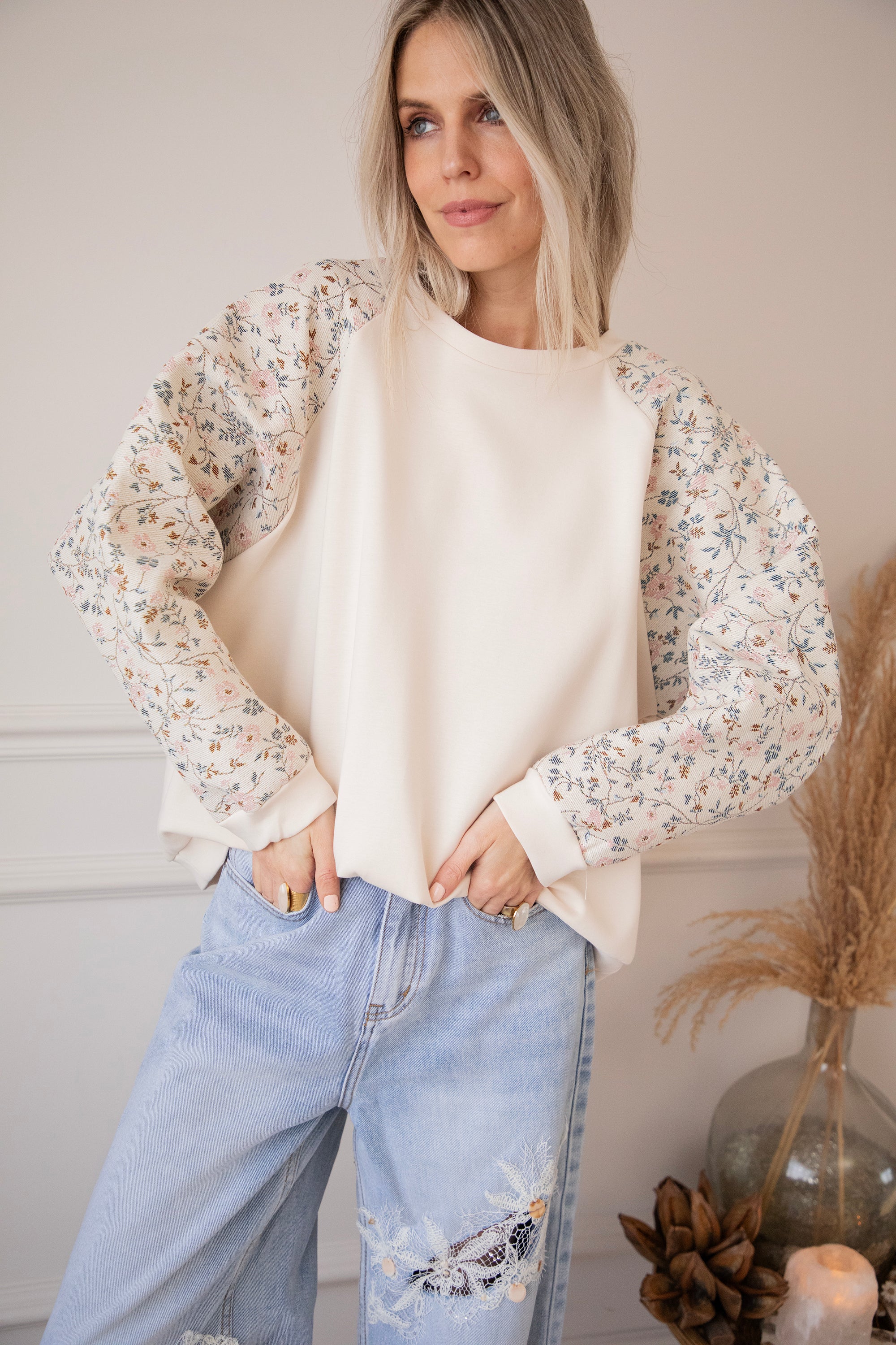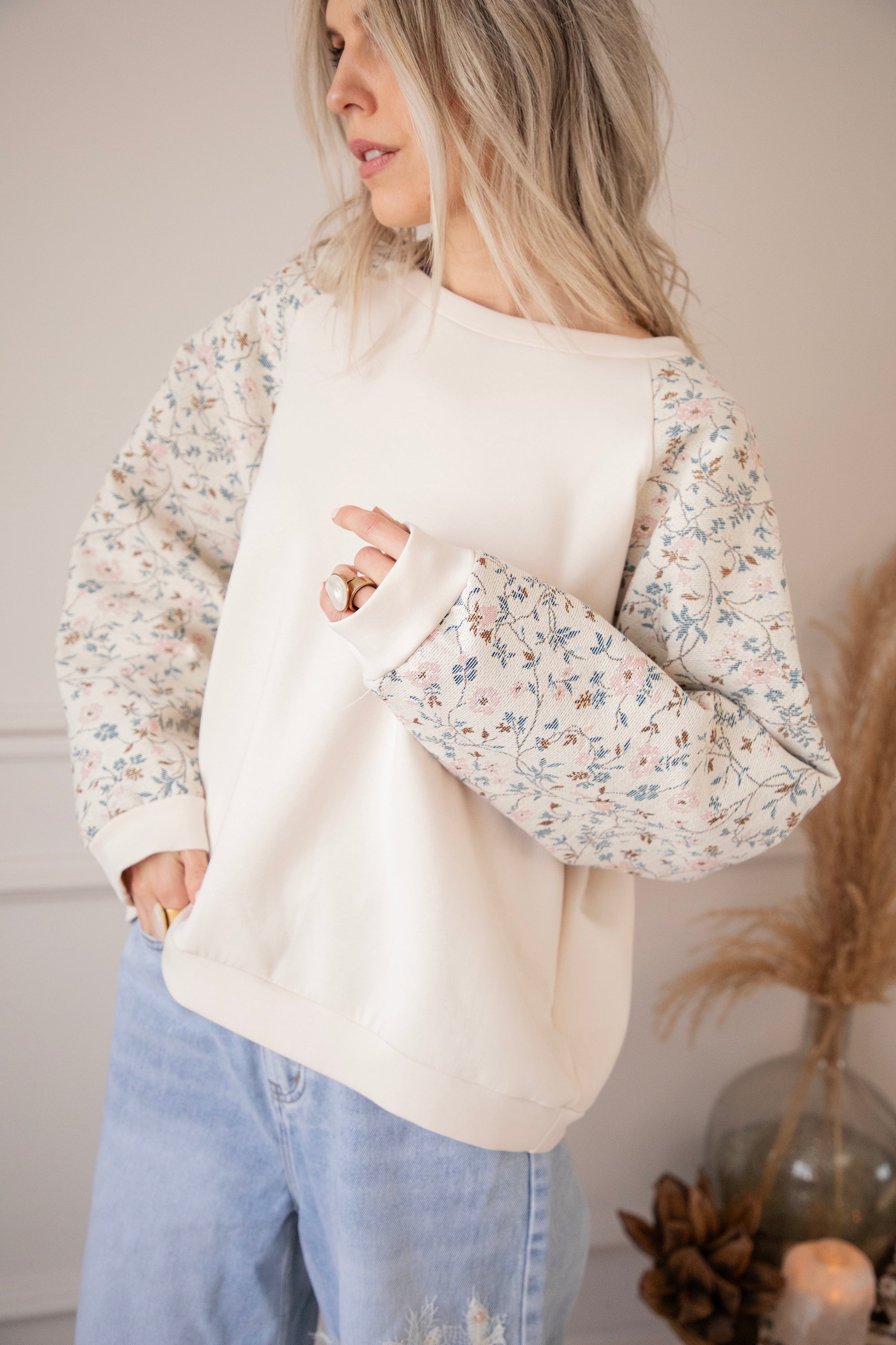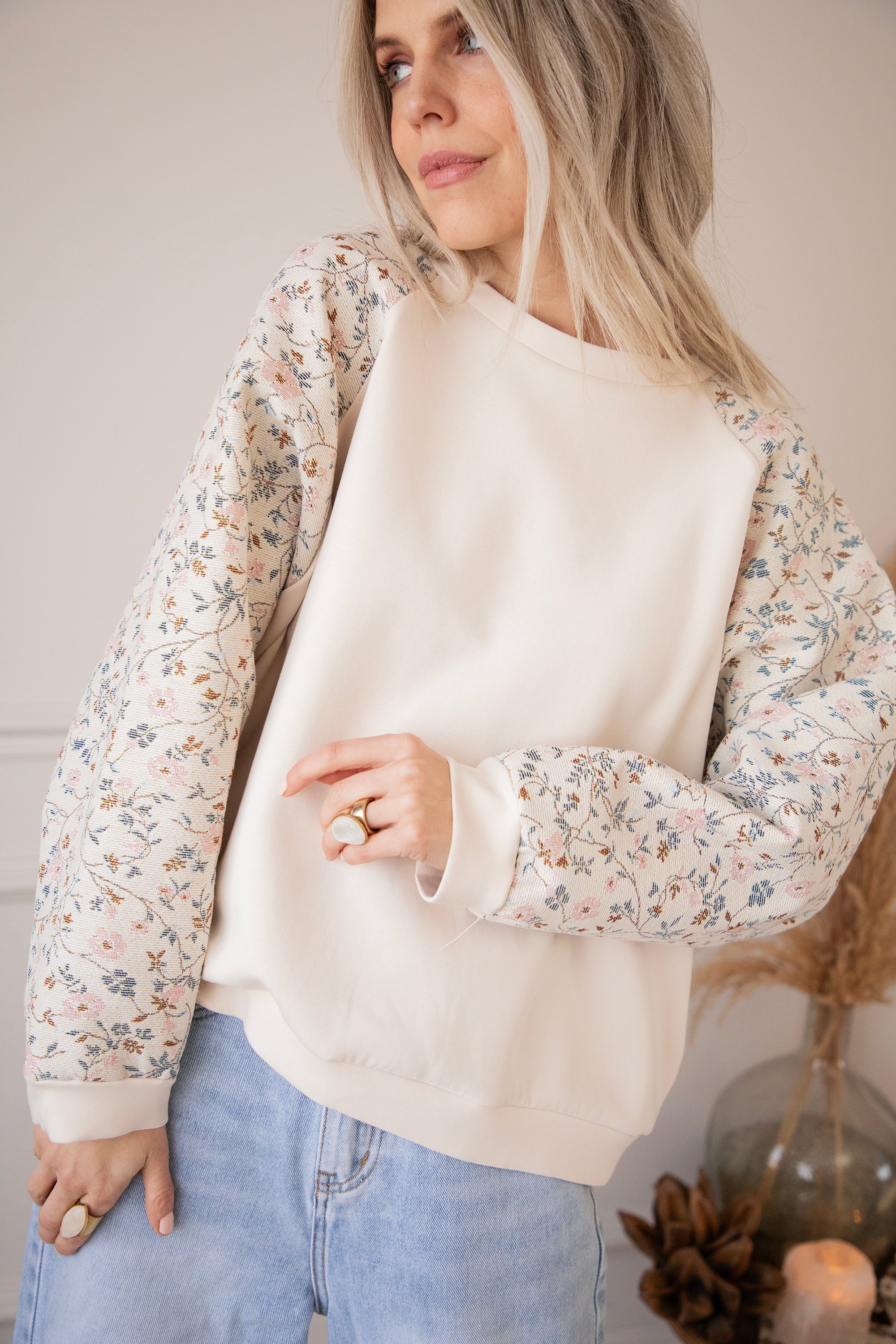 Yesss, ik ben helemaal verliefd! 🫶 Rosy Belle geeft nu al dat lentegevoel met haar sierlijke bloemenpatroontjes en het allerleukste: we hebben exact hetzelfde patroon op een blazer met een full bloom look voor extra flower power 🌸 Bij de sweater zijn enkel de mouwen opgefleurd met het zachte groene, roze en camel bloemenmotiefje. Zooo mooi! Het heeft iets vintage en romantisch, terwijl het middengedeelte mooi effen blijft.
