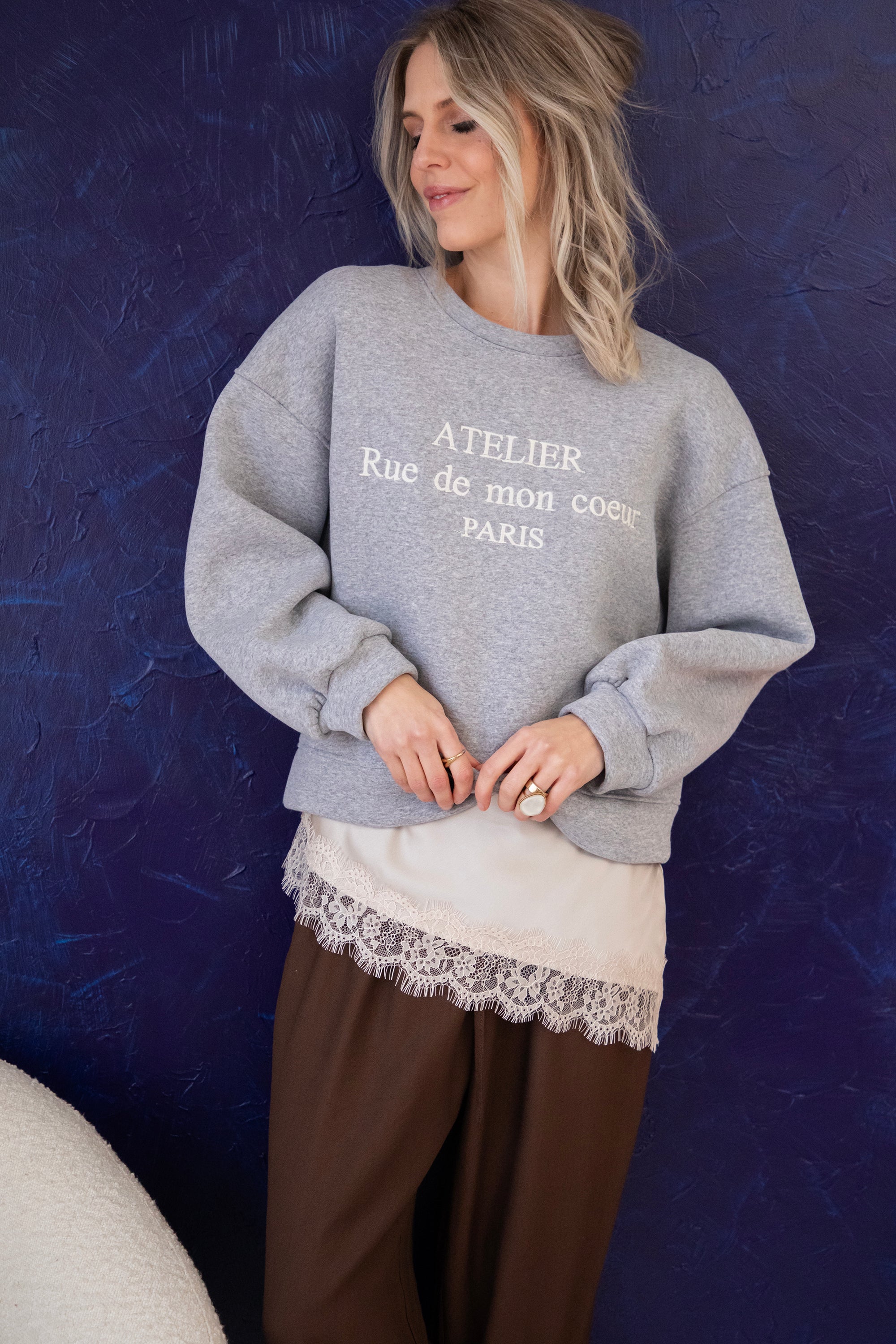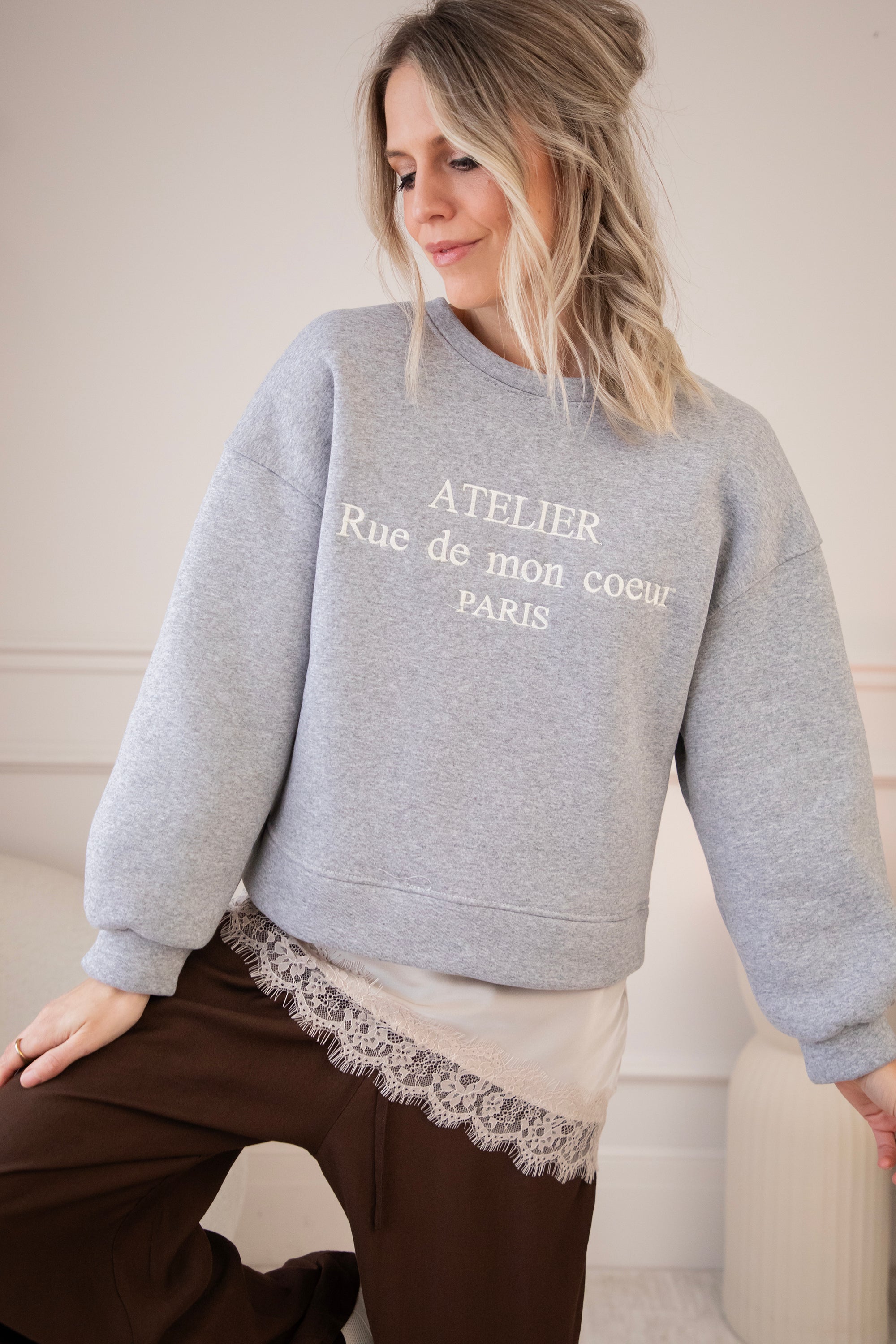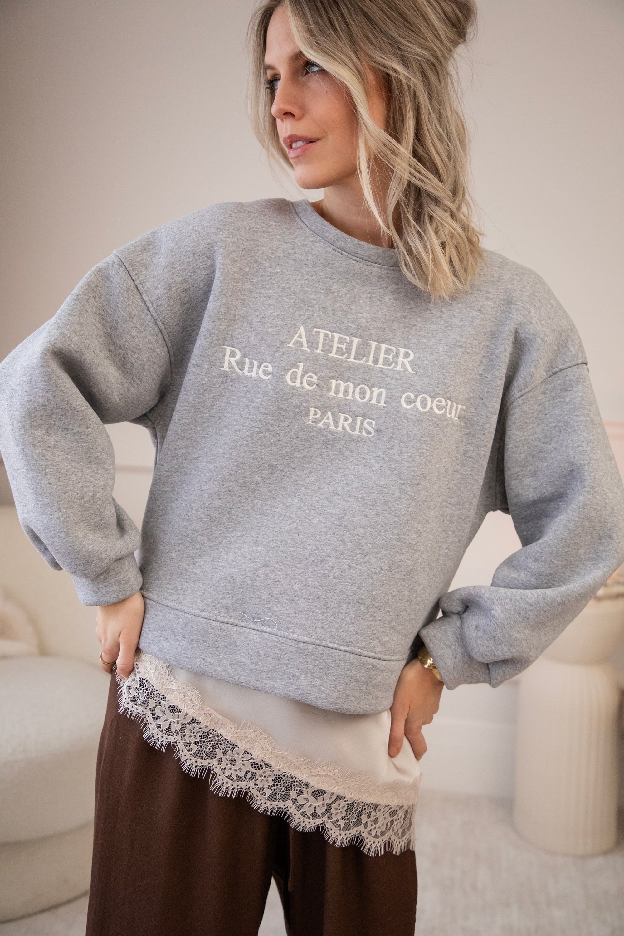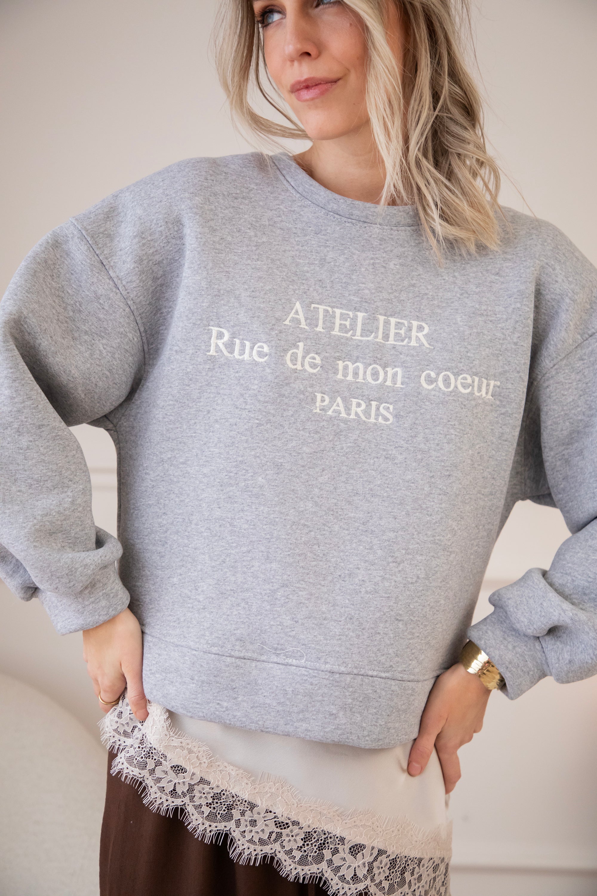 Deze sweater heb ik echt heel graag aan, een korter modelletje waarbij je een leuke layered look kan creëren met een van de satijnen Sibelle items. De schouders zijn zelfs voorzien van epauletten voor extra volume. En een vleugje Franse flair met de quote Atelier Rue de mon coeur PARIS.