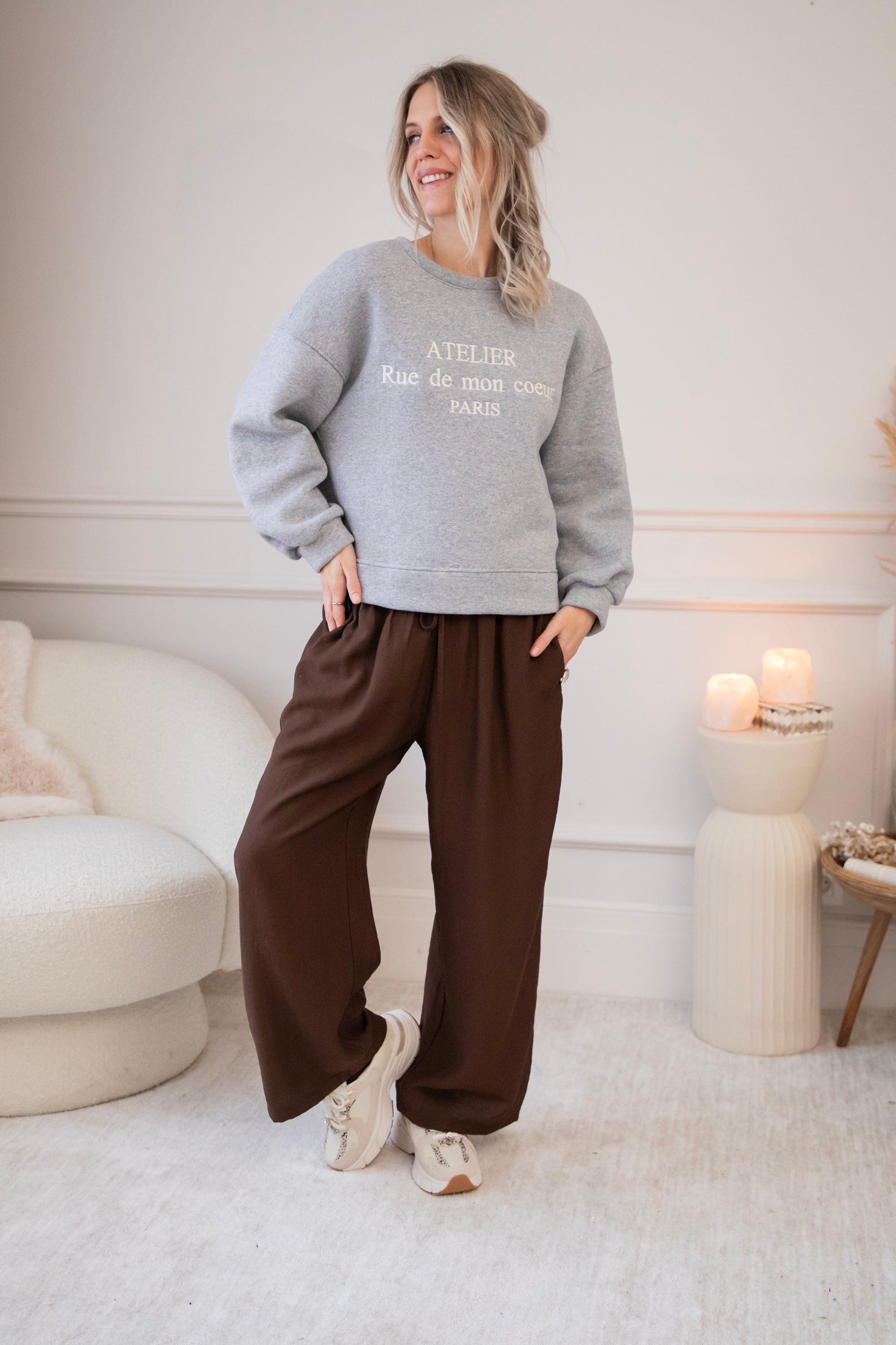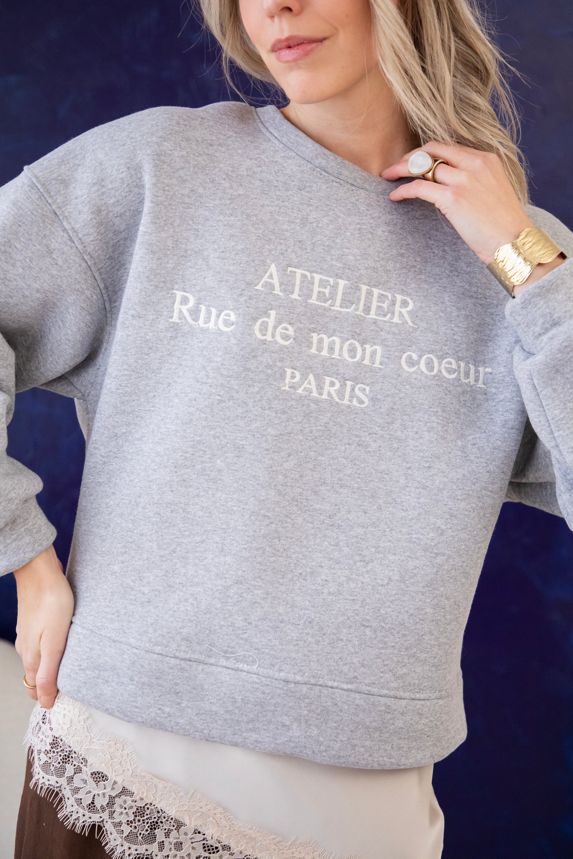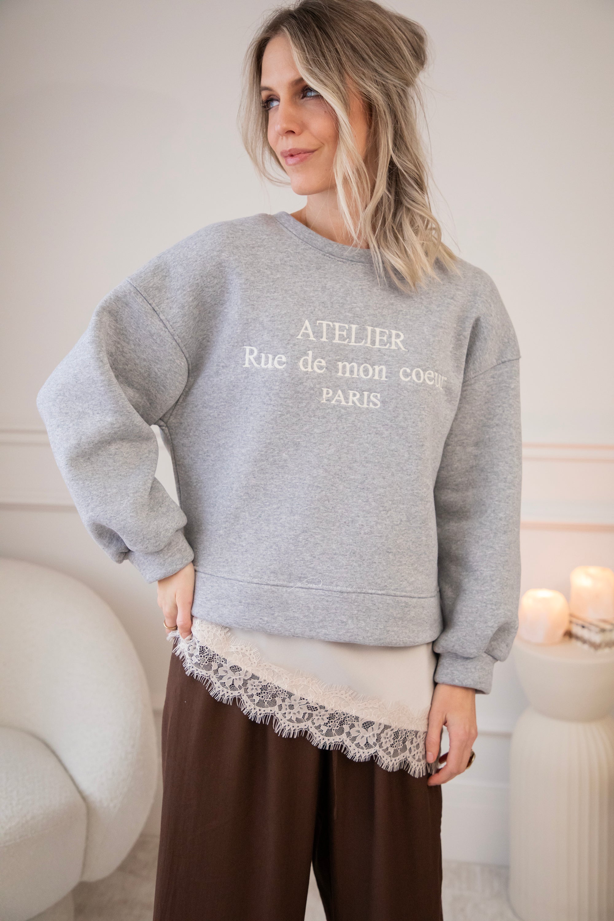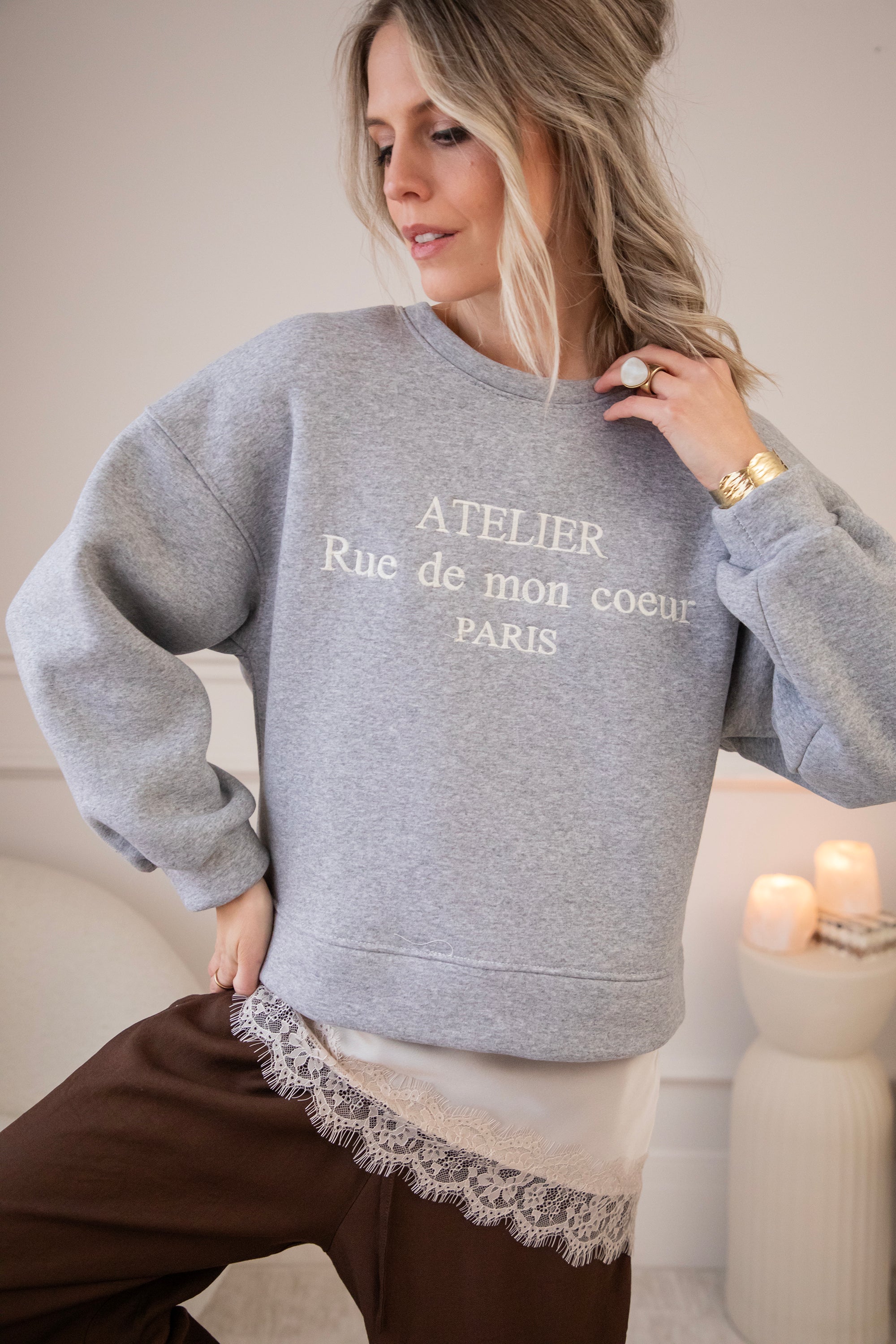 Deze sweater heb ik echt heel graag aan, een korter modelletje waarbij je een leuke layered look kan creëren met een van de satijnen Sibelle items. De schouders zijn zelfs voorzien van epauletten voor extra volume. En een vleugje Franse flair met de quote Atelier Rue de mon coeur PARIS.