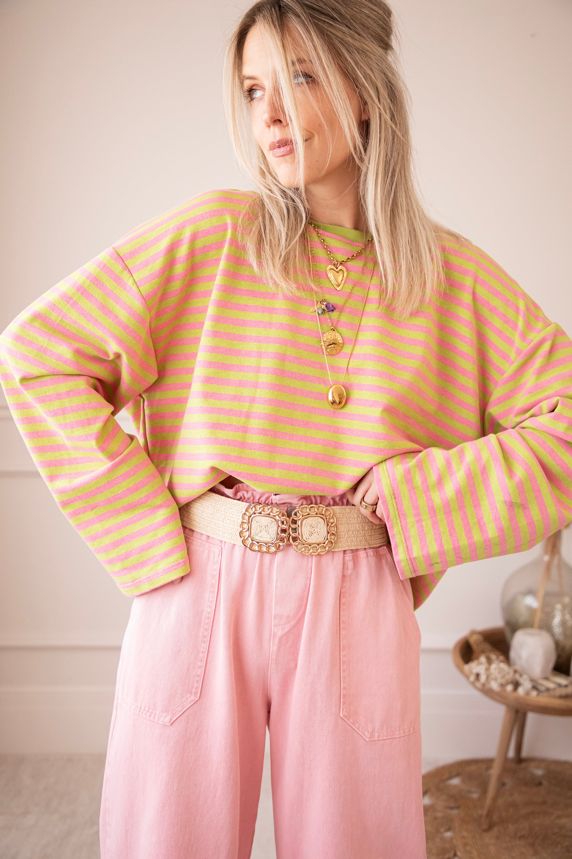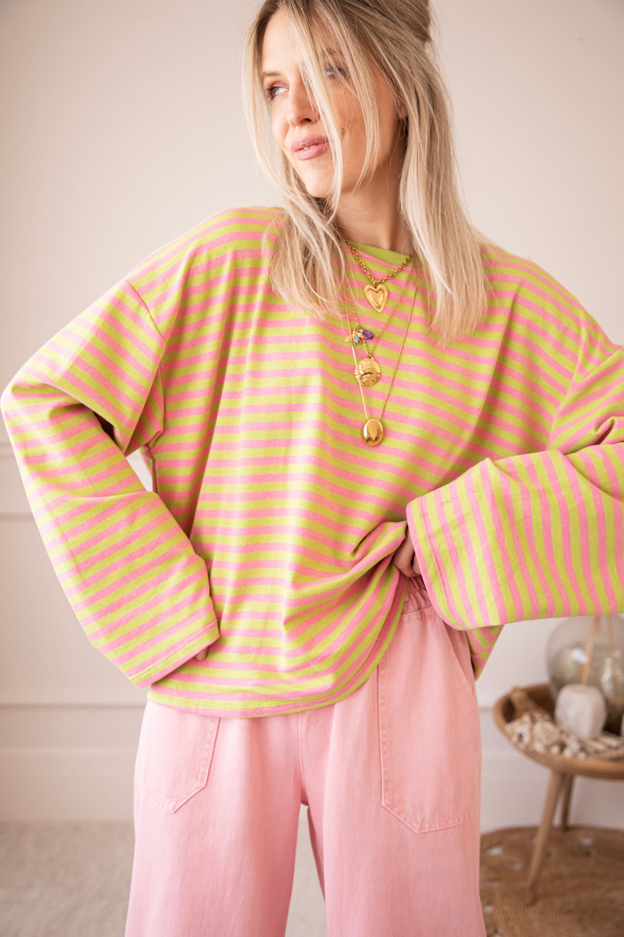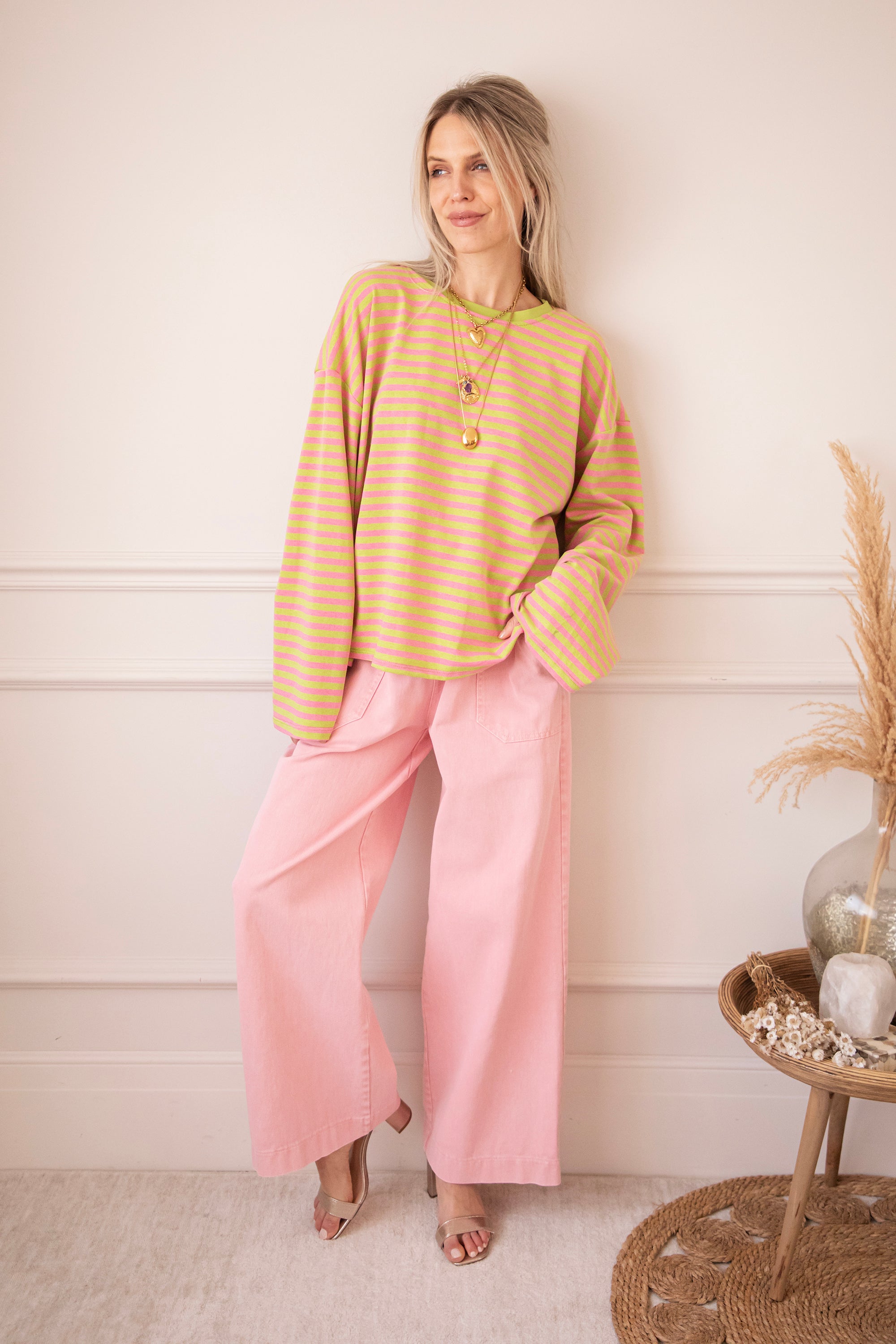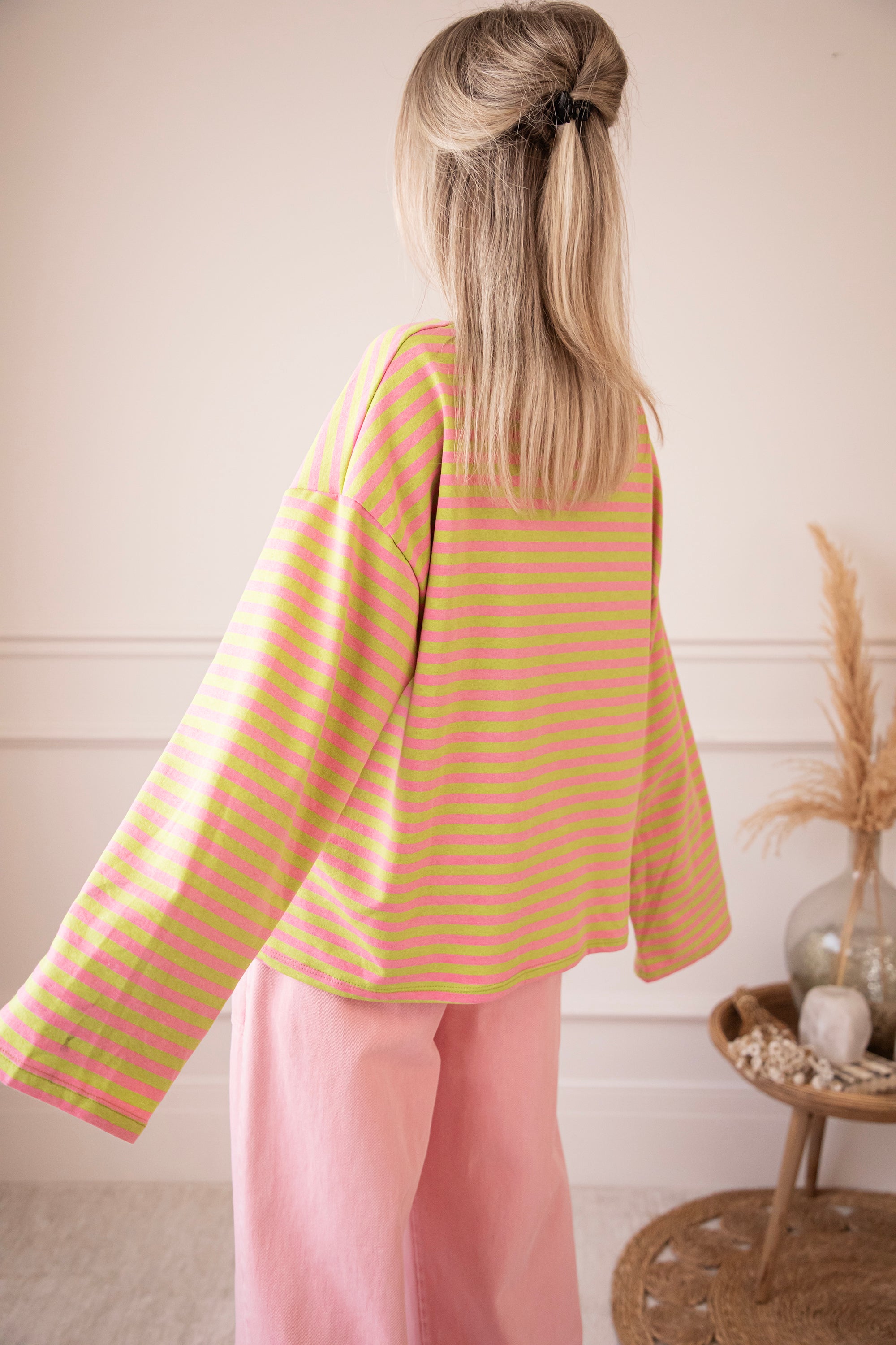 Oehhh de Sadie Stripe blijft toch één van mijn absolute favorietjes uit de collectie! 🥰 En die van jullie ook overduidelijk, ze vliegen buiten en dat is zo fijn om te zien dus dringend tijd voor extraaaa kleurtjes! Limoen en roze... WAUWIE! Echt zo'n verfrissende en fruitige combinatie, en dan op de roze Elise broek... wat een vrolijk en zonnig totaalplaatje 🌸