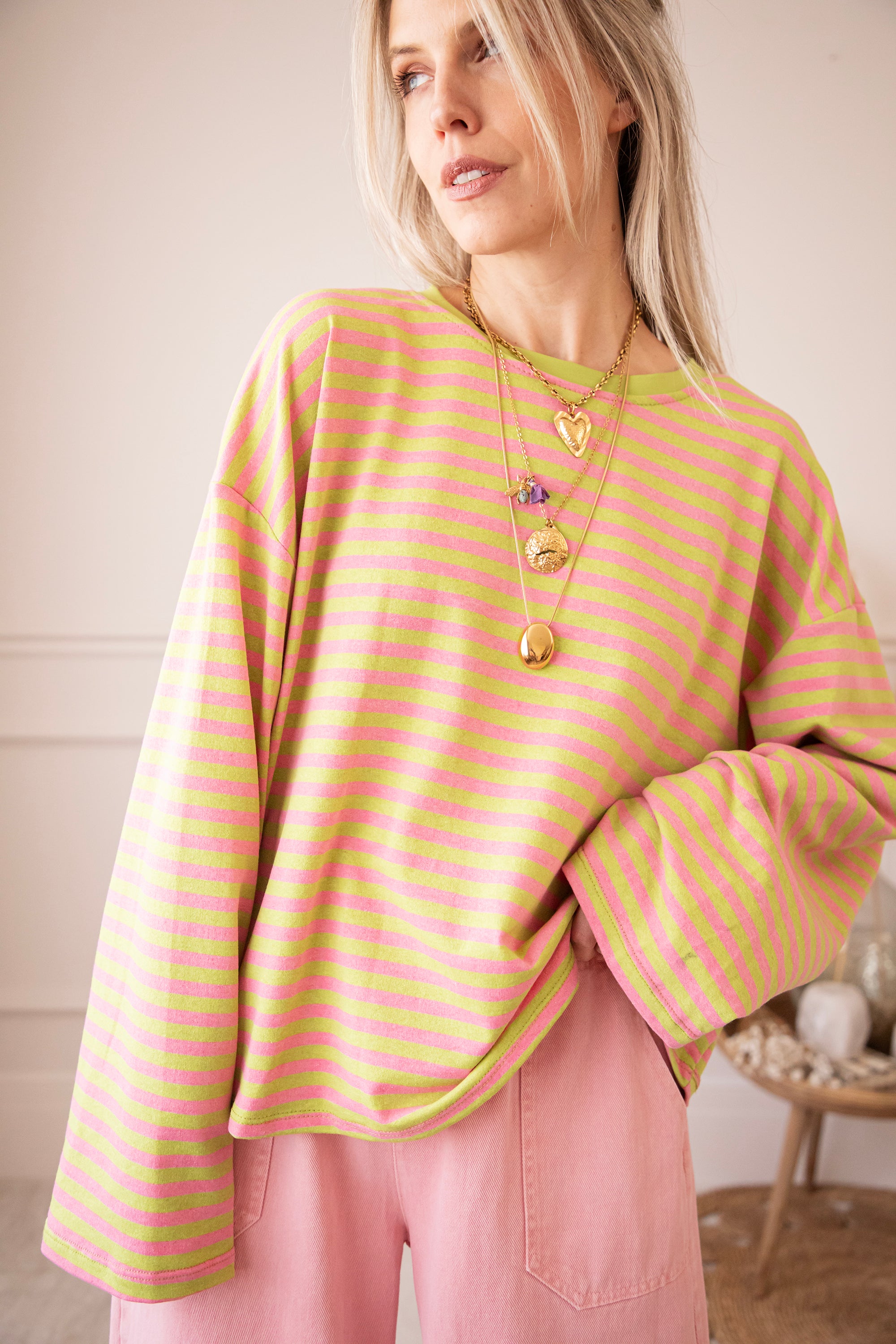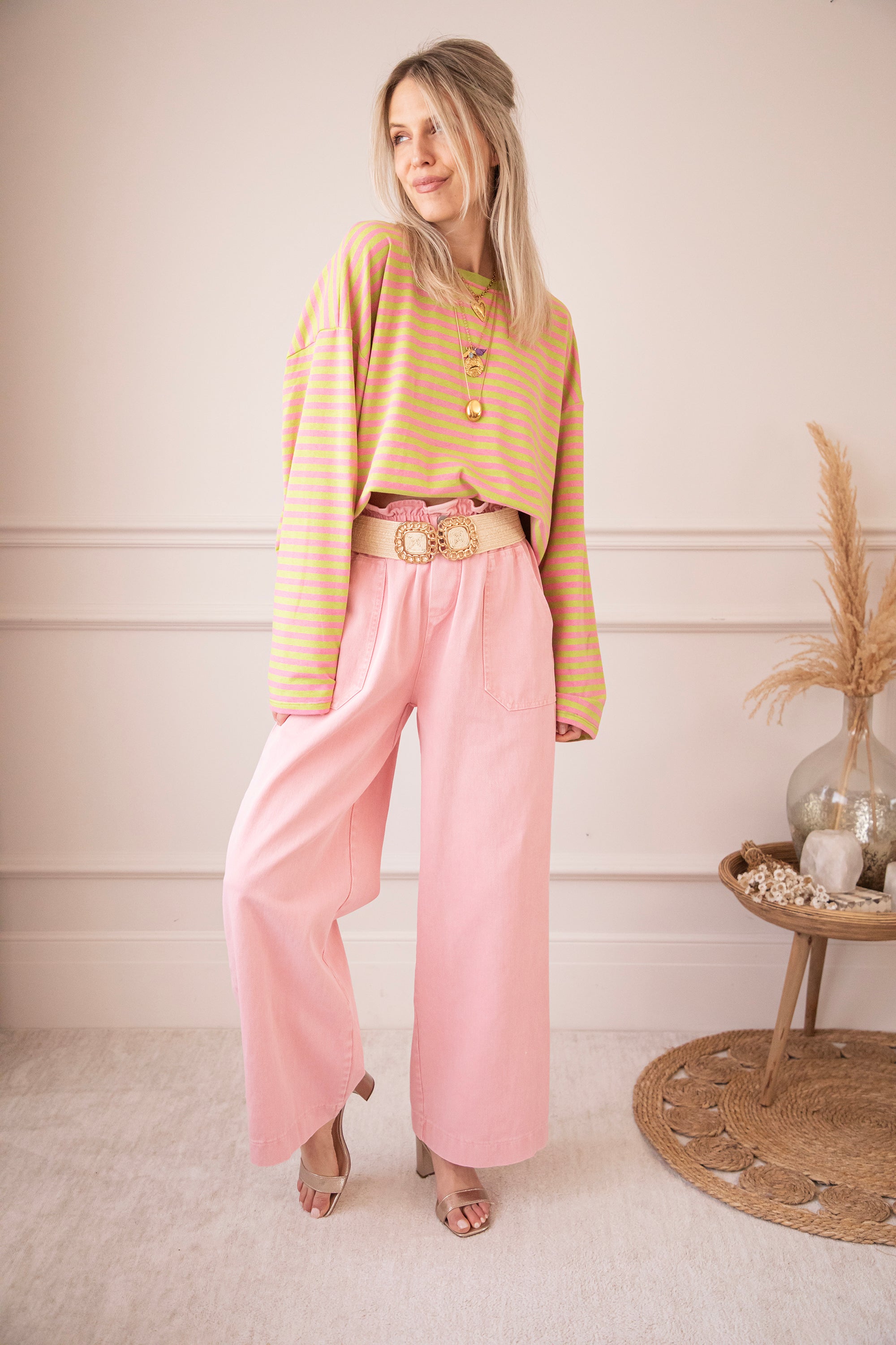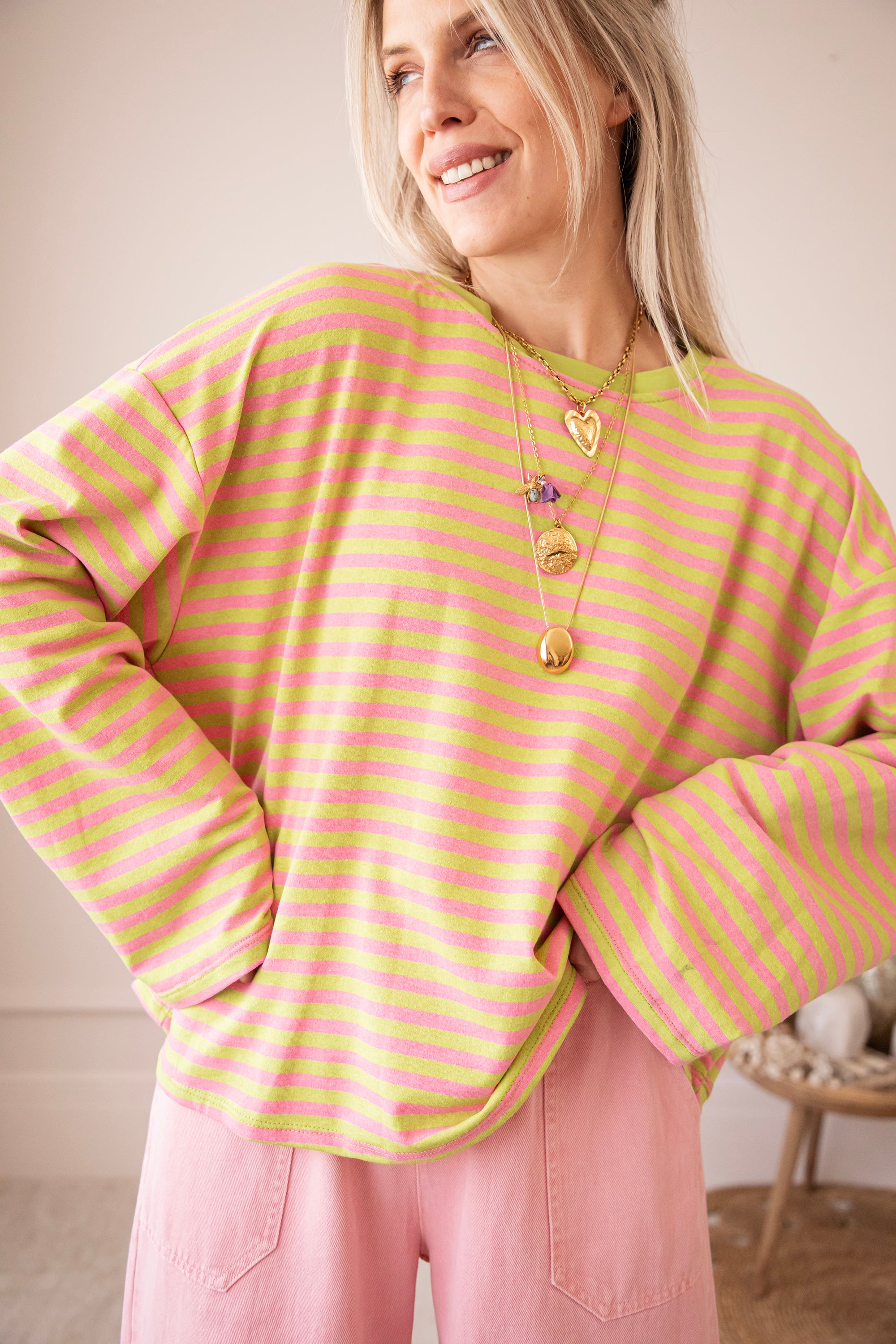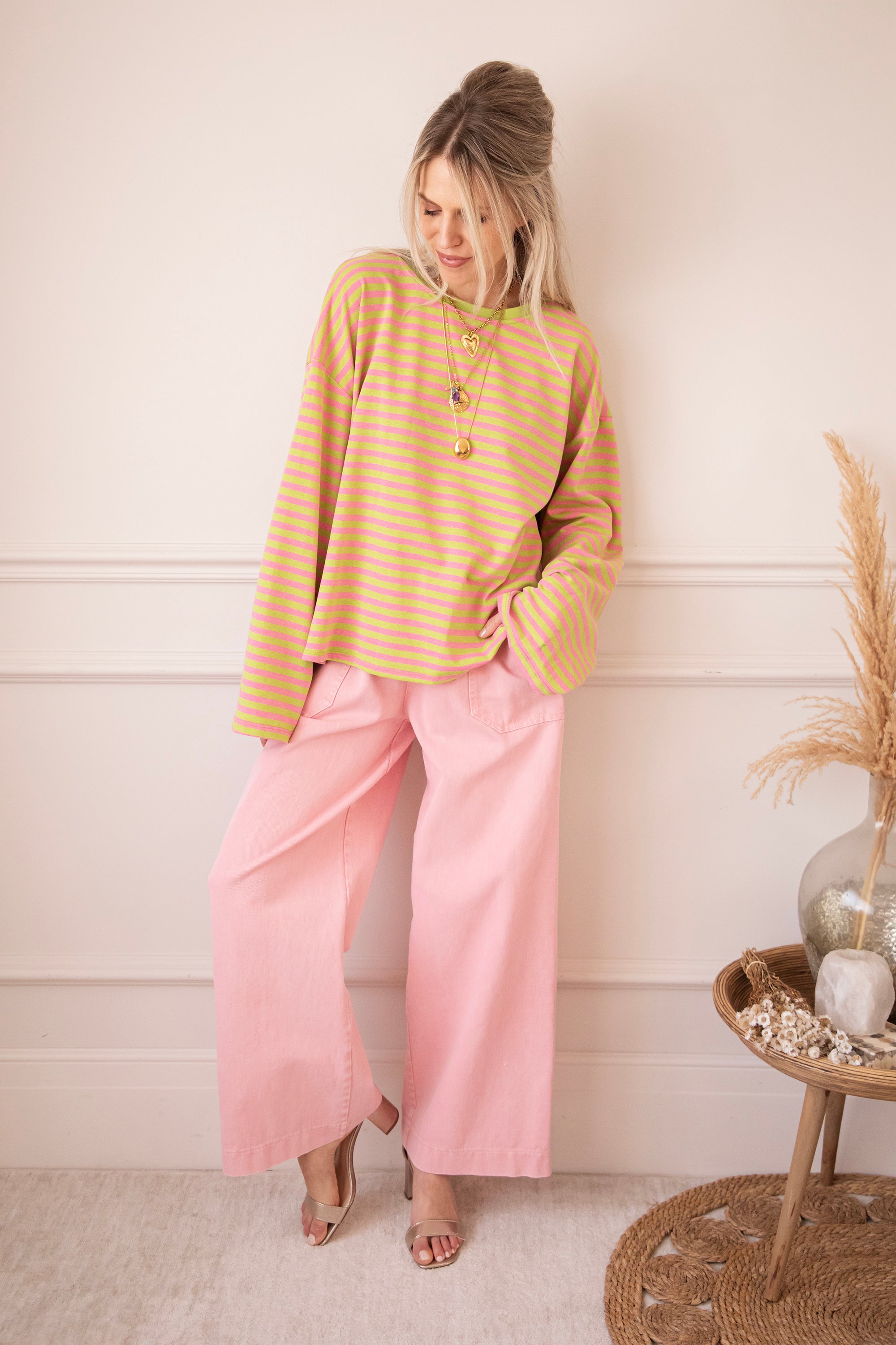 Oehhh de Sadie Stripe blijft toch één van mijn absolute favorietjes uit de collectie! 🥰 En die van jullie ook overduidelijk, ze vliegen buiten en dat is zo fijn om te zien dus dringend tijd voor extraaaa kleurtjes! Limoen en roze... WAUWIE! Echt zo'n verfrissende en fruitige combinatie, en dan op de roze Elise broek... wat een vrolijk en zonnig totaalplaatje 🌸