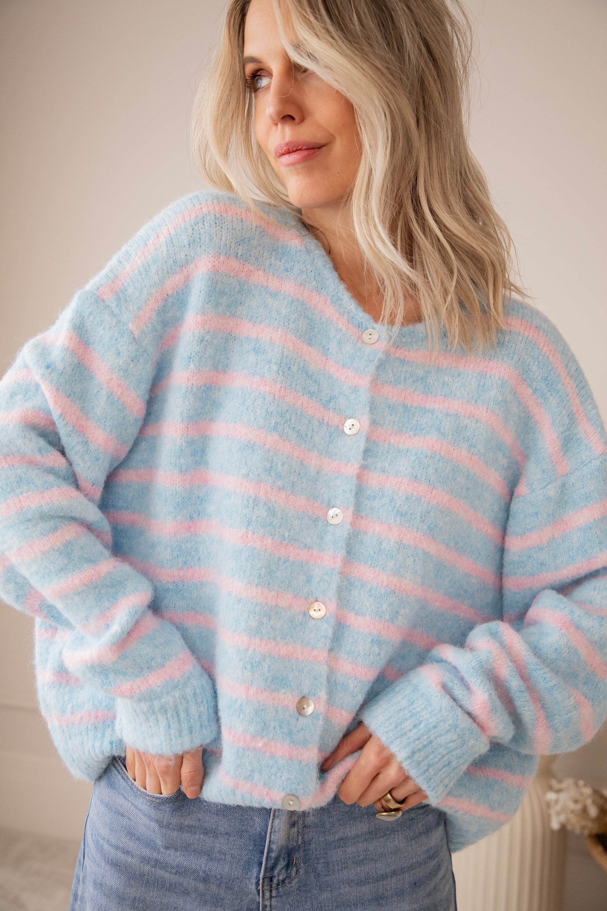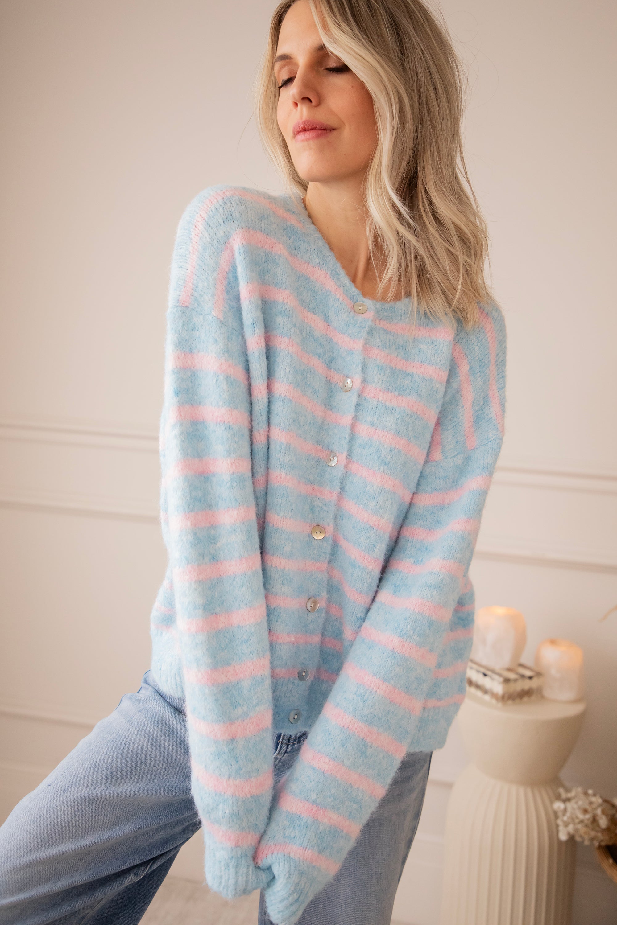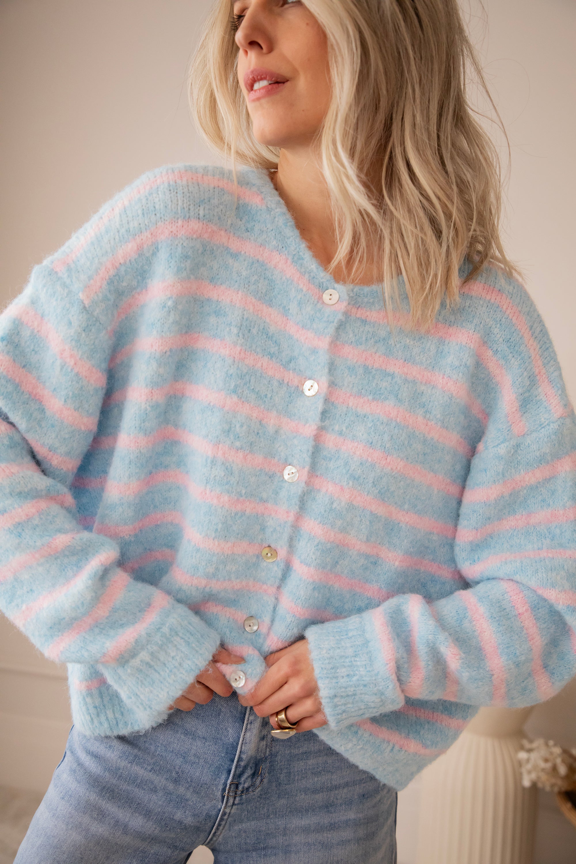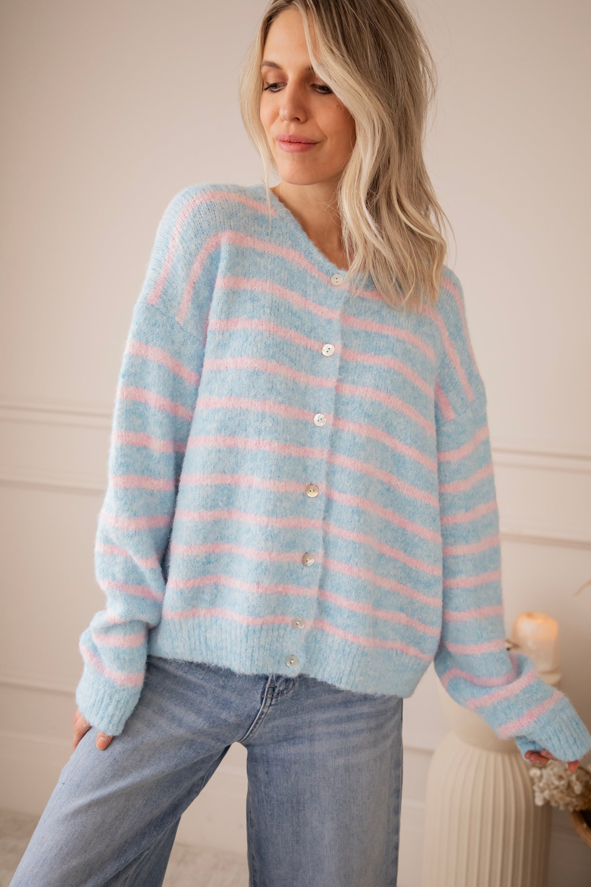 Happy knits voor happy spring days! 🩵 Samantha Stripe is pure happiness in knit form: zacht breiwerk, fijne strepen en dat heerlijke losse draaggevoel 🥰 De lange mouwtjes en de parelmoeren knopenrij zijn fijne troeven! Hoe dreamy is deze kleurencombooo 🥹 Babyroze en babyblauw samen is gewoon op en top lente! Hoe moeten we toch kiezen tussen al die leuke kleurtjes 🤭