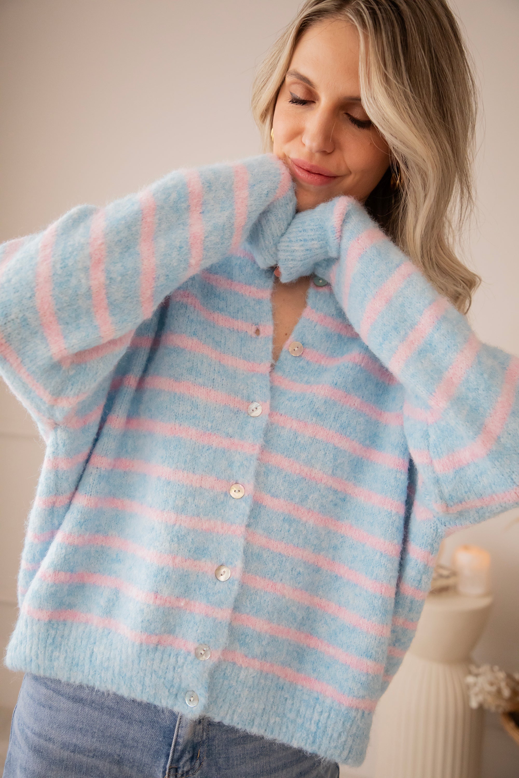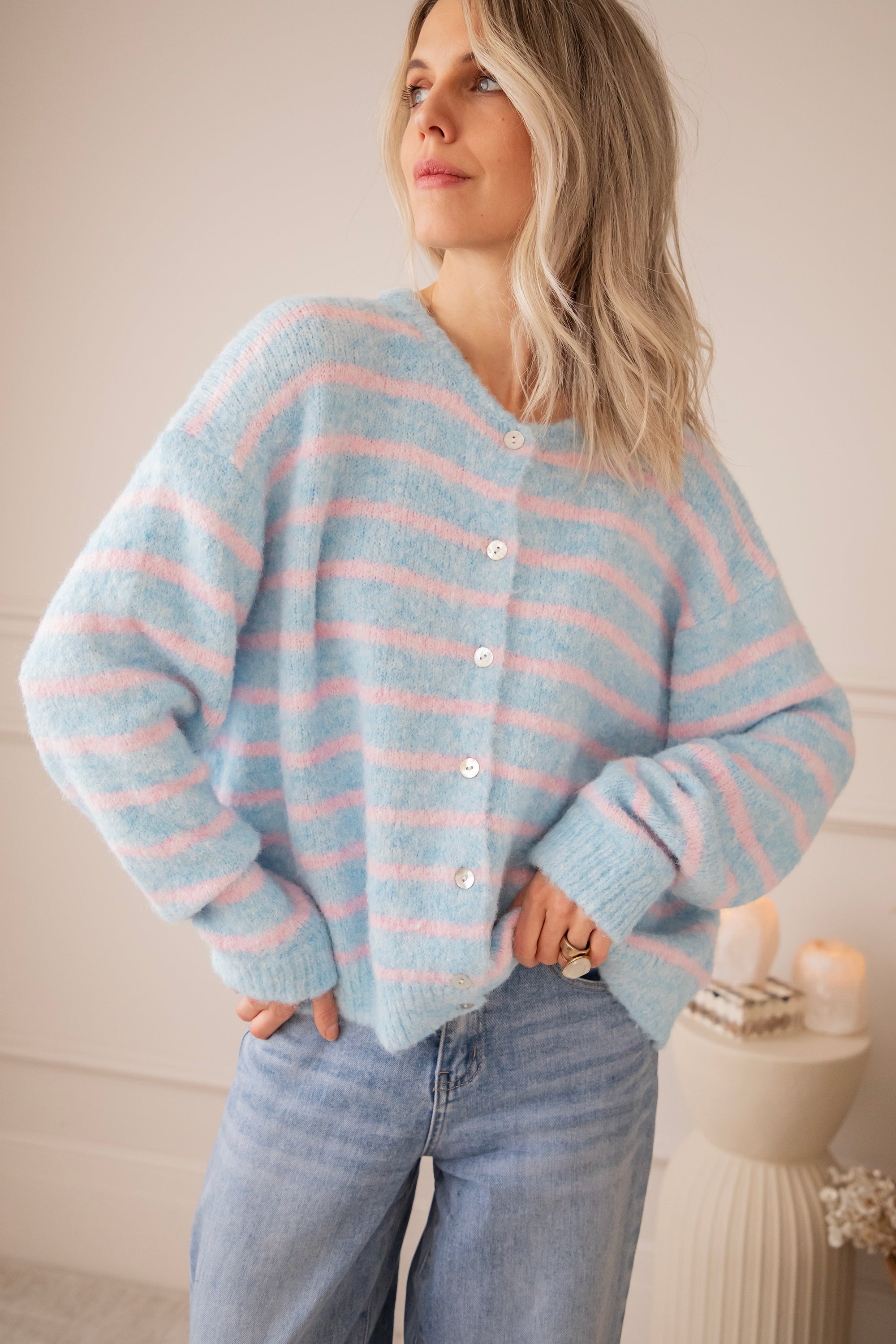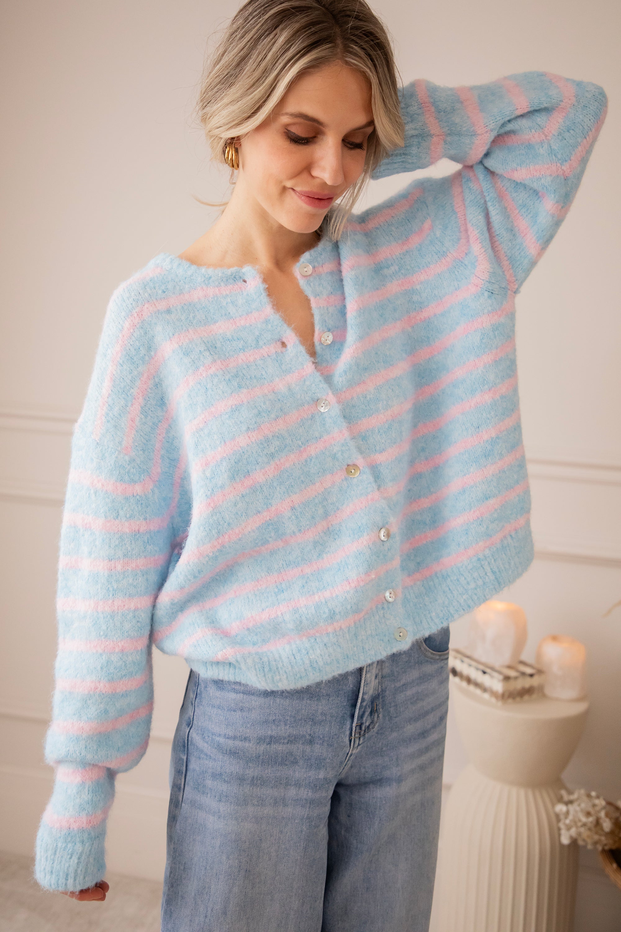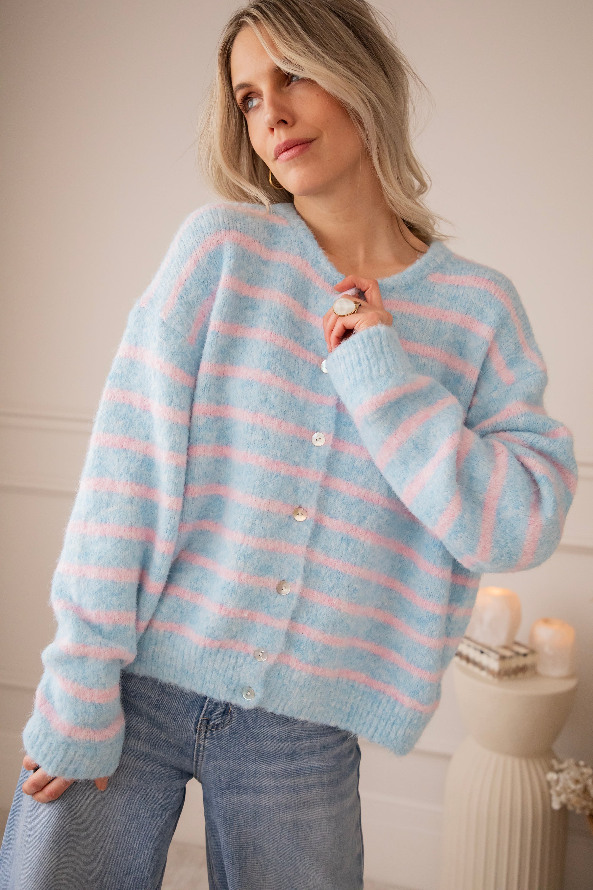 Happy knits voor happy spring days! 🩵 Samantha Stripe is pure happiness in knit form: zacht breiwerk, fijne strepen en dat heerlijke losse draaggevoel 🥰 De lange mouwtjes en de parelmoeren knopenrij zijn fijne troeven! Hoe dreamy is deze kleurencombooo 🥹 Babyroze en babyblauw samen is gewoon op en top lente! Hoe moeten we toch kiezen tussen al die leuke kleurtjes 🤭