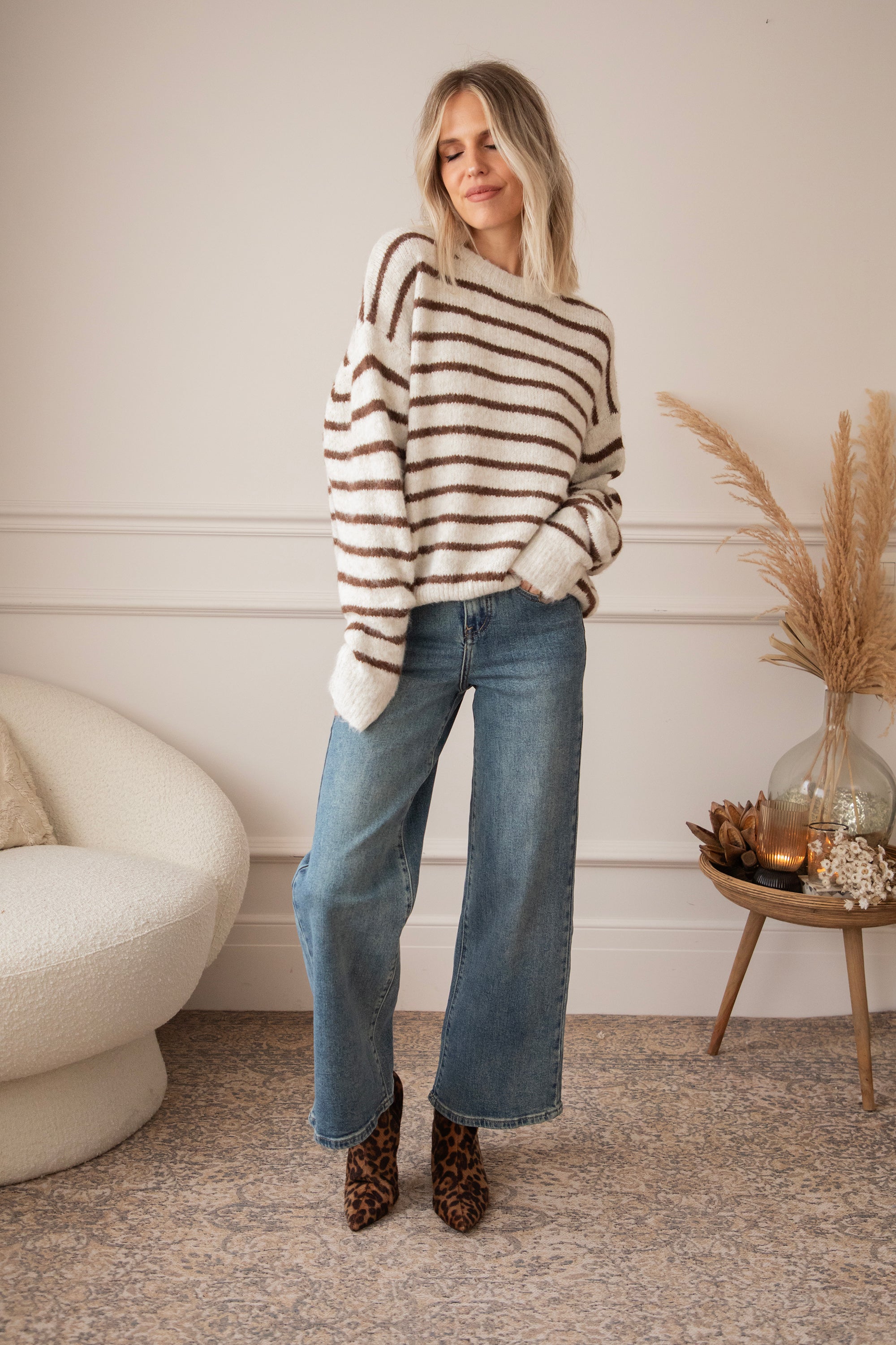 Samantha Stripe is pure happiness in knit form! Strepen zijn altijd een goed idee, maar in natural kleuren zijn ze gewoon nóg leuker! Samantha Stripe is zo’n trui waar je eindeloos in wil knuffelen 🤗 Met haar zachte breiwerk en baggy fit is ze de ultieme winter essential.