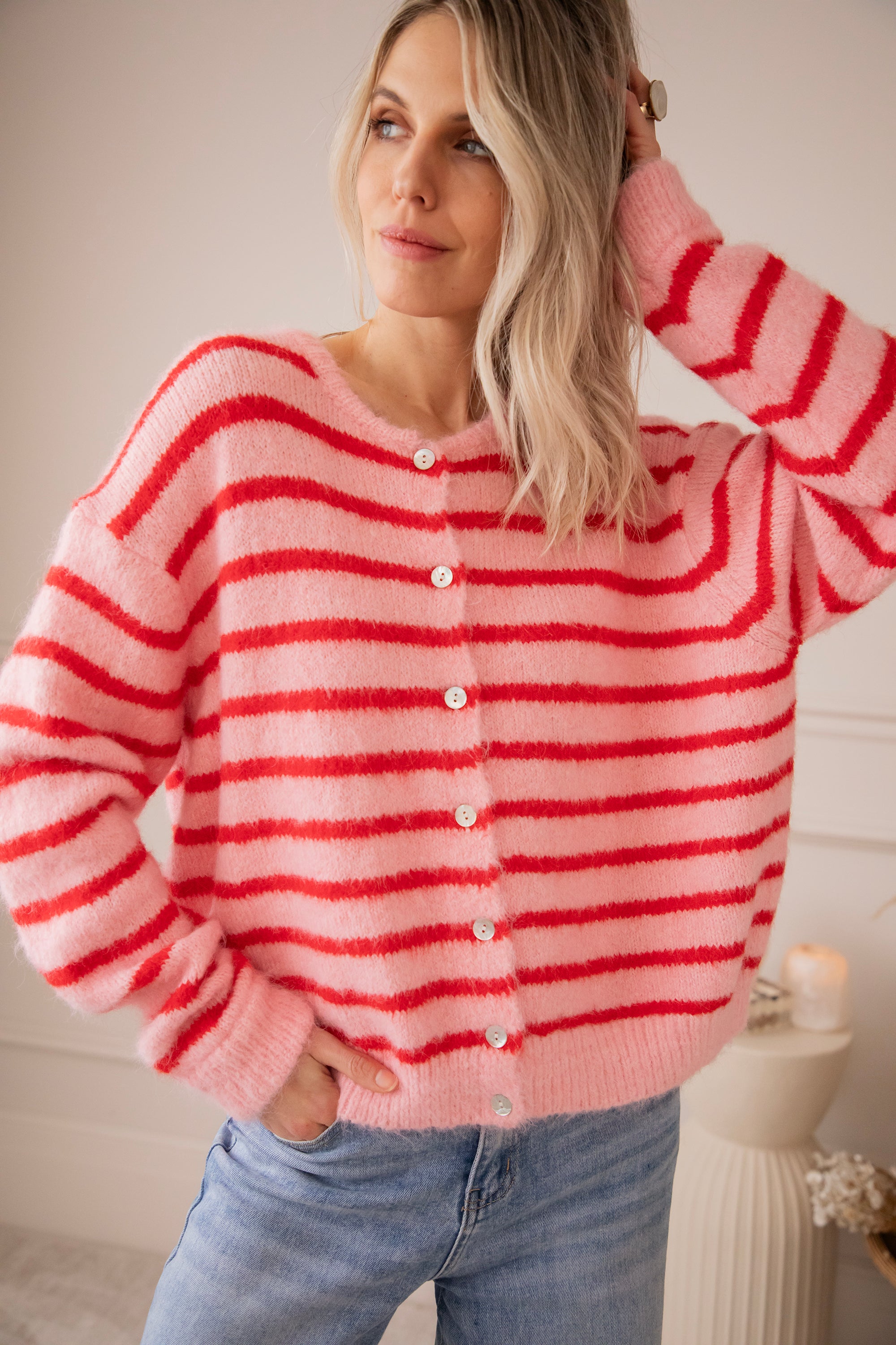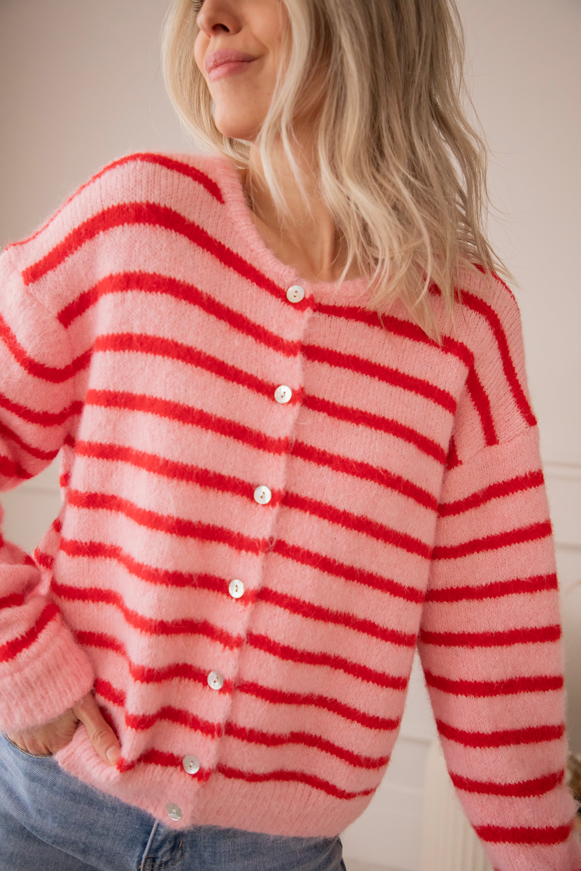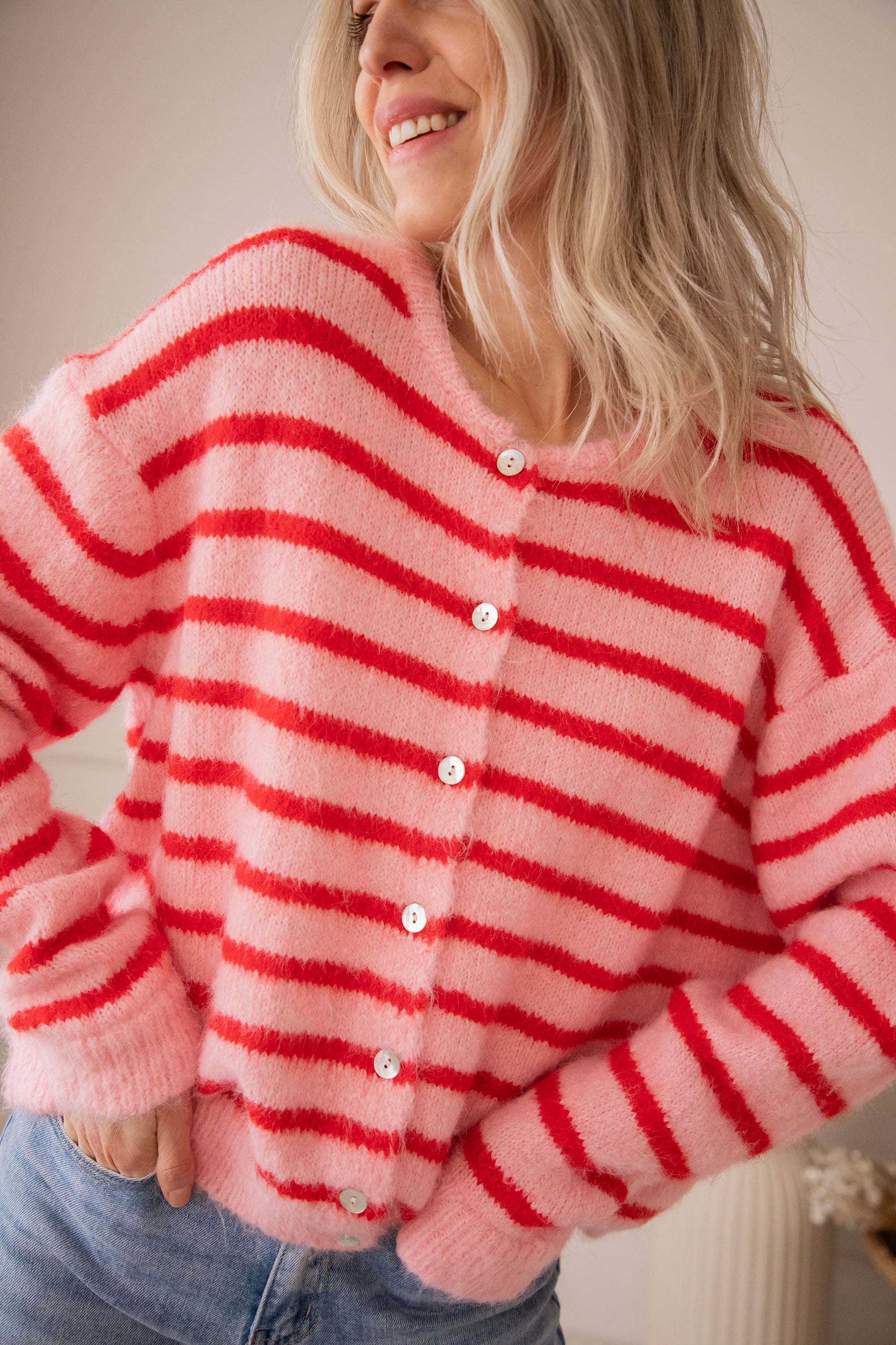 Happy knits voor happy spring days! ❤️ Samantha Stripe is pure happiness in knit form: zacht breiwerk, fijne strepen en dat heerlijke losse draaggevoel 🥰 De lange mouwtjes en de parelmoeren knopenrij zijn fijne troeven! Roze en rood samen hebben toch altijd een klein streepje voor bij mij hihi, zo'n warme en girly uitstraling 🩷 Hoe moeten we toch kiezen tussen al die leuke kleurtjes 🤭