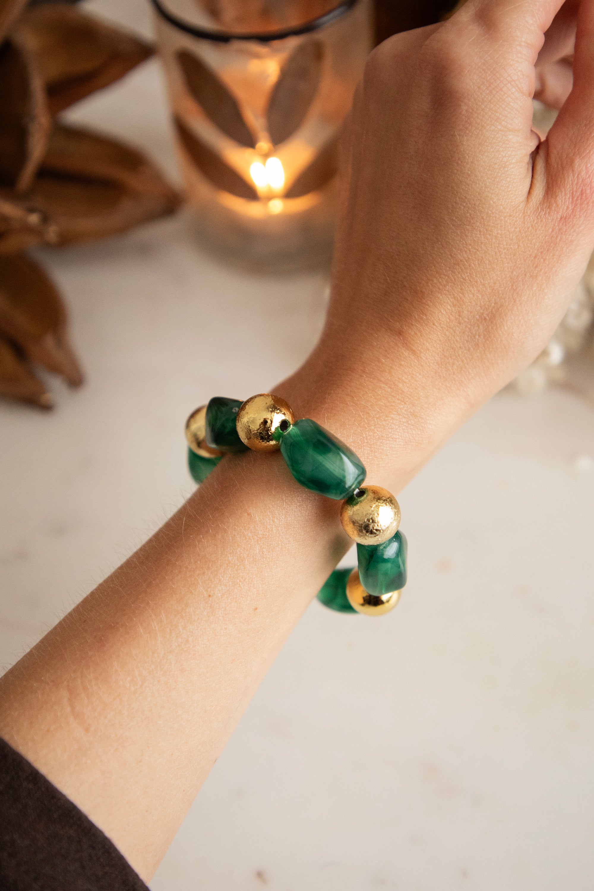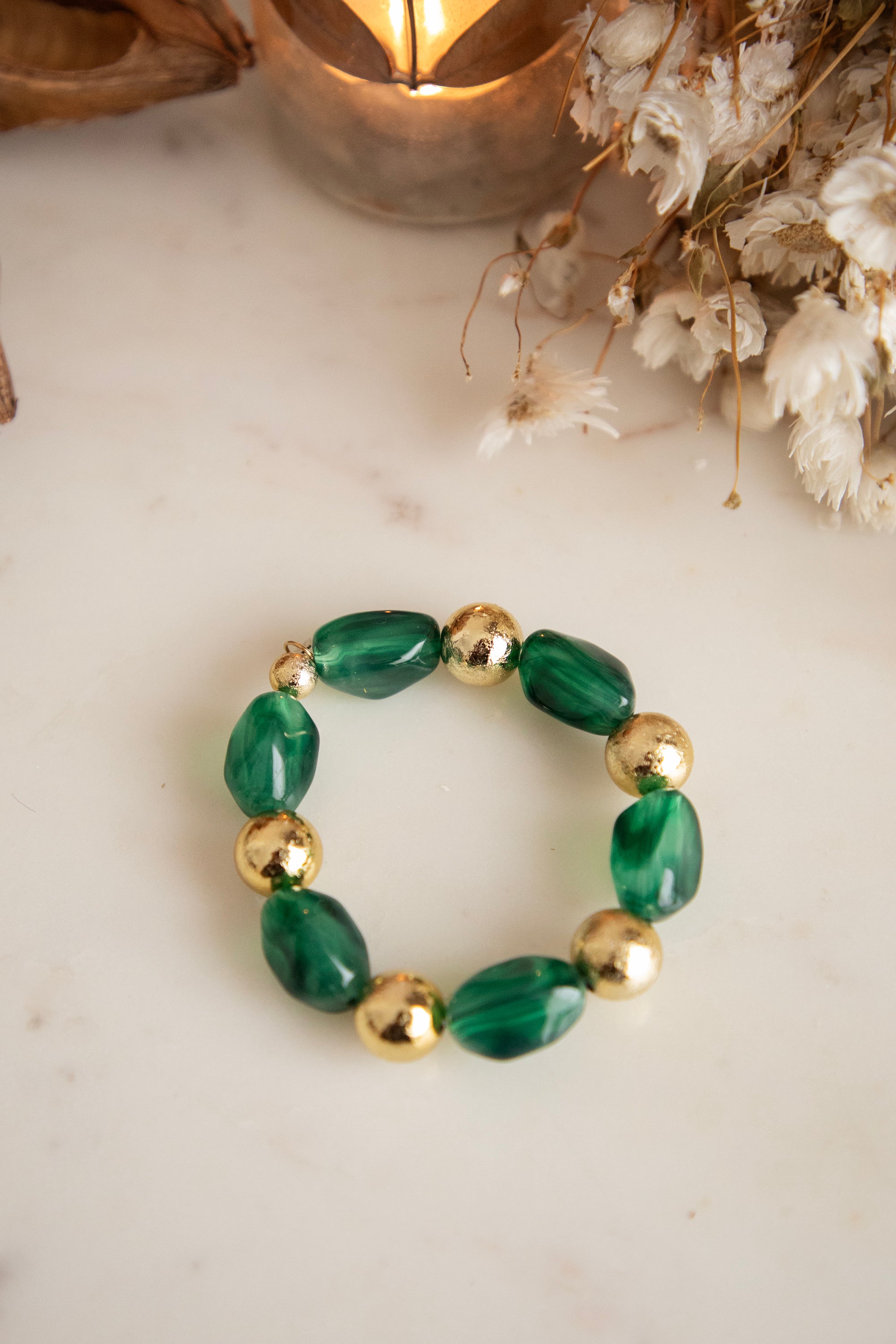 Deze armband is een echte herfstfavoriet! De kleine donkergroene glaskralen stralen een mysterieuze forest vibe uit 🍃 Tussen de groene kralen schitteren meerdere gouden aluminium kralen voor dat extra beetje luxe ✨ Het geheel is gemaakt van stainless steel en rekt fijn mee, waardoor ‘ie supercomfortabel draagt. Draag ‘m solo voor een subtiel statement of combineer met andere armbandjes voor een speels, layered effect.
