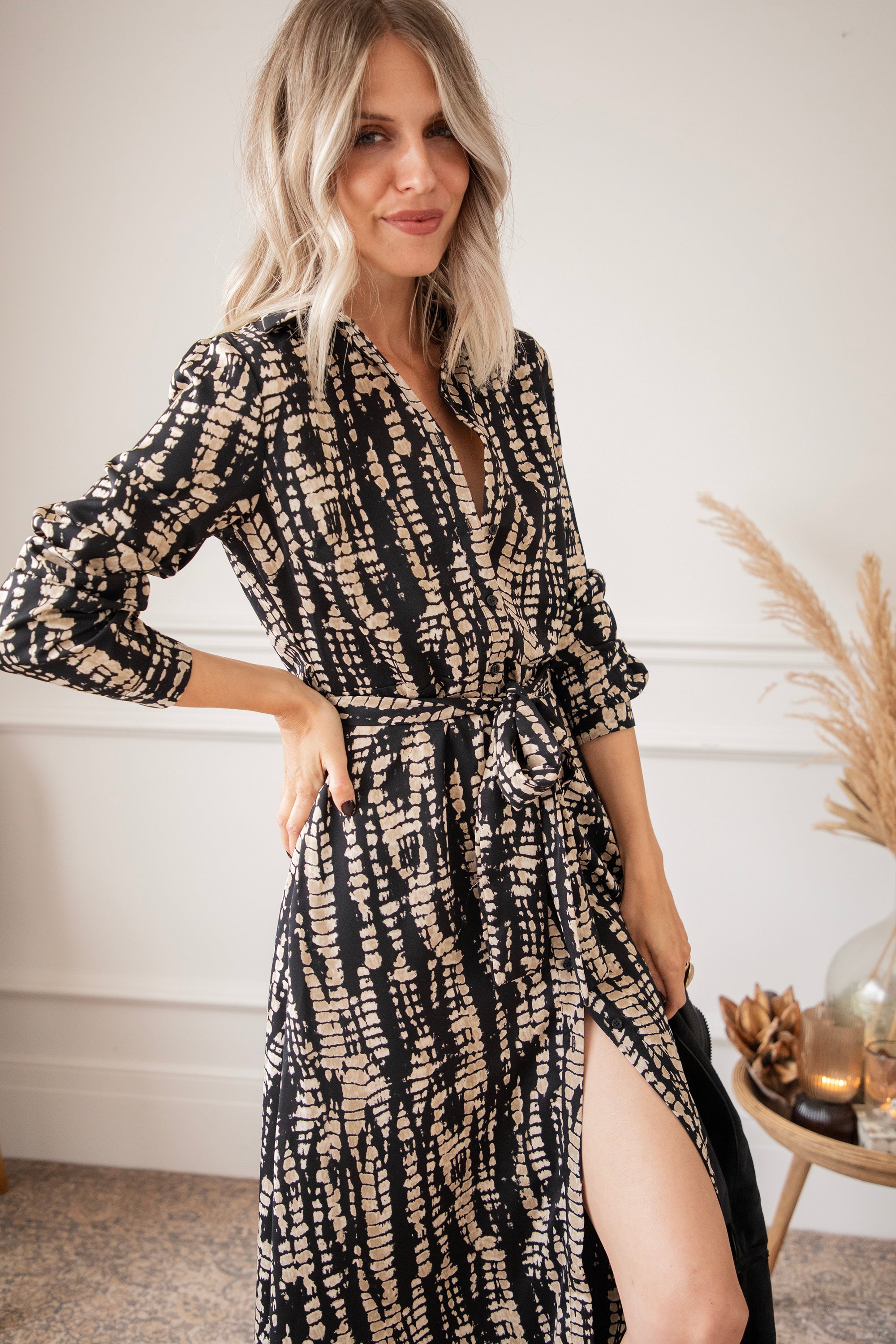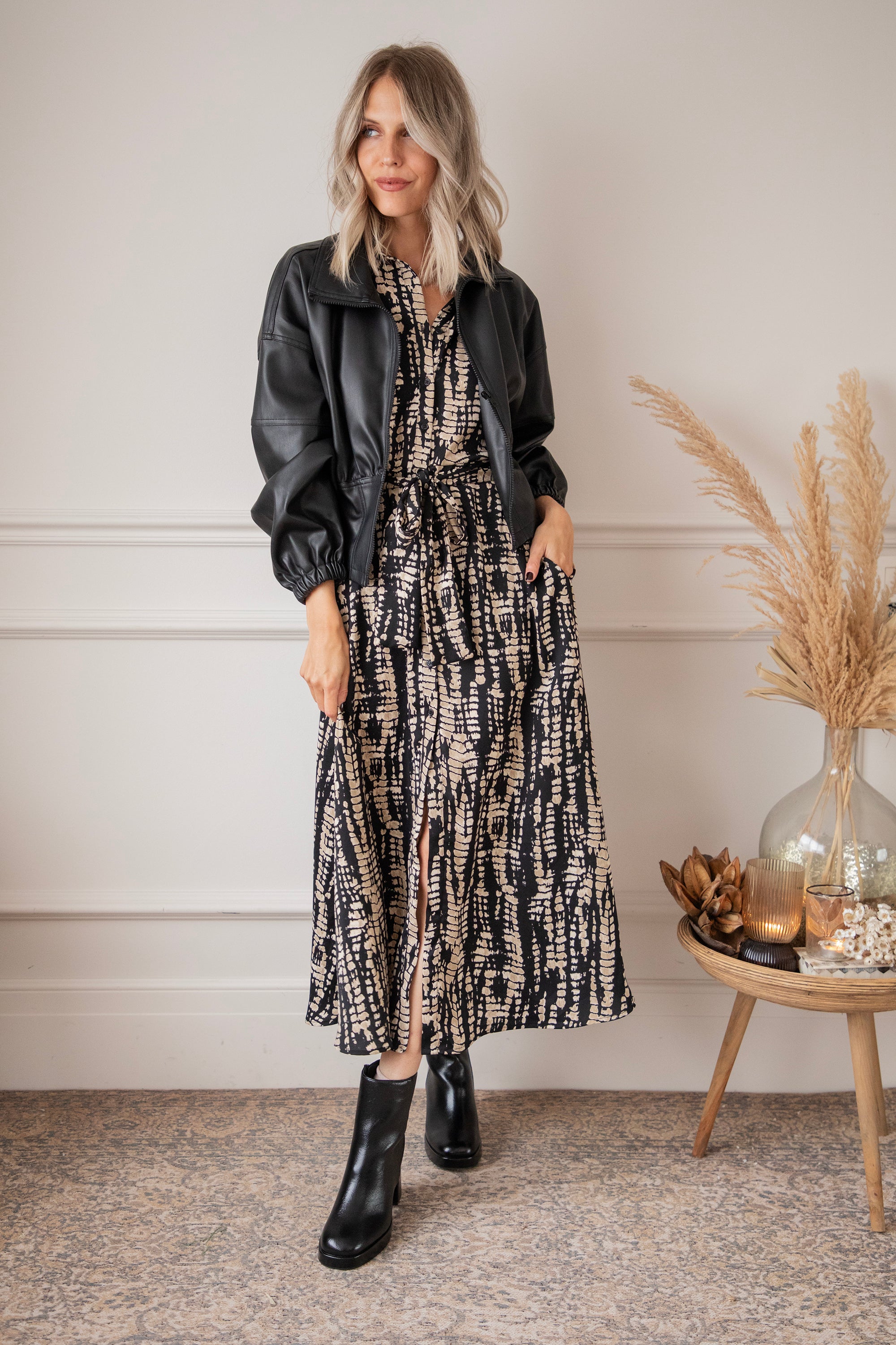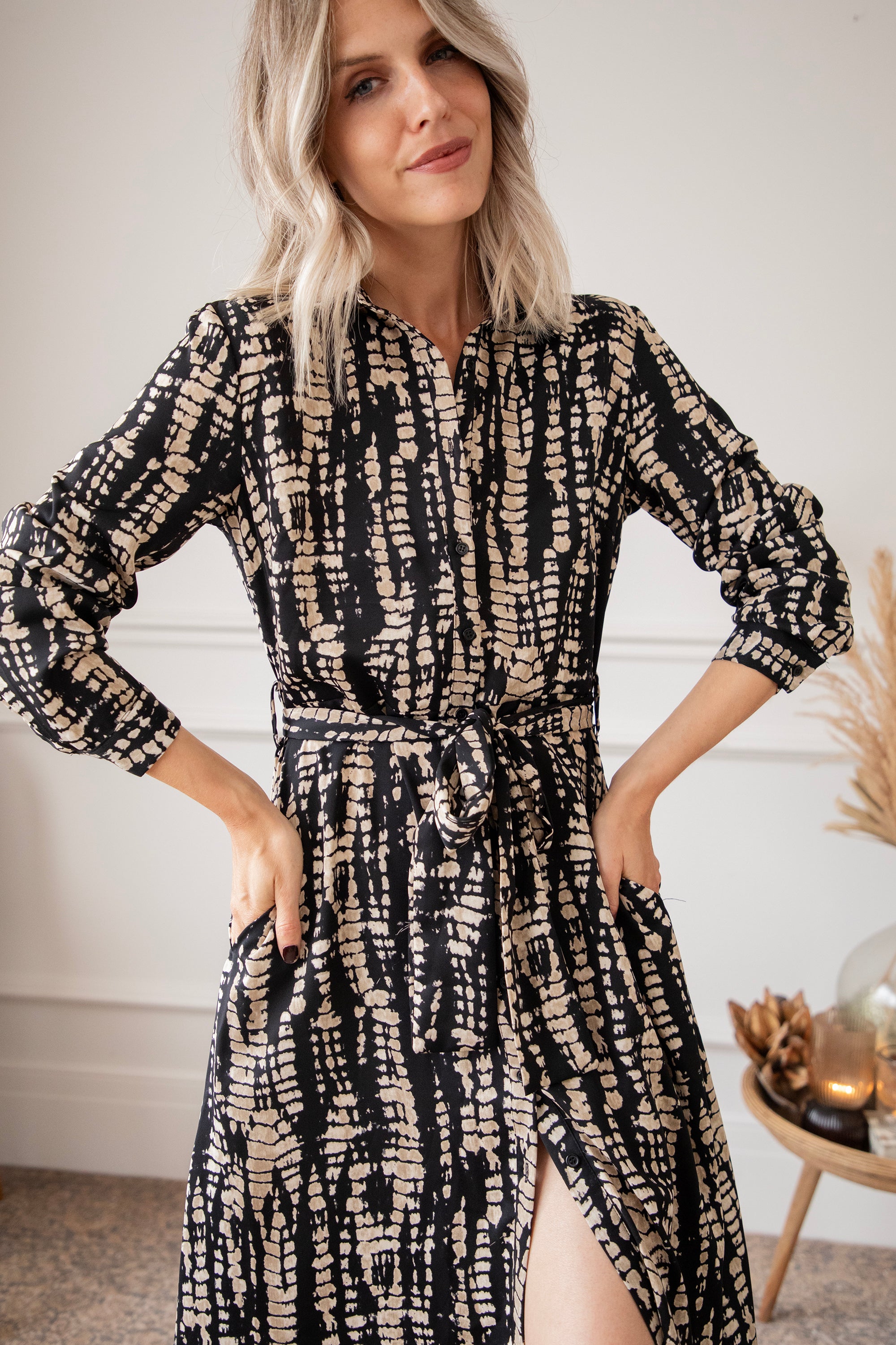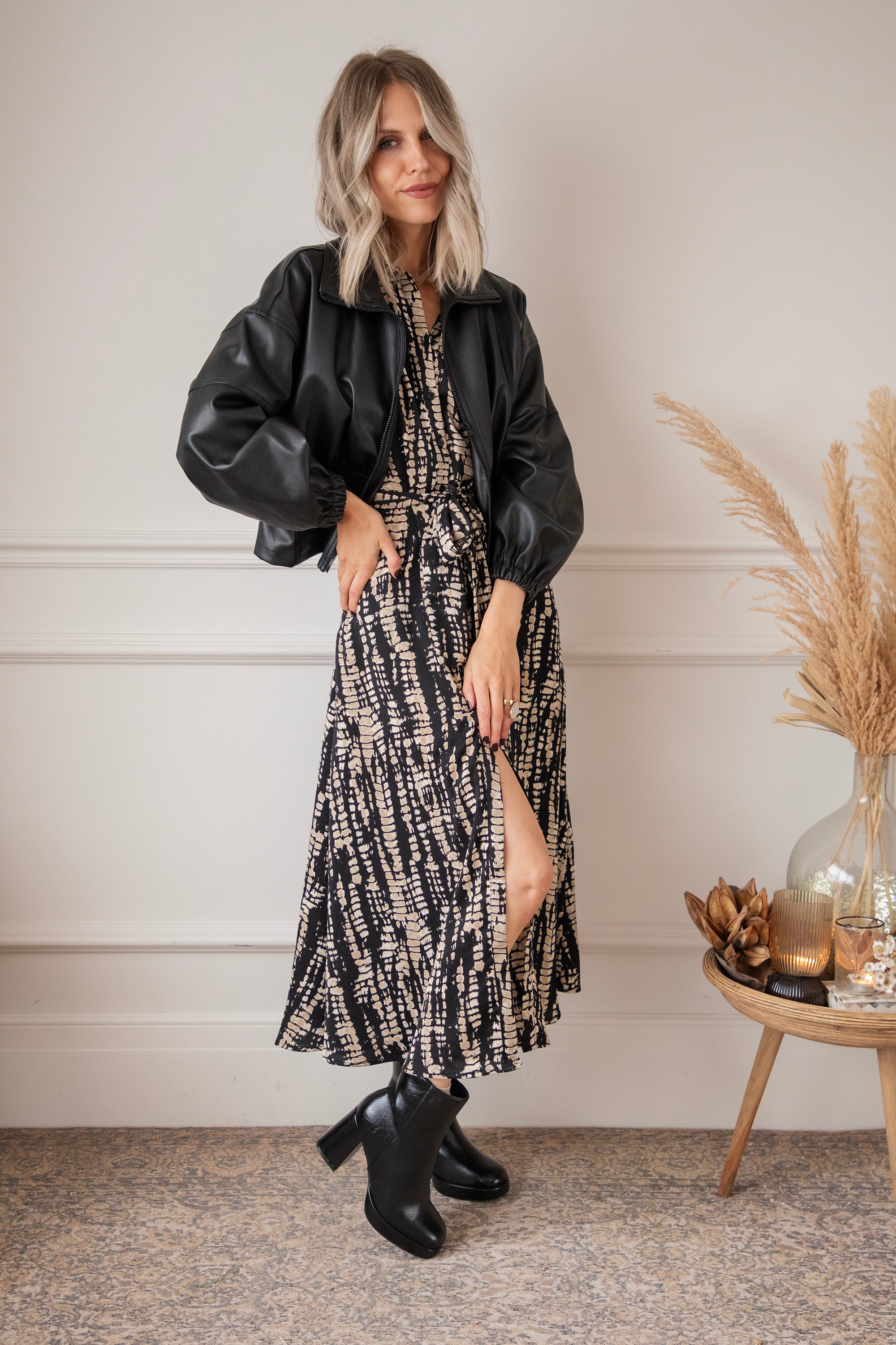 Een snake print oogt altijd wel wat stoerder vind ik! Hier is de zwarte achtergrond speels bedrukt met beige snake patronen 🐍 Het is een vrij druk patroon maar het oogt zo cool! Je laat een mooie indruk na wanneer je haar draagt 🥰