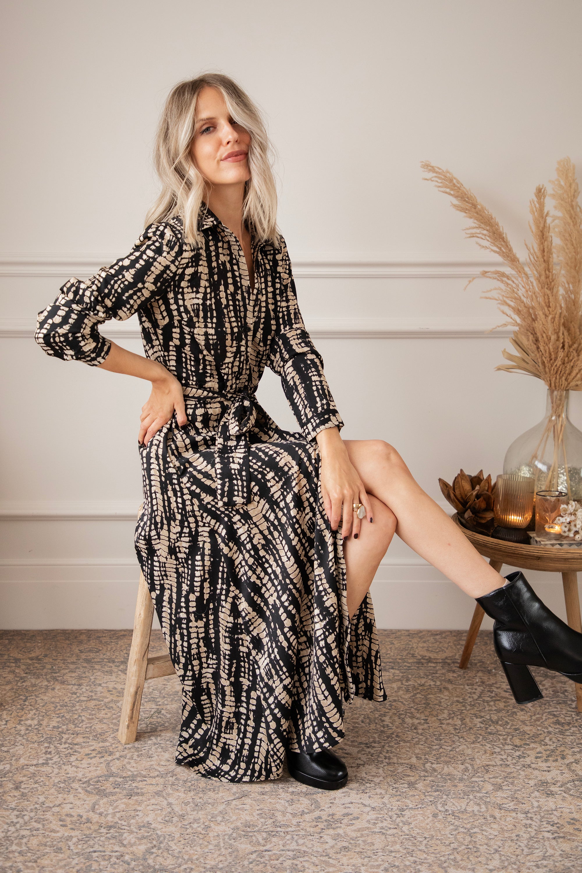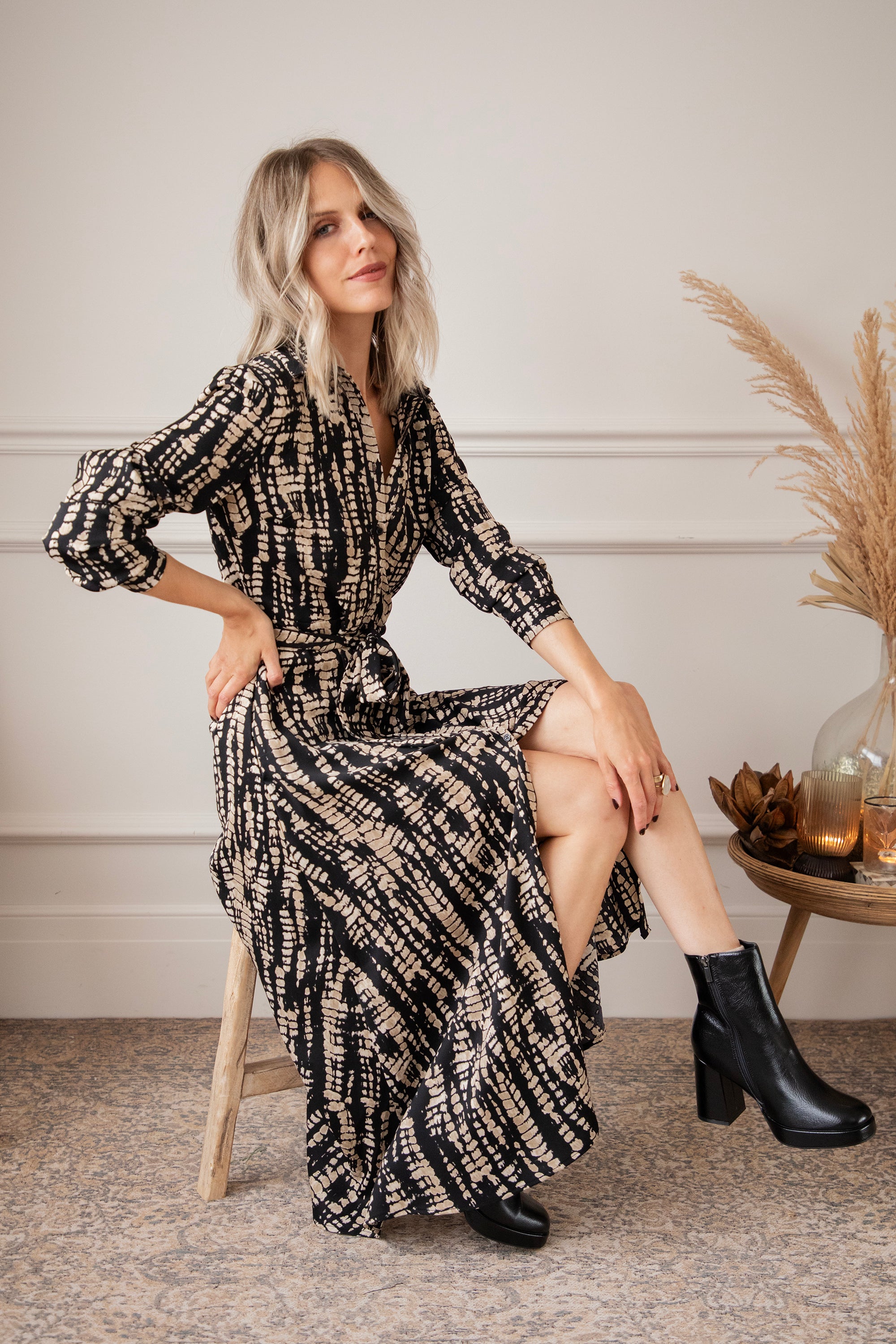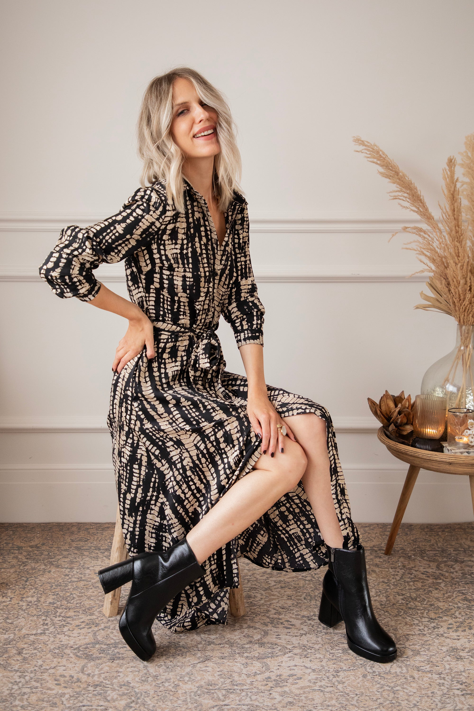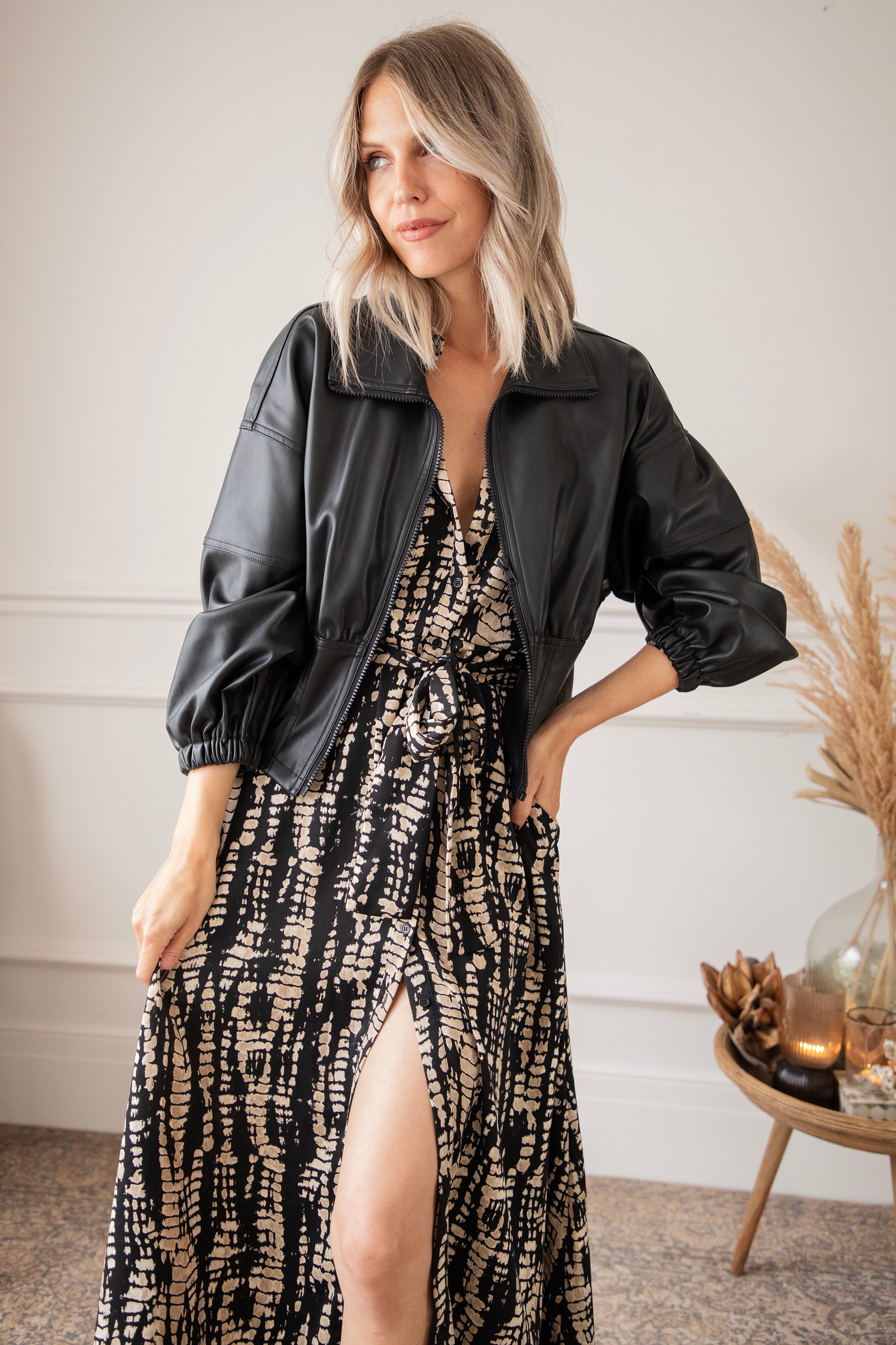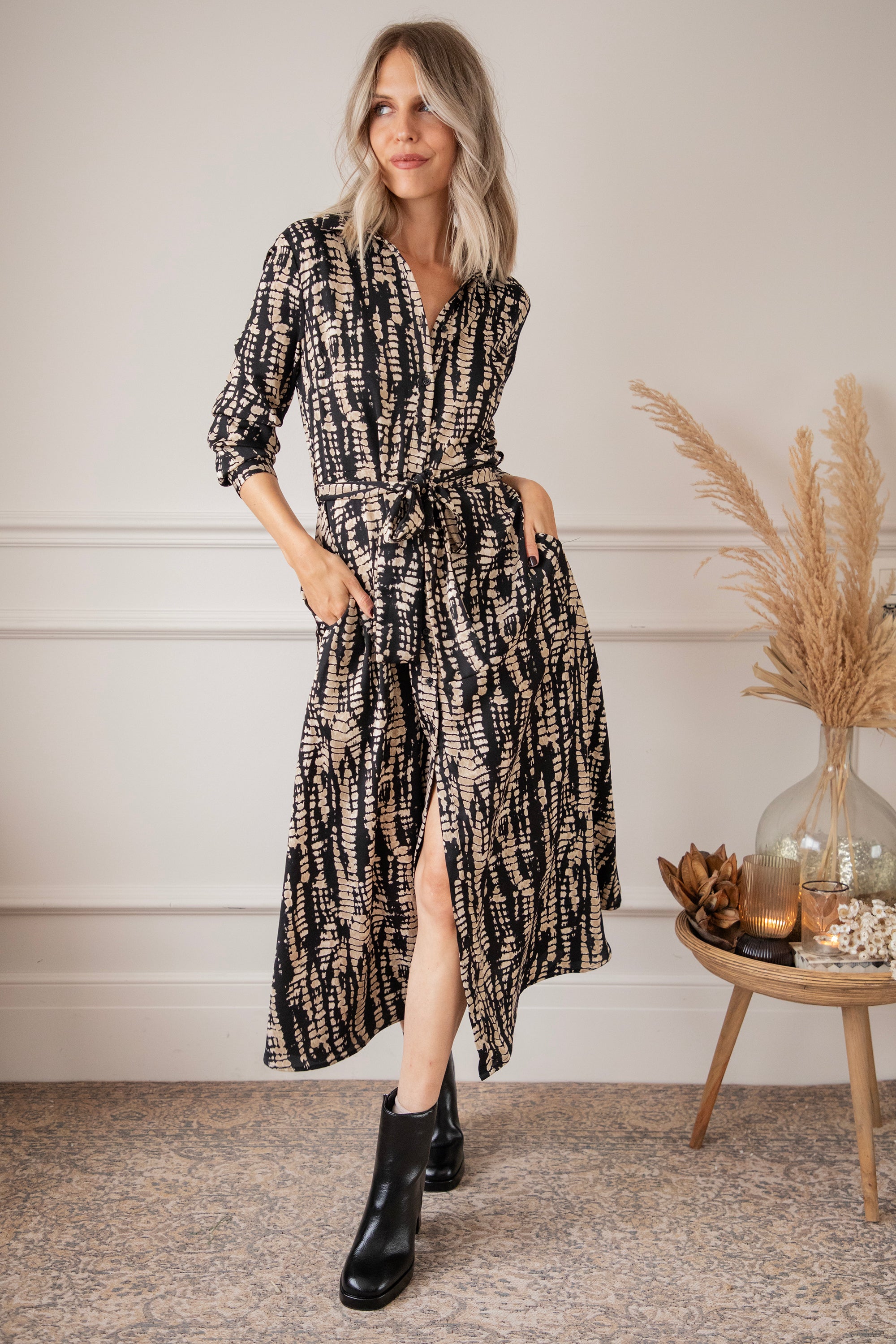 Een snake print oogt altijd wel wat stoerder vind ik! Hier is de zwarte achtergrond speels bedrukt met beige snake patronen 🐍 Het is een vrij druk patroon maar het oogt zo cool! Je laat een mooie indruk na wanneer je haar draagt 🥰
