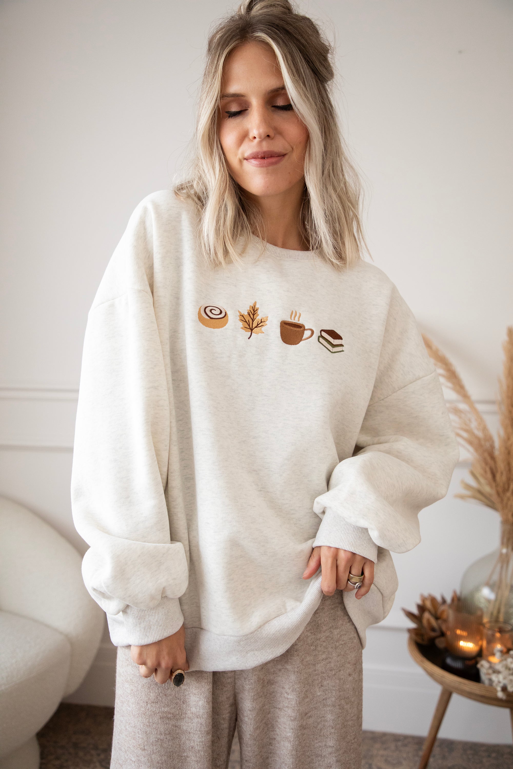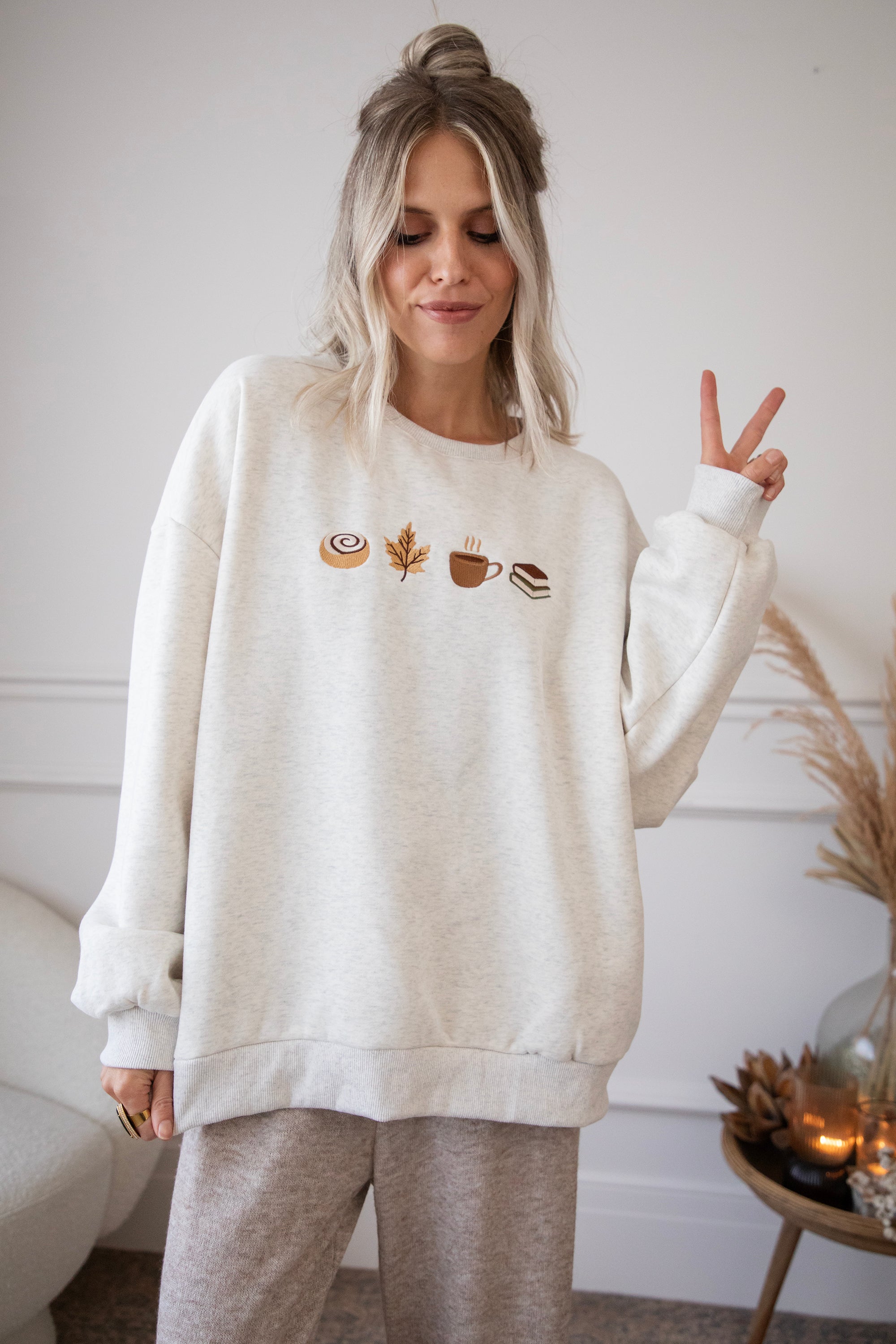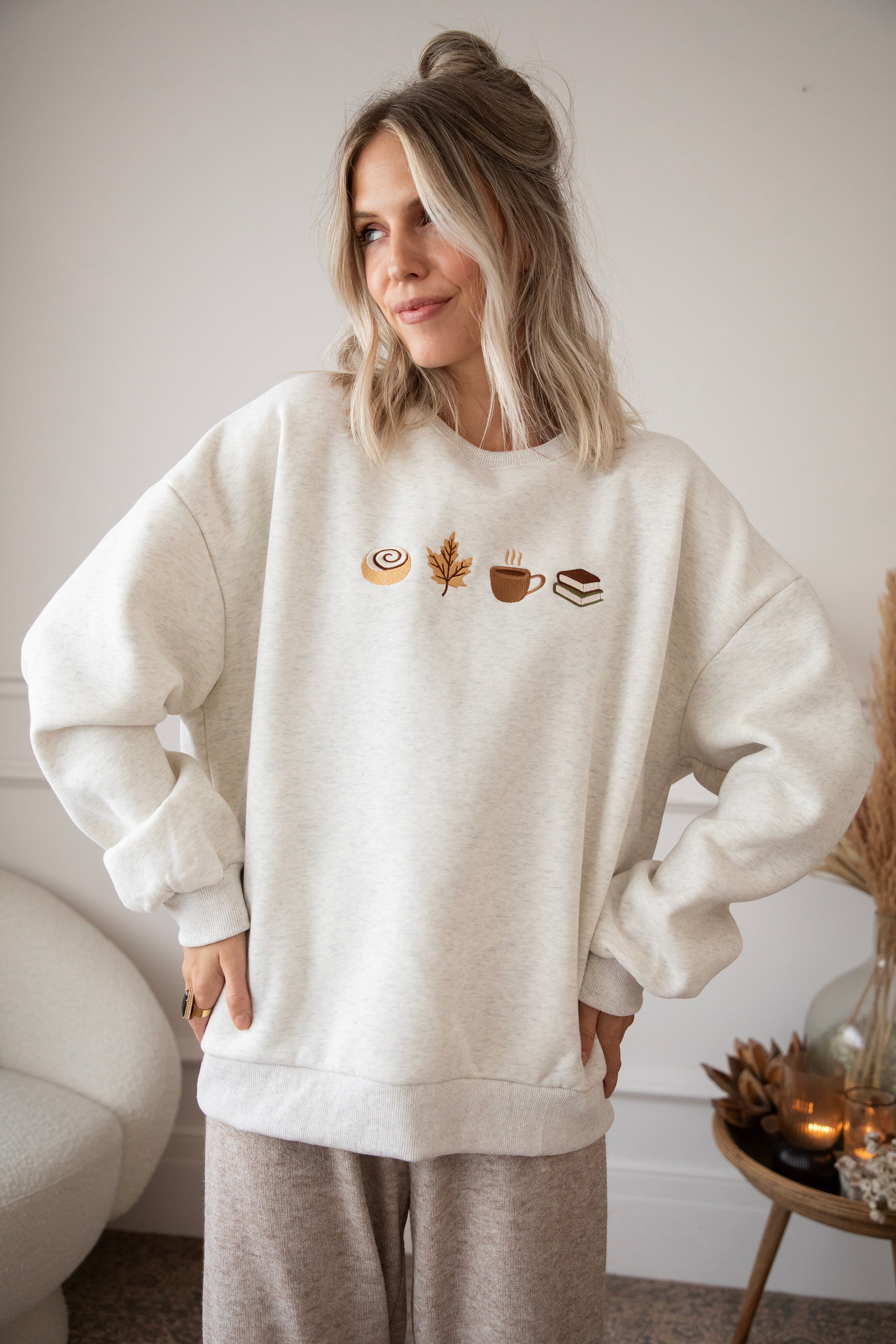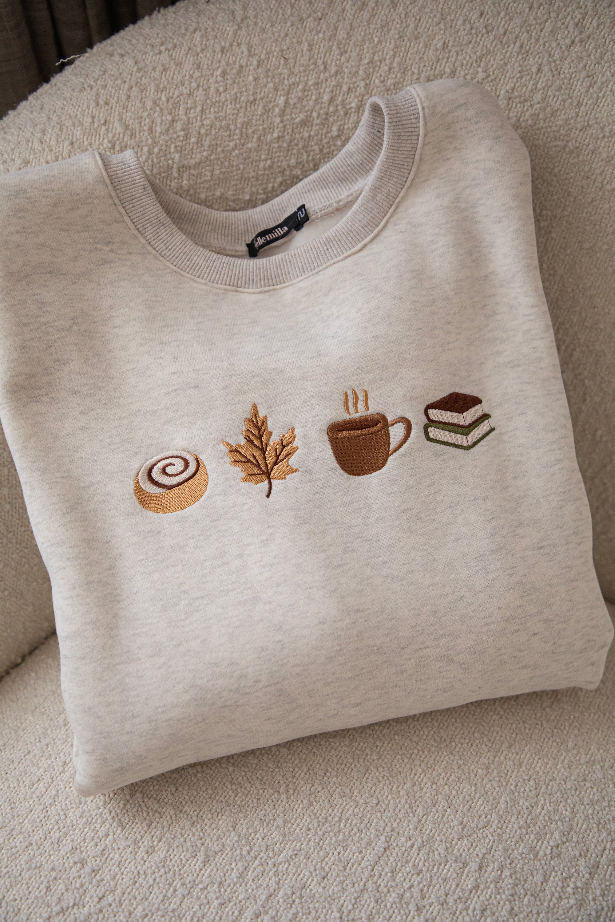 ellemillagirls, ik kan jullie zeggen: dit is echt fall perfection! 🤎 Op deze lichtgrijze sweater vind je mijn ultieme cozy herfstcombo terug: een cinnamon roll (yep, hier mag je mij écht voor wakker maken hihi 🥹), een esdoorn blaadje, een koffiekopje én een stapeltje boeken. Voor mij dé dream autumn mix, alles wat een herfstdag zó gezellig maakt in één sweater! ✨ Een knap staaltje borduurwerk!