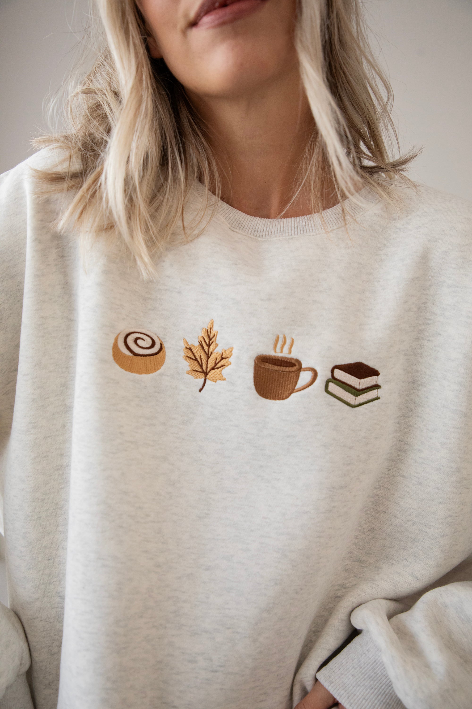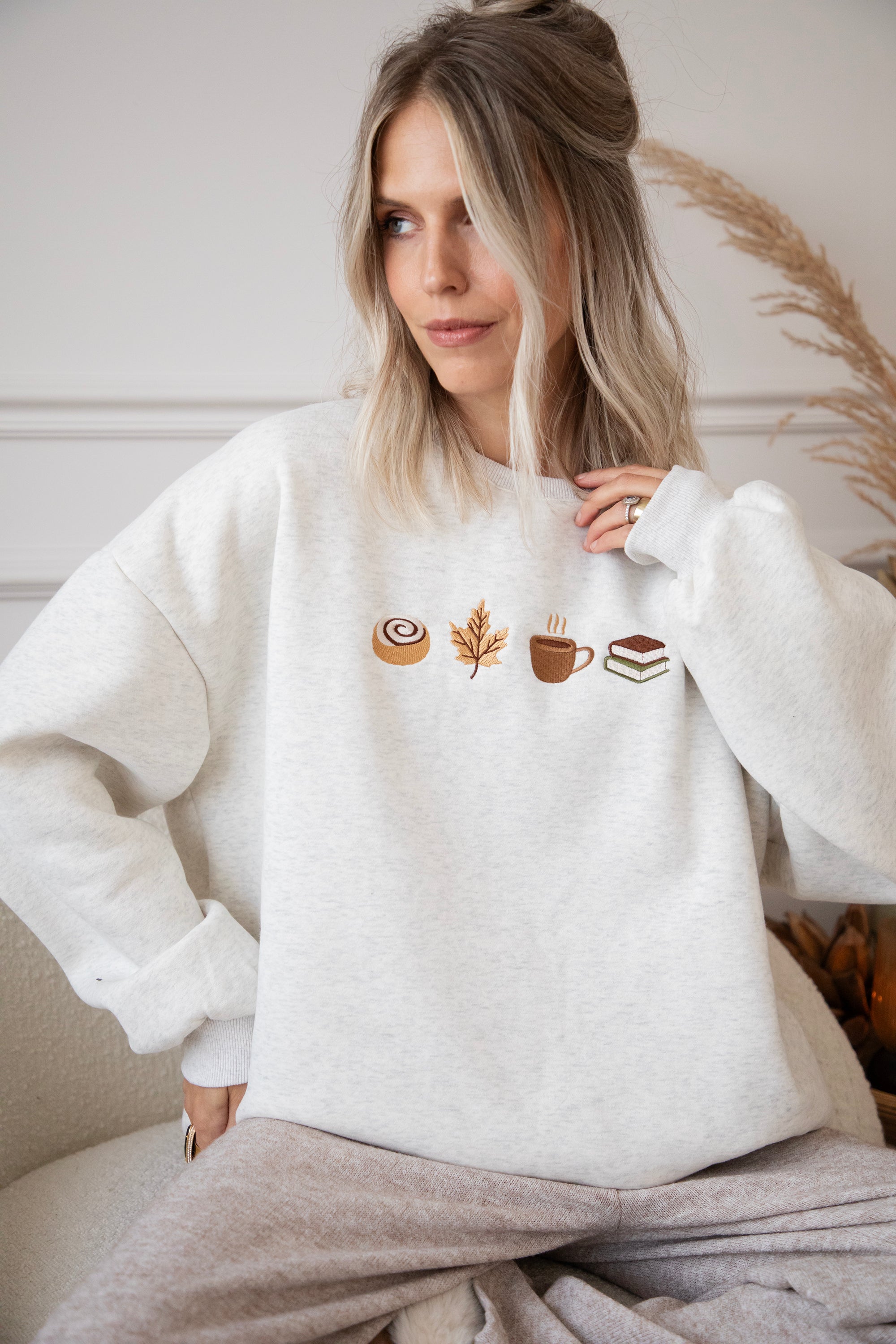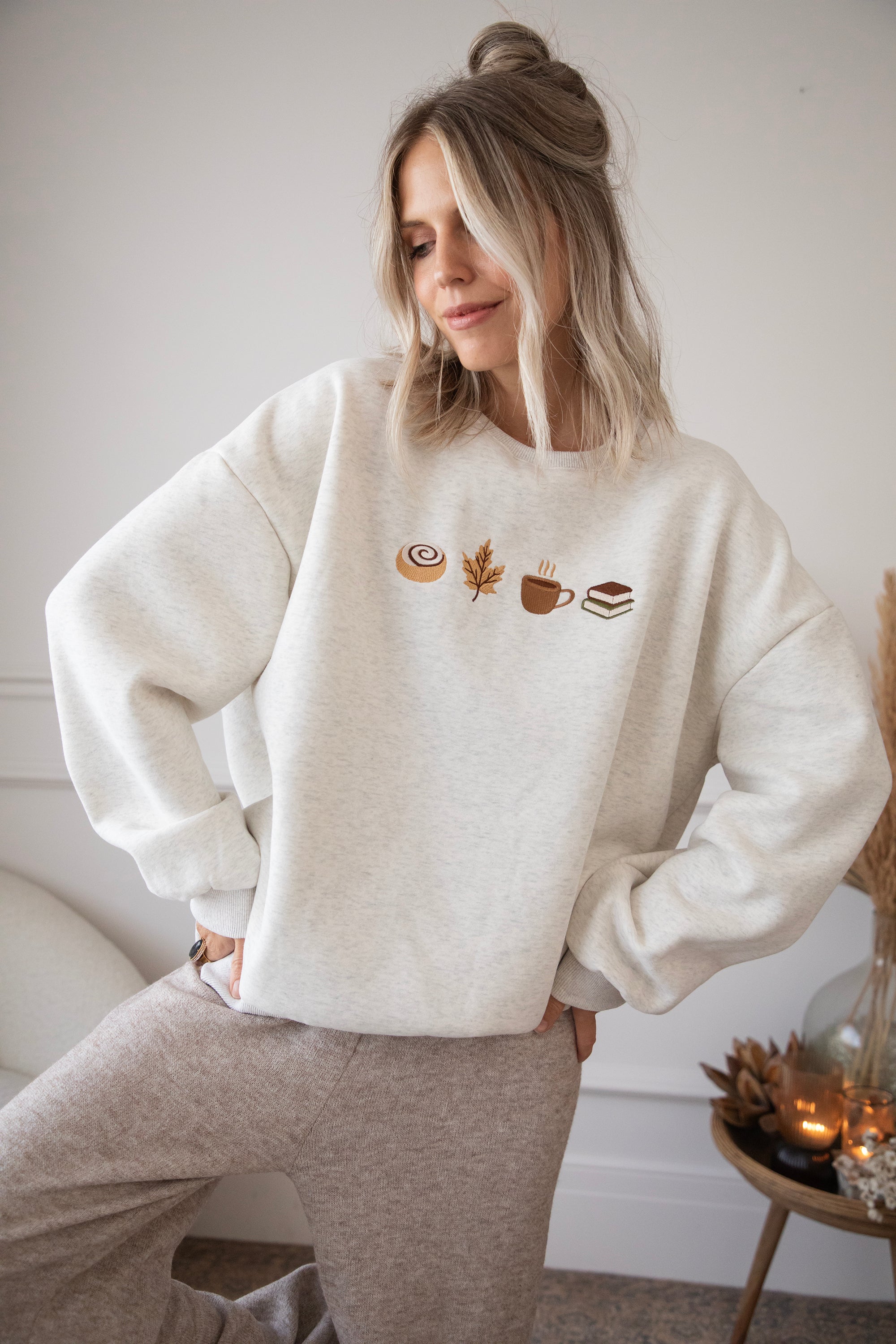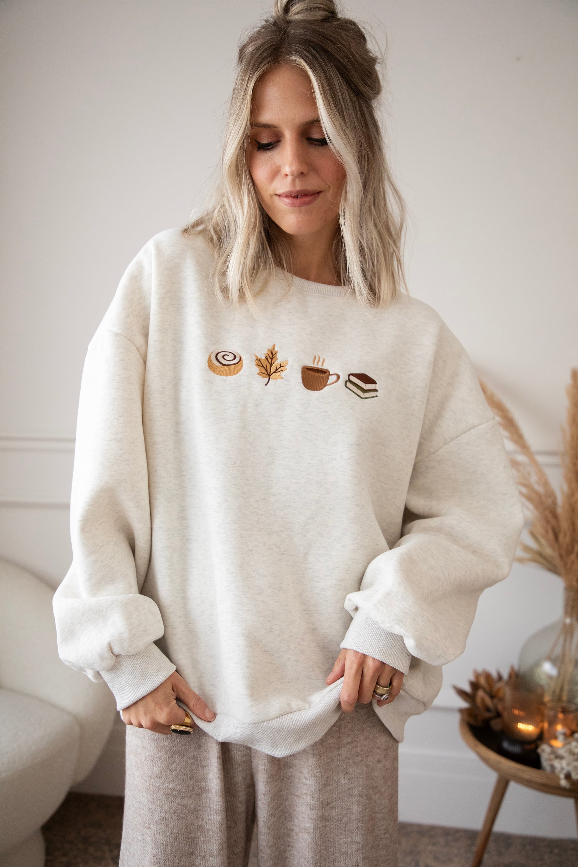 ellemillagirls, ik kan jullie zeggen: dit is echt fall perfection! 🤎 Op deze lichtgrijze sweater vind je mijn ultieme cozy herfstcombo terug: een cinnamon roll (yep, hier mag je mij écht voor wakker maken hihi 🥹), een esdoorn blaadje, een koffiekopje én een stapeltje boeken. Voor mij dé dream autumn mix, alles wat een herfstdag zó gezellig maakt in één sweater! ✨ Een knap staaltje borduurwerk!