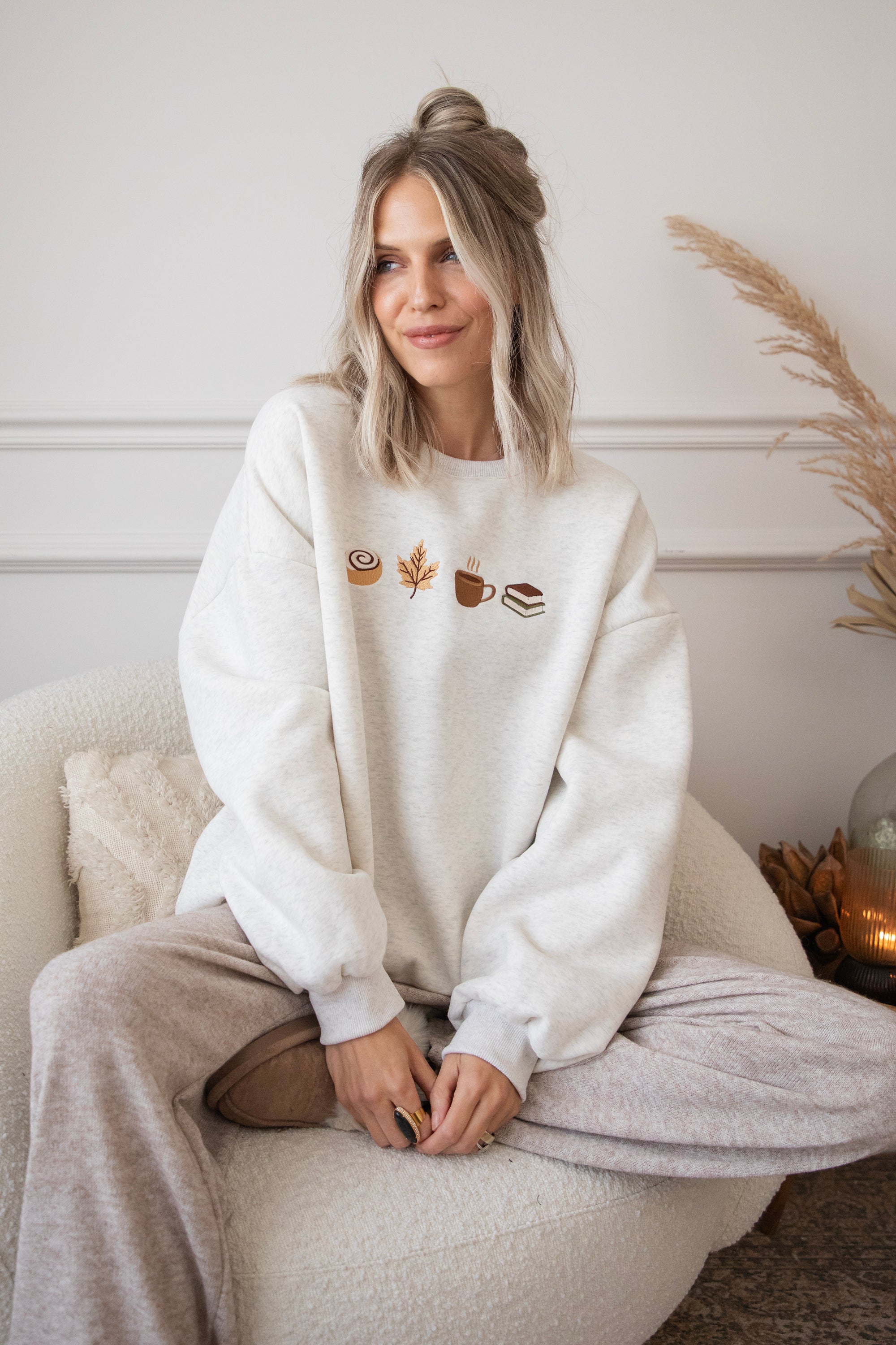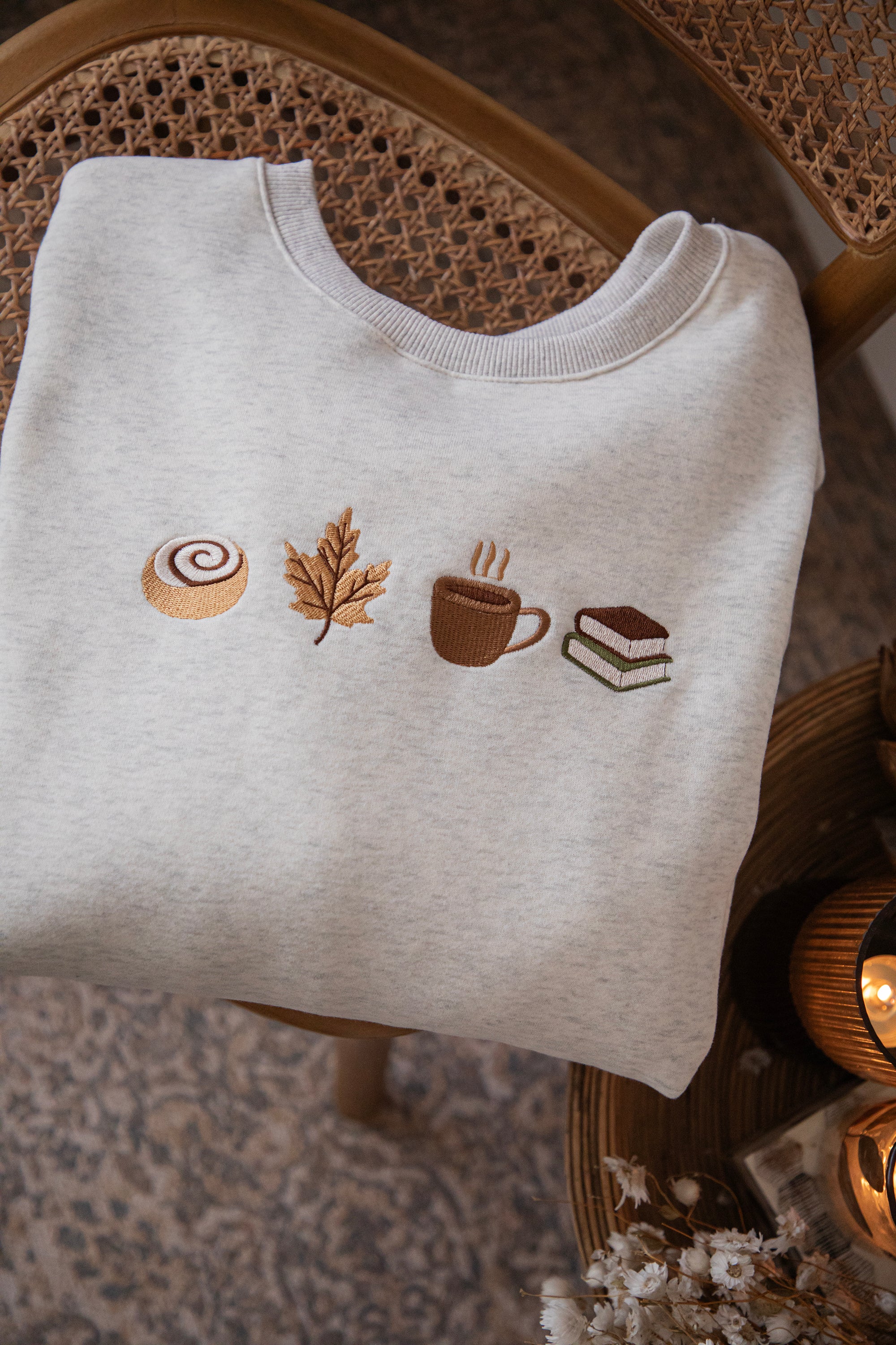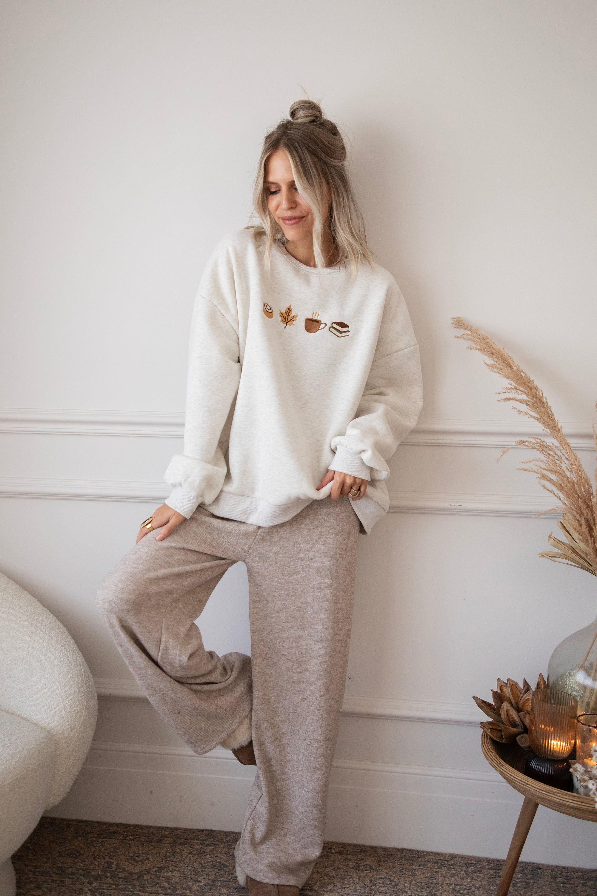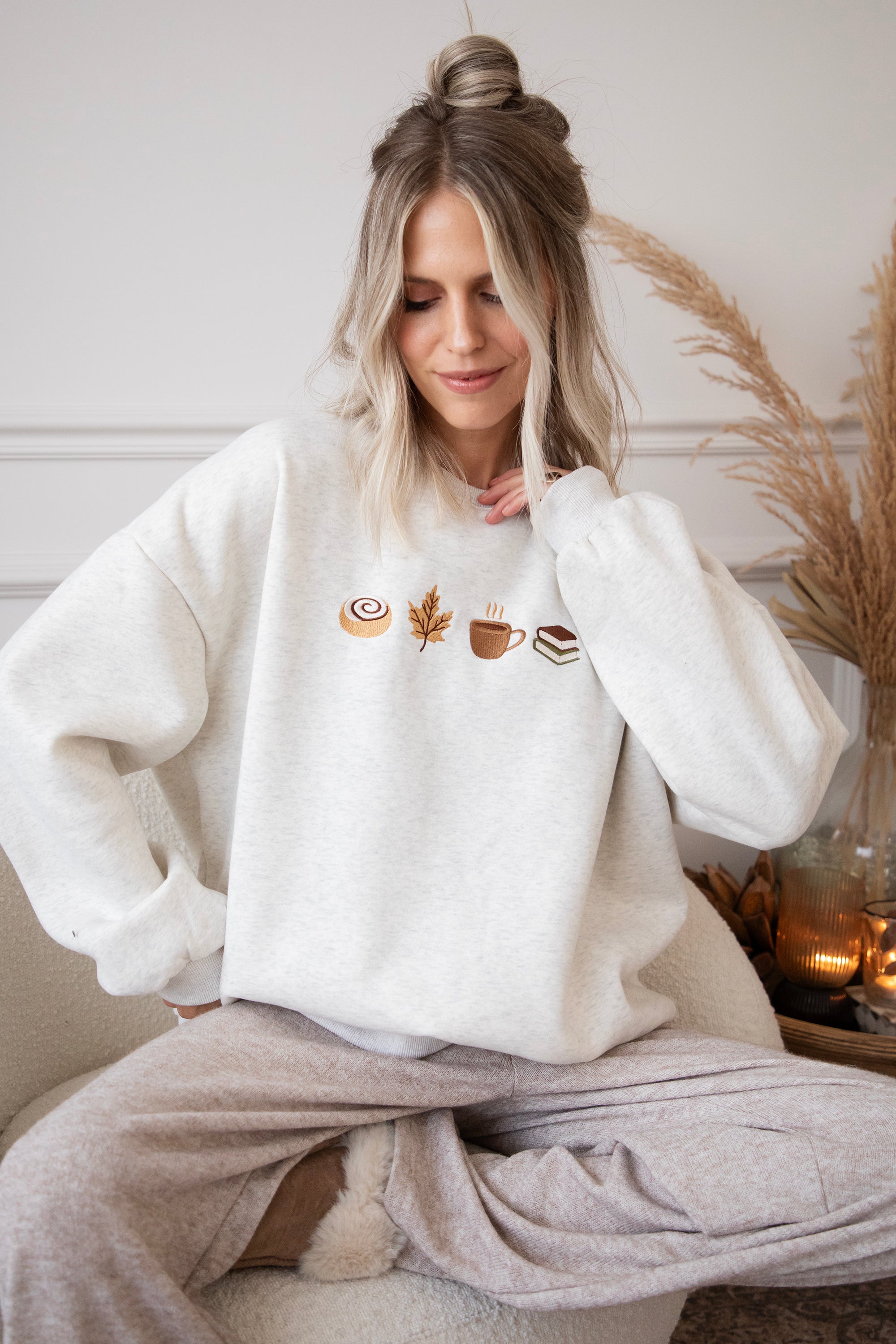 ellemillagirls, ik kan jullie zeggen: dit is echt fall perfection! 🤎 Op deze lichtgrijze sweater vind je mijn ultieme cozy herfstcombo terug: een cinnamon roll (yep, hier mag je mij écht voor wakker maken hihi 🥹), een esdoorn blaadje, een koffiekopje én een stapeltje boeken. Voor mij dé dream autumn mix, alles wat een herfstdag zó gezellig maakt in één sweater! ✨ Een knap staaltje borduurwerk!