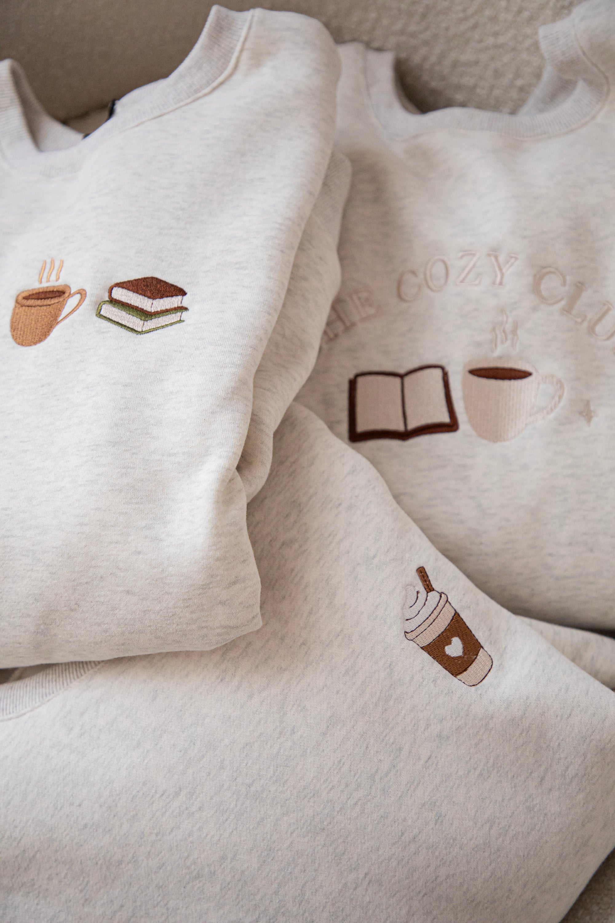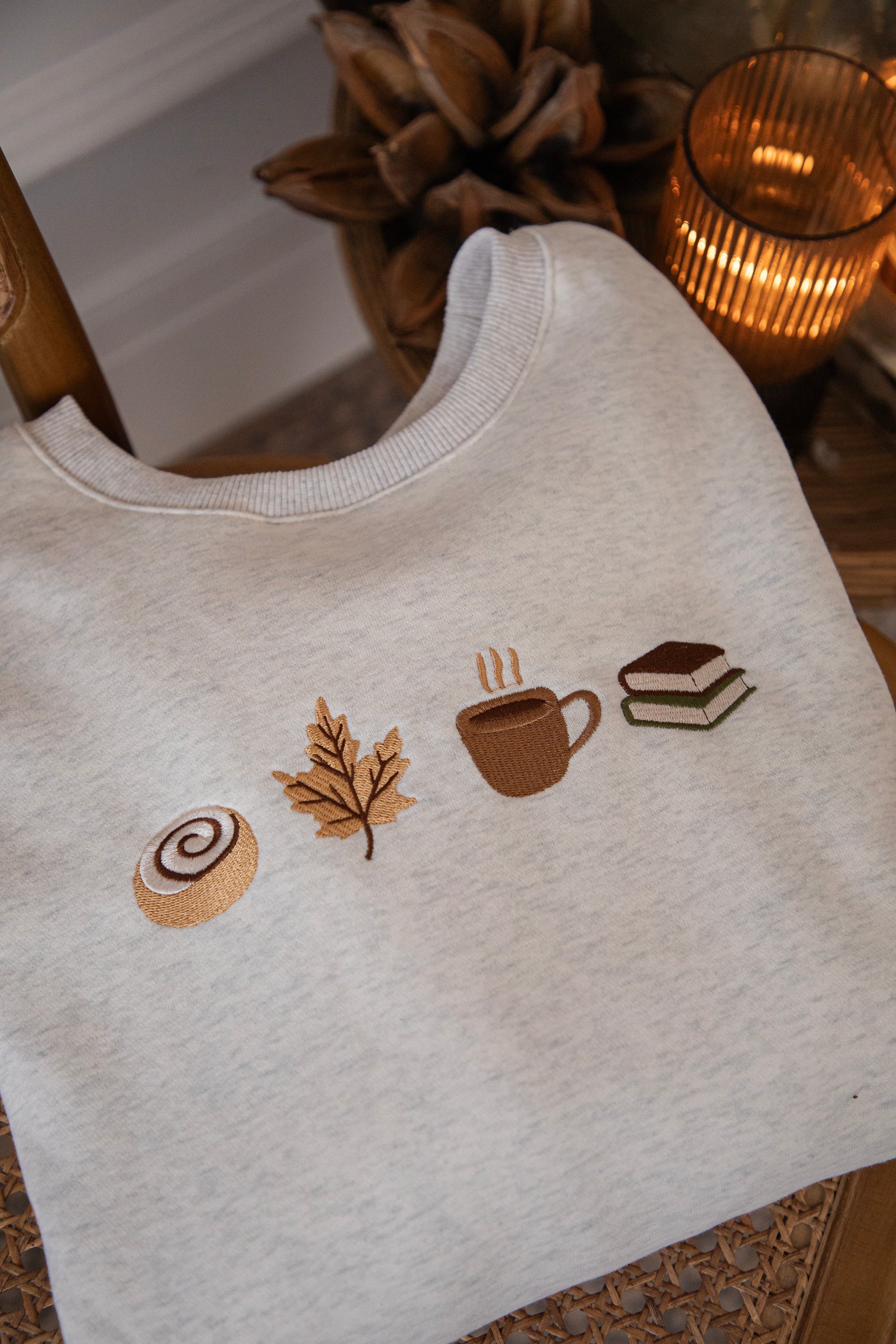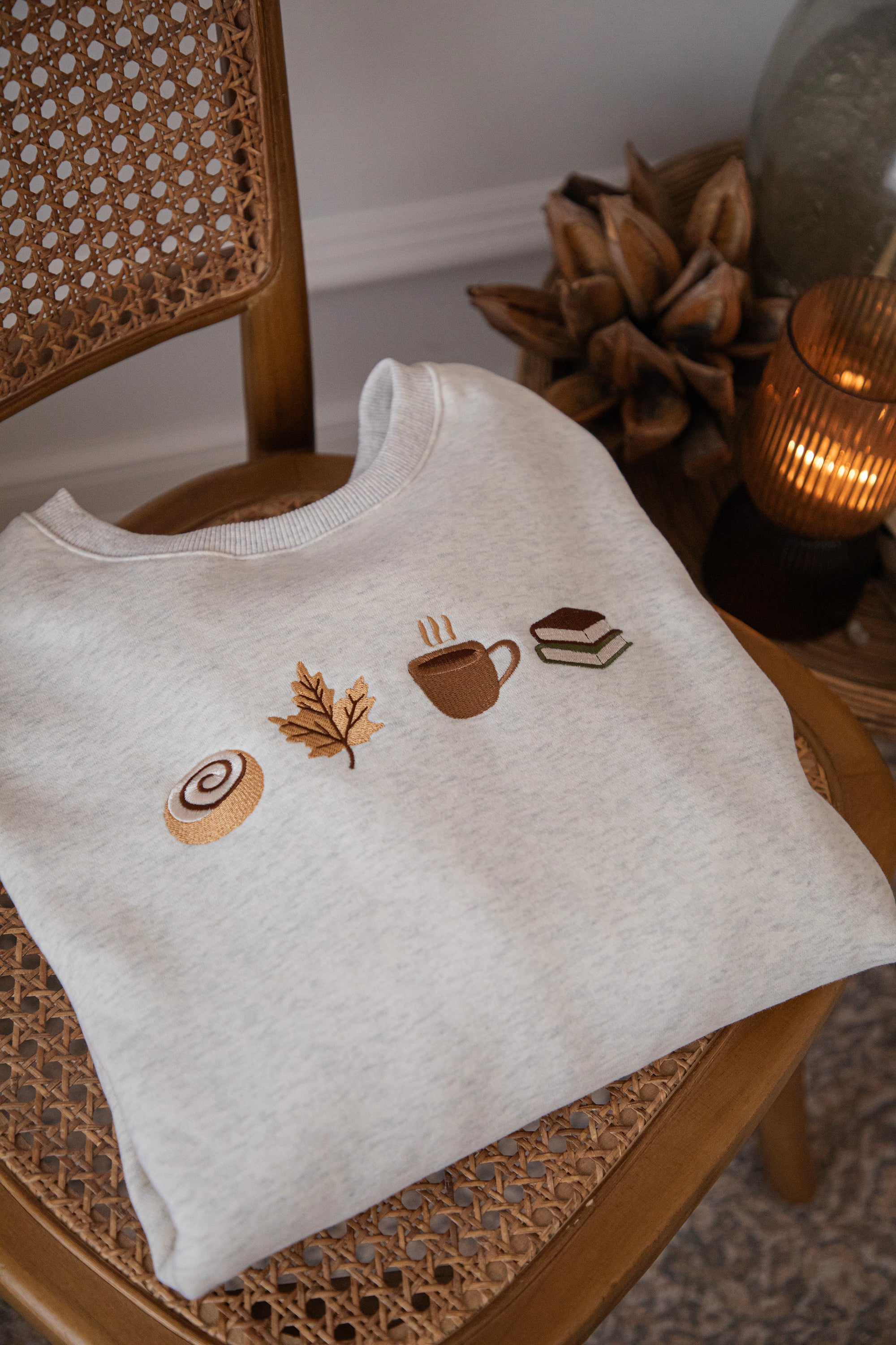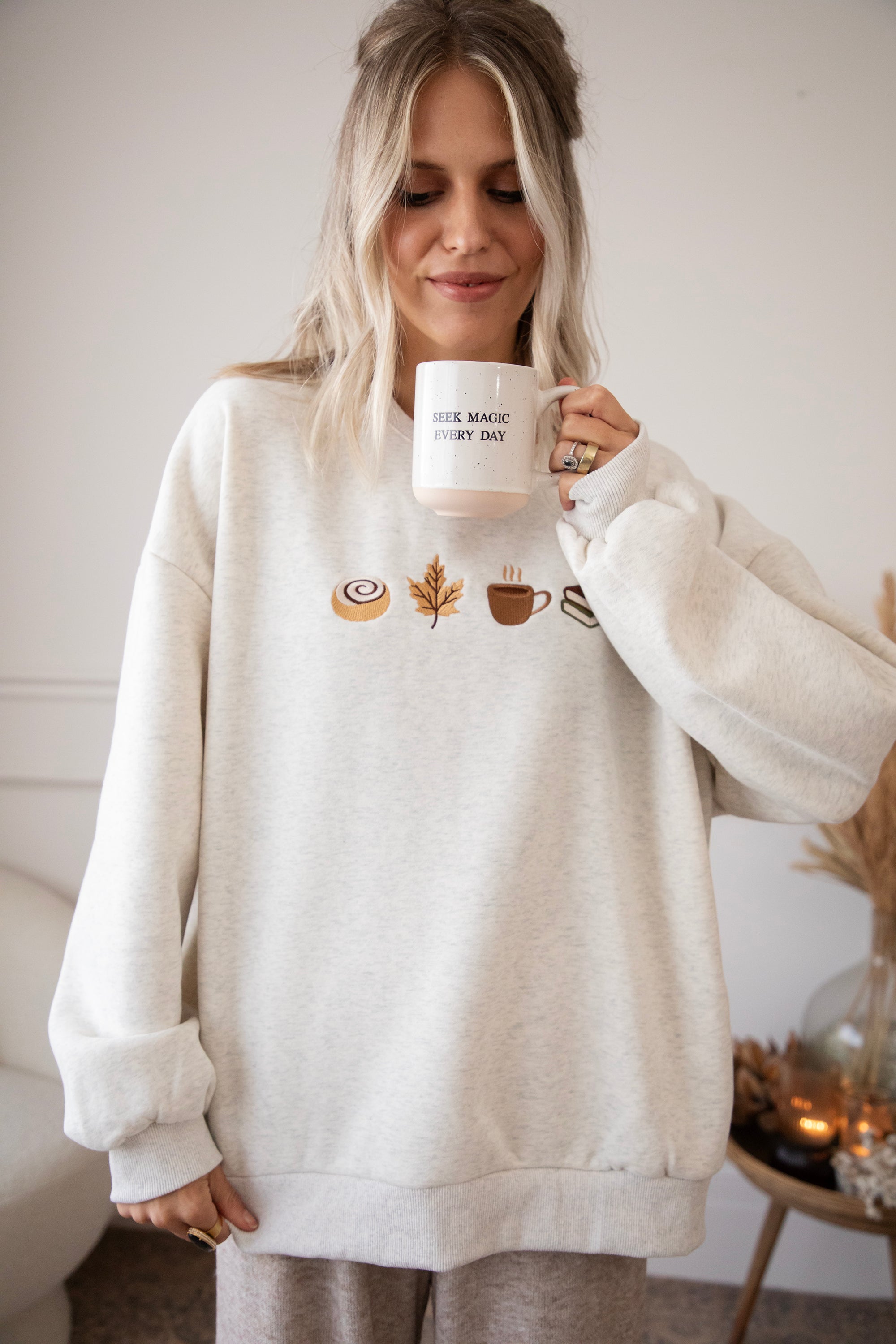 ellemillagirls, ik kan jullie zeggen: dit is echt fall perfection! 🤎 Op deze lichtgrijze sweater vind je mijn ultieme cozy herfstcombo terug: een cinnamon roll (yep, hier mag je mij écht voor wakker maken hihi 🥹), een esdoorn blaadje, een koffiekopje én een stapeltje boeken. Voor mij dé dream autumn mix, alles wat een herfstdag zó gezellig maakt in één sweater! ✨ Een knap staaltje borduurwerk!