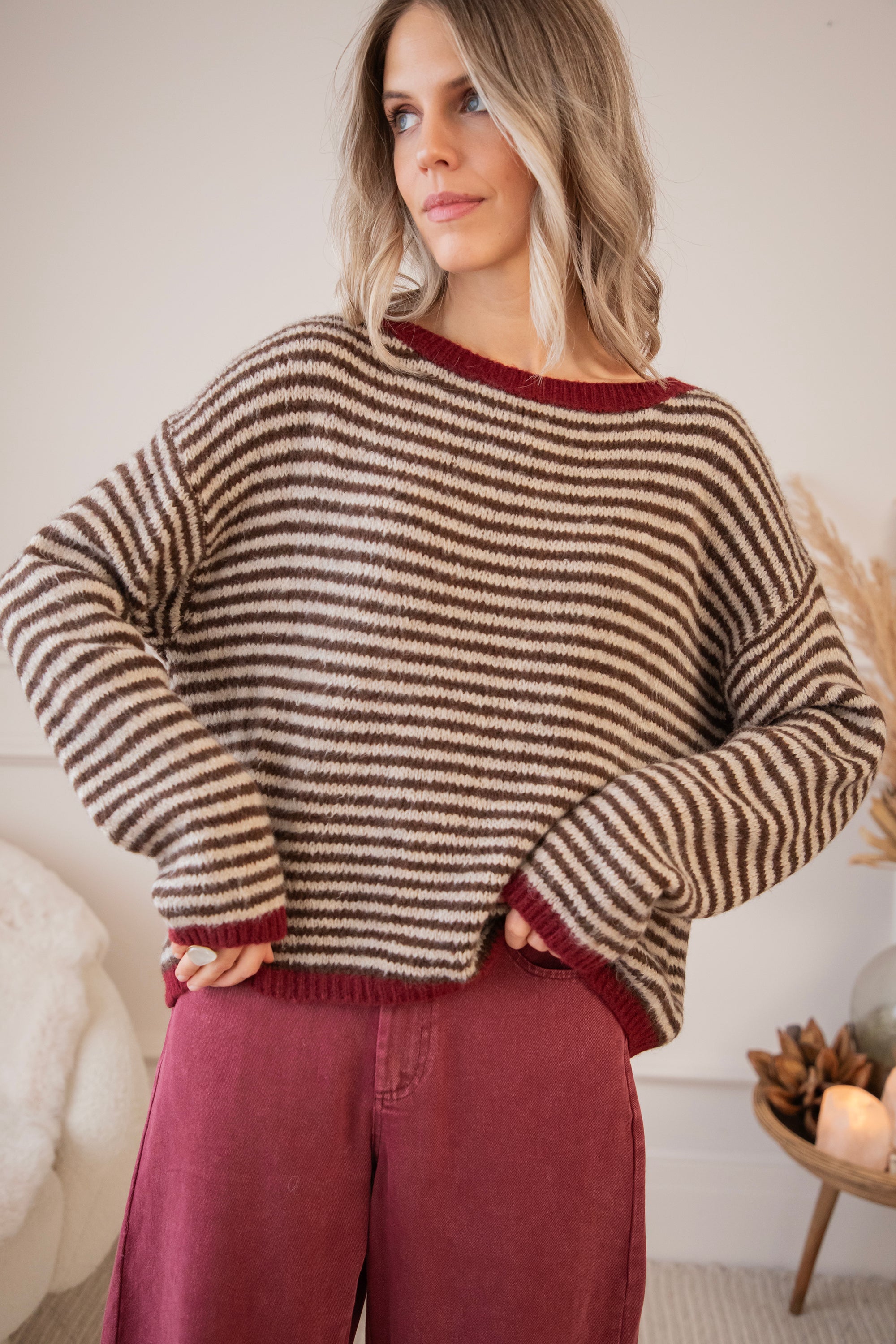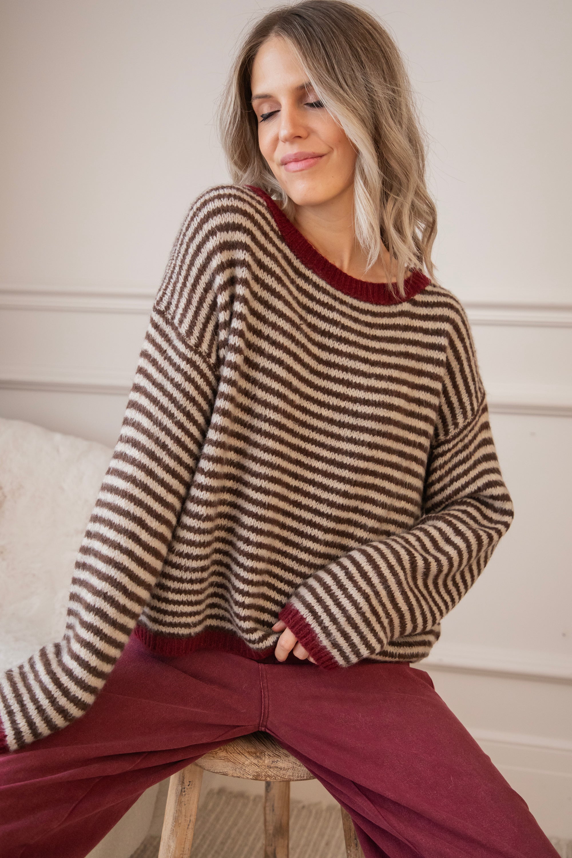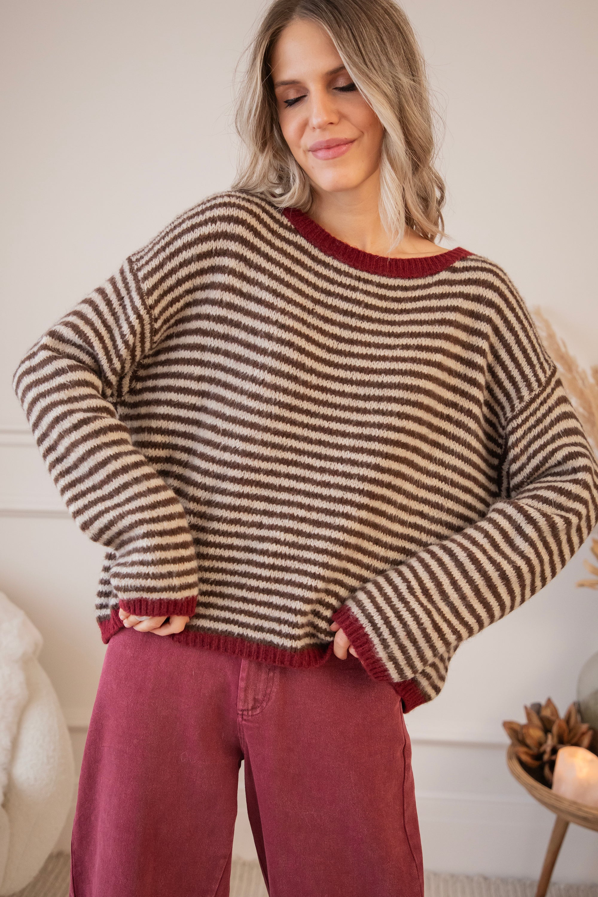 Een gestreepte trui met mijn absolute twee favoriete kleuren van het seizoen: choco & bordeaux! ❤️🤎 Hier moet je niet kiezen, hier komen ze gewoon samen zo mooi tot hun recht 🤩 De bruine strepen samen met de bordeaux randen maken er zo'n warm en holiday proof geheel van! Het wollige breiwerk en oversized fit charmeren alleen nog maar extra 🥰