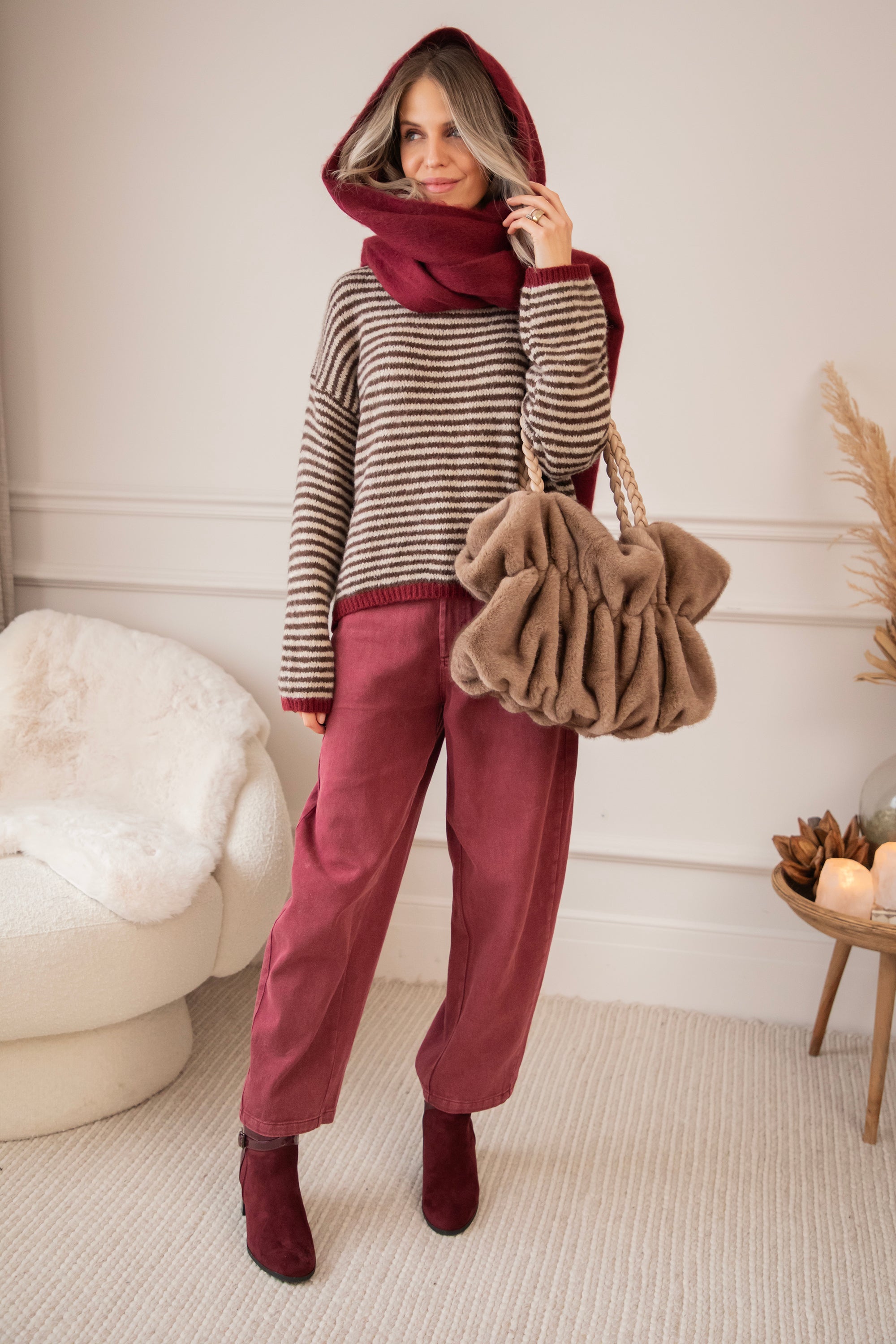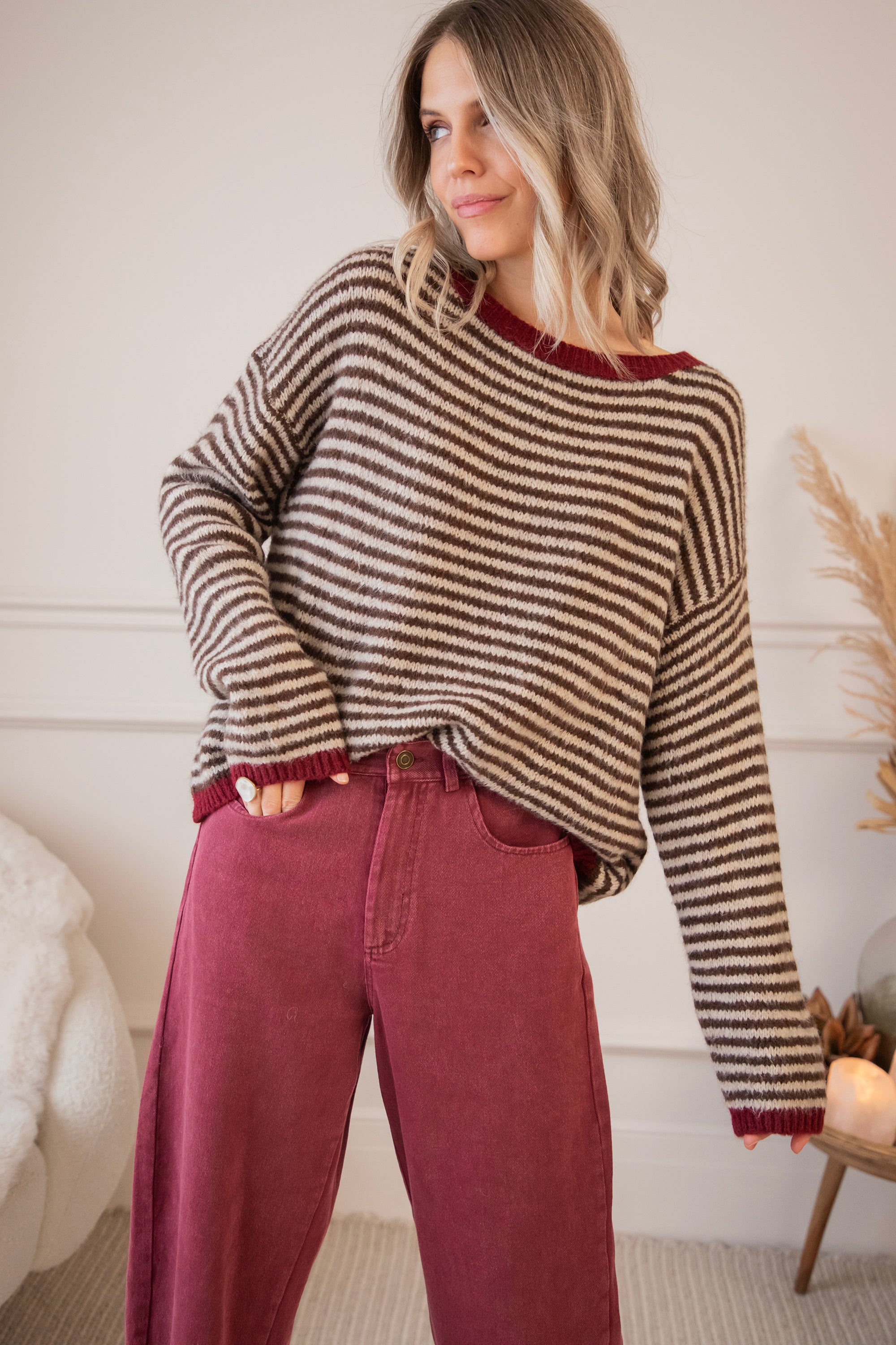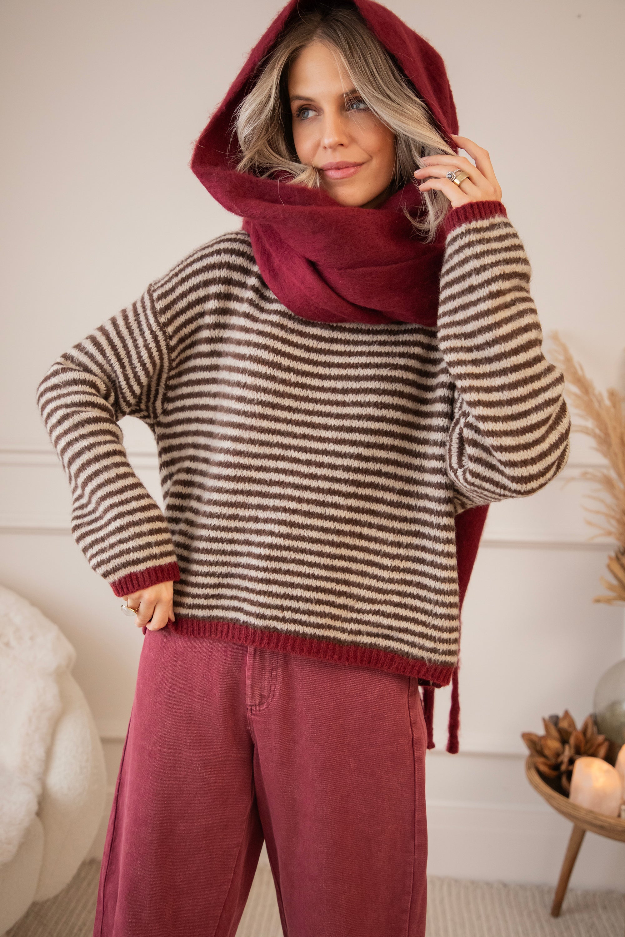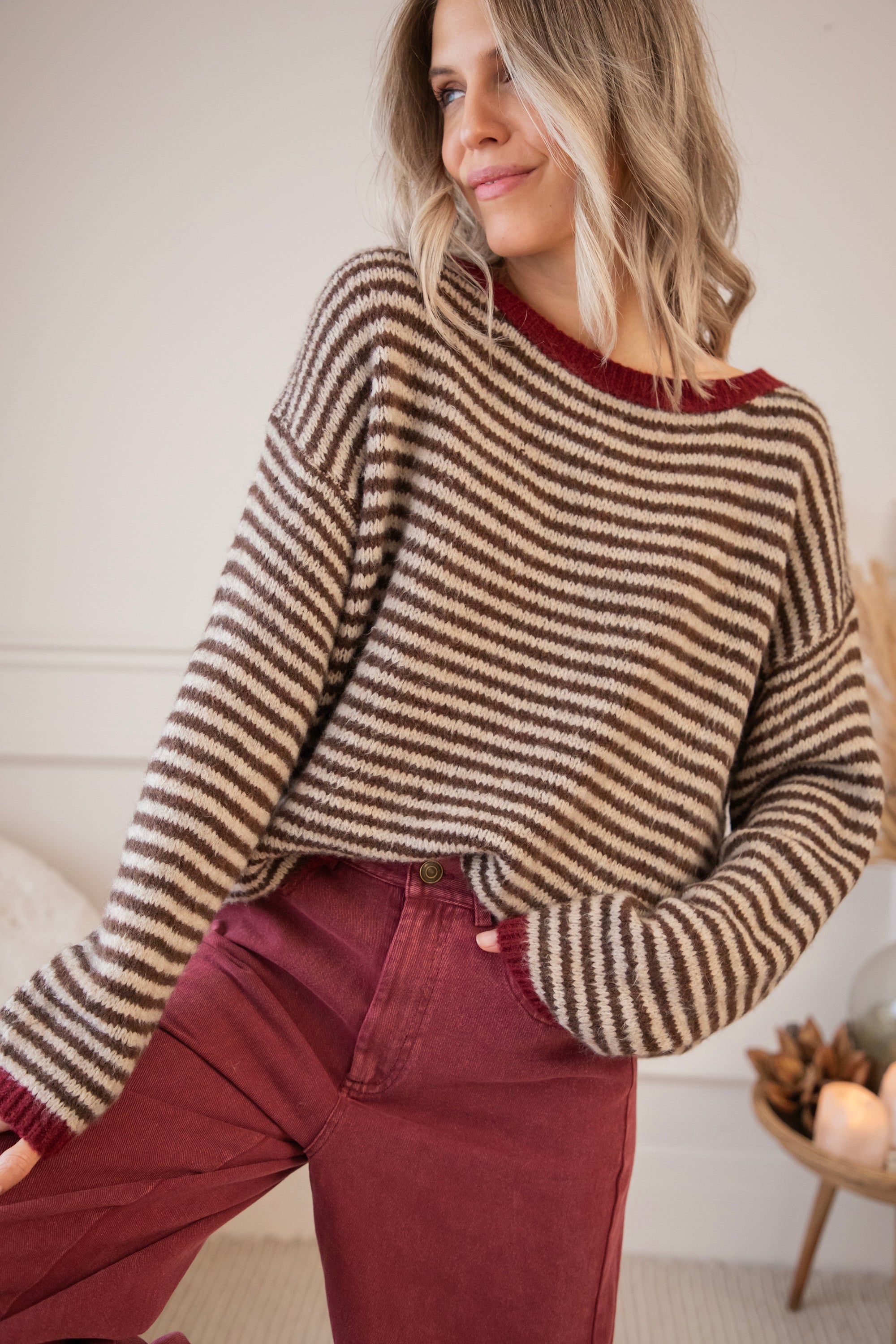 Een gestreepte trui met mijn absolute twee favoriete kleuren van het seizoen: choco & bordeaux! ❤️🤎 Hier moet je niet kiezen, hier komen ze gewoon samen zo mooi tot hun recht 🤩 De bruine strepen samen met de bordeaux randen maken er zo'n warm en holiday proof geheel van! Het wollige breiwerk en oversized fit charmeren alleen nog maar extra 🥰