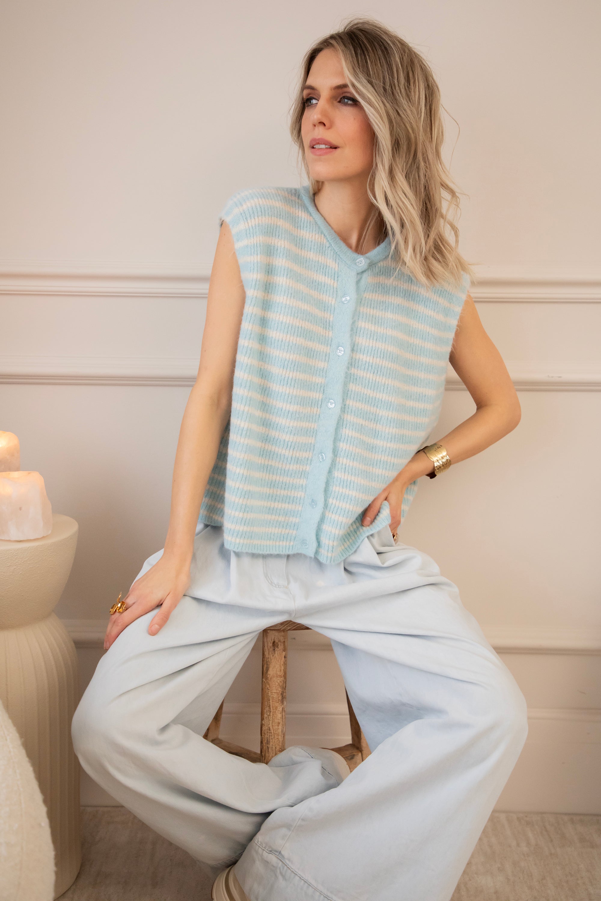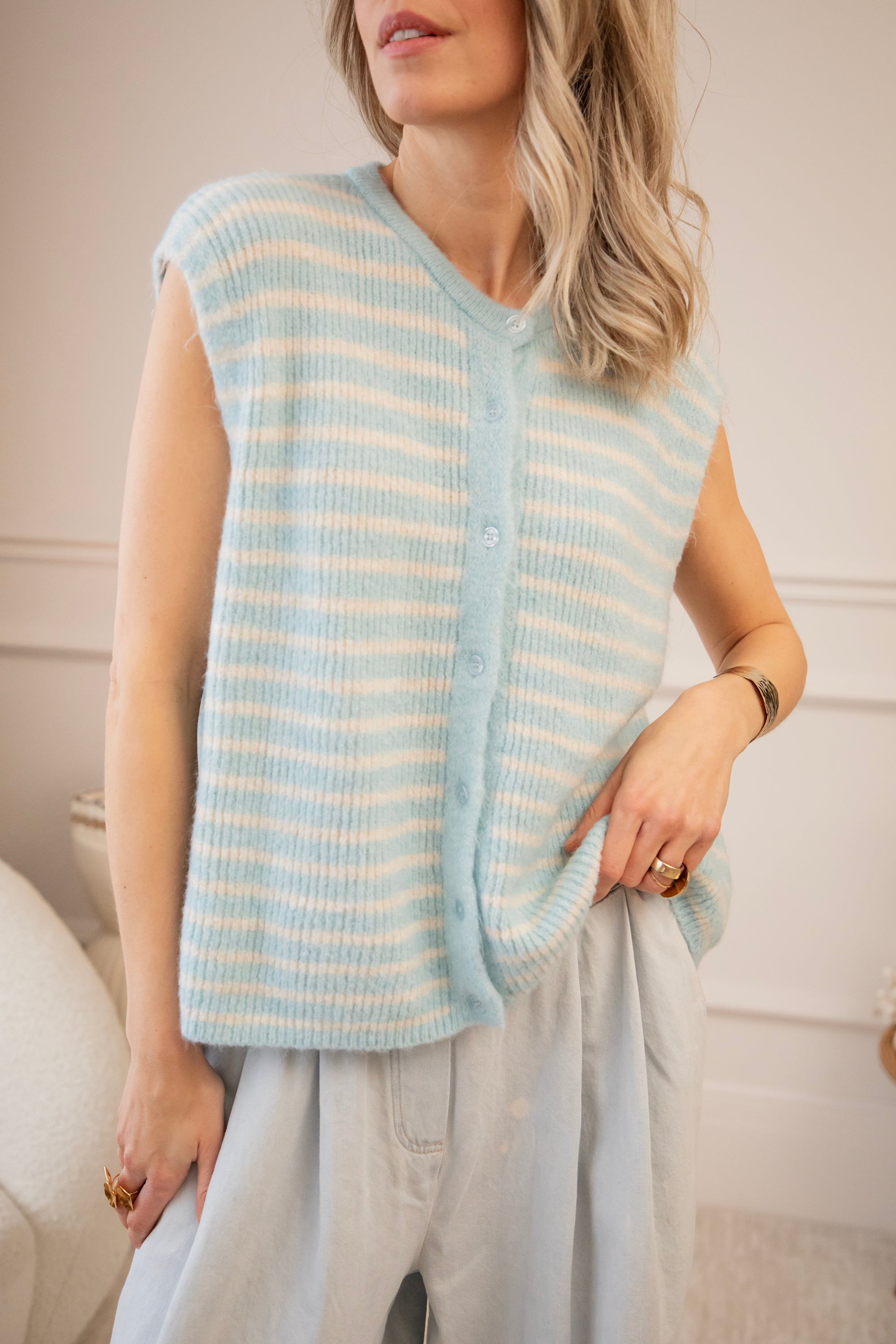 Een echte outfit booster - ons Sleeveless Stripes vestje met haar lichtblauwe en beige strepenpatroon 🤩 Zo’n stuk waar ik instant blij van word! Je draagt haar mouwloos op je favoriete jeans, perfect richting de lente. Maar net zo leuk om te combineren over een basic longsleeve of een blouse met pofmouwen. Met een mouwloos vestje kan je echt alle kanten uit, en dat speelse strepenpatroontje maakt het helemaal af 😍