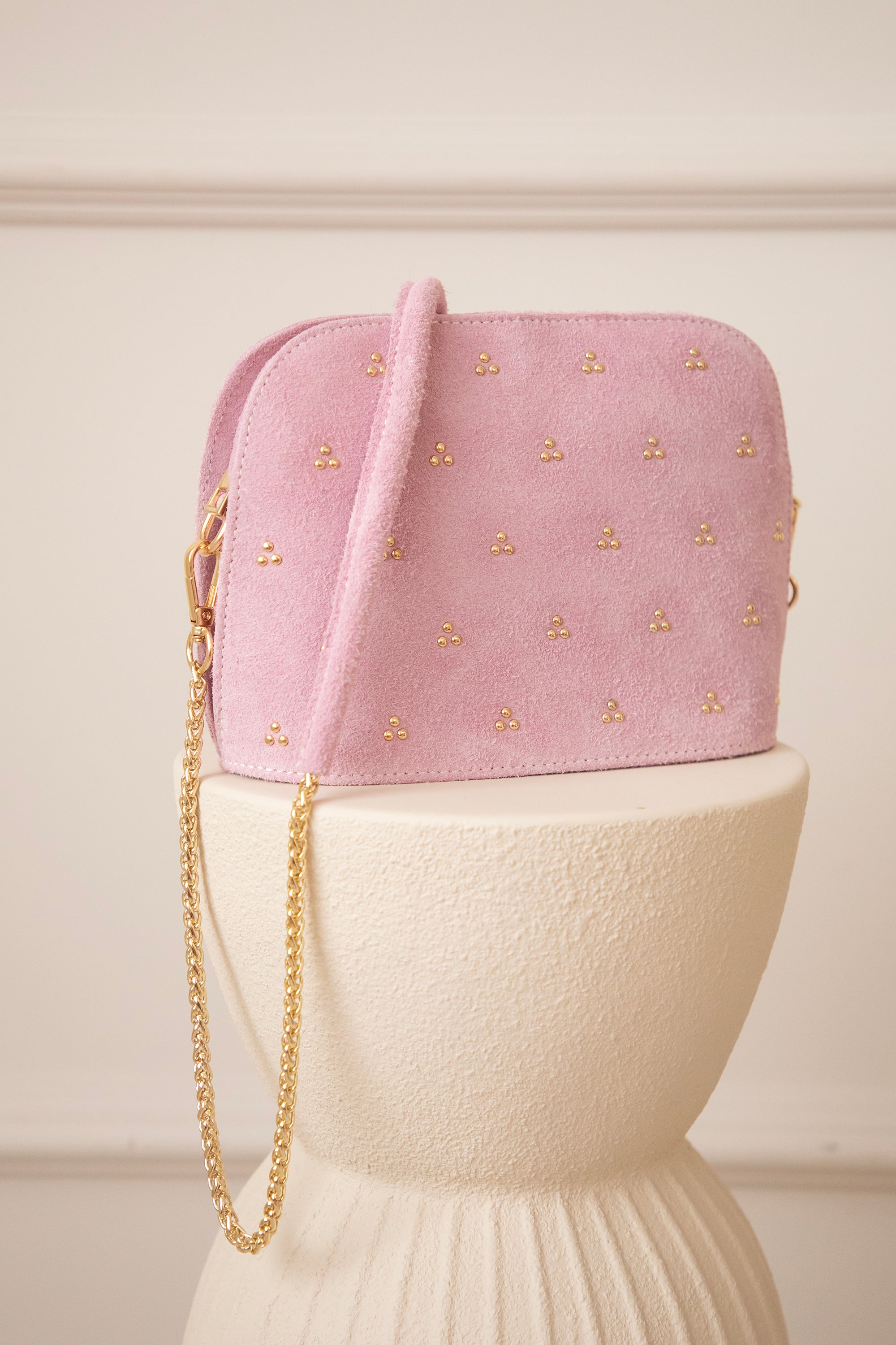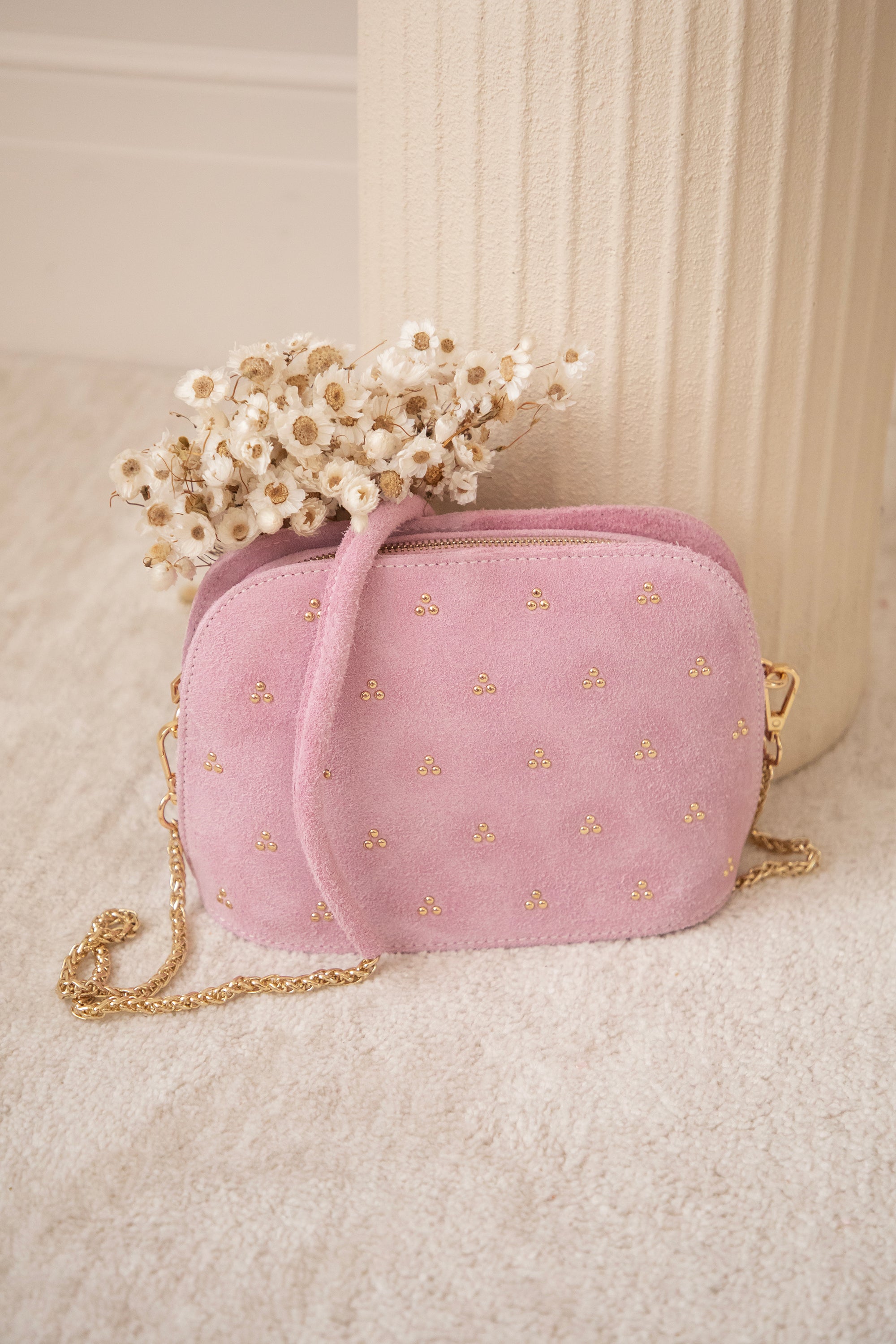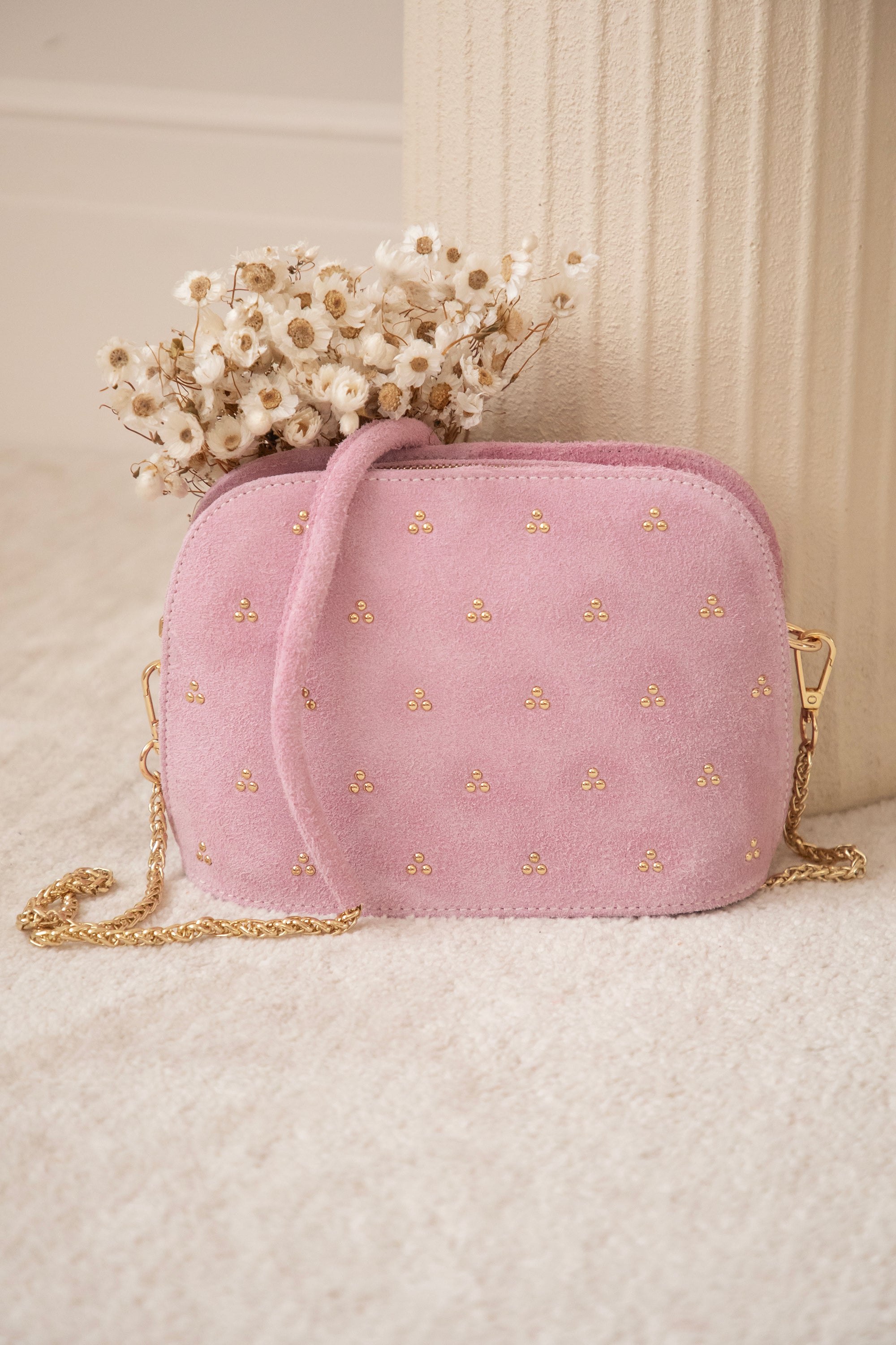 Het schouderriempje bestaat uit een gouden ketting die je indien gewenst kan afnemen en als clutch kan dragen 😊 Het handvat bestaat uit hetzelfde roze suède leer en voelt dus heel aangenaam rond je schouder 👌