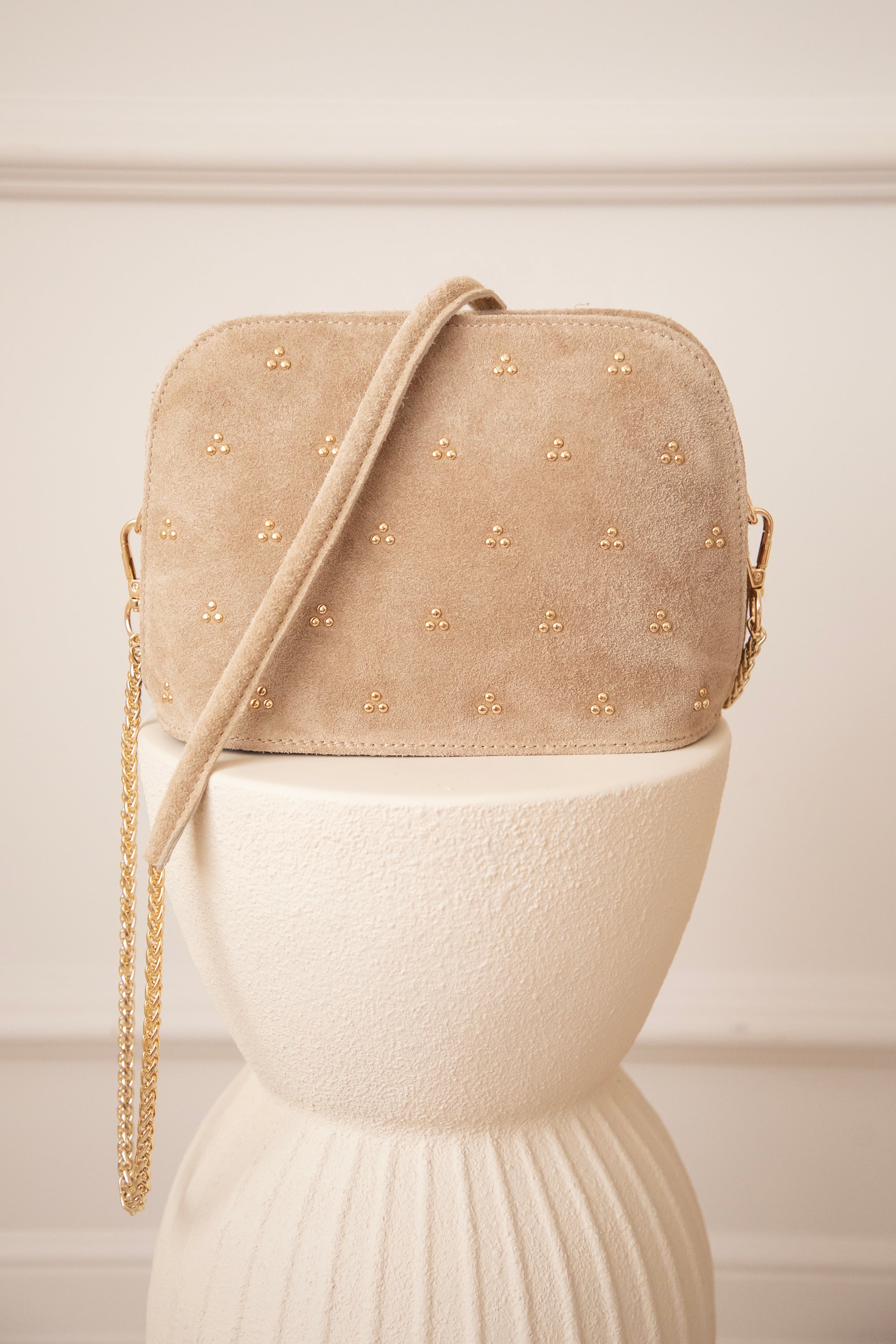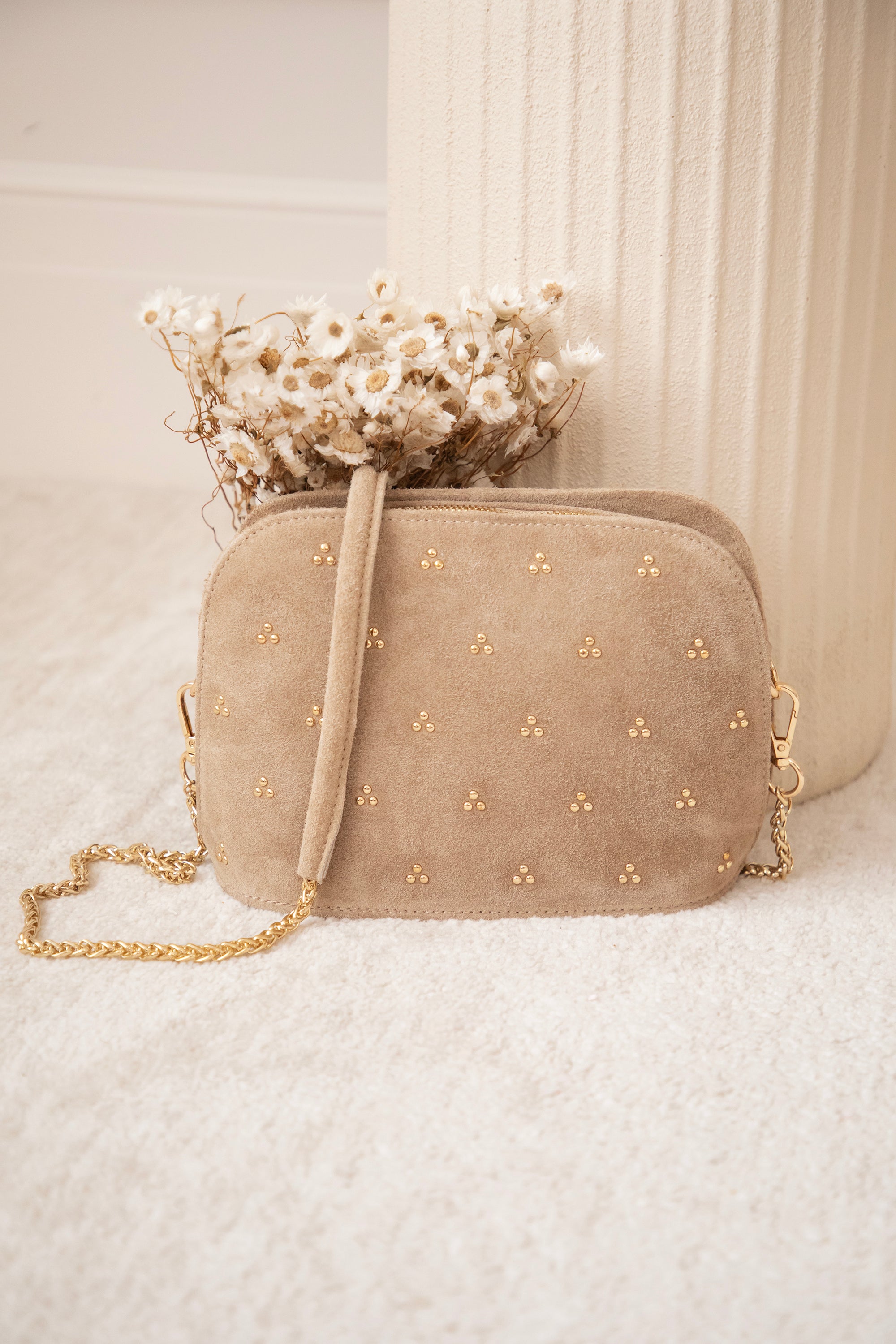 Het schouderriempje bestaat uit een gouden ketting die je indien gewenst kan afnemen en als clutch kan dragen 😊 Het handvat bestaat uit hetzelfde taupe suède leer en voelt dus heel aangenaam rond je schouder 👌