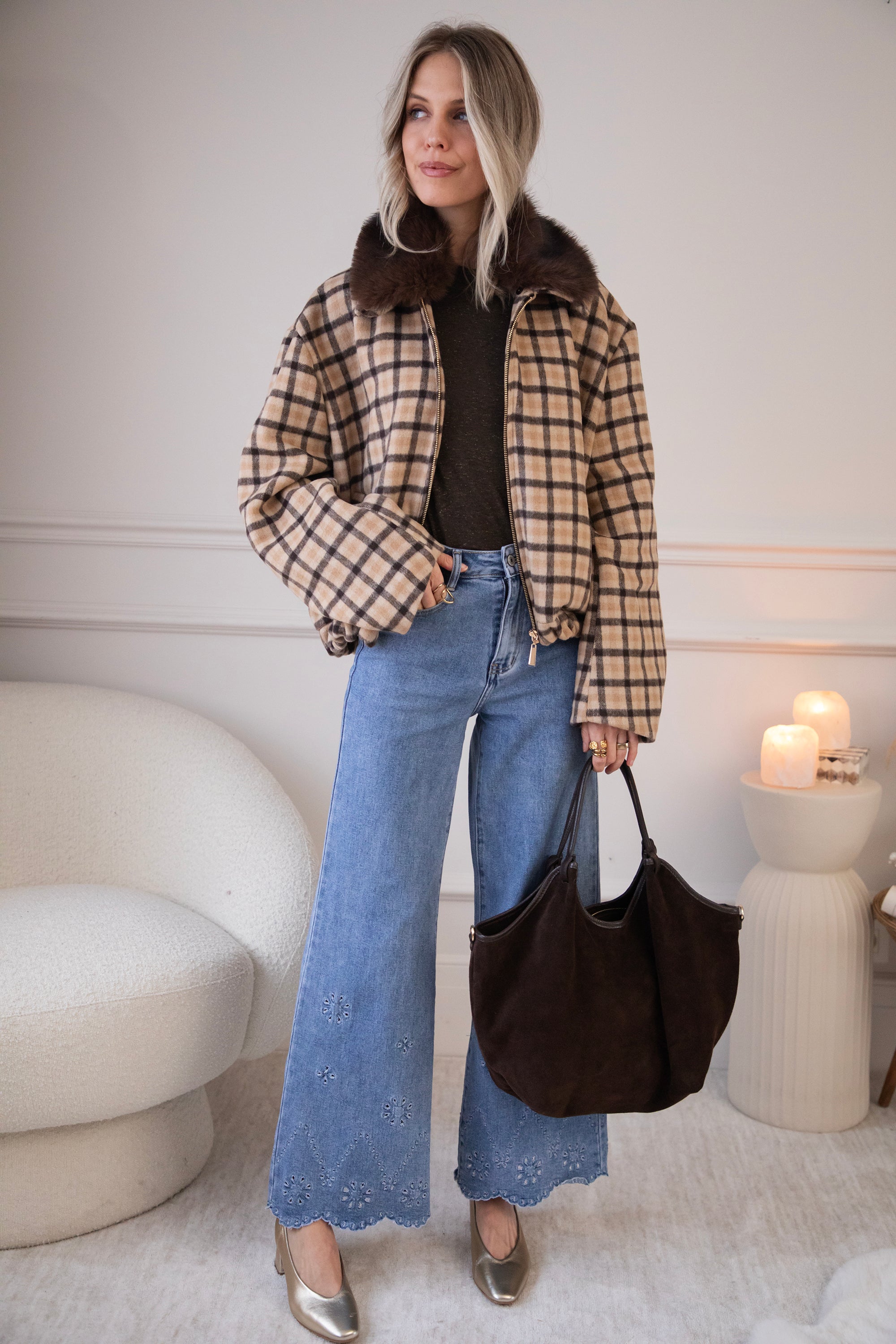 En dat bruine faux fur kraagje… hoe gezellig is dat?! 🤎 Het matcht zo mooi met de bruine strepen van het jacket. Een jasje dat meteen warmte en karakter toevoegt aan je outfit.