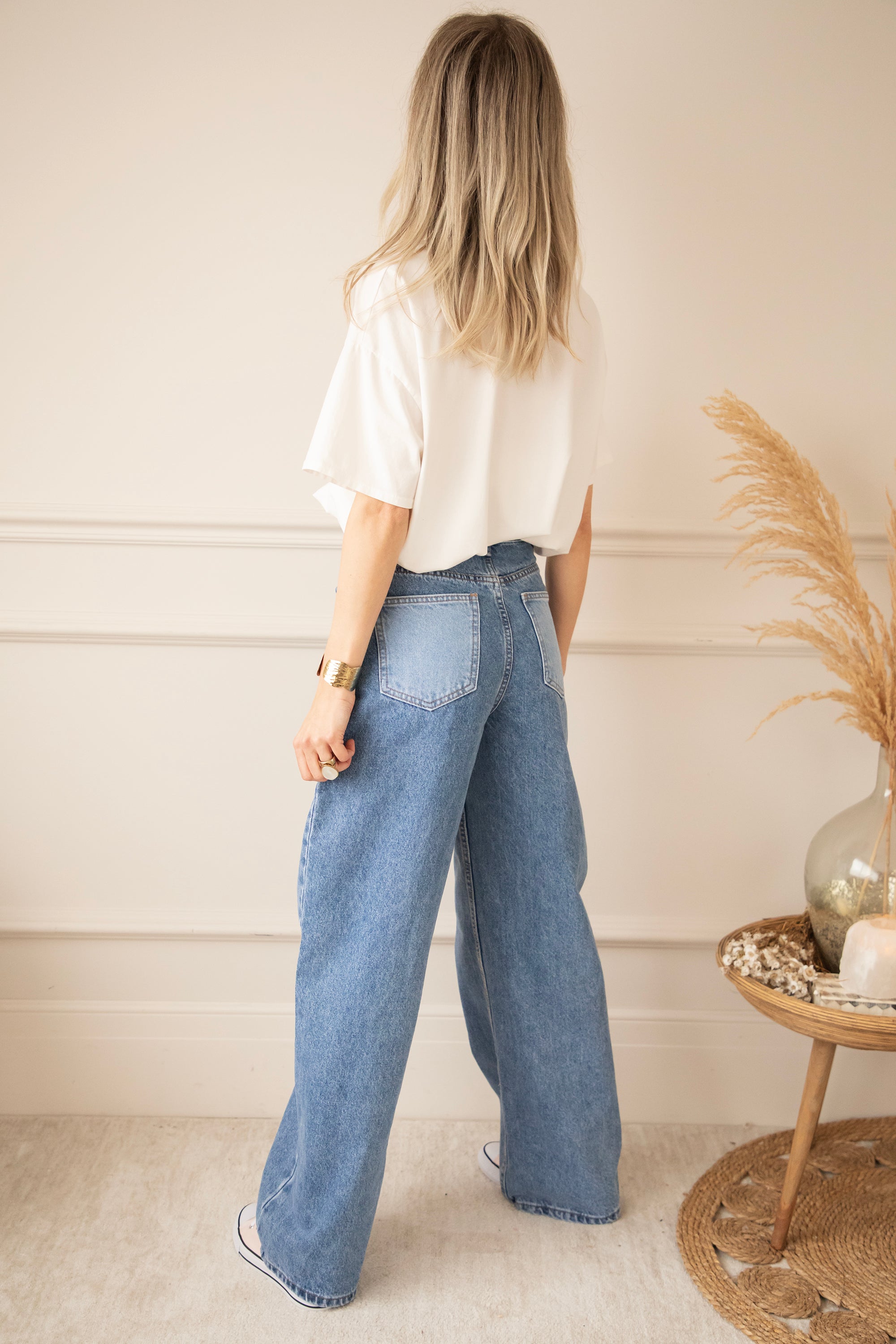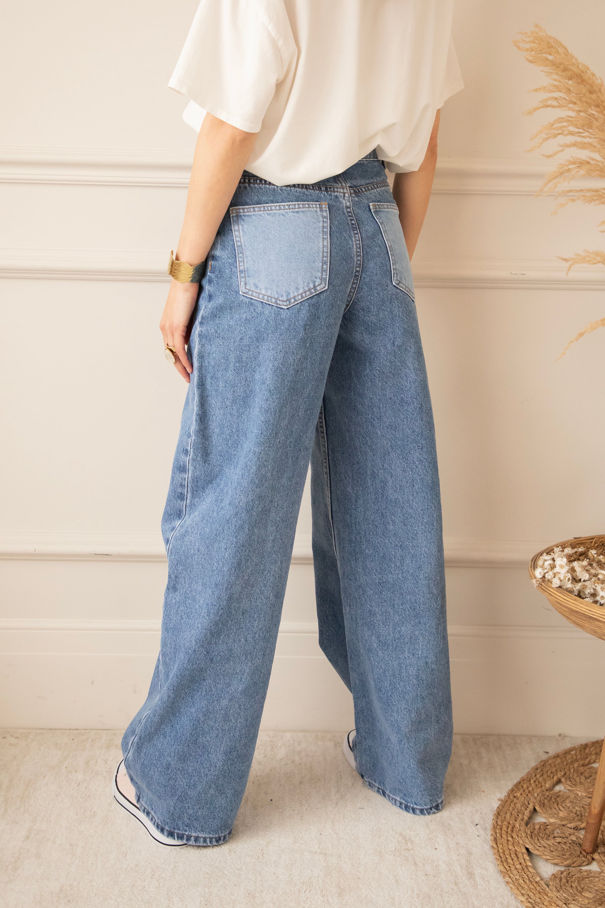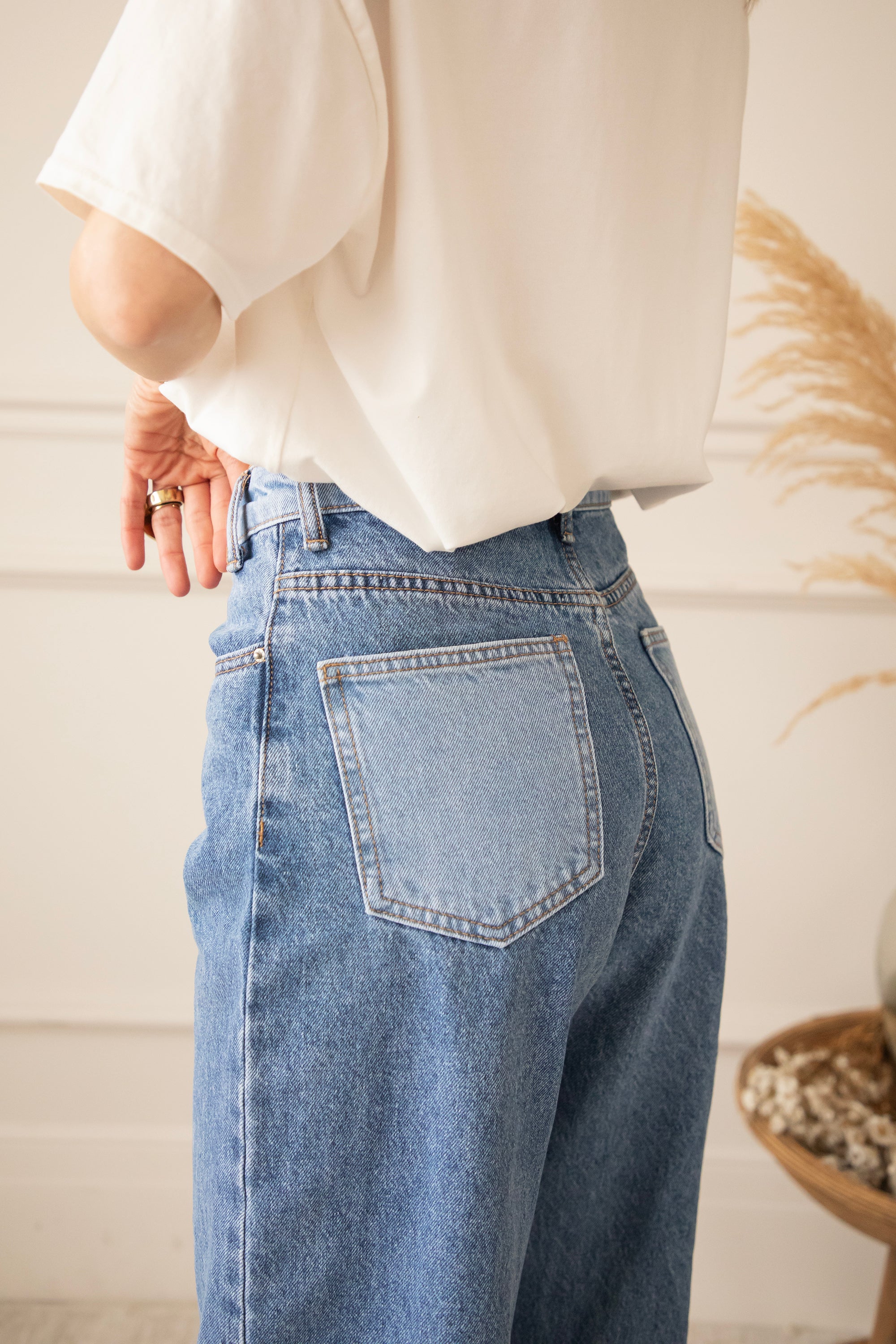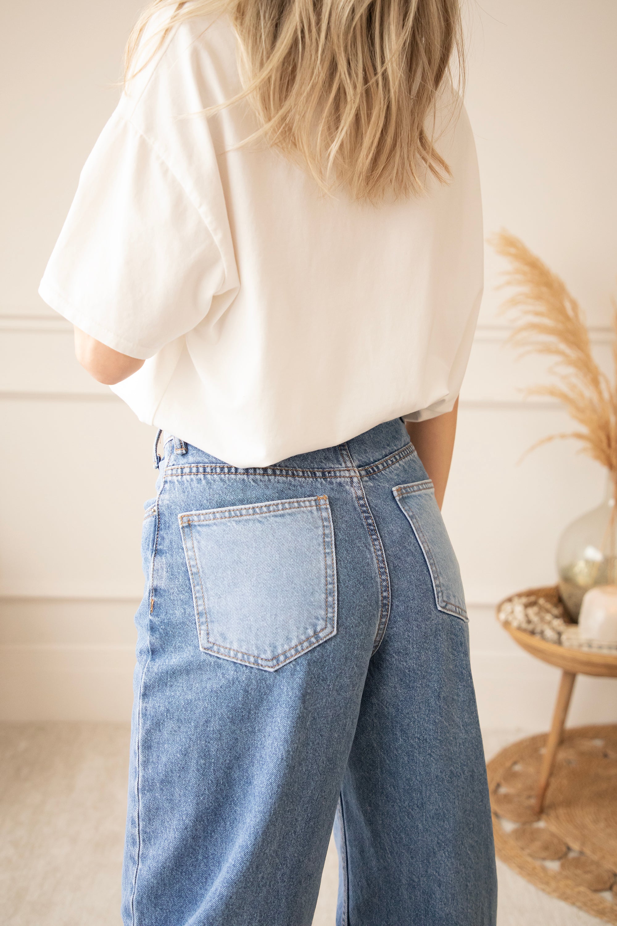 Bovenaan sluit ze mooi aan en naar onder toe lopen de pijpen wijder uit voor die effortless, vrouwelijke look. En dan die achterzakken… net een tikje lichter van kleur. Allemaal leuke details of zeg maar twists 😁