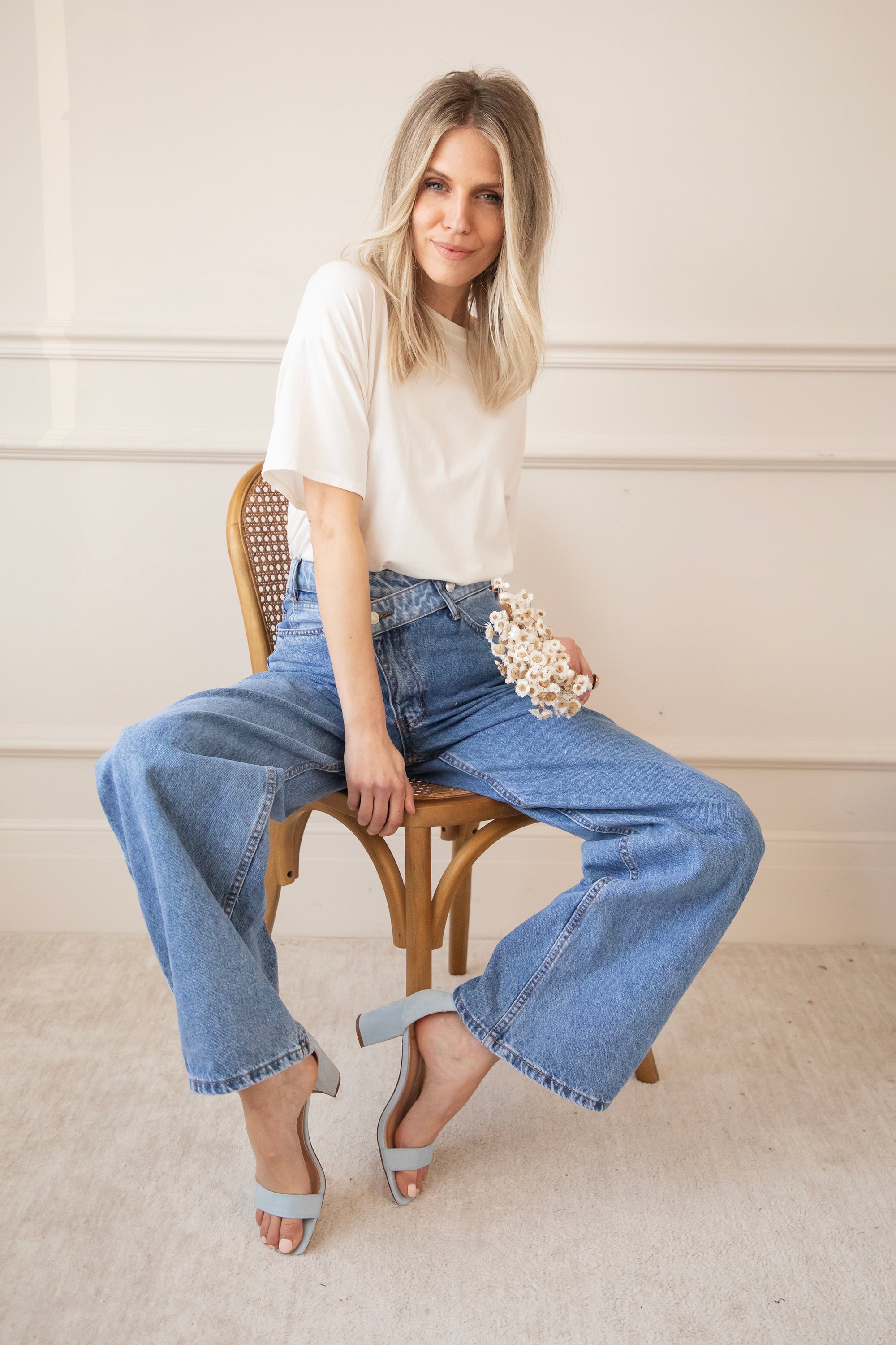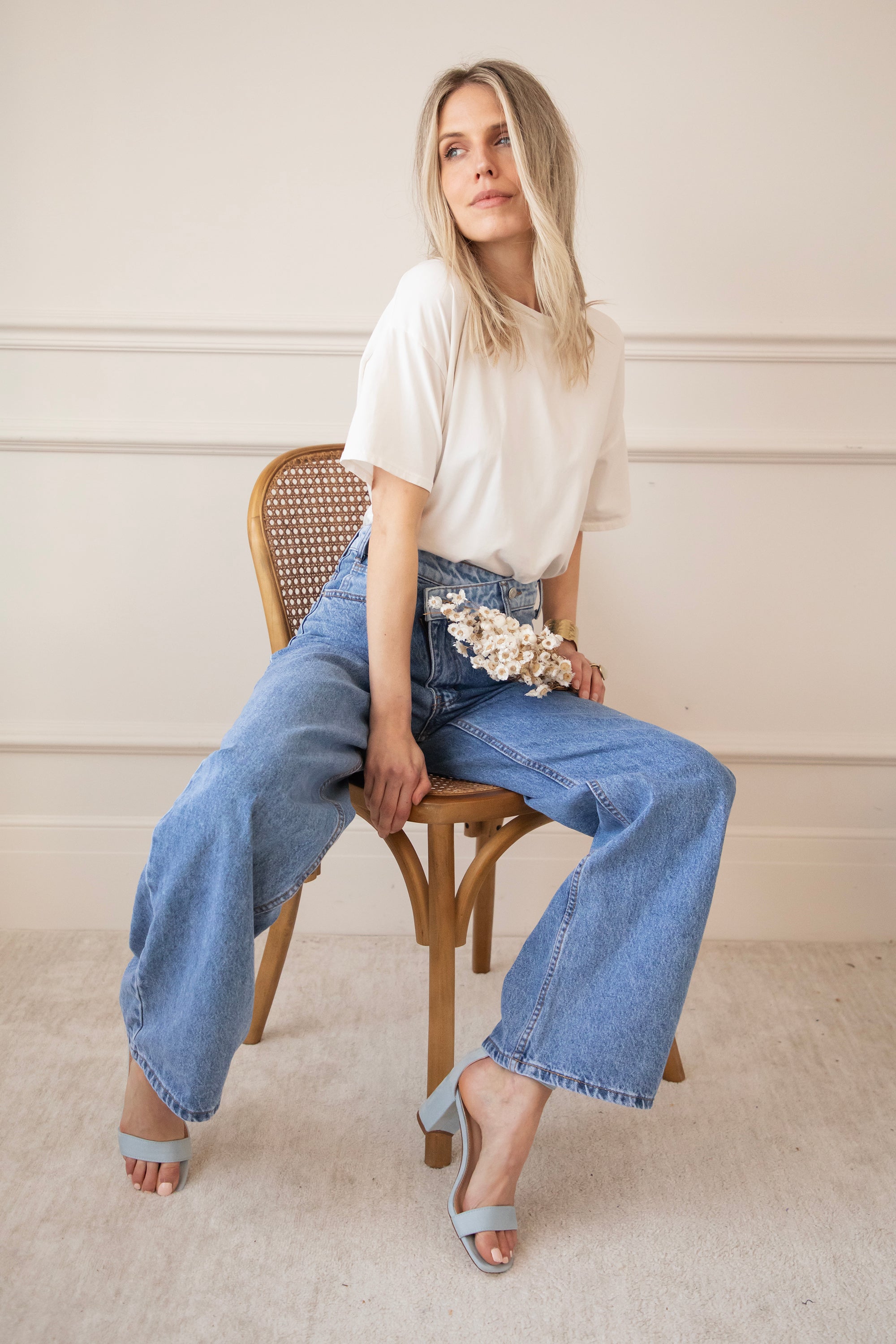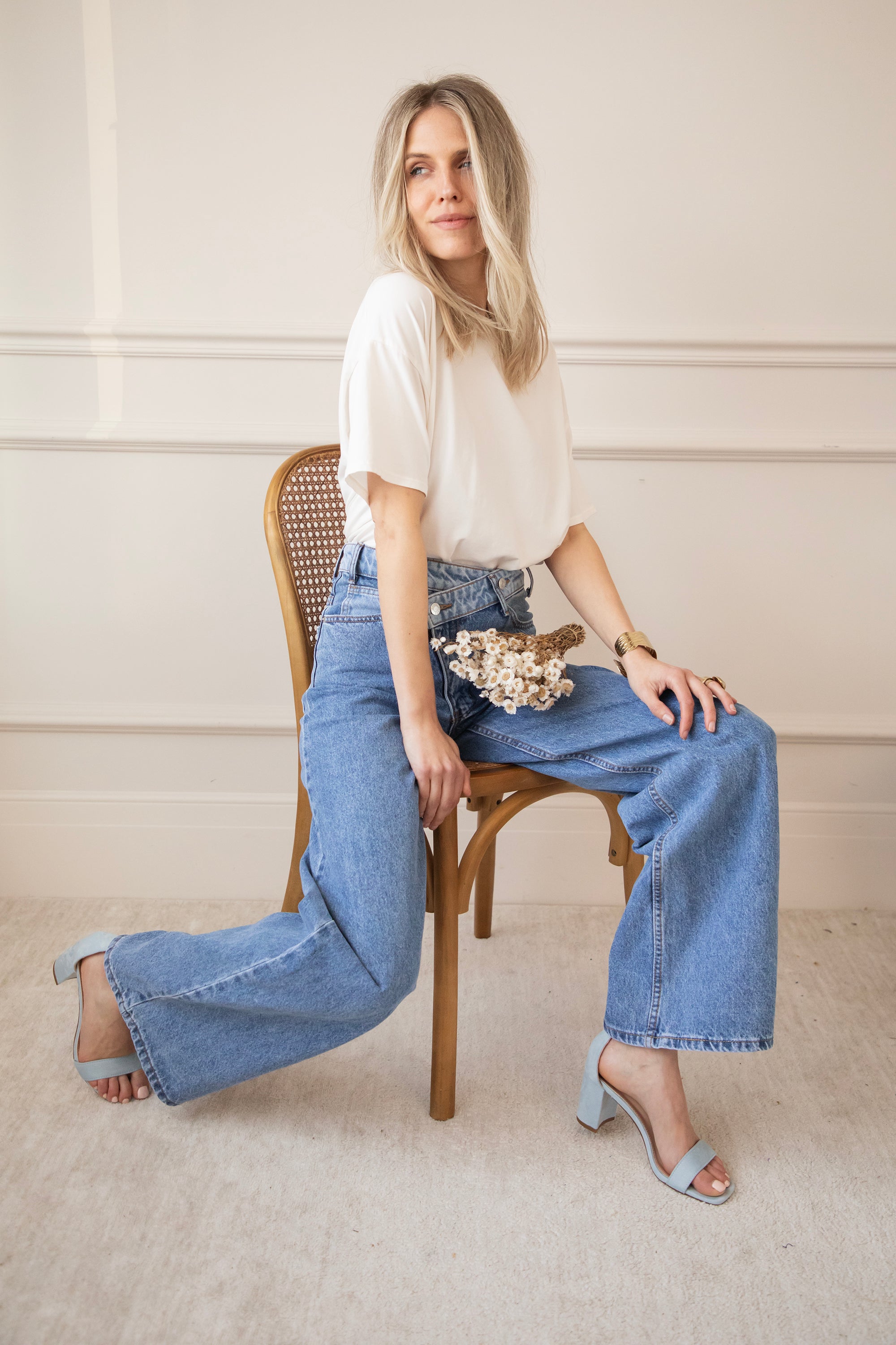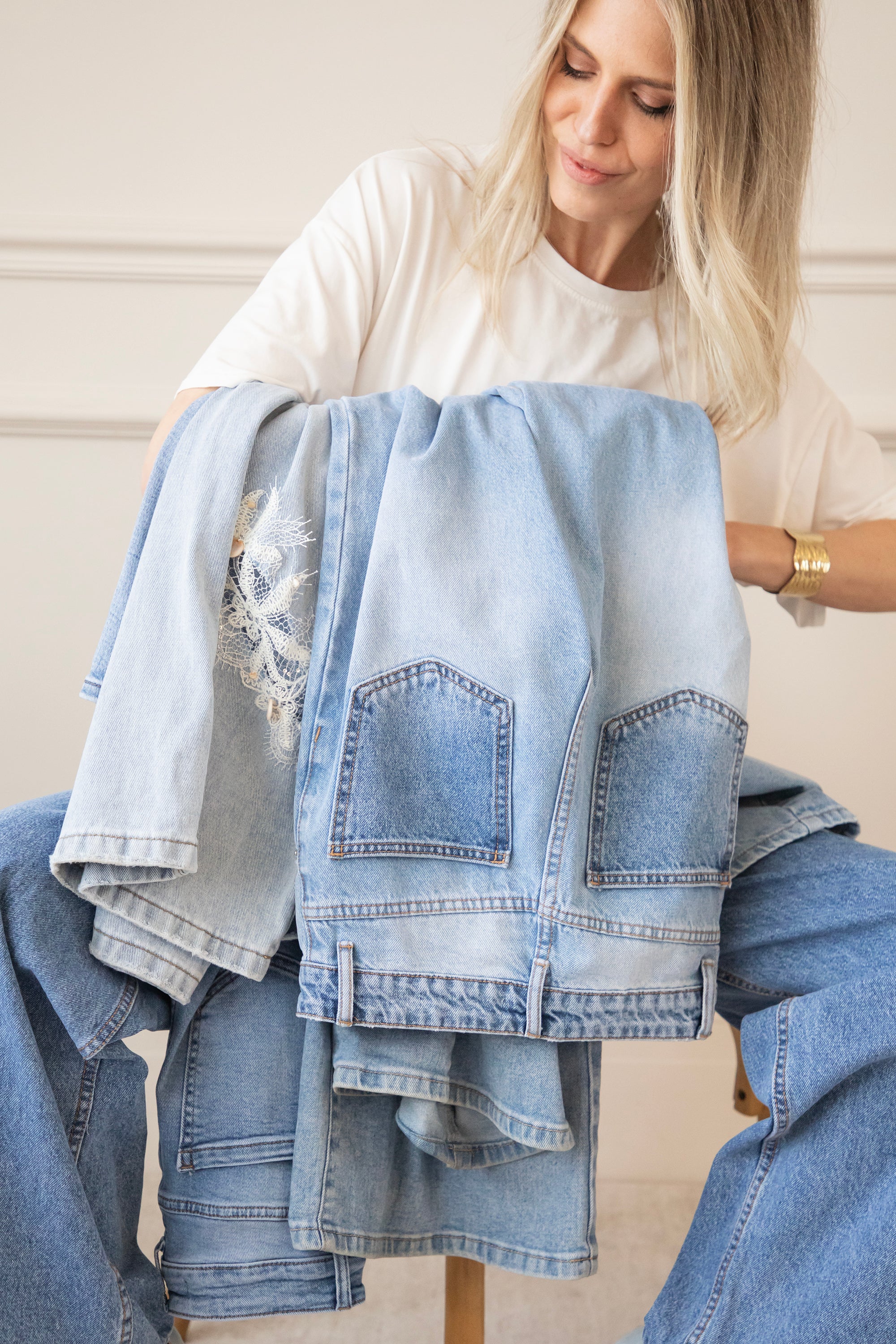 Bovenaan sluit ze mooi aan en naar onder toe lopen de pijpen wijder uit voor die effortless, vrouwelijke look. En dan die achterzakken… net een tikje lichter van kleur. Allemaal leuke details of zeg maar twists 😁