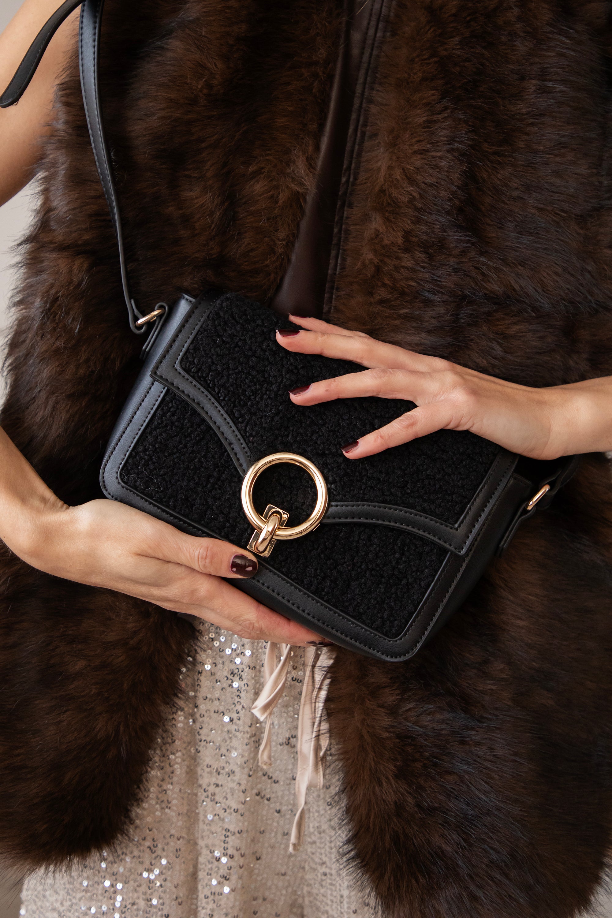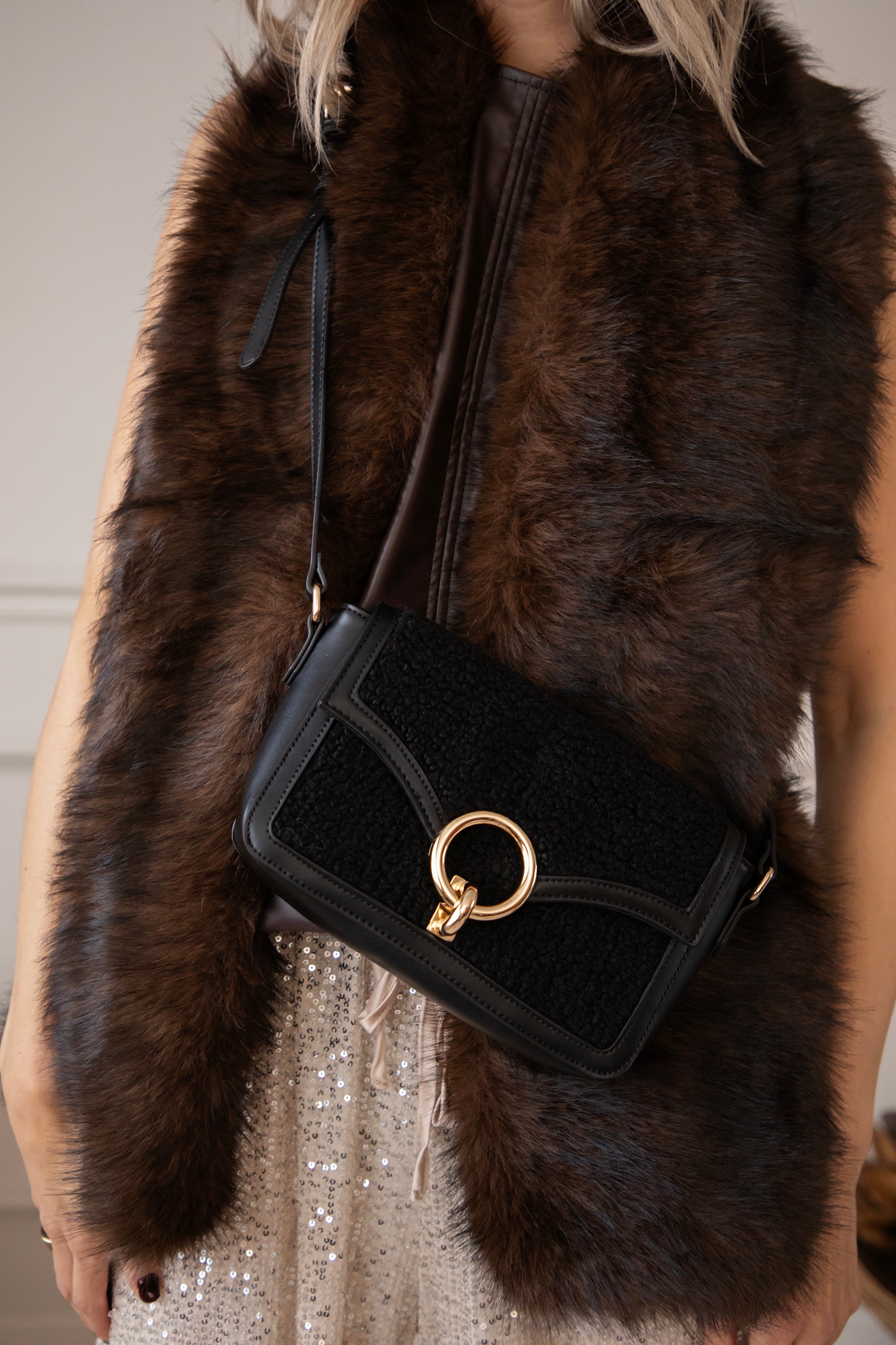 Het teddy materiaal zorgt voor die zachte, cozy uitstraling, terwijl het PU-leather net dat stoerdere, classy kantje geven. En hoe mooi is die gouden ringsluiting? Zo’n elegant detail dat het geheel meteen een beetje extra finesse geeft ✨