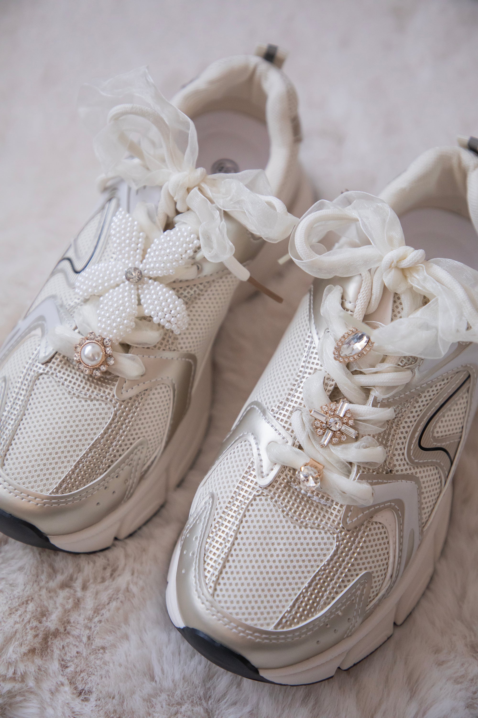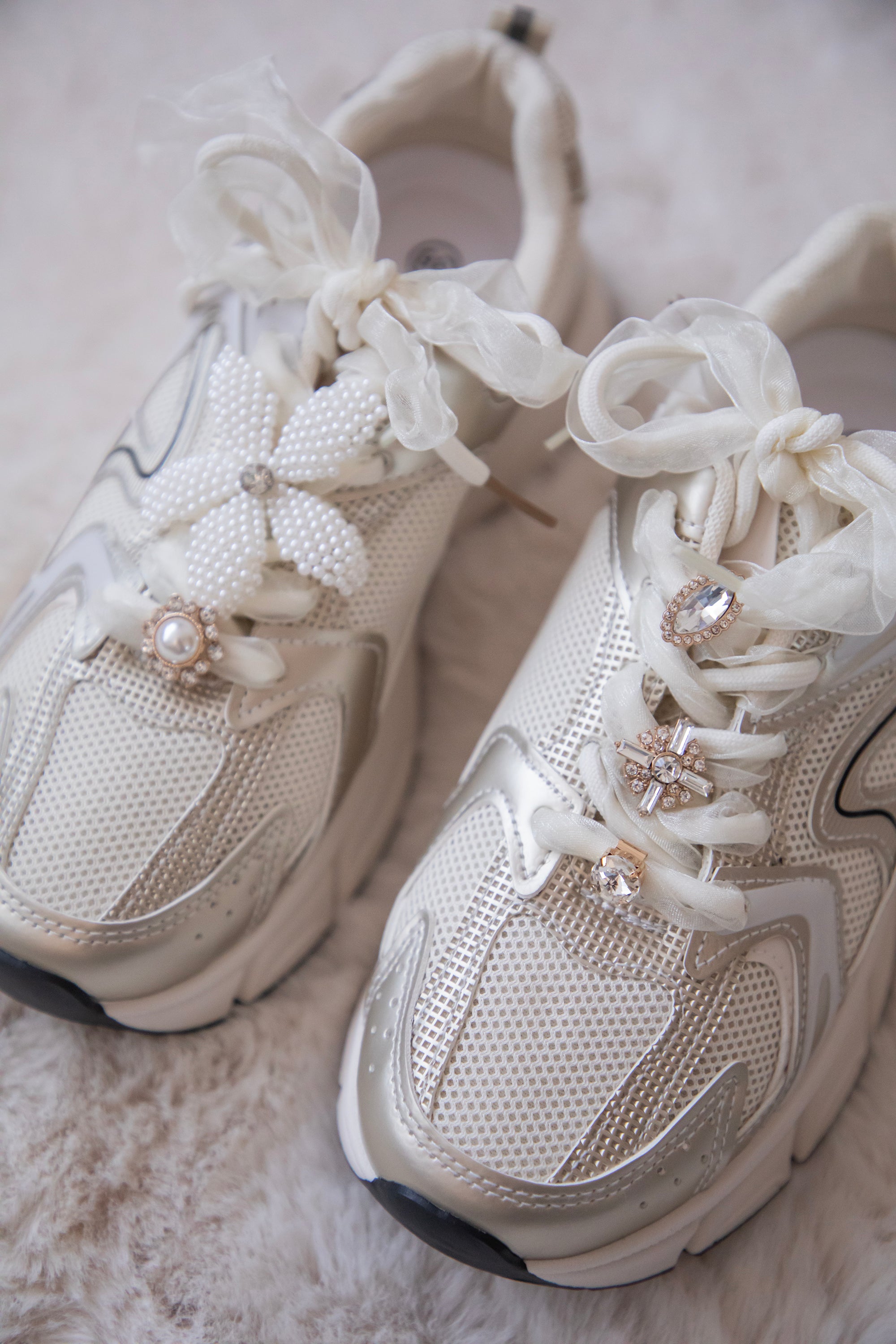 Doorheen de veters zijn verschillende details geregen: een parelbloem, een gouden diamantbloemetje met een wit pareltje middenin… zo mooi! ✨