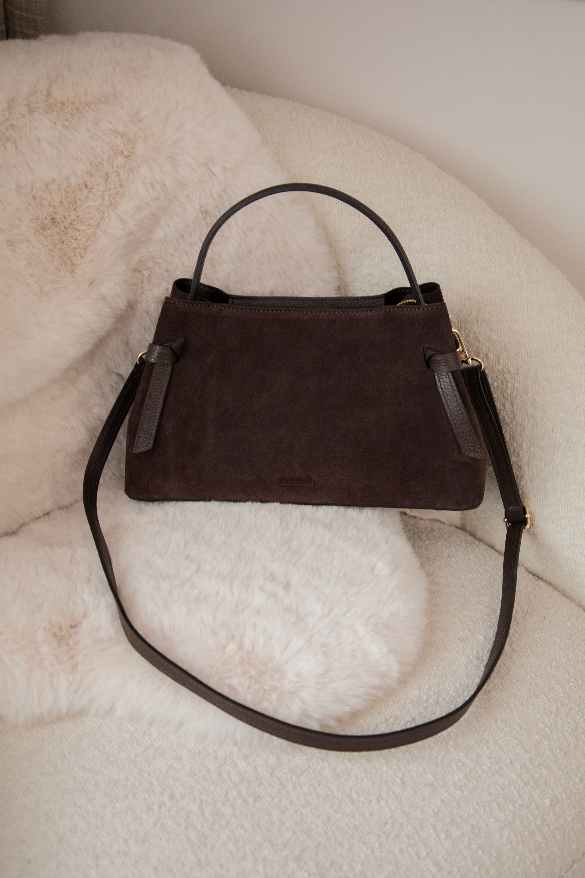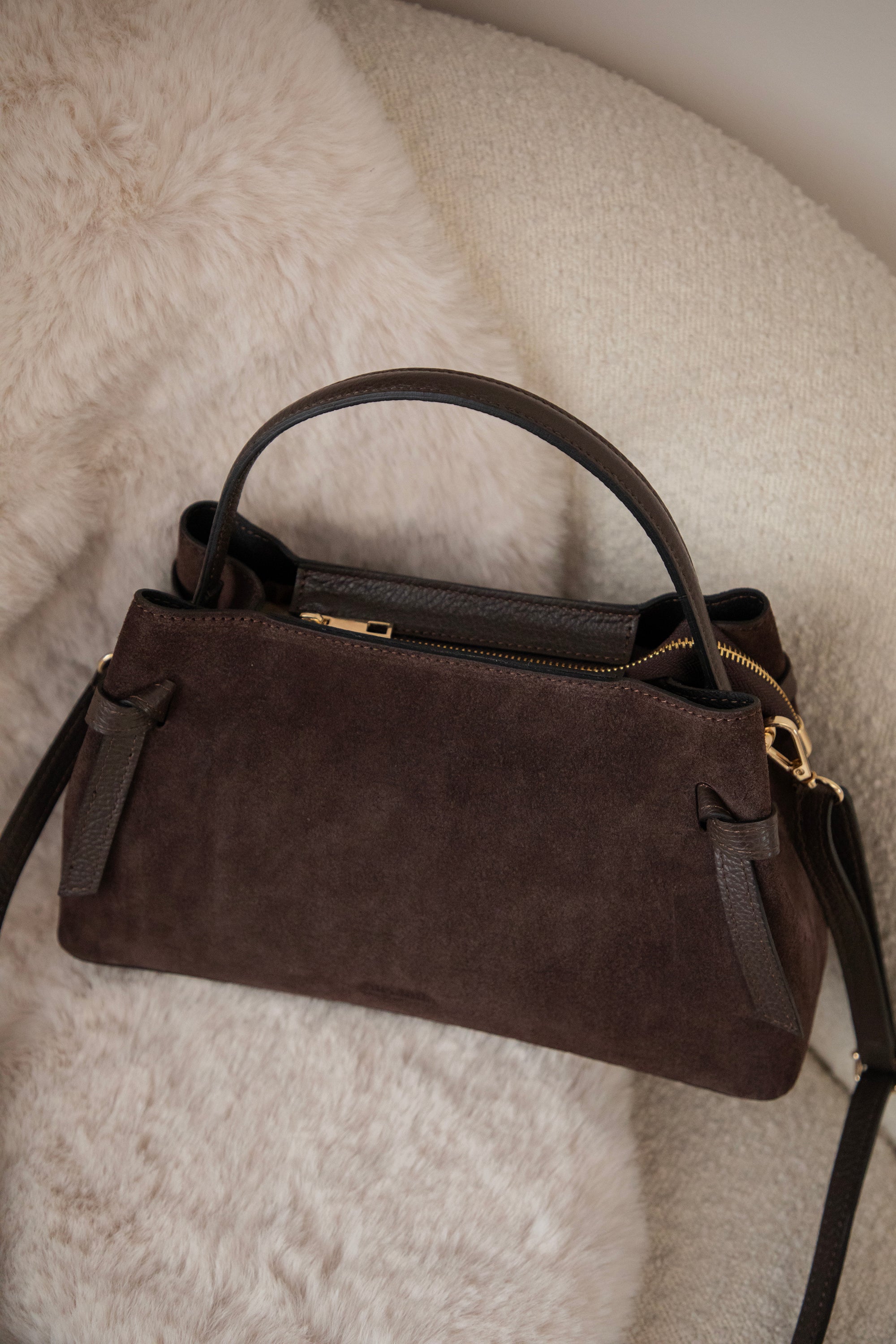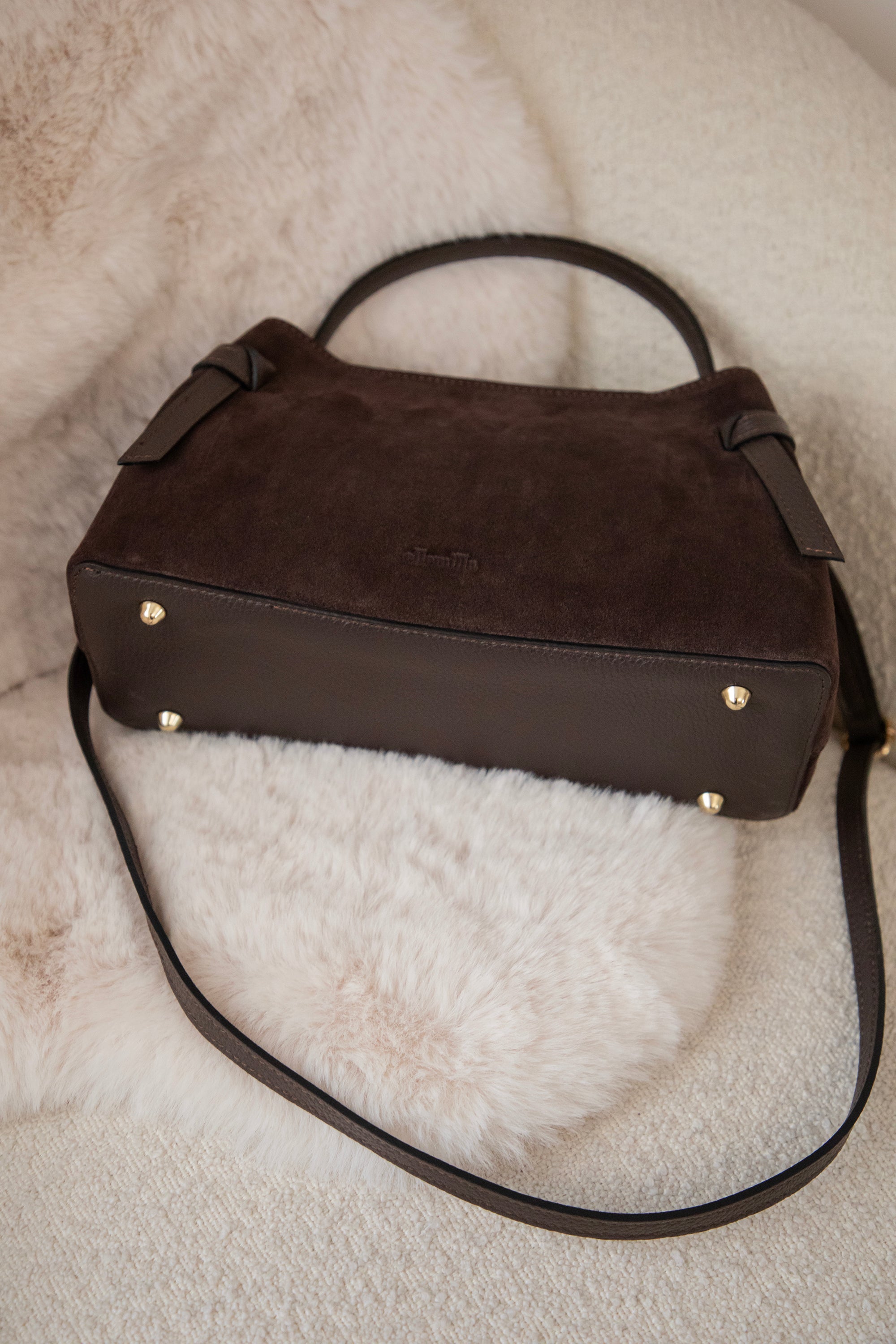 Ze is een midi model met een stevige buitenkant, afgewerkt met een combinatie van zachte suède bekleding en die mooie, gebroken leder look ✨ Onderaan staat subtiel ‘ellemilla’ in het leder gedrukt; zo’n detail waar mijn hart sneller van gaat slaan 😍 Aan de voorkant vind je een geknoopt lederen accent, wat haar die extra classy touch geeft.