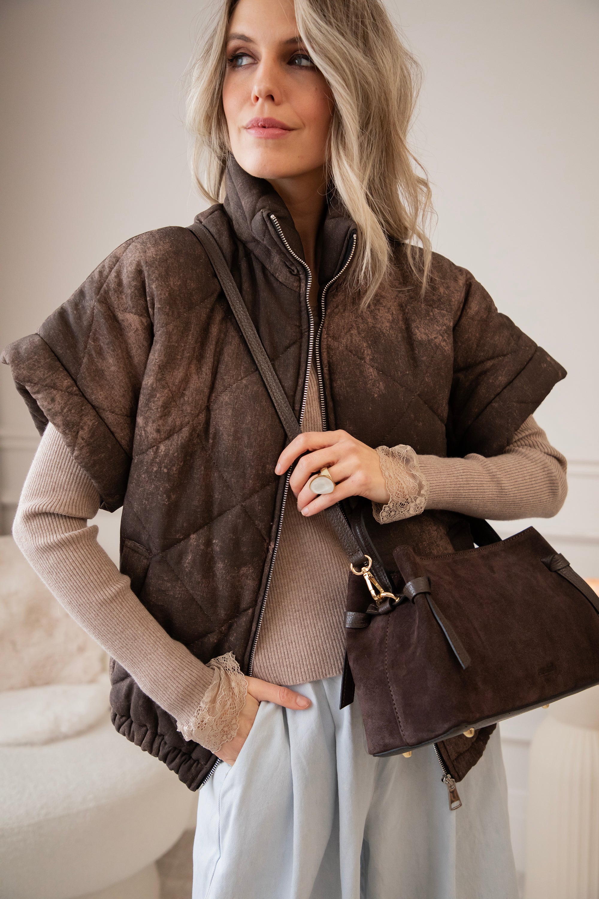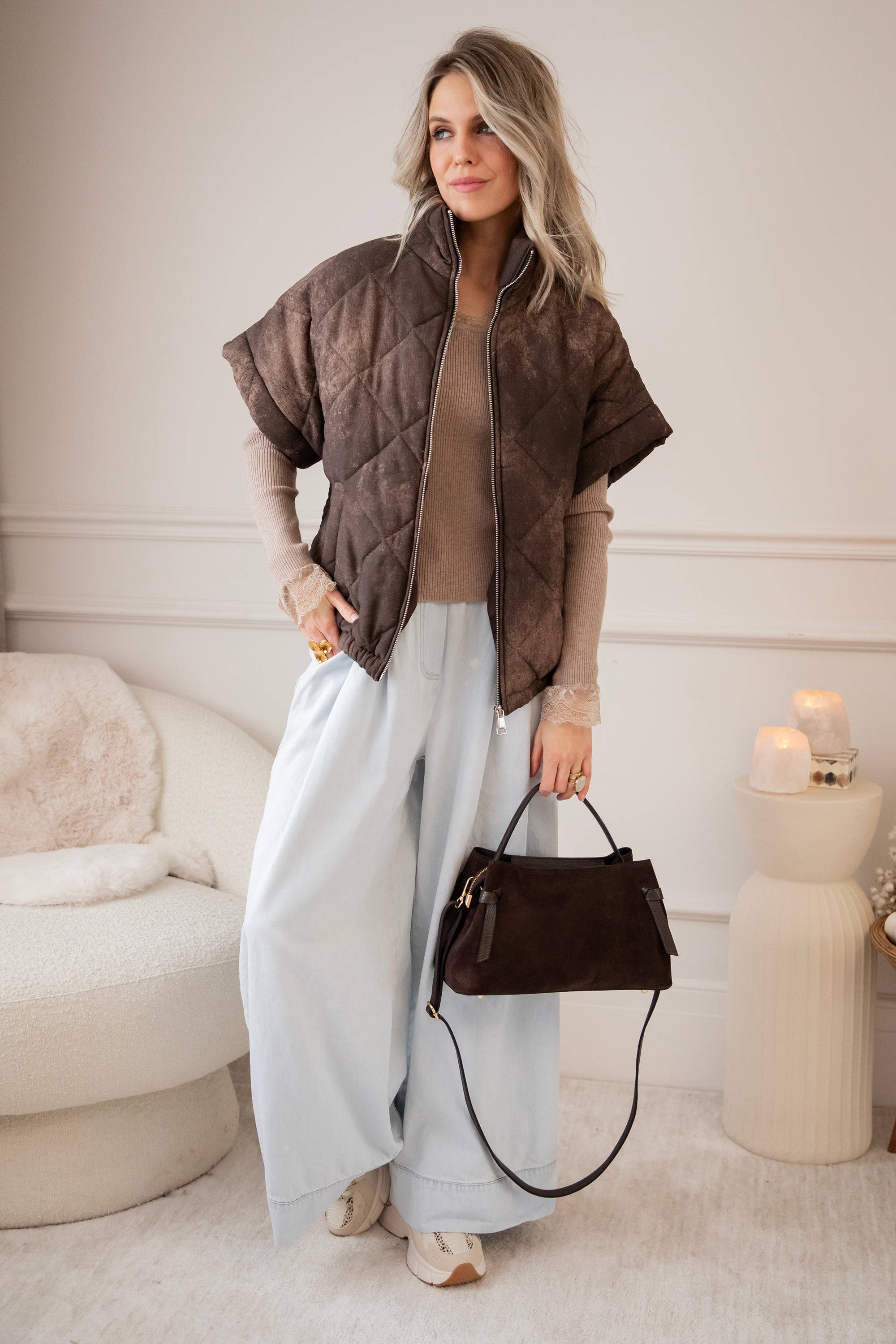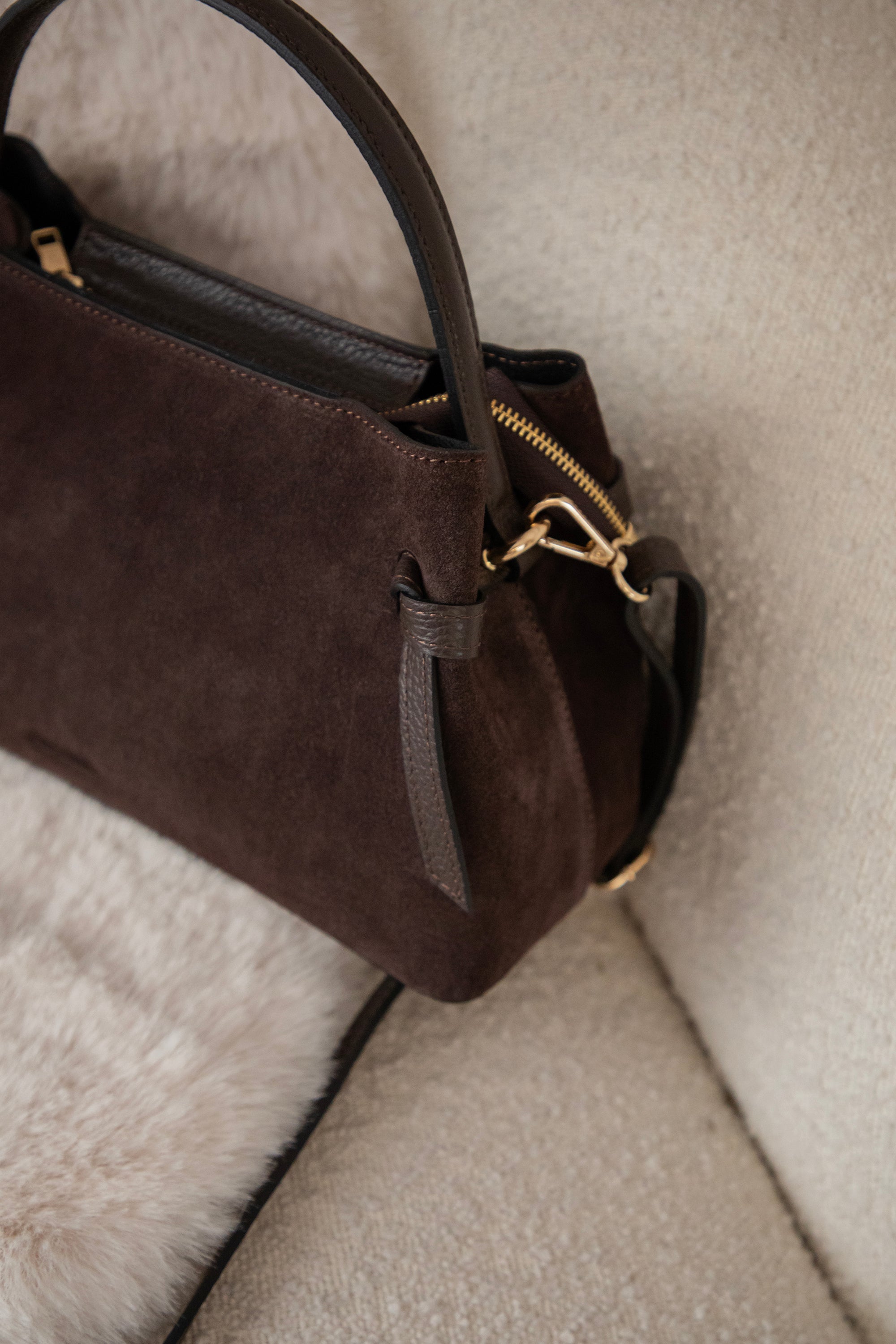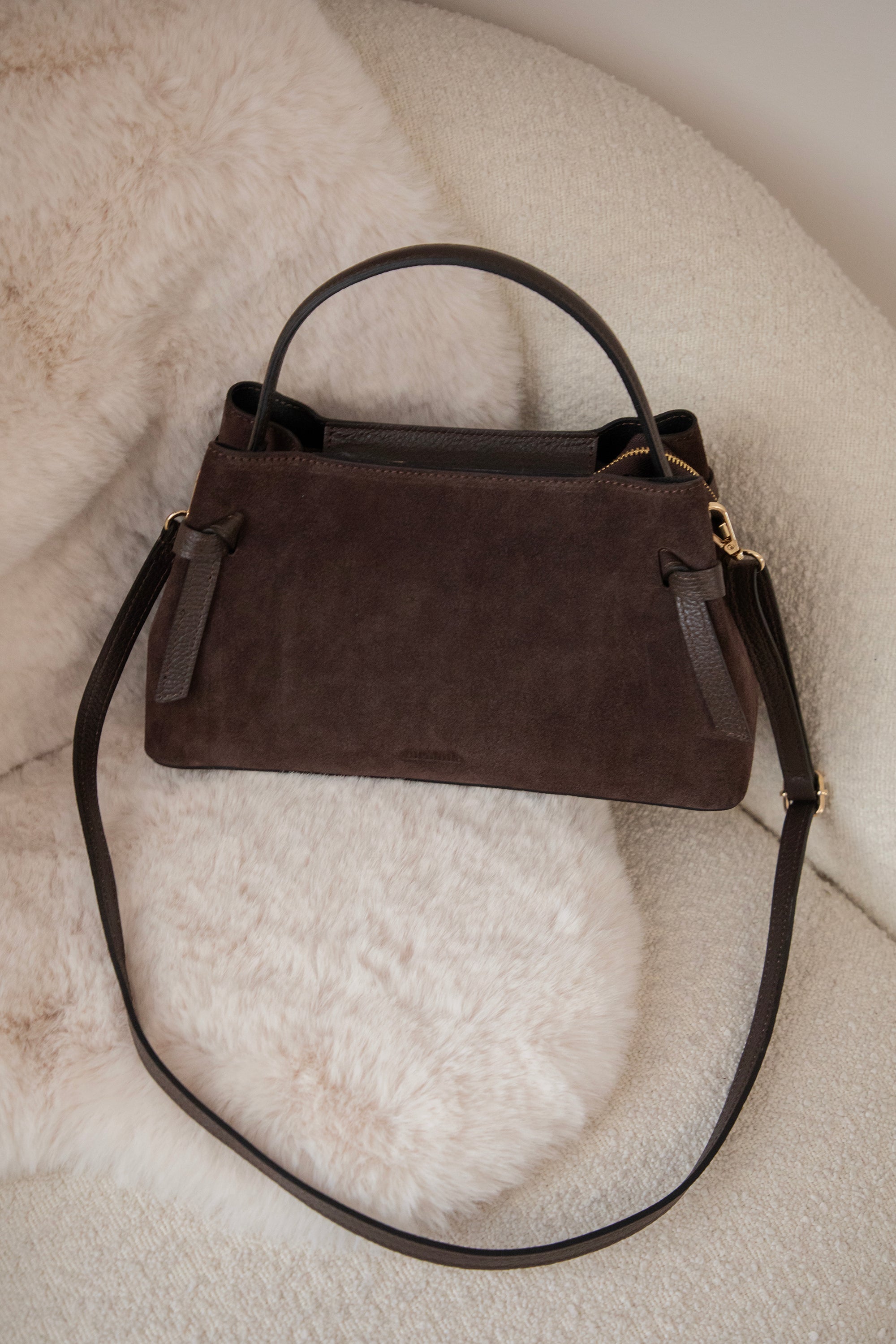 Ze is een midi model met een stevige buitenkant, afgewerkt met een combinatie van zachte suède bekleding en die mooie, gebroken leder look ✨ Onderaan staat subtiel ‘ellemilla’ in het leder gedrukt; zo’n detail waar mijn hart sneller van gaat slaan 😍 Aan de voorkant vind je een geknoopt lederen accent, wat haar die extra classy touch geeft.