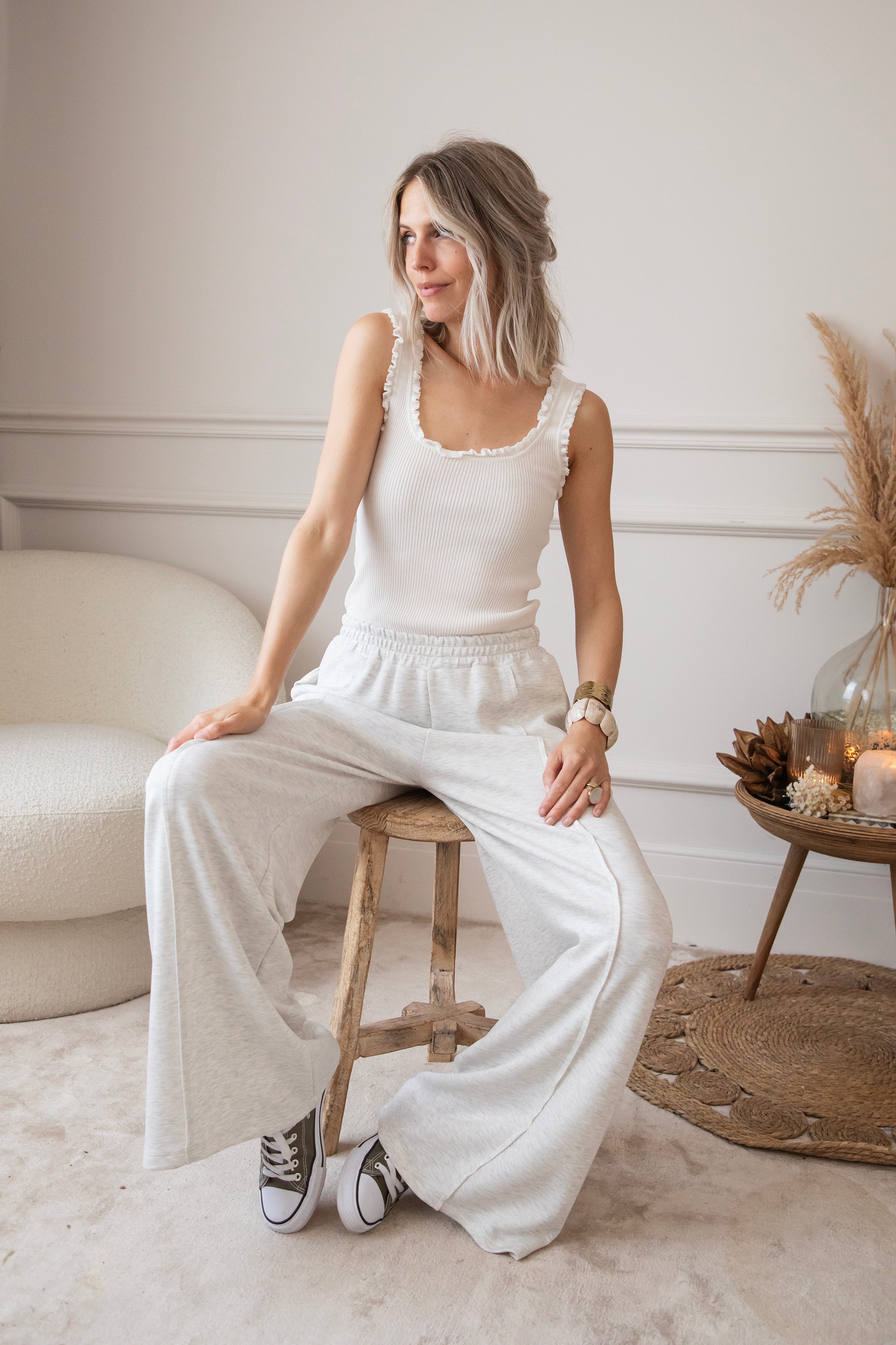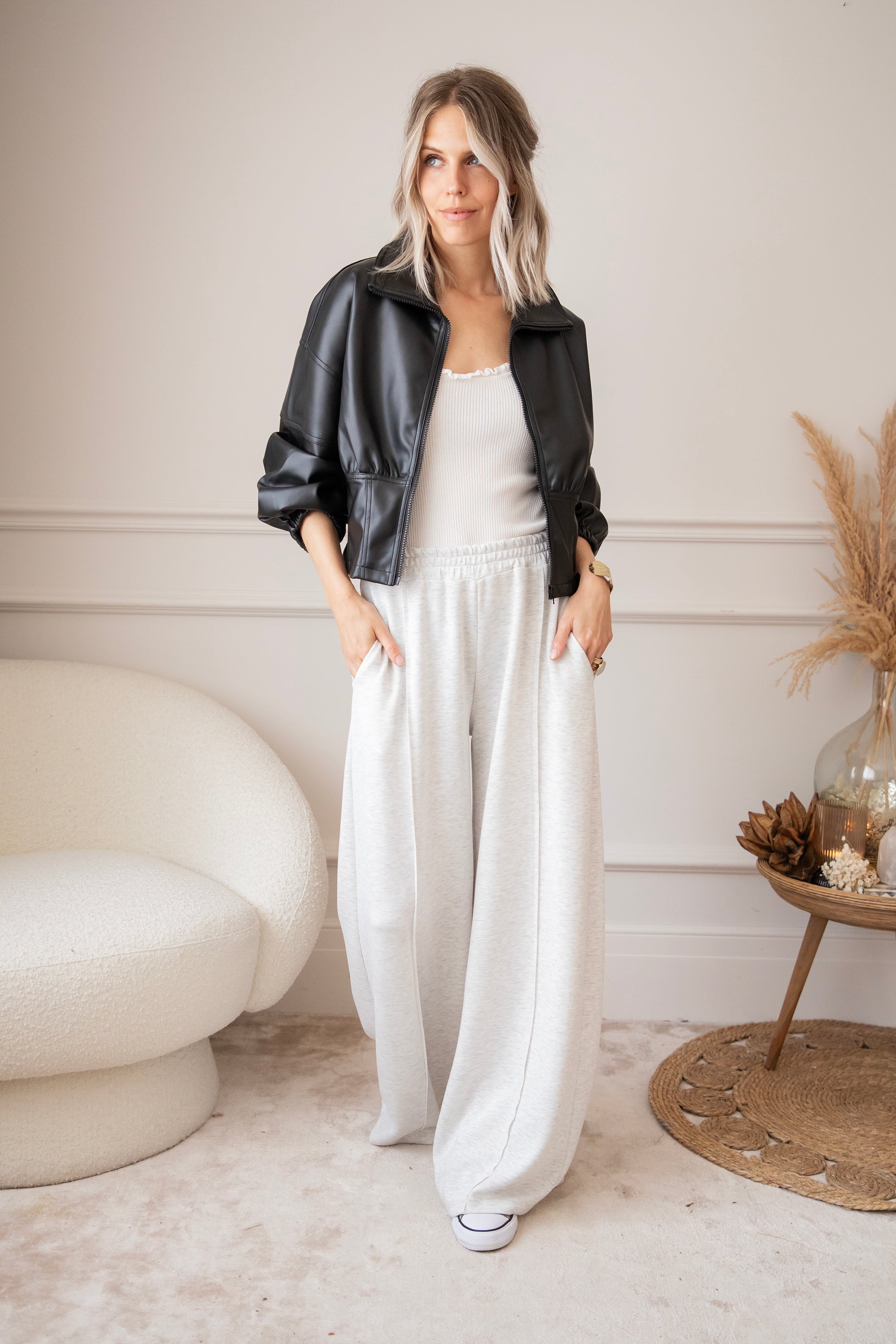 De stof is een zachte sweaterstof met een classy twist: extra lang, wijd vallend Ă©n voorzien van een elegante reliĂ«flijn in het midden van de pijpen. Die subtiele afwerking geeft meteen een verfijnde touch. En⊠ja hoor, zakken zijn er ook đ