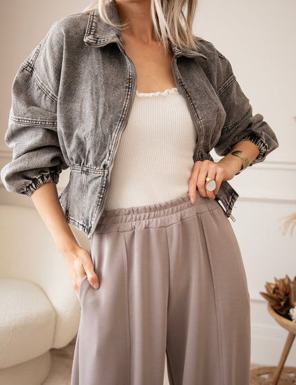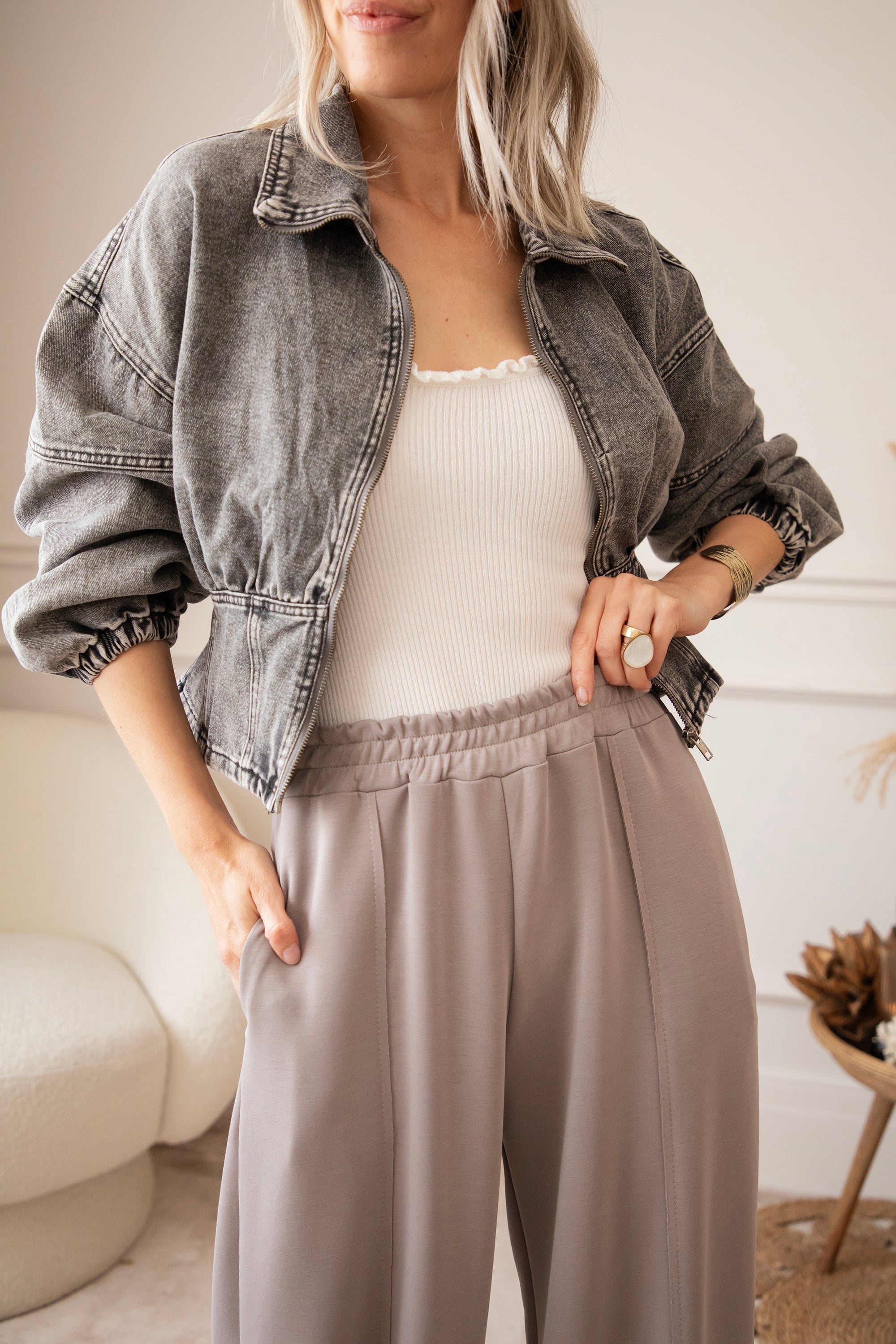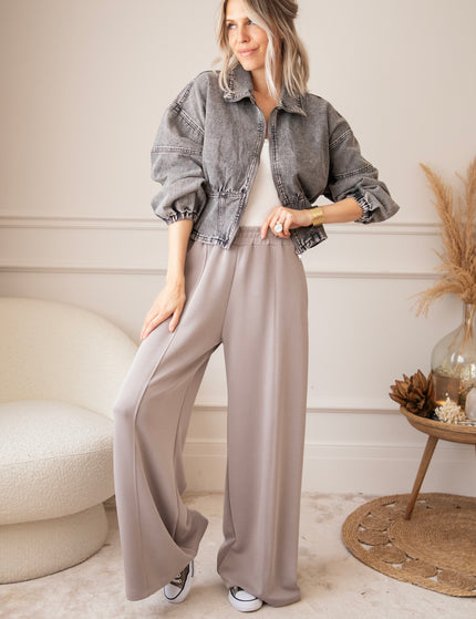 De stof is een zachte sweaterstof met een classy twist: extra lang, wijd vallend Ă©n voorzien van een elegante reliĂ«flijn in het midden van de pijpen. Die subtiele afwerking geeft meteen een verfijnde touch. En⊠ja hoor, zakken zijn er ook đ