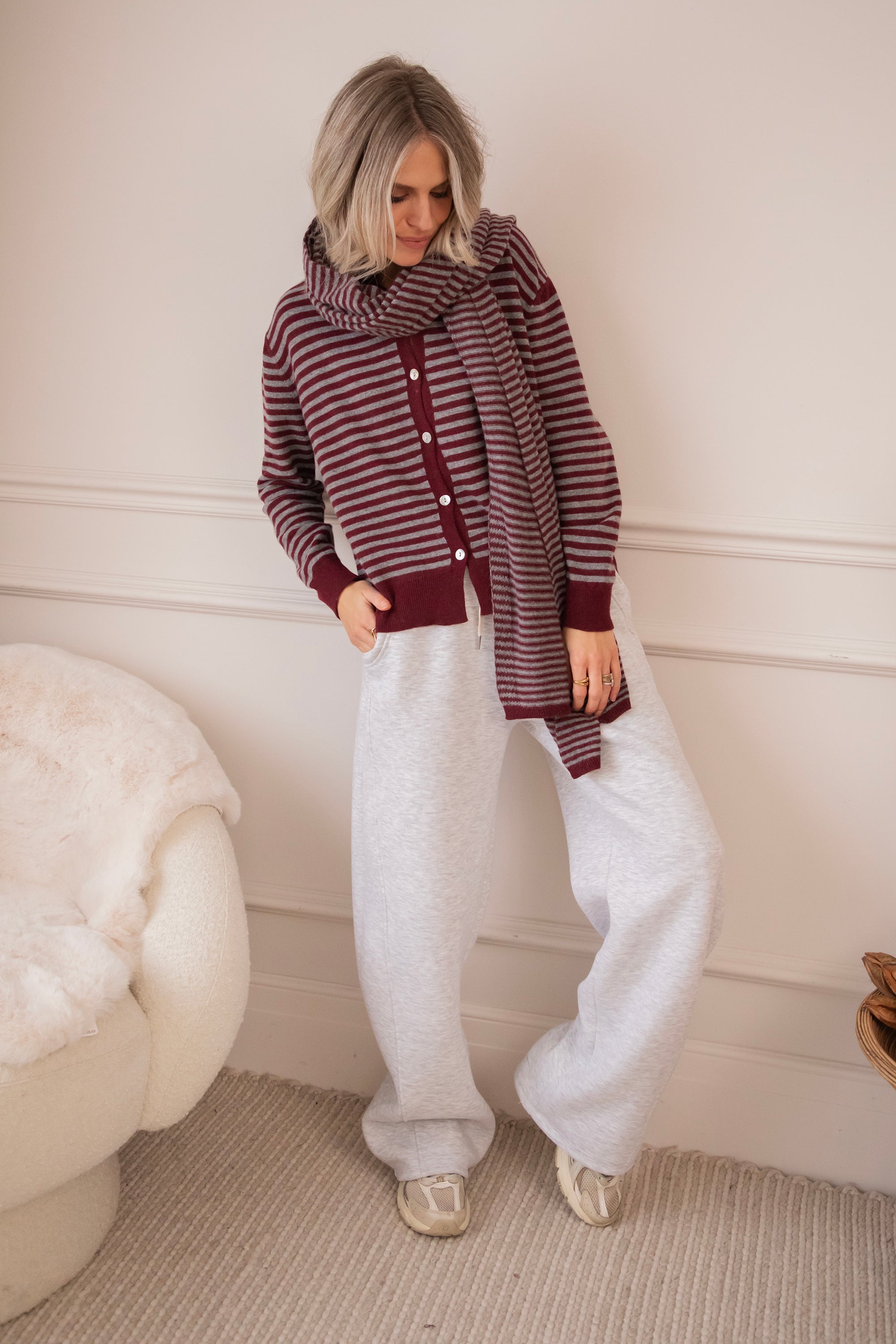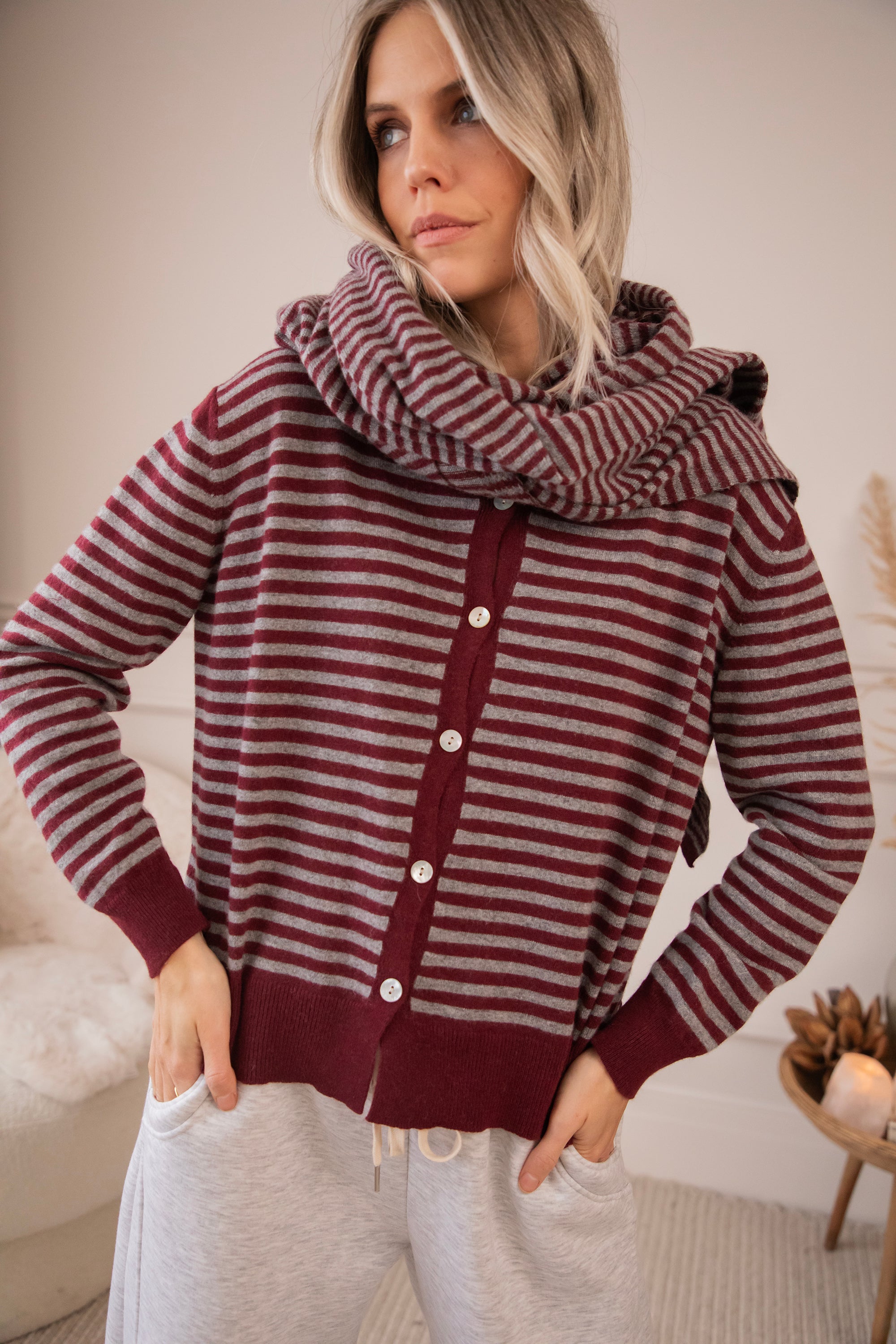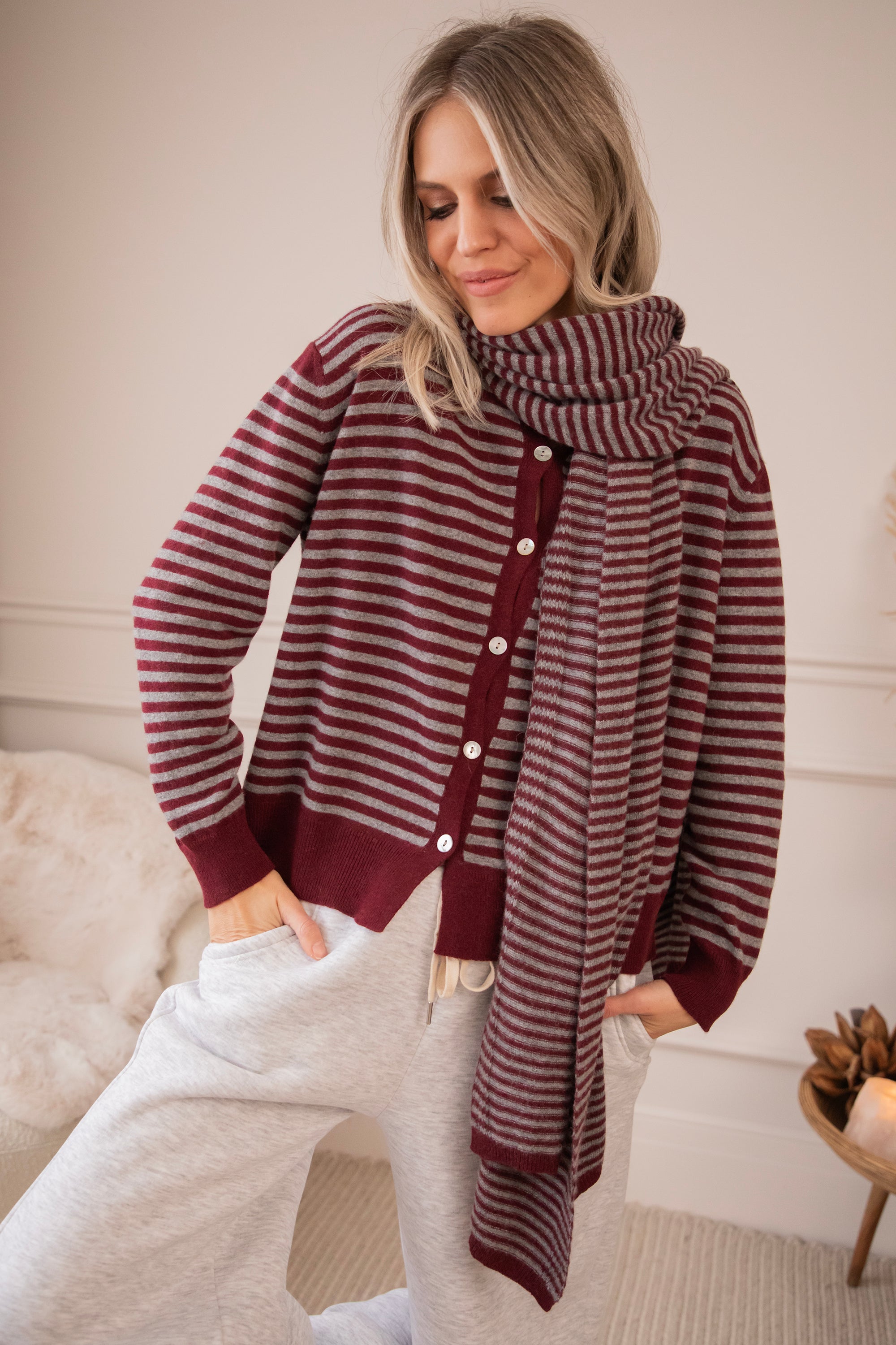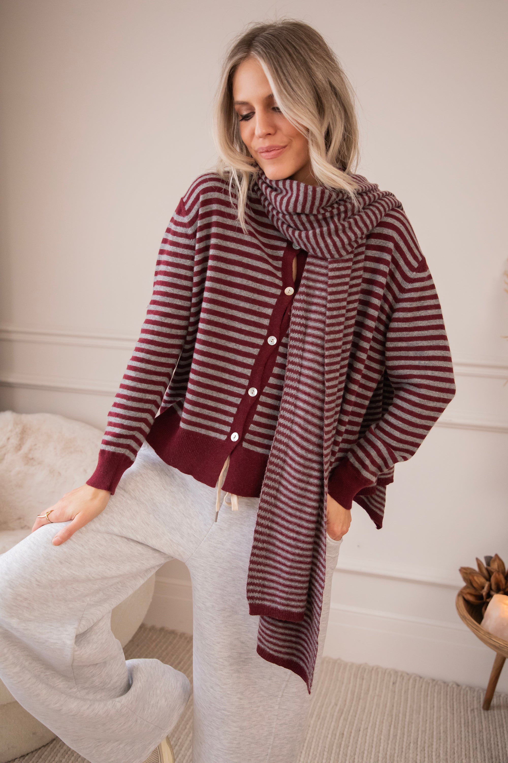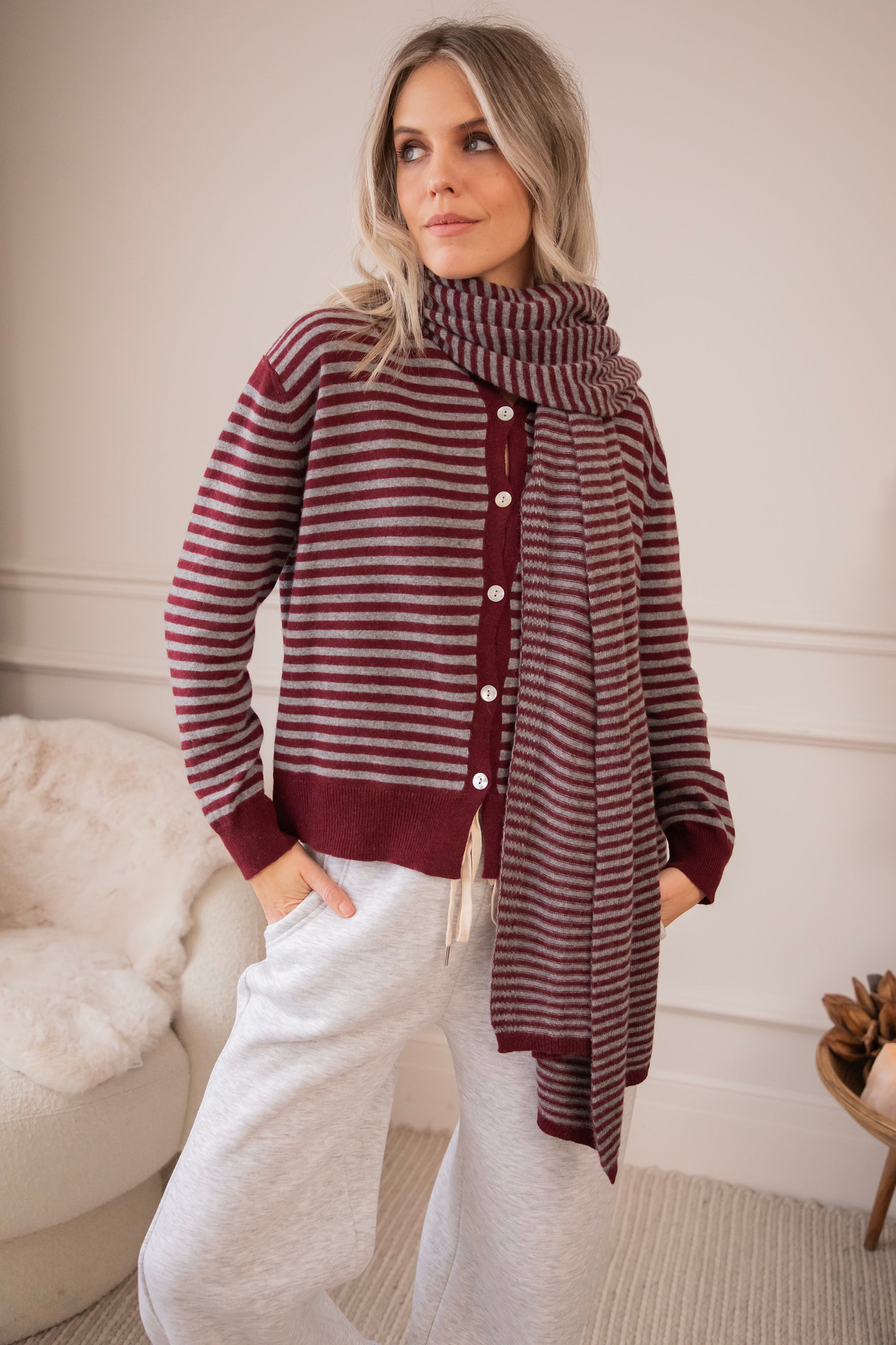 Ze bestaat uit maar liefst 40% WOL, 30% viscose én 10% cashmere: een echte topcombo van warme, luxueuze materialen 🥰 Die rijke bordeaux tint geeft meteen karakter aan je outfit, zonder dat het TE is. Geen wonder dat ze zo zacht en luxueus aanvoelt! Het subtiele strepenpatroon maakt haar extra knus, en dan heb je ook nog dat fijne, dunne sjaaltje dat apart verkrijgbaar is. Zo kan je heel makkelijk die nonchalante touch toevoegen én heb je meteen een perfect matchende accessoire bij je outfit ❤️ De parelmoeren knopenrij geeft het geheel nog een vleugje glam… love it! ✨