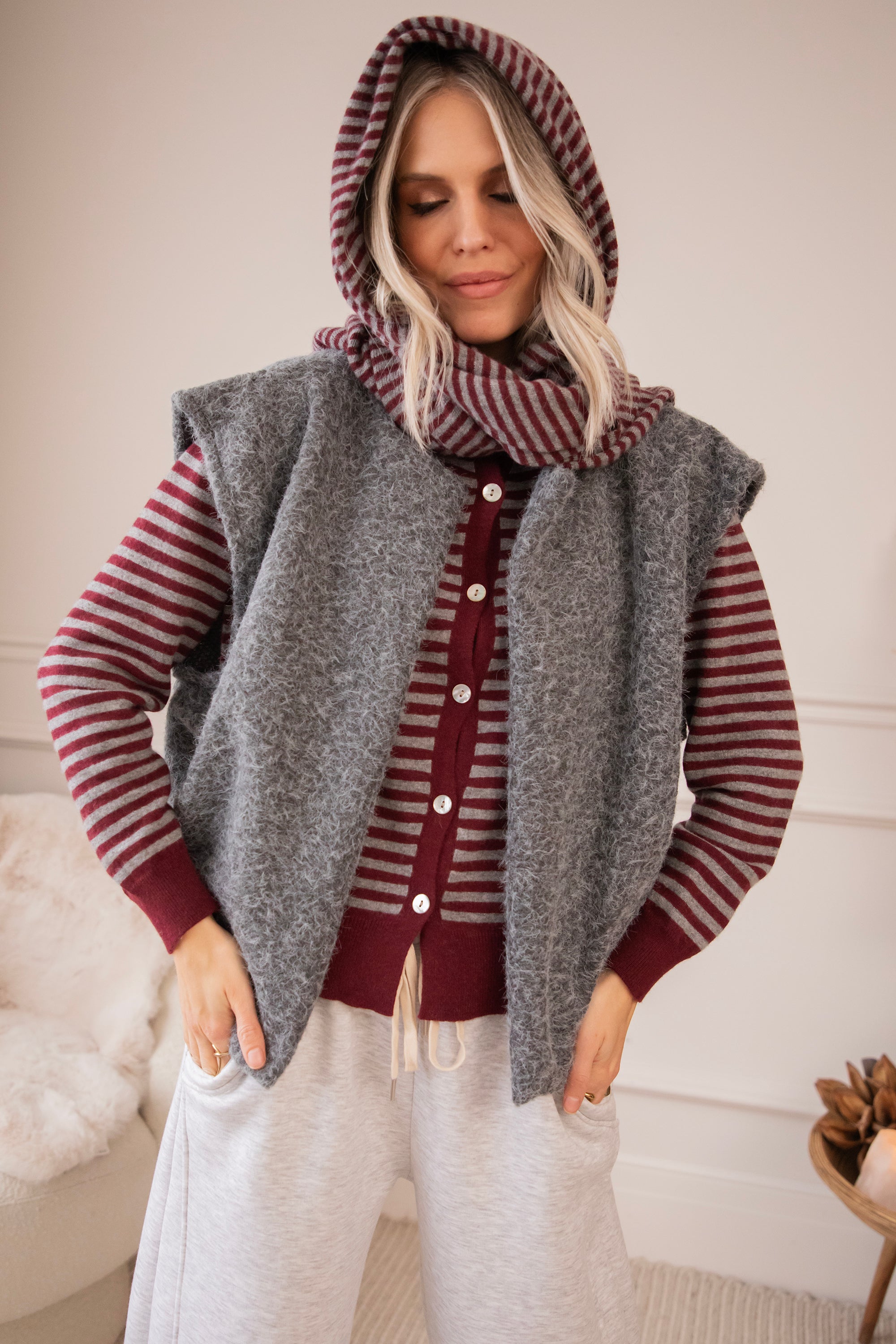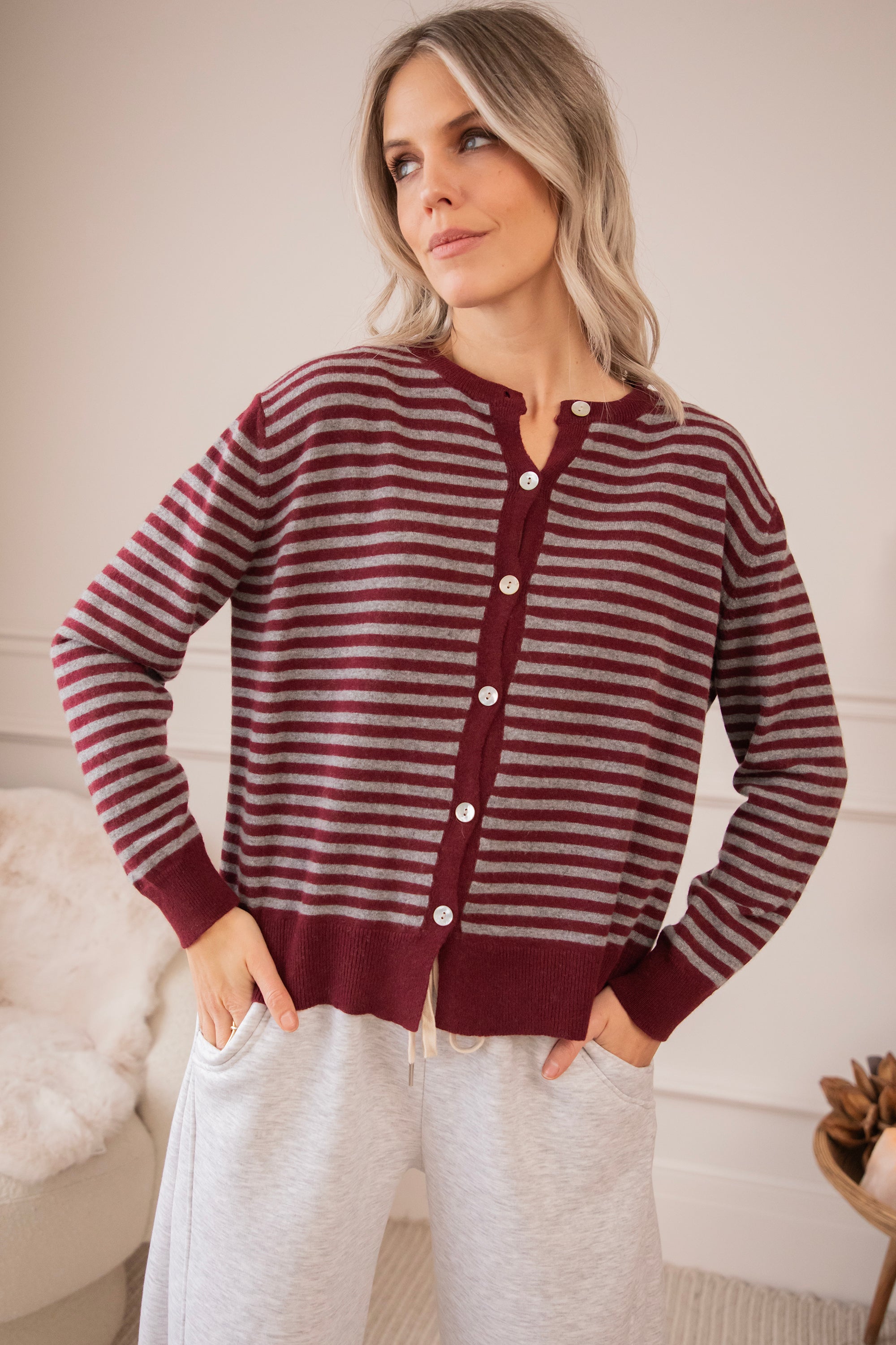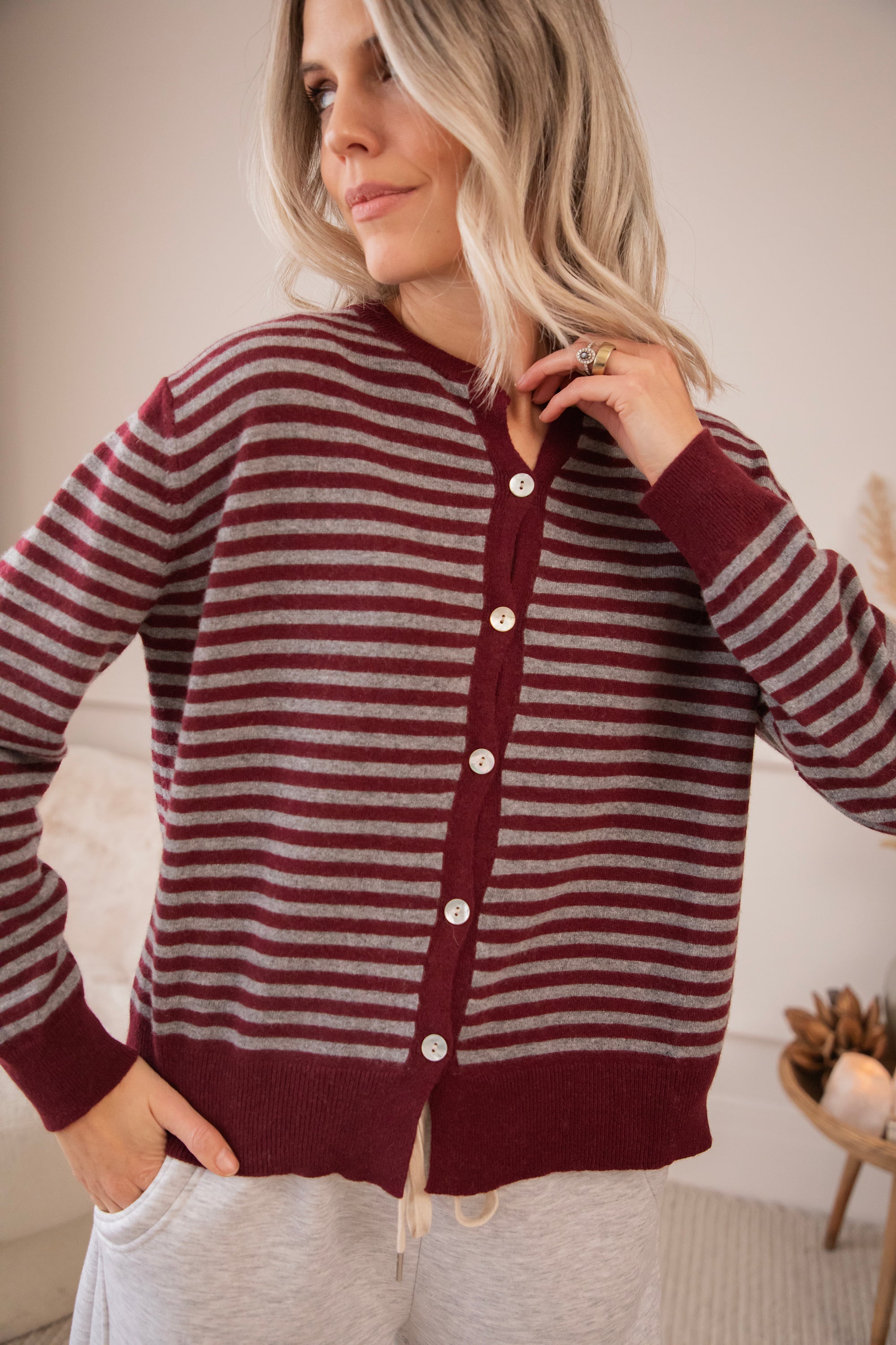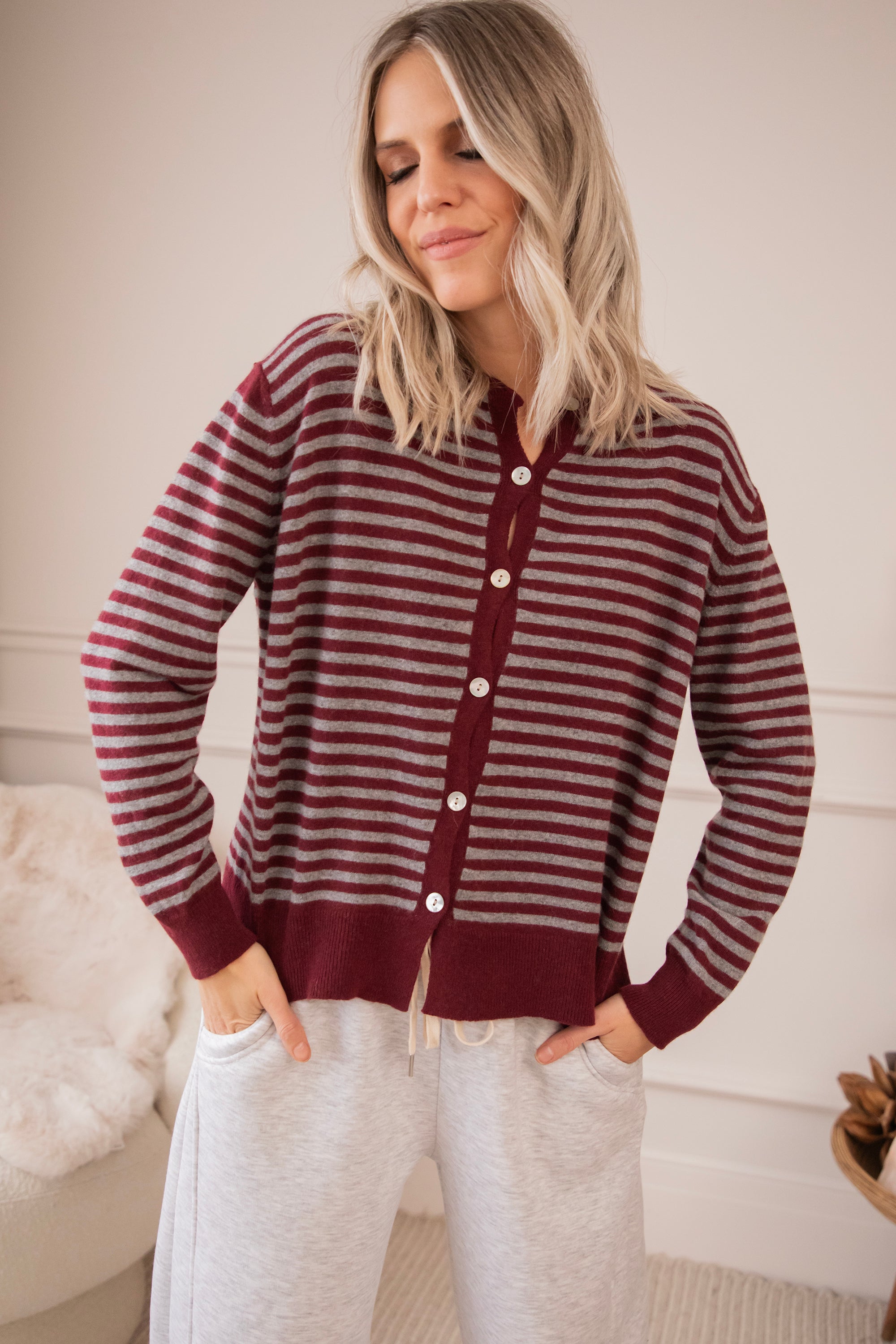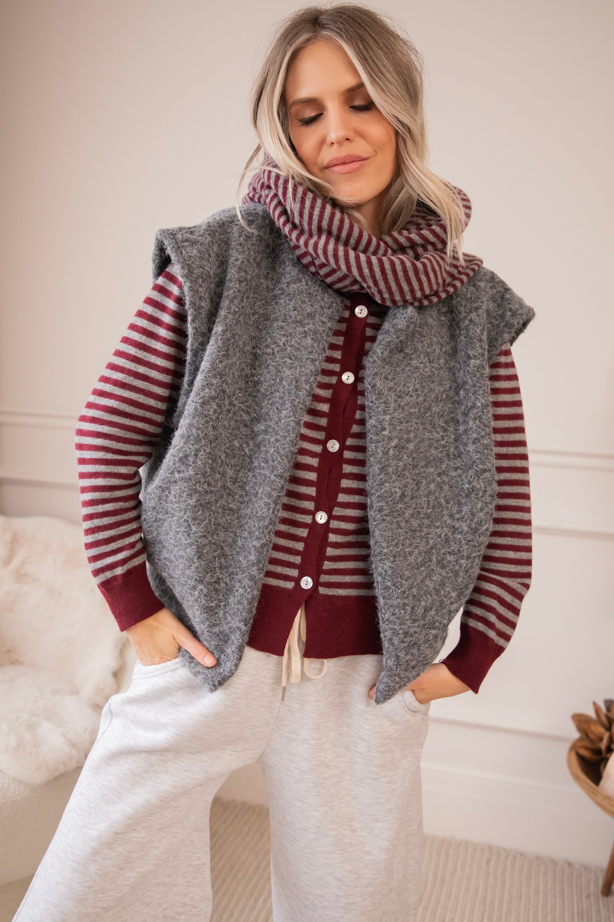 Ze bestaat uit maar liefst 40% WOL, 30% viscose én 10% cashmere: een echte topcombo van warme, luxueuze materialen 🥰 Die rijke bordeaux tint geeft meteen karakter aan je outfit, zonder dat het TE is. Geen wonder dat ze zo zacht en luxueus aanvoelt! Het subtiele strepenpatroon maakt haar extra knus, en dan heb je ook nog dat fijne, dunne sjaaltje dat apart verkrijgbaar is. Zo kan je heel makkelijk die nonchalante touch toevoegen én heb je meteen een perfect matchende accessoire bij je outfit ❤️ De parelmoeren knopenrij geeft het geheel nog een vleugje glam… love it! ✨