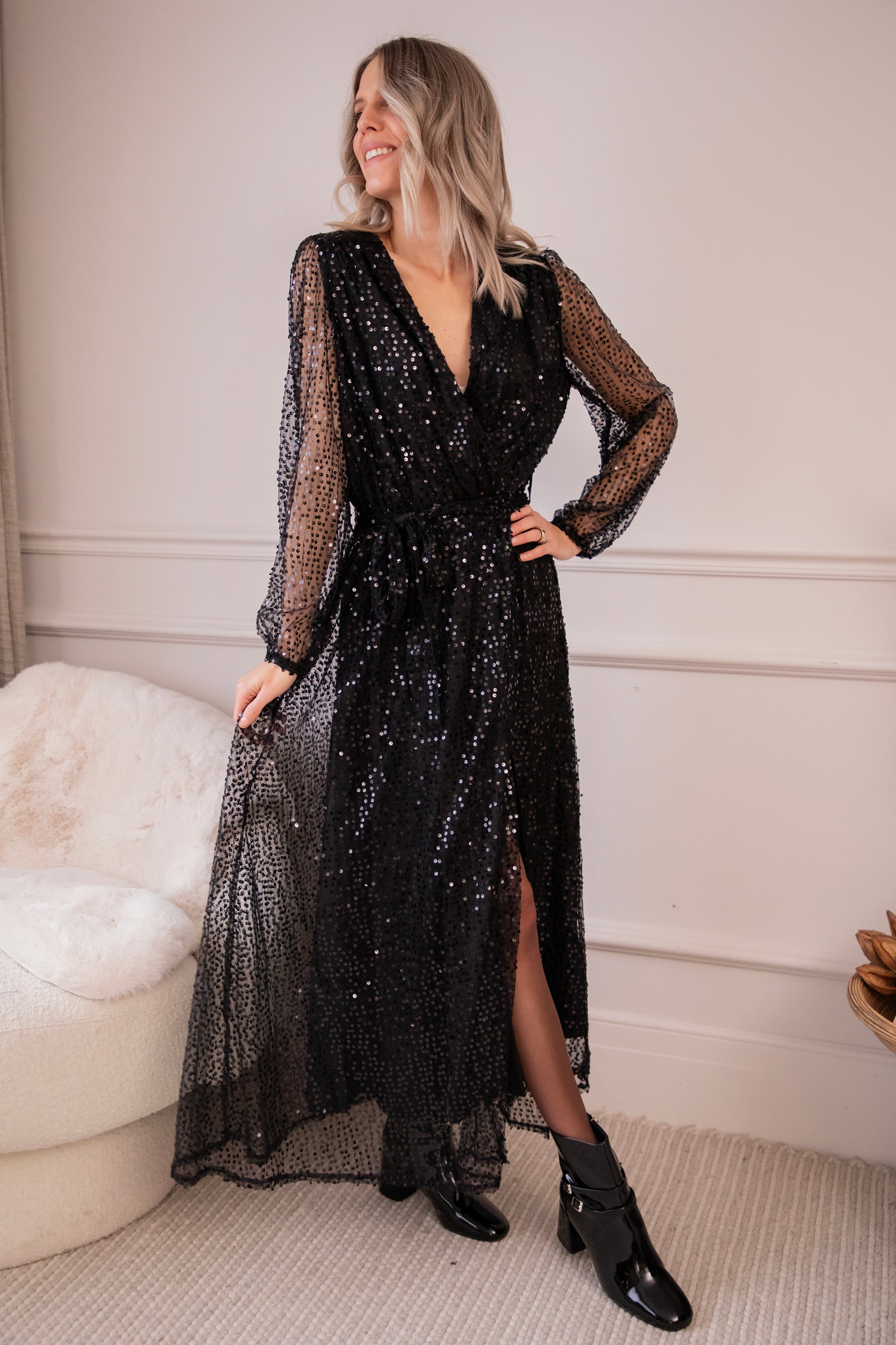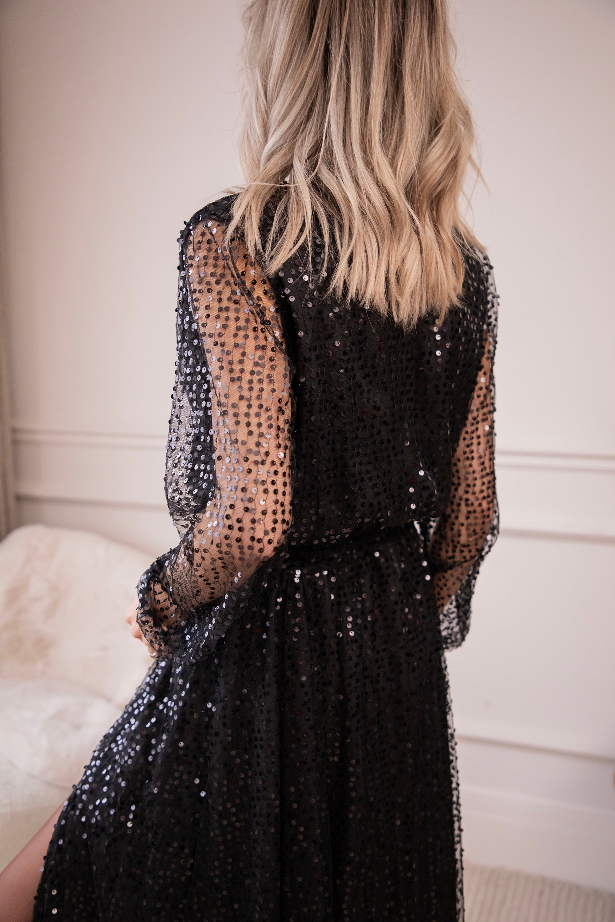 Deze jurk is pure magie! Een full sequins maxi dress die straalt bij elke beweging 😍 Met haar romantische A-lijn silhouet, see-through mouwen, subtiel splitdetail en elegante overslag aan de top, is dit echt de jurk voor jouw sparkle momentje 🖤 Ze valt zo flatterend, zeker ook met die aansluitende, rekbare taille en het zwierige rokgedeelte... geeft zo'n mooi silhouet! 🤩