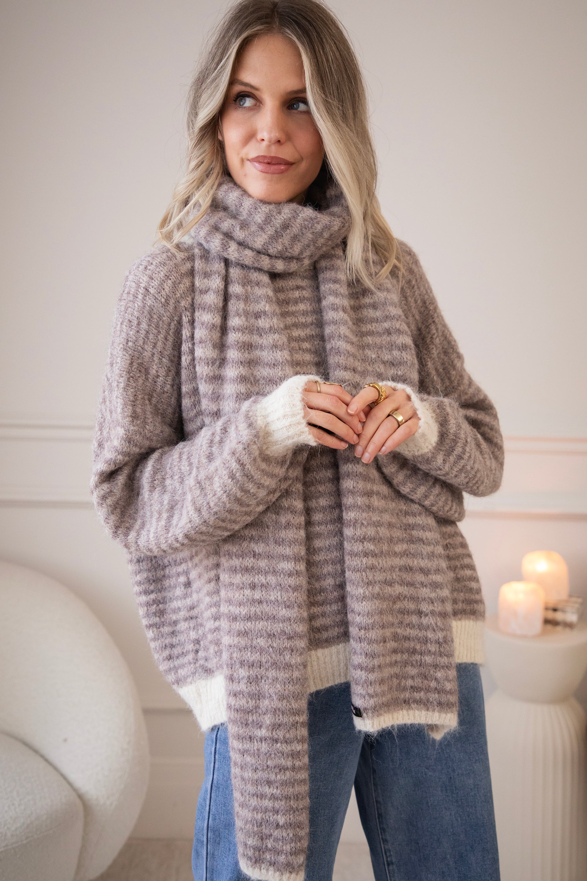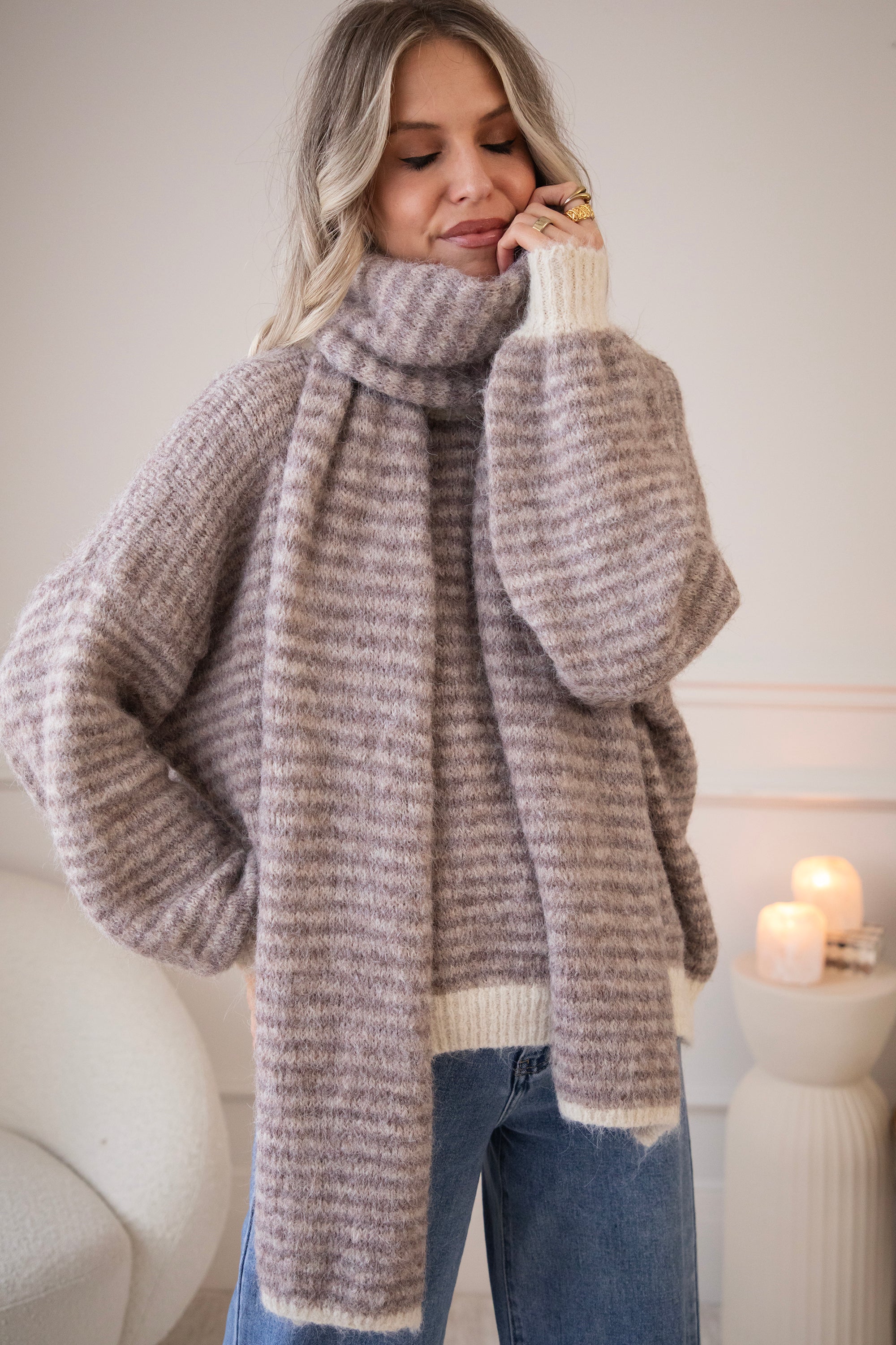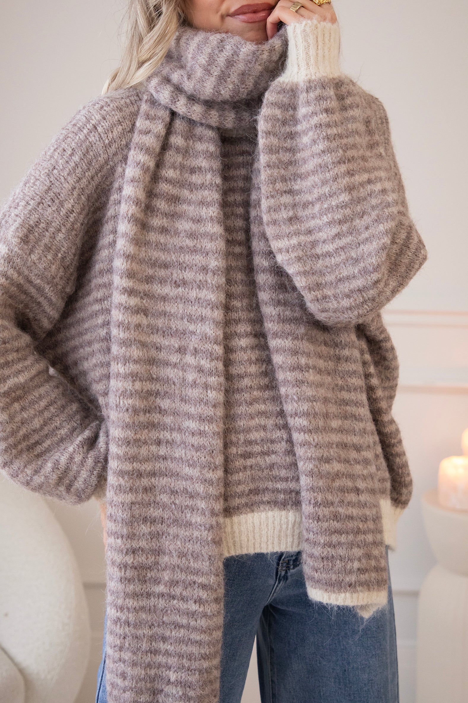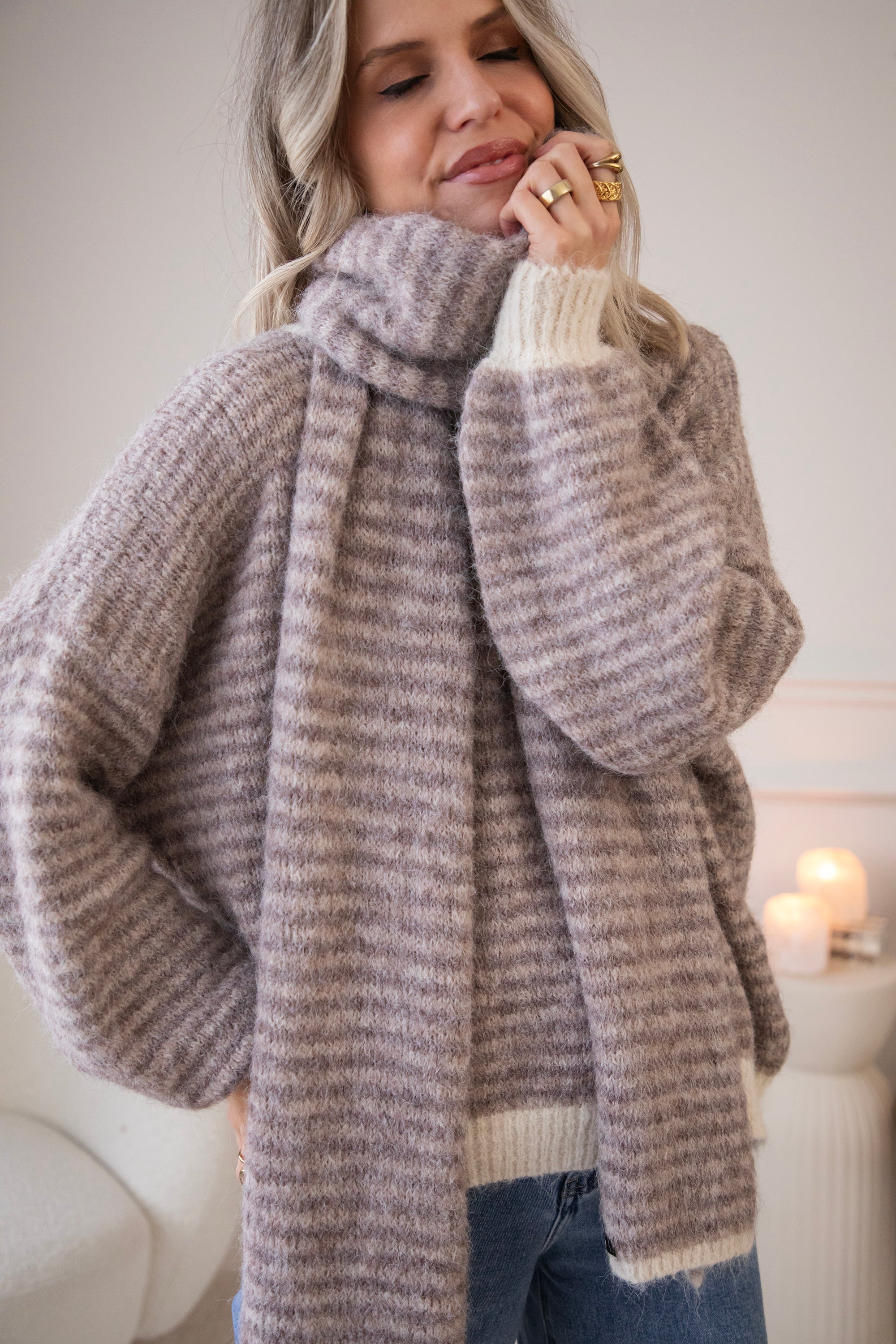 Zima trui met beige en bruine streepjes die mooi in elkaar overvloeien. Het is geen opvallend contrast wat ze juist zo zacht doet ogen. Net zoals de trui zelf hihi! Een dikke gebreide stof die goed mee rekt. En ze valt ook zo goed ruim! Extra leuk: ik heb een matching sjaal voorzien voor nog meer comfort 🥺 Zo leuk dat je al meteen een matching bovenstuk hebt! Comfort girls, comfort 🥰
