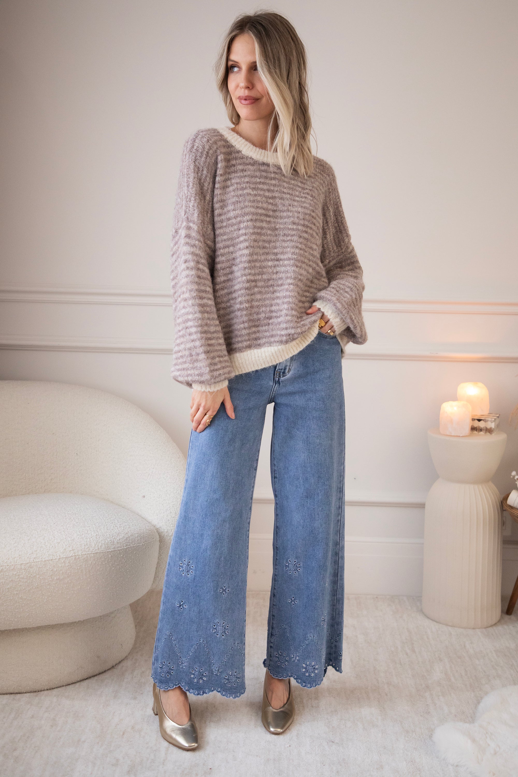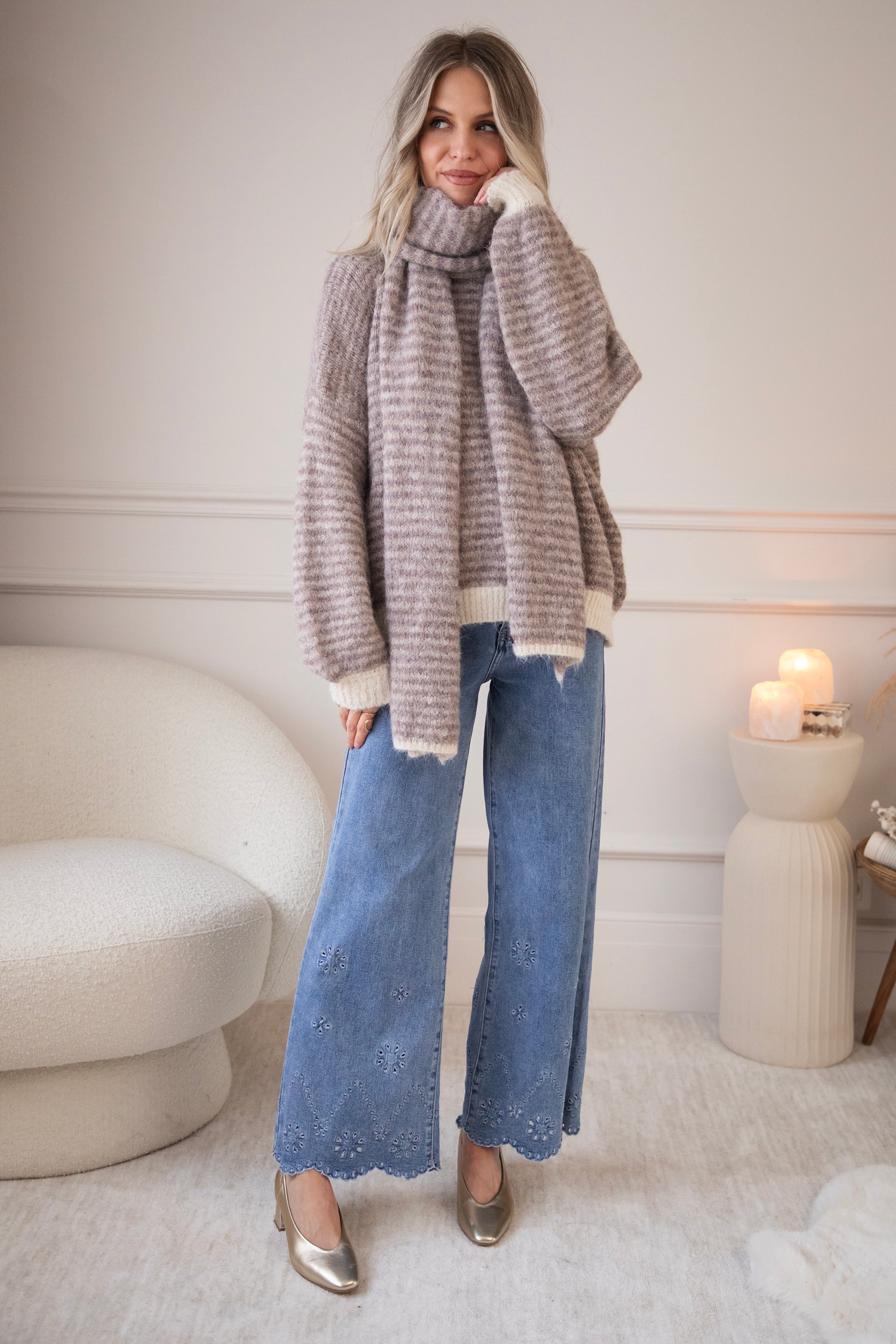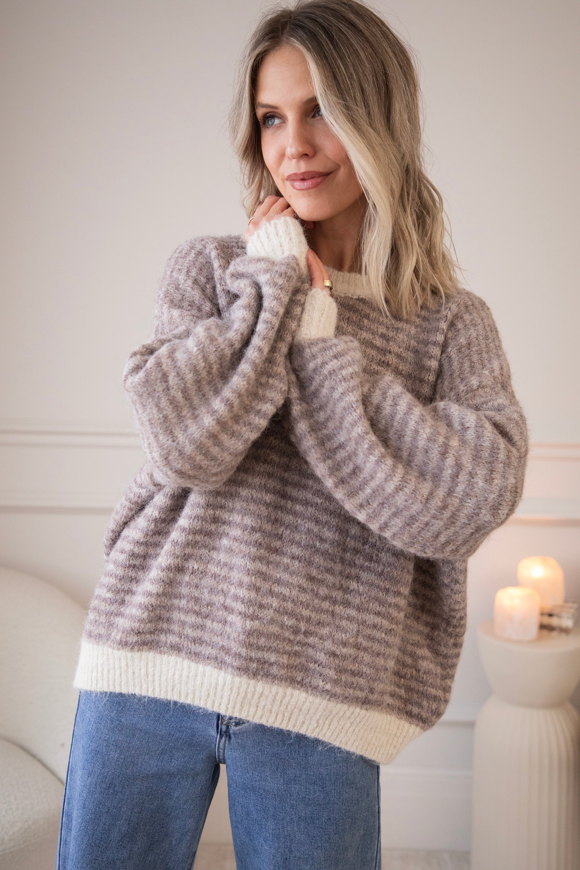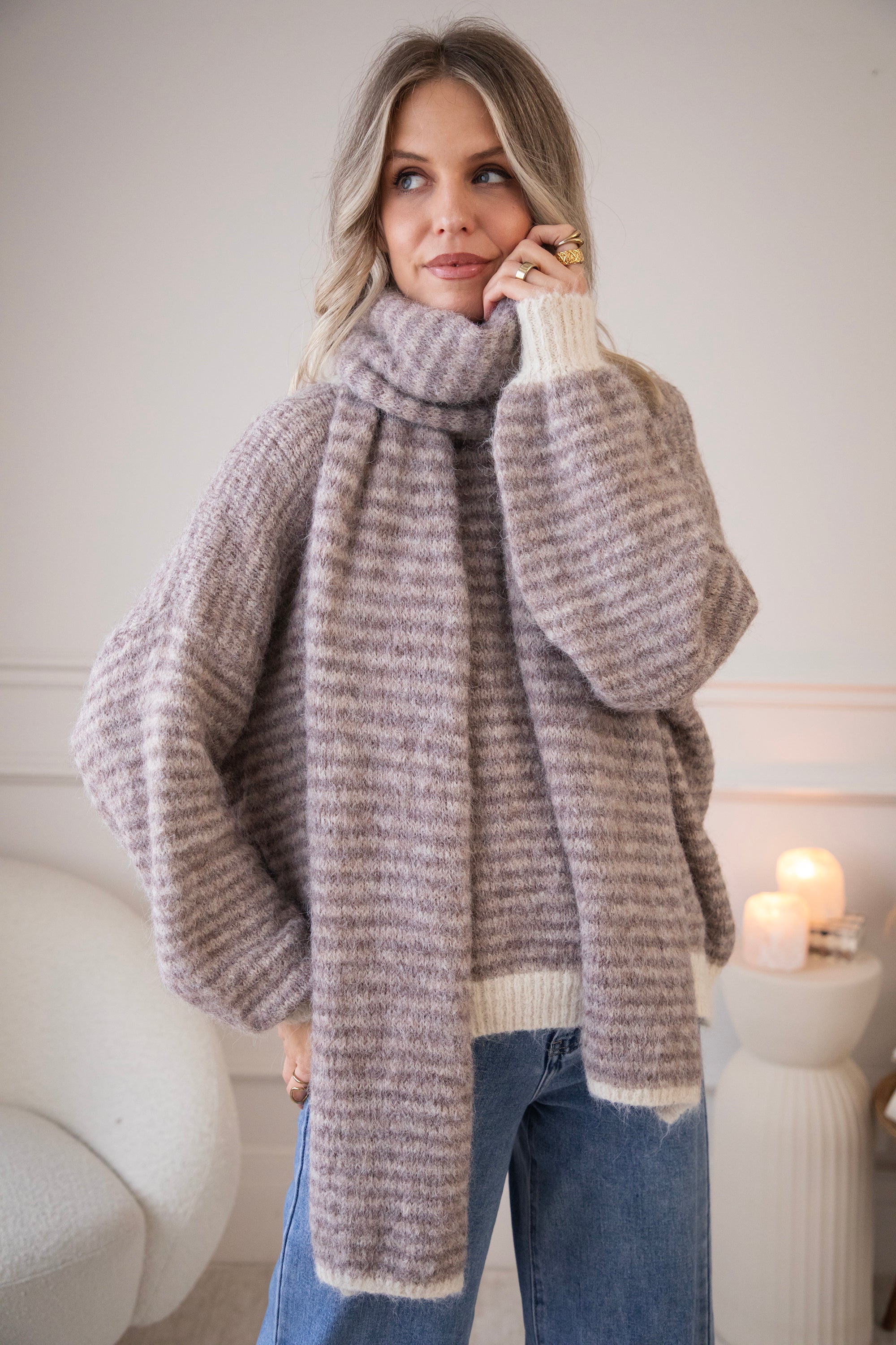 Zima trui met beige en bruine streepjes die mooi in elkaar overvloeien. Het is geen opvallend contrast wat ze juist zo zacht doet ogen. Net zoals de trui zelf hihi! Een dikke gebreide stof die goed mee rekt. En ze valt ook zo goed ruim! Extra leuk: ik heb een matching sjaal voorzien voor nog meer comfort 🥺 Zo leuk dat je al meteen een matching bovenstuk hebt! Comfort girls, comfort 🥰